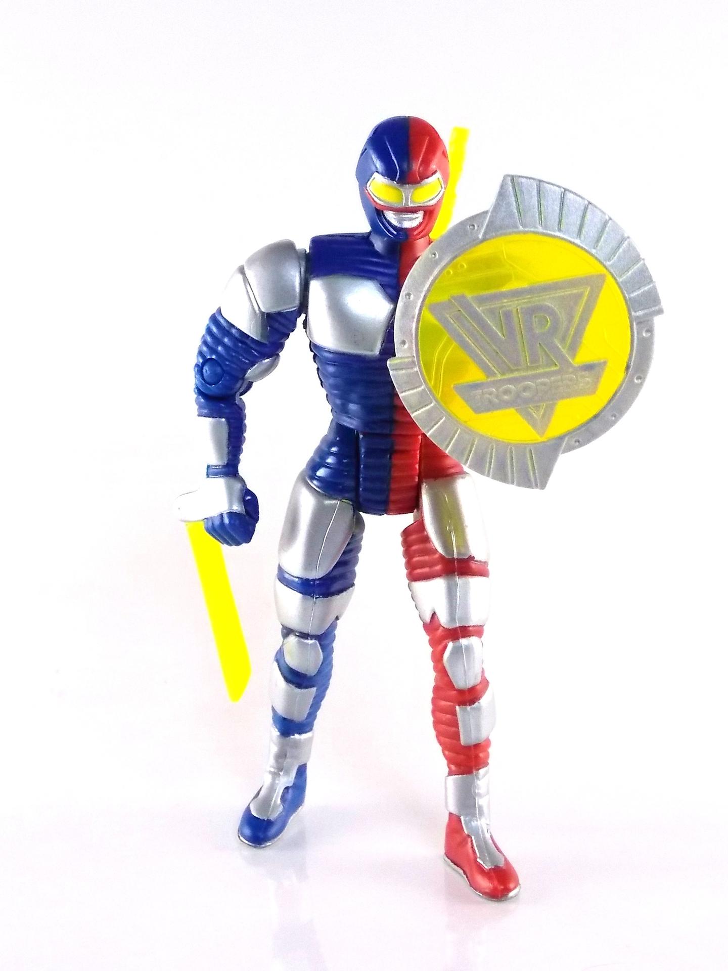 This unique form is the product of Saban's constraint to use both Metalder & Spielban footage during season 1 of the show. Since the footage came from 2 shows the 3 heroes could never really be shown together on screen without the cost of filming new footage with the Metalder, Spielban, & Diana Lady suits. The easiest solution was to create these new cheaper costumes and write them in as new forms. These were incredibly cheap spandex suits with basic padding on them that all featured poorly repainted Mighty Morphin Red Ranger helmets. Though they definitely aren't as polished as their finished counterparts, they're kind of a fun & quirky love child of the 90's american toku industry. The figure is itself much the same. Packaging Typical of the VR Troopers toy line Battle Grid Ryan Steele comes carded, though this card back is a bit larger than most of the figures released in the line. Packaged on the same style of widened cards as the Battle Tech & Turbo Tech figures, you can see tons of cross-sells for the rest of the line. These more Deluxe releases included more accessories than standard VR figures and generally featured weapons and designs not seen in the show. The Battle Grid suits themselves were featured in series, but the weapons the toys included were not. The front of the card features some seriously wicked art that makes a goofy spandex suit with a repainted Red Ranger helmet look truly awesome. Main Figure For those who don't know the VR Troopers toy line was actually contracted out by Bandai. Unlike their Power Rangers & Beetleborgs figures, VR Troopers was produced by Kenner. As a result the toy line wound up being a bit of a hodgepodge of various toys and figures, some Japanese molds, some new american molds, and even others imported from other toy lines. The Battle Grid figures are of course entirely US made. Battle Grid Ryan Steele is pretty unique. It's got the handicap of 90's articulation working against it, but it's otherwise a nice toy. It has basic shoulders & hips, and one "floppy" right elbow joint. It's meant to swing swing the attached blade for a Lightning Strike Punch attack when the legs are squeezed. The figure actually has more to it than the full suit did with the ribbed detailing. And although the show helmet is itself a repainted MMPR Red one, the toy is not a mere repaint but is an original mold meant to evoke it. Which is kind of ironic and awesome. Accessories Like any good action figure released in the 90's Battle Grid Ryan Steele included so many accessories that he can't even use them all, nor are any of them relevant to his show appearances. None of theme are officially named on the packaging or elsewhere: 2 - Energy Katanas. Each cast in translucent yellow plastic. They actually aren't that bad, but the figure is only capable of holding one at a time while storing the second in his back holster. Only the left hand is molded open to hold a weapon while the lightning strike right fist is molded shut. So the second katana is kind of overkill. One could assume this weapon is maybe an homage to Metalder's Katana, but that's probably not something that was part of the design process for this toy. 1 - Sai. This is a really odd one. As the only non-energized accessory in the set it's really out of place. Again Ryan can only hold it in his left hand or store it on his back, but that's now 3 weapons he includes with places to put only 2 of them. 1 - VR Troopers Shield. This one is the most awesome accessory in the set. Emblazoned with the VR Troopers logo it's clearly a toy only item that really screams 90's, but it's my favorite thing included with Ryan. Why not bash in a monsters face with a shield bearing your team's name? As with the above accessories you can only place this in his left hand and it can't be stored on his back, so you run into the accessory storage situation again. Though the accessories are confusing and superfluous they're right in line with what we should expect from a toy released in the mid-90's. Final Thoughts Obviously it's hard to review a toy like this 20 years after it's release and try to hold it to some kind of crazy modern standard. This thing is silly, fun, includes a ton of weapons, has an action feature, and honestly looks pretty cool. With some more basic articulation it'd be pretty much perfect. I'm always a sucker for forms created specifically for american toku shows and the Battle Grid suits from VR Troopers take the cake for most odd and fun. Battle Grid Ryan Steele is one weird and awesome piece in my collection. I have Kaitlin as well, but have never been able to find a J.B.