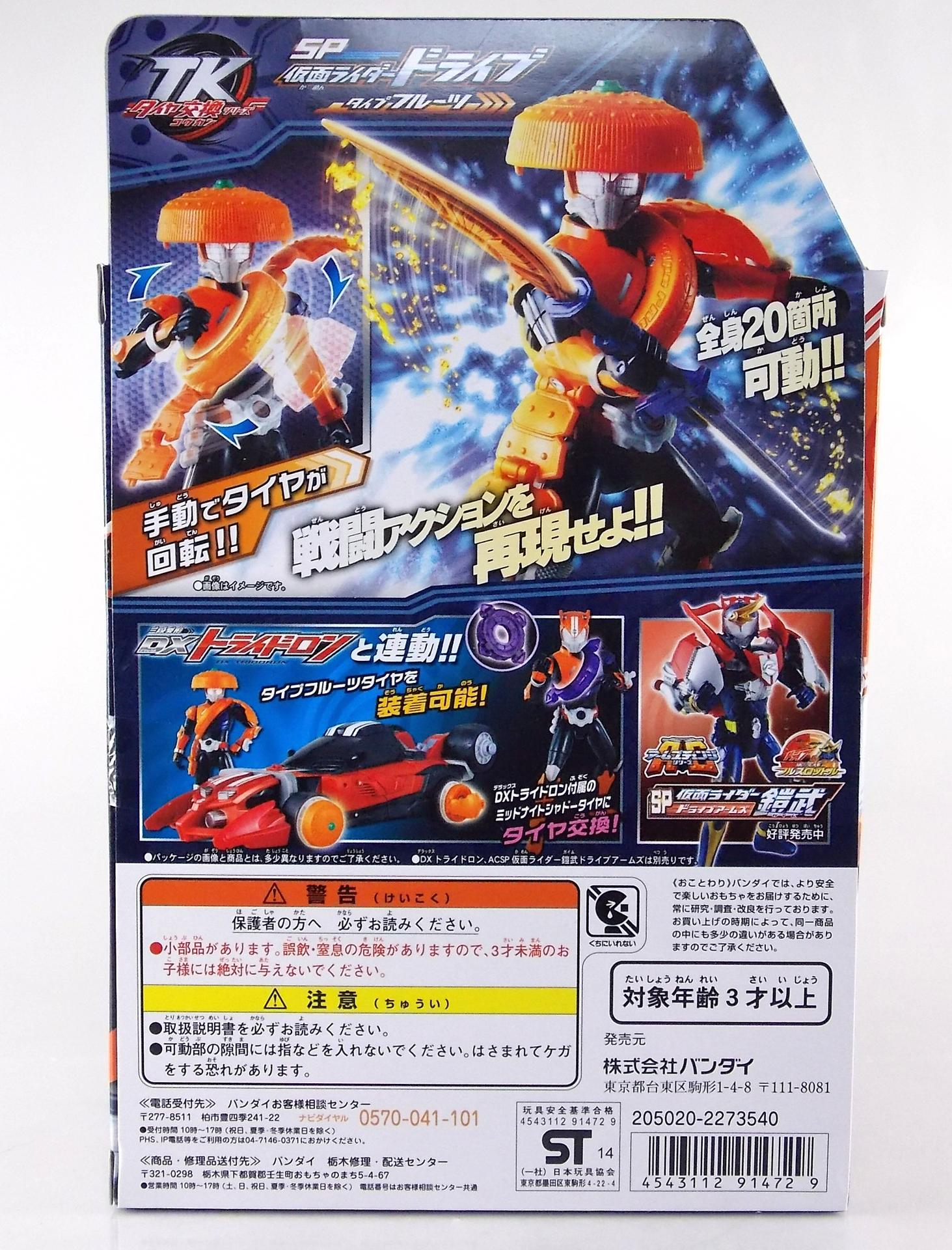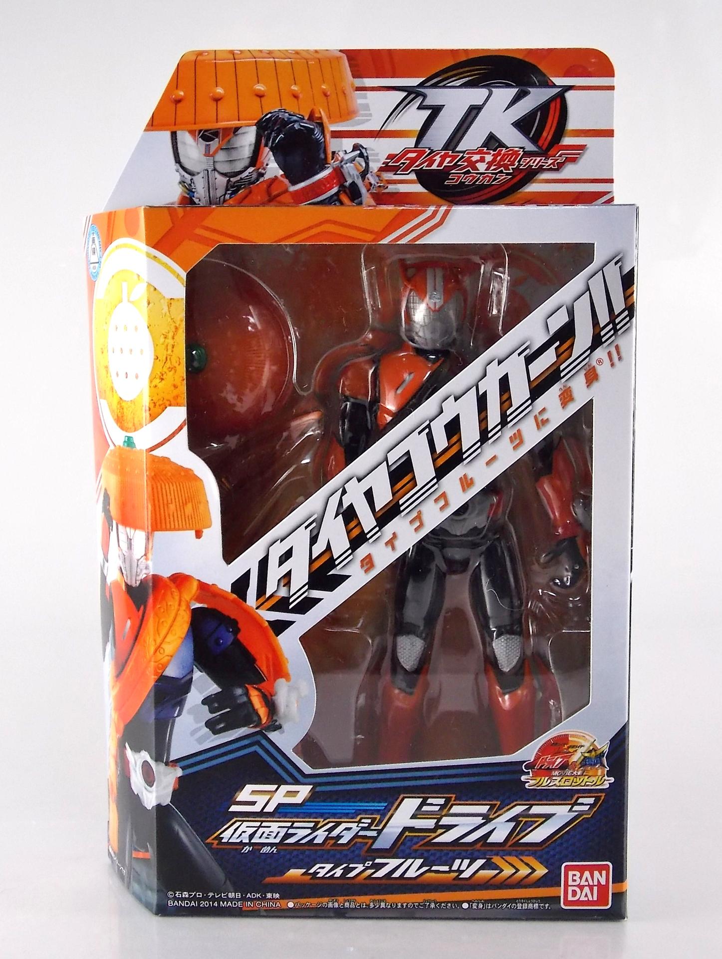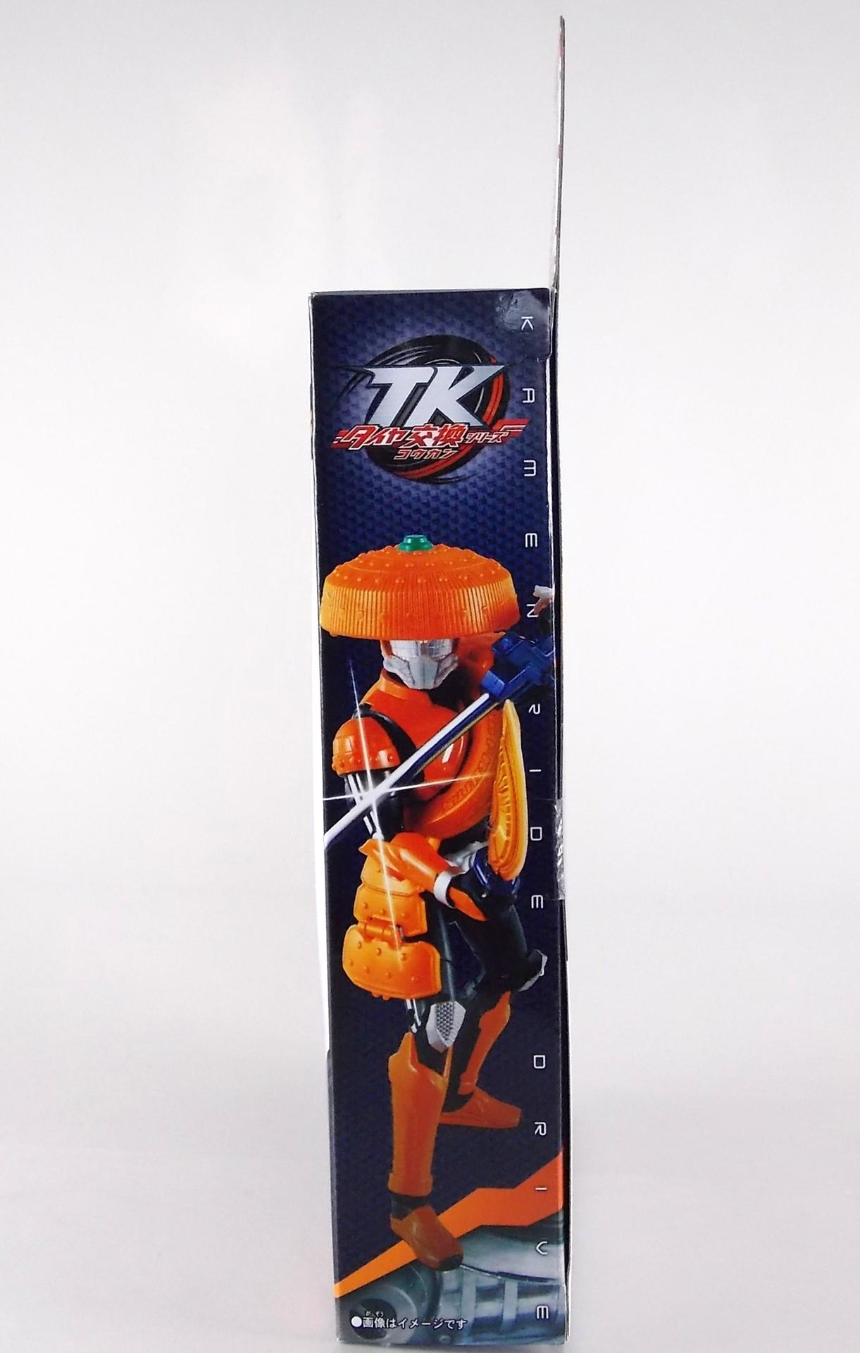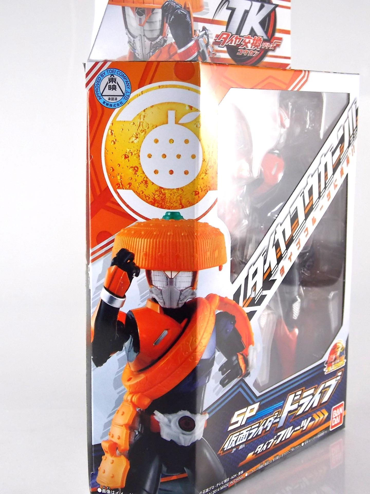 Finishing off a one-two punch of Kamen Rider Drive excellence this week we're back with another new Tire Koukan gallery! TK-SP Kamen Rider Drive Type Fuits! Packaging As always TK-SP Drive Type Fruits comes in the same kind of standard packaging that the rest of the Tire Koukan line does. Albeit with some additional fruity flare this go around. Aside from the new stock photos, and some shots of the actual suit from a film most of us will have been unable to see by now, there's nothing new to report here. Main Figure Drive Type Fruits is first and foremost based on the excellent TK-01 Drive Type Speed. This is essentially the same figure with a few extra bells and whistles thrown in. While the proper look of Type Fruits can't be achieved without using the included accessories, here's how it breaks down at a basic figure level, from bottom to top. As far as anything below the waist is concerned Type Fruits is identical to Type Speed (colors aside). The orange is really striking on the legs but even more so on the torso. Where you begin to see a real difference is the newly applied label on the Drive Drive indicating the Type Fruits change, then we see the lower diagonal of the torso below the tire line. This section on Type Fruits has been colored blue to simulate the under suit of Kamen Rider Gaim, which this Type is meant to homage. This coloration carries to the left shoulder, which it should be noted has been remolded to be rounded off to accommodate the included Type Fruits Tire. The upper diagonal of the torso is painted orange and likewise it's shoulder has been remolded to round off the edge, though this is merely for symmetry's sake as there's no armor going across that shoulder. The head and rest of the body are identical to Type Speed. While we're on it though the head looks fantastic in orange. As for the figure it's still jut as functional as Type Speed, nothing has physically changed that would impact the figures ability to move or pose whatsoever. It's still the same excellent toy we've seen before. Accessories Drive Type Fruits comes with one accessory that's brand new, and funnily enough teo that are straight up repacks: 1 - Type Fruits Tire/hat combo. Though packaged separately these two should definitely be counted together. The Tire portion of this accessory is pretty much a straightforward tire with some armor flaps on it. The interesting thing about it is that the port in the center can actually rotate and flip over, allowing you to put it on Drive and have the armor flaps face the hip & Shoulder Appropriately. And when in use with a vehicle like DX Tridoron you can rotate it the other way so that the flaps can tab together to make a proper tire facing outward. The kasa-hat portion of the tire is actually rather simple. Unfortunately it doesn't have a Tire Koukan port so no crazy combos can really be made from it. Instead there are a pair of folding tabs that are used to hold this thing on Drive's helmet with friction. When folded all the way out they accommodate his spoiler. When the tabs are folded inward the connection becomes small enough to plug onto a Tire Koukan port. I find the hat to be a decent fit for Drive's helmet though it can be knocked off a little more easily than I'd like it to when used on Tridoron. 1 - Daidaimaru. Literally this is the EXACT same Daidaimaru that Arms Change Gaim Orange Arms included. No differences whatsover. 1 - Musou Saber, see the above description. 100% identical. The figure really comes with anything it could need. My one complaint would be the lack of proper silver paint on the Daidaimaru. I know these are still mainline retail toys despite the "SP" suffix in the name. They aren't premium or anything like that but a little extra paint couldn't have hurt. Not a huge complaint though. Final Thoughts As yet another wonderful addition is added to the Tire Koukan line I begin to question how far these rider team-up movies can go with cross series mixed gimmick forms. The Legend Rider Arms last year were fantastic, but Gaim Drive Arms is a bit weak this year. TK-SP Drive Type Fruits however definitely appropriates a previous riders theme with it's gimmick perfectly, but that won't always be the case I imagine. For now though I'm very pleased with this figure. And if recent history proves anything, it's that movie forms of this nature rarely if ever get the Figuarts treatment from Bandai. This is likely your only way to own this Type.