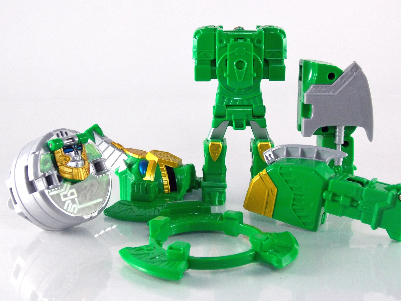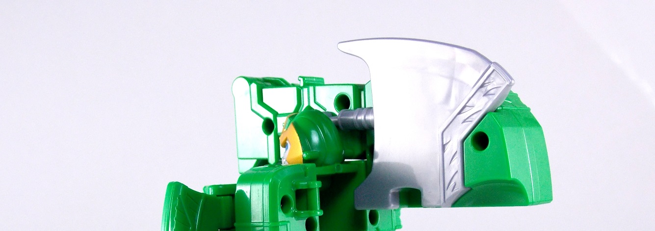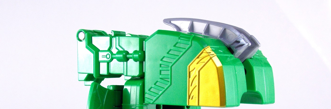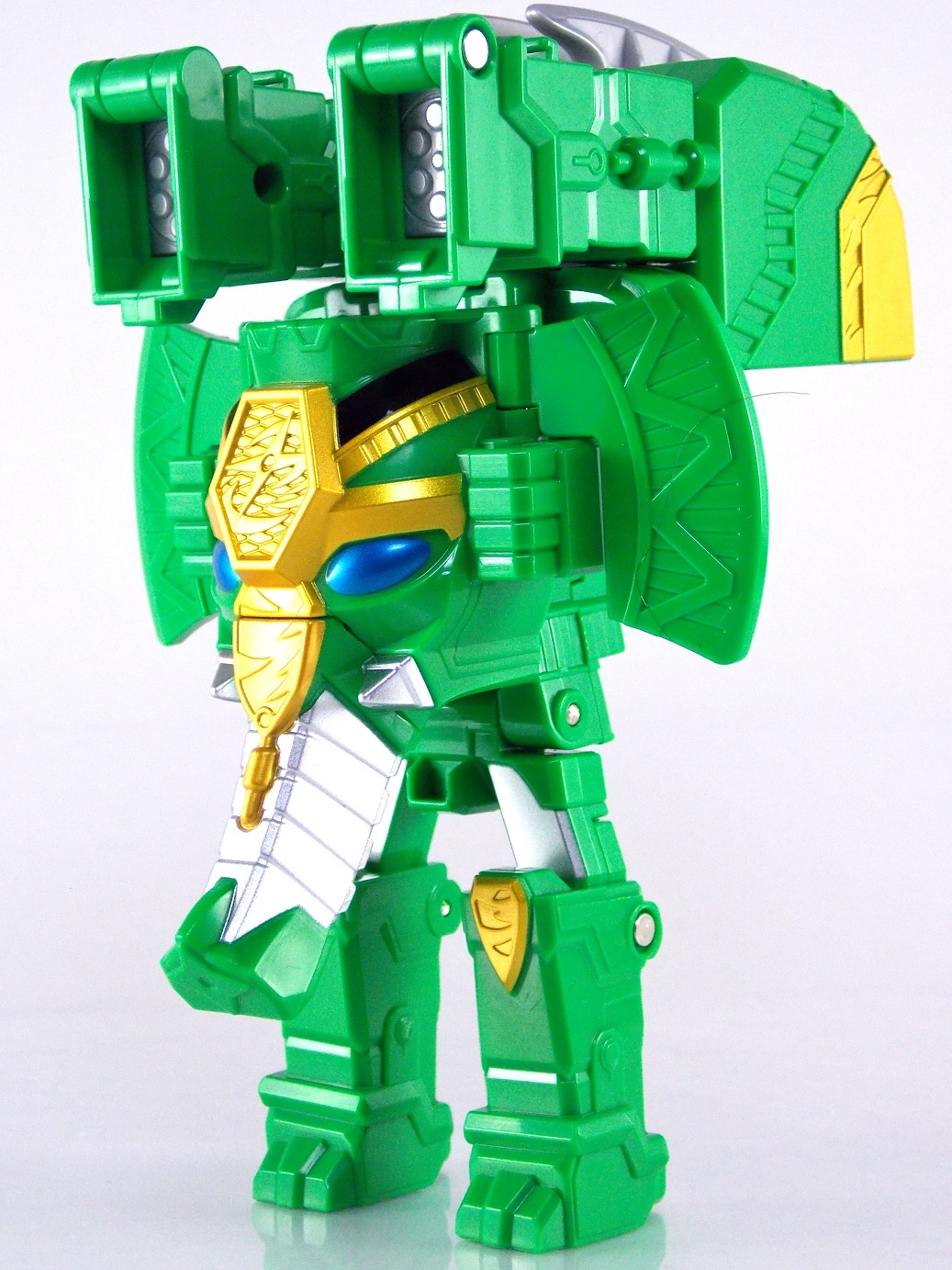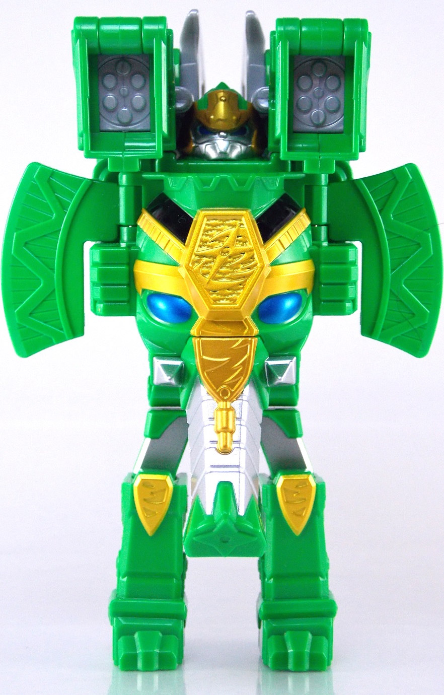 The incredible melting pot of the Shuriken Sentai Ninninger toyline continues with the addition of the first Otomonin upgrade mecha! The DX Paonmaru! Born from the first of the restored Sealing Shurikens, Paonmaru joins the Ninningers in their fight against the Youkai! But we're here to talk the toy of this interesting mecha, so read on below! Packaging DX Paonmaru comes in a pretty standard small cardboard box, and by the looks of it so will the rest of the Otomonin. It's pretty basic stuff for sentai lines honestly. Once one additional mecha comes out they almost all follow the same formula for packaging with each successive release. Some basic stock photography of the figure as well as shots of it's combined forms to round it all out. Main Figure A bit of an odd one, DX Paonmaru has an interesting transformation method to say the least. The standard form of this figure is indeed it's elephant form. To create it you need to take the the two axe weapons and plug them on to the back of tiny half robot. It's legs in turn fold out and forward. The Shuriken itself with the disc attached then plugs onto what will be the chest of the robot mode later. Then simply plug the elephant face and trunk on. Thus completing the look! It's actually a pretty intricate little figure in this mode, despite a general lack of much in the way of paint apps. Though nicely enough the head, front knees, & trunk are all painted very well. In the same way that Shinobimaru has a greatly detailed chest, so does Paonmaru. It's about on par sizewise with one of the only other elephants we got in sentai, Hyakuju Sentai Gaoranger's Gao Elephant. I don't actually own a Geki Elephant to compare it with. Though you can't get much pose wise from this form it's pretty fun. The basic robot mode for Paonmaru can be achieved by reassembling the given components. Separate everything back down to it's base and start from scratch with the small humanoid robot. Straighten the legs out properly and then fold the head up out of the back of it's chest. Take the face/trunk portion of the elephant and plug it onto the Paonmaru robot's chest which gives you the basic robot. The Elephant head actually completes the arms of the robot weirdly enough. The base robot only has elbow length arms but some tiny fists are sculpted into the head section to complete them. Then take the Axe/hind legs and attach them to the shoulders to add two giant missile launchers. The actual Shuriken and disc aren't used for this mode at all. But that gives you Paonmaru in robot mode, comparable size wise to Shinobimaru though quite a bit bulkier. He fits right in. Accessories It's hard to classify accessories with something like this as it's harder to distinguish between those items which are included with the figure optionally, or those things that are integral to it's basic structure. Nin Shuriken Base & Disc. This electronic item is what forms the head and face of Shurikenjin Paon. It's normally stored on Paonmaru's animal form plugged onto the neck as a mane-like appendage. I find it slightly odd that so far bot Paonmaru can store these items in at least one form, but Shinobimaru has no such storage options for the Shurikenjin Nin Shuriken when not in use. A pair of triggers on this piece detect when it's combined to form Shurikenjin Paon and plays out the appropriate phrase & music when done. When not connected pressing the physical button on top will cycle through three sound bytes "Paonger" "Paonmaru" & "Otomonin Shuriken". Shurikenjin Paon To get Shurikenjin ready for this combination you need to remove and rearrange a few things. Start by removing the standard Shurikenjin Shuriken and leaving that to the side, it won't be used. Remove Shinobimaru from the throne all together, and then remove the right arm made from Dumpmaru. People often question why a third shoulder peg exists on the back of the figure and it's for this, to store the arm you just removed! So plug the Dumpmaru arm there and transform Shinobimaru into the new right arm and plug him on. Now take the basic Paonmaru robot minus the shoulder cannons and fold his legs up to seat him in the throne. It should be noted that seating his hand over the control mechanisms on the throne is a little bit difficult. But once you do it looks pretty great. Then simply plug the Paon Shuriken onto the the neck of Shurikenjin. As a side not the new faceplate is pretty awesome looking compared to the standard Shurikenjin face, mine though appears to be molded on a little bit crookedly. Now take the Paon Axes and flip out some small handles on the bottom of each. Plug them into the combined robot's hands and there you have it, Shurikenjin Paon is formed! Sadly the axes are rather small and inaccurate but that's to be expected. These things tend to make some small compromises in toy form. Whether it's intentional or not you can plug the axes onto Shurikenjin's back for storage. This form manages to incorporate most everything from the standard Shurikenjin mode aside from the Shuriken, Drago Sword & Shield. But you'll see that you can still store or use the Drago Shield & Sword if you so choose. Either way Shurikenjin Paon is a pretty welcome sight. The green & gold Paonmaru brings to the table really helps break up the otherwise uniform color scheme of Shurikenjin and mixes it up a bit. It's a pretty great look actually. And because of the dynamic hips Shurikenjin has you can get some decent poses out this form. Final Thoughts As this line continues I continue to be very pleased. The Otomonin series of additional mecha is shaping up to be a pretty damn fun one. While it's likely these many upgrades won't be incorporated into any sort of final combination robo, they each seem to have a unique charm that I love. DX Paonmaru is a great addition to this line that once again gives it a pretty great variety of design. After 2 years of being pretty unimpressed by the mecha lines of sentai (Kyoryuger, ToQger) I'm happy
