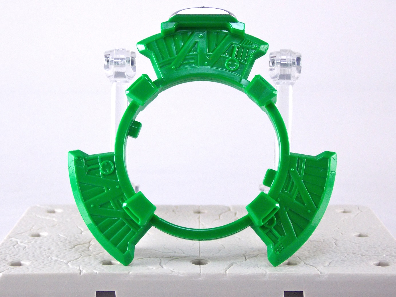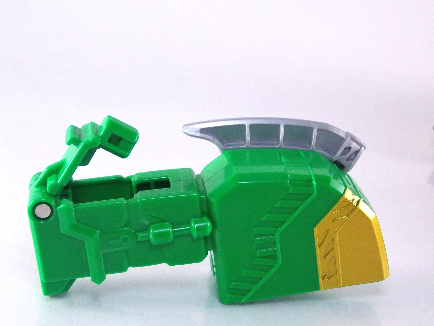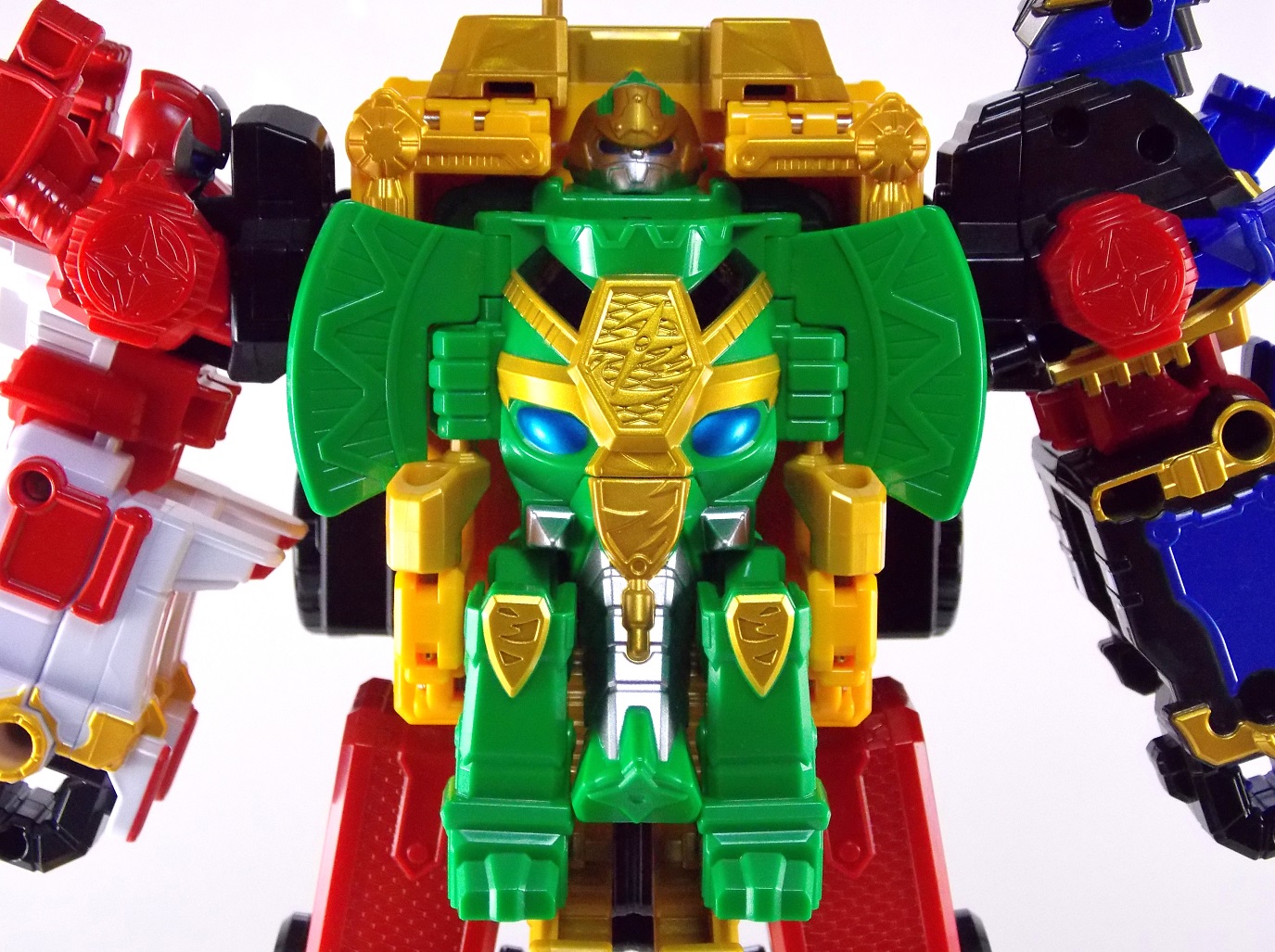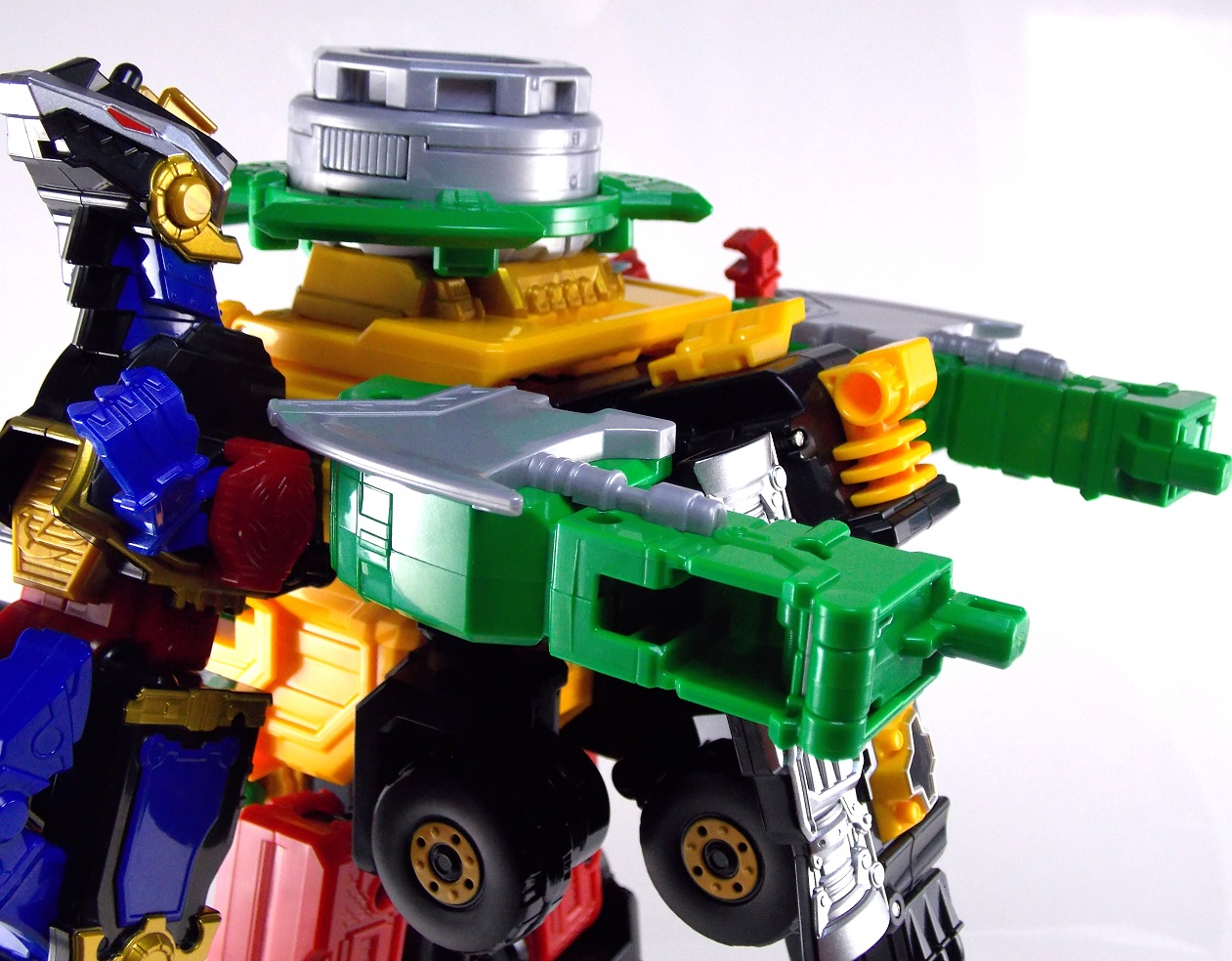 The incredible melting pot of the Shuriken Sentai Ninninger toyline continues with the addition of the first Otomonin upgrade mecha! The DX Paonmaru! Born from the first of the restored Sealing Shurikens, Paonmaru joins the Ninningers in their fight against the Youkai! But we're here to talk the toy of this interesting mecha, so read on below! Packaging DX Paonmaru comes in a pretty standard small cardboard box, and by the looks of it so will the rest of the Otomonin. It's pretty basic stuff for sentai lines honestly. Once one additional mecha comes out they almost all follow the same formula for packaging with each successive release. Some basic stock photography of the figure as well as shots of it's combined forms to round it all out. Main Figure A bit of an odd one, DX Paonmaru has an interesting transformation method to say the least. The standard form of this figure is indeed it's elephant form. To create it you need to take the the two axe weapons and plug them on to the back of tiny half robot. It's legs in turn fold out and forward. The Shuriken itself with the disc attached then plugs onto what will be the chest of the robot mode later. Then simply plug the elephant face and trunk on. Thus completing the look! It's actually a pretty intricate little figure in this mode, despite a general lack of much in the way of paint apps. Though nicely enough the head, front knees, & trunk are all painted very well. In the same way that Shinobimaru has a greatly detailed chest, so does Paonmaru. It's about on par sizewise with one of the only other elephants we got in sentai, Hyakuju Sentai Gaoranger's Gao Elephant. I don't actually own a Geki Elephant to compare it with. Though you can't get much pose wise from this form it's pretty fun. The basic robot mode for Paonmaru can be achieved by reassembling the given components. Separate everything back down to it's base and start from scratch with the small humanoid robot. Straighten the legs out properly and then fold the head up out of the back of it's chest. Take the face/trunk portion of the elephant and plug it onto the Paonmaru robot's chest which gives you the basic robot. The Elephant head actually completes the arms of the robot weirdly enough. The base robot only has elbow length arms but some tiny fists are sculpted into the head section to complete them. Then take the Axe/hind legs and attach them to the shoulders to add two giant missile launchers. The actual Shuriken and disc aren't used for this mode at all. But that gives you Paonmaru in robot mode, comparable size wise to Shinobimaru though quite a bit bulkier. He fits right in. Accessories It's hard to classify accessories with something like this as it's harder to distinguish between those items which are included with the figure optionally, or those things that are integral to it's basic structure. Nin Shuriken Base & Disc. This electronic item is what forms the head and face of Shurikenjin Paon. It's normally stored on Paonmaru's animal form plugged onto the neck as a mane-like appendage. I find it slightly odd that so far bot Paonmaru can store these items in at least one form, but Shinobimaru has no such storage options for the Shurikenjin Nin Shuriken when not in use. A pair of triggers on this piece detect when it's combined to form Shurikenjin Paon and plays out the appropriate phrase & music when done. When not connected pressing the physical button on top will cycle through three sound bytes "Paonger" "Paonmaru" & "Otomonin Shuriken". Shurikenjin Paon To get Shurikenjin ready for this combination you need to remove and rearrange a few things. Start by removing the standard Shurikenjin Shuriken and leaving that to the side, it won't be used. Remove Shinobimaru from the throne all together, and then remove the right arm made from Dumpmaru. People often question why a third shoulder peg exists on the back of the figure and it's for this, to store the arm you just removed! So plug the Dumpmaru arm there and transform Shinobimaru into the new right arm and plug him on. Now take the basic Paonmaru robot minus the shoulder cannons and fold his legs up to seat him in the throne. It should be noted that seating his hand over the control mechanisms on the throne is a little bit difficult. But once you do it looks pretty great. Then simply plug the Paon Shuriken onto the the neck of Shurikenjin. As a side not the new faceplate is pretty awesome looking compared to the standard Shurikenjin face, mine though appears to be molded on a little bit crookedly. Now take the Paon Axes and flip out some small handles on the bottom of each. Plug them into the combined robot's hands and there you have it, Shurikenjin Paon is formed! Sadly the axes are rather small and inaccurate but that's to be expected. These things tend to make some small compromises in toy form. Whether it's intentional or not you can plug the axes onto Shurikenjin's back for storage. This form manages to incorporate most everything from the standard Shurikenjin mode aside from the Shuriken, Drago Sword & Shield. But you'll see that you can still store or use the Drago Shield & Sword if you so choose. Either way Shurikenjin Paon is a pretty welcome sight. The green & gold Paonmaru brings to the table really helps break up the otherwise uniform color scheme of Shurikenjin and mixes it up a bit. It's a pretty great look actually. And because of the dynamic hips Shurikenjin has you can get some decent poses out this form. Final Thoughts As this line continues I continue to be very pleased. The Otomonin series of additional mecha is shaping up to be a pretty damn fun one. While it's likely these many upgrades won't be incorporated into any sort of final combination robo, they each seem to have a unique charm that I love. DX Paonmaru is a great addition to this line that once again gives it a pretty great variety of design. After 2 years of being pretty unimpressed by the mecha lines of sentai (Kyoryuger, ToQger) I'm happy