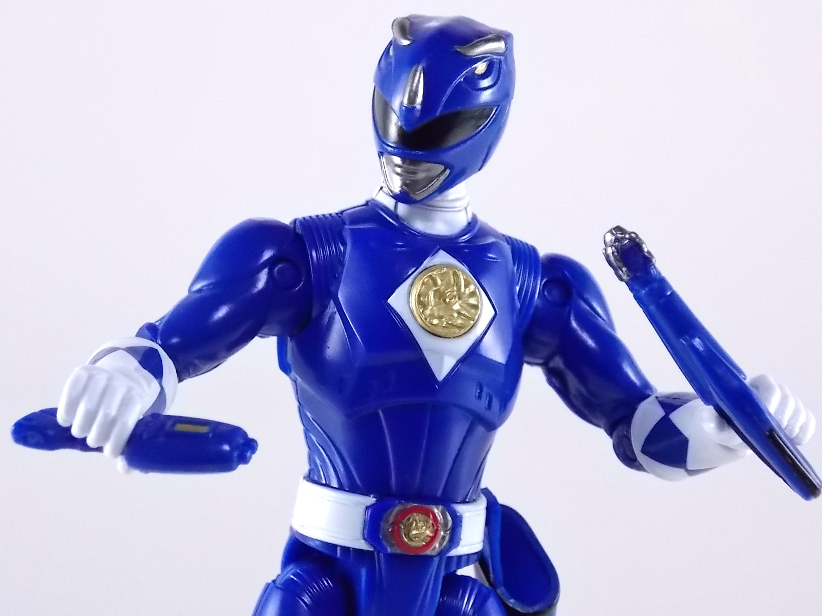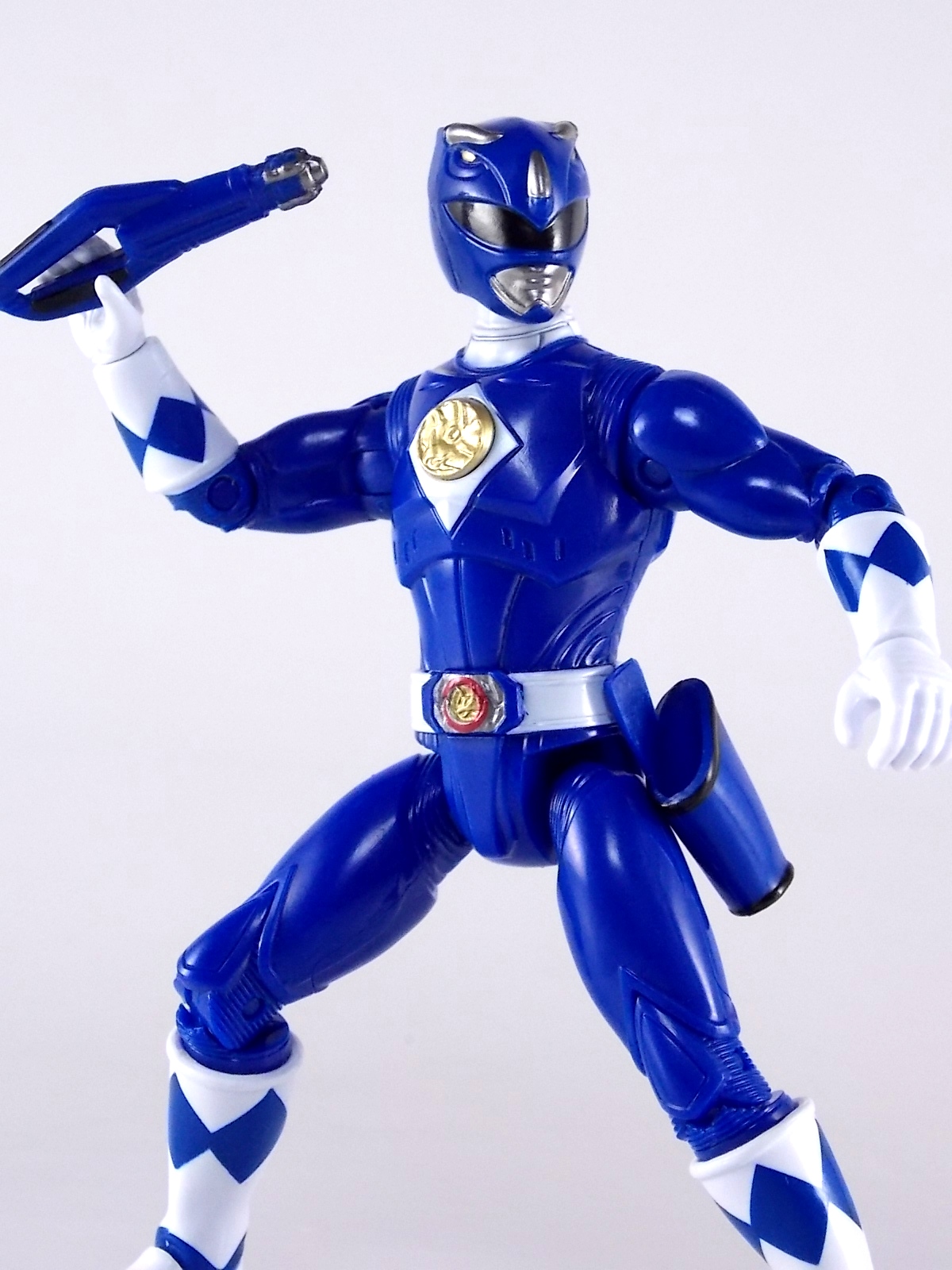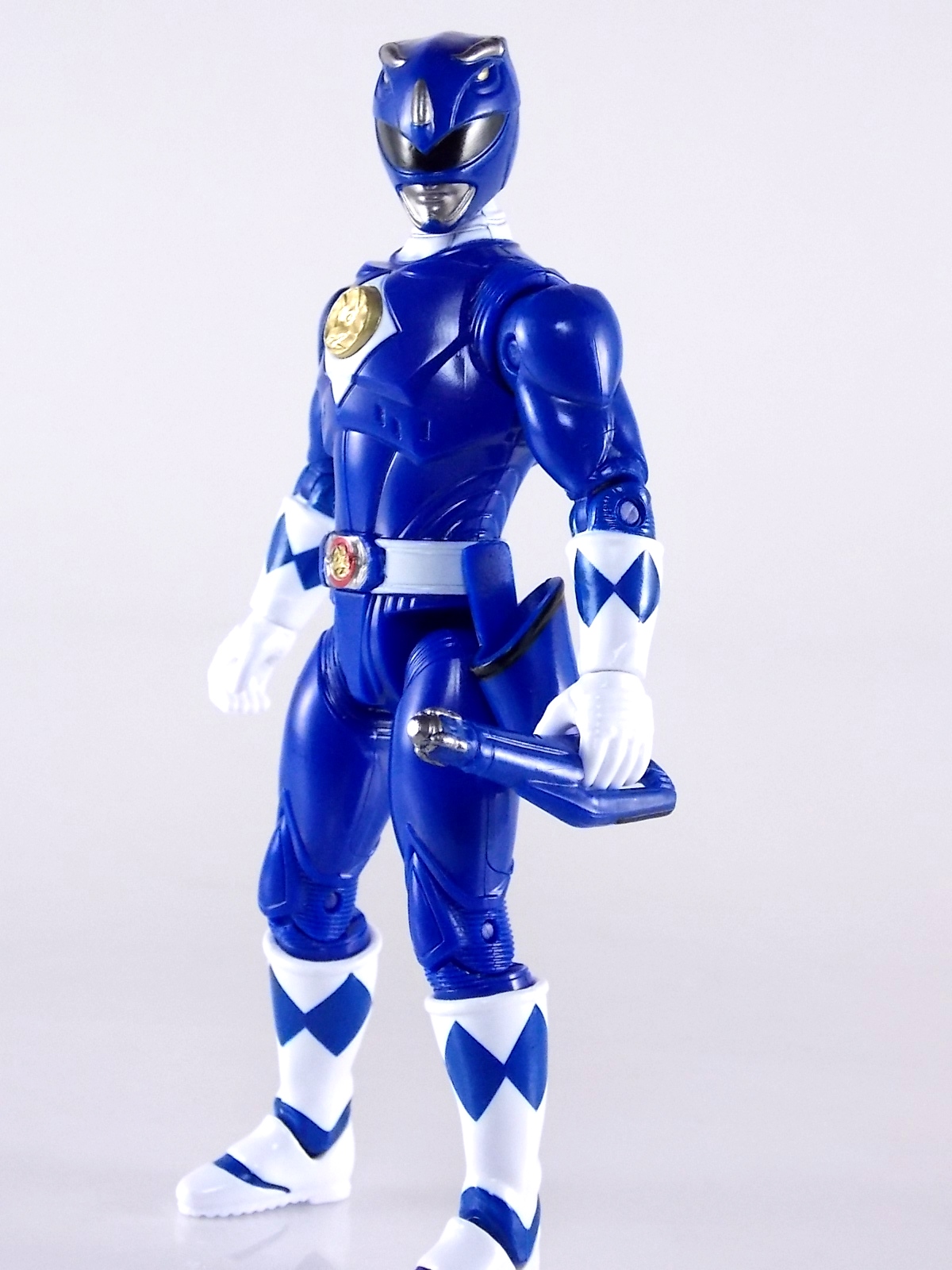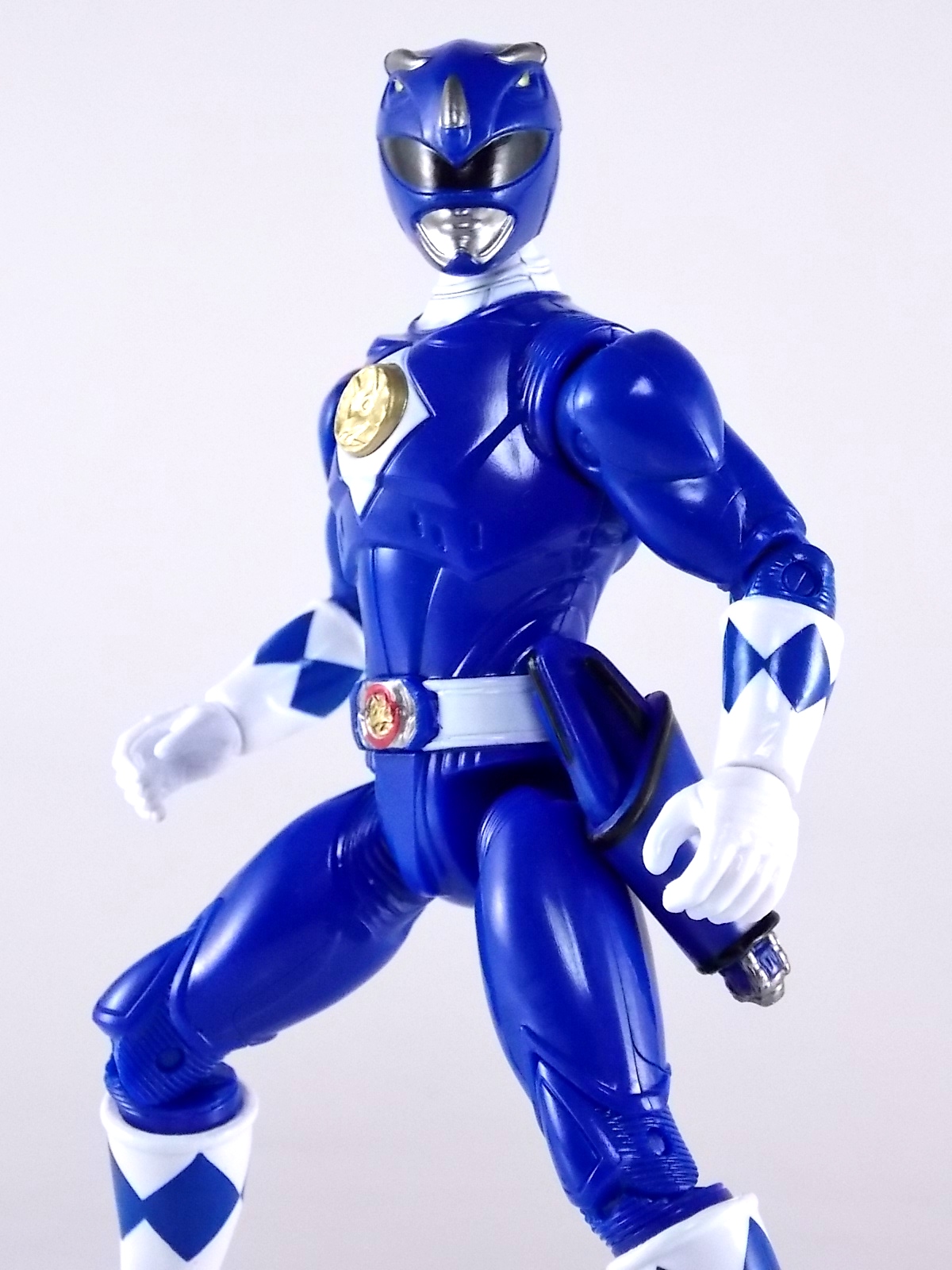 TokuNation is continuing it's celebration of the past with the 1995 film Mighty Morphin Power Rangers: The Movie! After a short hiatus we're back with yet another figure gallery honoring this movie, the 5" Legacy Movie Blue Ranger! Packaging If you haven't picked up a Power Rangers Movie Legacy figure by now, the Movie Blue Ranger follows the same basic formula. Packaged in a triangular box Bandai has done the best job they could at evoking the look of the vintage toys from the original movie toyline. Just as with the Legacy Mighty Morphin TV themed figures this box perfectly replicates the look of the movie toys, right down to the more bare bones black & white colors. It may look a little more drab but it's still a great package. Included on the front of the box is a call out to the 1995 film and to further that connection on the back is a brief description of the films plot. Even going so far as to mention Ivan Ooze & Dulcea. A brief bio about the Blue Ranger (Billy) is also given. Oddly the bio only makes mention of his Wolf Ninjazord, when technically speaking these figures are based on the rangers pre-ninja based suits from early into the film. The rangers received the ninja zords/powers after losing their original powers. Though the Triceratops and other dino zords were never seen in the film, Billy calls out "Triceratops!" to morph in the initial fight, and the Triceratops coin is still present both on his belt and chest on this figure. An oddity but not necessarily a detriment depending on how picky you are. More odd though I suppose was the total ignorance of the Thunder Zords having even existed in this films continuity. Figure As far as 5" figures go the Movie Blue Ranger at first glance appears to offer more than the stadard. To start you should know that this line of 5" Movie figures is literally the first time ever that the actual movie designs have been put into figure form. The original toys were mere metallic repaints of the TV show toys in movie packaging. But this figure is the real deal. From a sculpt and detail perspective alone this figure is leagues beyond the generally simple toys of the normal Power Rangers retail lines. Where those 5" figures feel flat and artificially roided out, the movie rangers are covered in armored technological detailing that really goes a long way to replicating the look of the actual costumes. Since these suits were more armor than spandex they had a lot of detail to them, so I'm pleased that the toy has managed to capture that. Though the finer details are pretty bad. The morpher/belt area and chest emblem have incredibly soft details. They just aren't properly sculpted. and look like they're made of butter or something. The head is also a little bit off to me, a little fuzzy and undefined. On the articulation front the figure has much of what we've come to expect. Hips that swing forward/back & side to side. Knees & shin swivels with surprisingly decent rocker ankles. No waist joint sadly. The arms however are as bad as I've come to expect generally. Simple shoulders that move forward & back and can't properly stretch out to allow the arm a full range of up/down movement. This is mostly due to the sculpted in shoulder pads, but it keeps the arms from getting into dynamic poses. Elbow articulation is limited to a 90 degree angle only, and the wrists while on ball joints don't have much clearance to make use of them, they also pop off. A lot. The arms are kind of frustrating to me though as a whole. A simple bicep swivel could have made them so much more dynamic. The head is on a fairly decent ball joint that allows for a good bit of tilting in all the primary directions too. I honestly didn't expect it to be as decent as it is. If only it had a little more clearance in the back. Also a peg hole is built into the left side of the belt area to accommodate the included accessories, or a similar one from another 5" Ranger figure. While I don't own the 5" Legacy MMPR TV Blue Ranger to compare this figure too, I did have the S.H. Figuarts Tricera Ranger on hand for a general comparison. Accessories 1 - holster. Used for the included weapon accessory 1 - Power Blaster/Blade Blaster. This is an odd one. While this item most certainly is in the film, in fact the 5 core rangers each have one holstered in the movie, none of them are ever used or seen outside the holster. Though the name Power Blaster has been given to the unused weapon, it's apparent that it's very much meant to be the film version of the TV shows Blade Blaster. The sculpt is a bit soft but whats worse is there are only minimal paint apps on the tip of the blade. Nothing elsr. Just a cheap piece of softly sculpted plastic. 1 - Stega Stinger. Though I would generously call it that. A small hunk of blue plastic that's hardly accurate to the real thing and has no functionality or unique sculpting at all that would lead you to believe it's a grappling hook device as it was on screen. Honestly it looks like a poor mans walkie talkie more than anything and can't be used for any really dynamic purposes, Sadly that's it. The Movie Blue Ranger comes only with the above items. I'd really hopedat least the Power Lance to be included as some sort of bonus to justify the supposed collector nature of this figure and it's price. While it may never have been seen in the film, the Blade/Power Blasters were never used either despite their appearance. And the weapon could easily have just been a repack form the Legacy 5" TV figure. As with the Movie Red Ranger, Movie Black Ranger, & Movie Pink Rangers' lack of an additional accessory I expected better. After this many figures though I shouldn't be surprised. Final Thoughts As I've said in my previous Movie Ranger reviews, I love that original movie. Terrible characters, plot, CG and all. The suit designs have never been properly put into toy form til now. Which nudged me into buying these figures. However I find myself disappointed with each of the