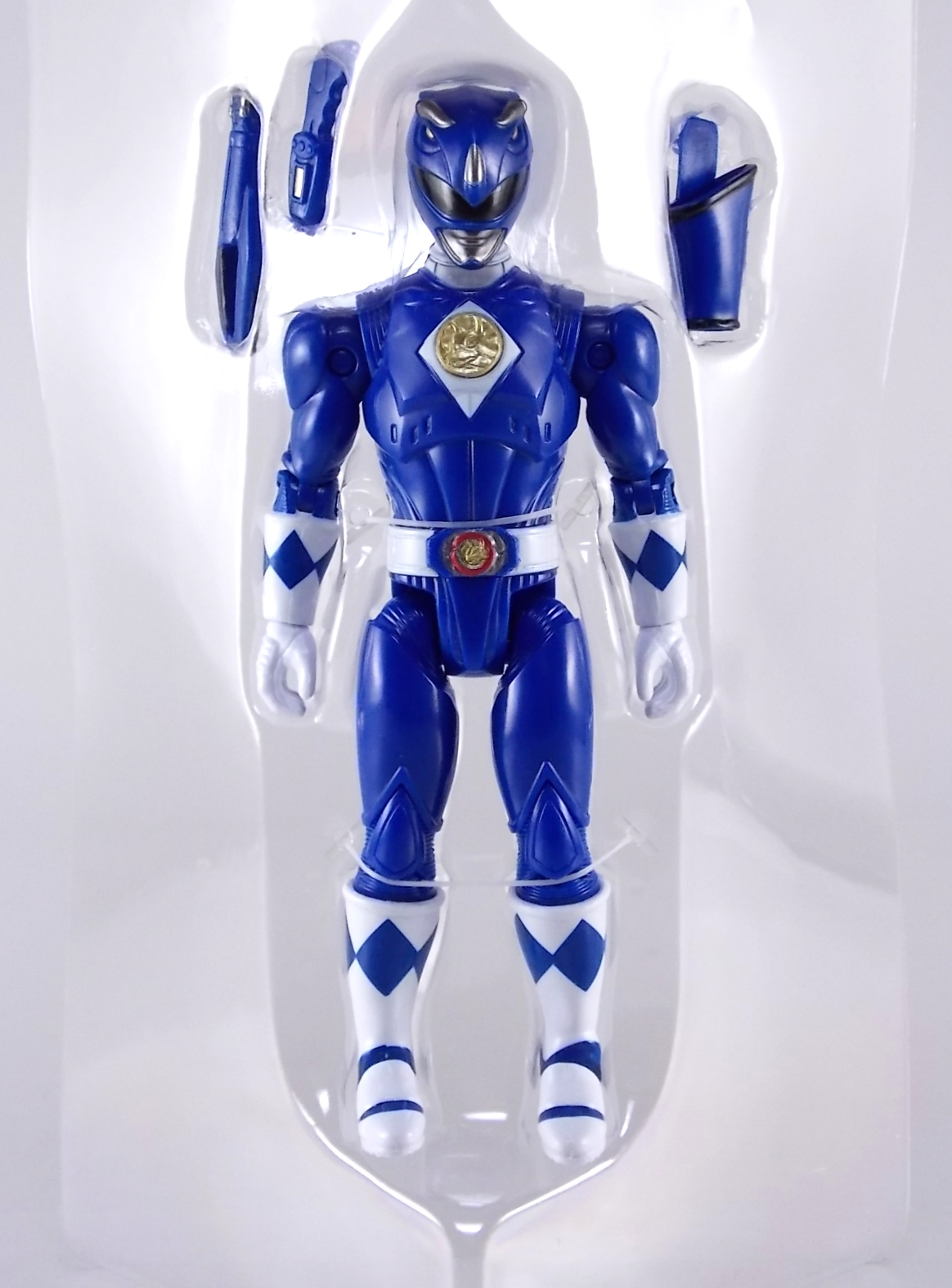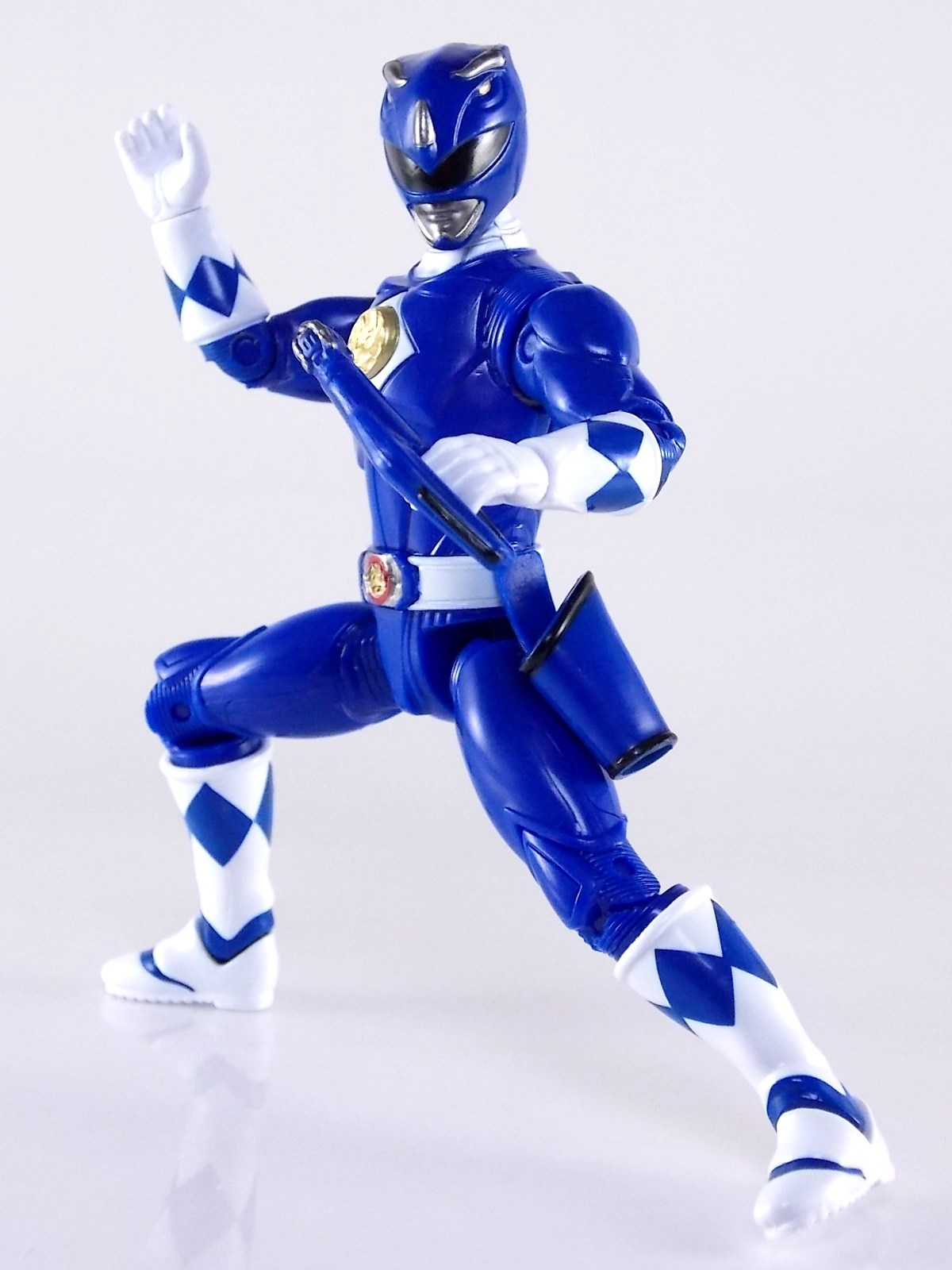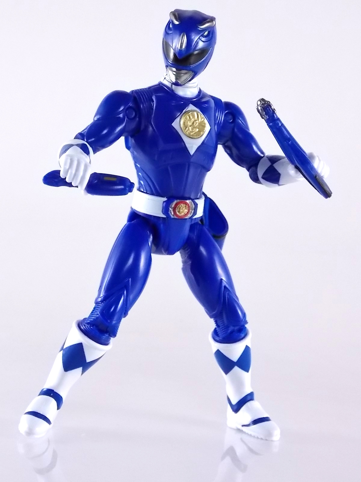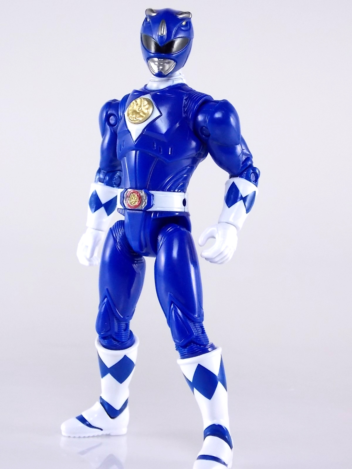 TokuNation is continuing it's celebration of the past with the 1995 film Mighty Morphin Power Rangers: The Movie! After a short hiatus we're back with yet another figure gallery honoring this movie, the 5" Legacy Movie Blue Ranger! Packaging If you haven't picked up a Power Rangers Movie Legacy figure by now, the Movie Blue Ranger follows the same basic formula. Packaged in a triangular box Bandai has done the best job they could at evoking the look of the vintage toys from the original movie toyline. Just as with the Legacy Mighty Morphin TV themed figures this box perfectly replicates the look of the movie toys, right down to the more bare bones black & white colors. It may look a little more drab but it's still a great package. Included on the front of the box is a call out to the 1995 film and to further that connection on the back is a brief description of the films plot. Even going so far as to mention Ivan Ooze & Dulcea. A brief bio about the Blue Ranger (Billy) is also given. Oddly the bio only makes mention of his Wolf Ninjazord, when technically speaking these figures are based on the rangers pre-ninja based suits from early into the film. The rangers received the ninja zords/powers after losing their original powers. Though the Triceratops and other dino zords were never seen in the film, Billy calls out "Triceratops!" to morph in the initial fight, and the Triceratops coin is still present both on his belt and chest on this figure. An oddity but not necessarily a detriment depending on how picky you are. More odd though I suppose was the total ignorance of the Thunder Zords having even existed in this films continuity. Figure As far as 5" figures go the Movie Blue Ranger at first glance appears to offer more than the stadard. To start you should know that this line of 5" Movie figures is literally the first time ever that the actual movie designs have been put into figure form. The original toys were mere metallic repaints of the TV show toys in movie packaging. But this figure is the real deal. From a sculpt and detail perspective alone this figure is leagues beyond the generally simple toys of the normal Power Rangers retail lines. Where those 5" figures feel flat and artificially roided out, the movie rangers are covered in armored technological detailing that really goes a long way to replicating the look of the actual costumes. Since these suits were more armor than spandex they had a lot of detail to them, so I'm pleased that the toy has managed to capture that. Though the finer details are pretty bad. The morpher/belt area and chest emblem have incredibly soft details. They just aren't properly sculpted. and look like they're made of butter or something. The head is also a little bit off to me, a little fuzzy and undefined. On the articulation front the figure has much of what we've come to expect. Hips that swing forward/back & side to side. Knees & shin swivels with surprisingly decent rocker ankles. No waist joint sadly. The arms however are as bad as I've come to expect generally. Simple shoulders that move forward & back and can't properly stretch out to allow the arm a full range of up/down movement. This is mostly due to the sculpted in shoulder pads, but it keeps the arms from getting into dynamic poses. Elbow articulation is limited to a 90 degree angle only, and the wrists while on ball joints don't have much clearance to make use of them, they also pop off. A lot. The arms are kind of frustrating to me though as a whole. A simple bicep swivel could have made them so much more dynamic. The head is on a fairly decent ball joint that allows for a good bit of tilting in all the primary directions too. I honestly didn't expect it to be as decent as it is. If only it had a little more clearance in the back. Also a peg hole is built into the left side of the belt area to accommodate the included accessories, or a similar one from another 5" Ranger figure. While I don't own the 5" Legacy MMPR TV Blue Ranger to compare this figure too, I did have the S.H. Figuarts Tricera Ranger on hand for a general comparison. Accessories 1 - holster. Used for the included weapon accessory 1 - Power Blaster/Blade Blaster. This is an odd one. While this item most certainly is in the film, in fact the 5 core rangers each have one holstered in the movie, none of them are ever used or seen outside the holster. Though the name Power Blaster has been given to the unused weapon, it's apparent that it's very much meant to be the film version of the TV shows Blade Blaster. The sculpt is a bit soft but whats worse is there are only minimal paint apps on the tip of the blade. Nothing elsr. Just a cheap piece of softly sculpted plastic. 1 - Stega Stinger. Though I would generously call it that. A small hunk of blue plastic that's hardly accurate to the real thing and has no functionality or unique sculpting at all that would lead you to believe it's a grappling hook device as it was on screen. Honestly it looks like a poor mans walkie talkie more than anything and can't be used for any really dynamic purposes, Sadly that's it. The Movie Blue Ranger comes only with the above items. I'd really hopedat least the Power Lance to be included as some sort of bonus to justify the supposed collector nature of this figure and it's price. While it may never have been seen in the film, the Blade/Power Blasters were never used either despite their appearance. And the weapon could easily have just been a repack form the Legacy 5" TV figure. As with the Movie Red Ranger, Movie Black Ranger, & Movie Pink Rangers' lack of an additional accessory I expected better. After this many figures though I shouldn't be surprised. Final Thoughts As I've said in my previous Movie Ranger reviews, I love that original movie. Terrible characters, plot, CG and all. The suit designs have never been properly put into toy form til now. Which nudged me into buying these figures. However I find myself disappointed with each of the