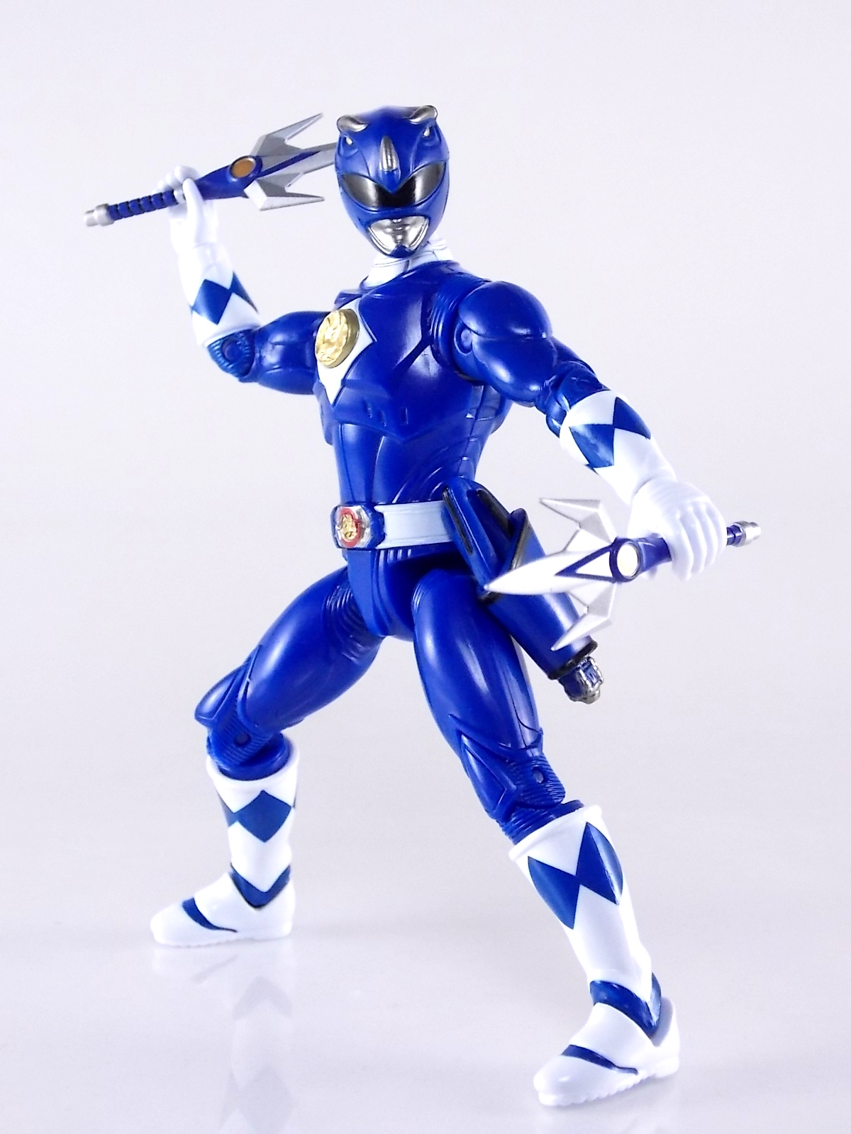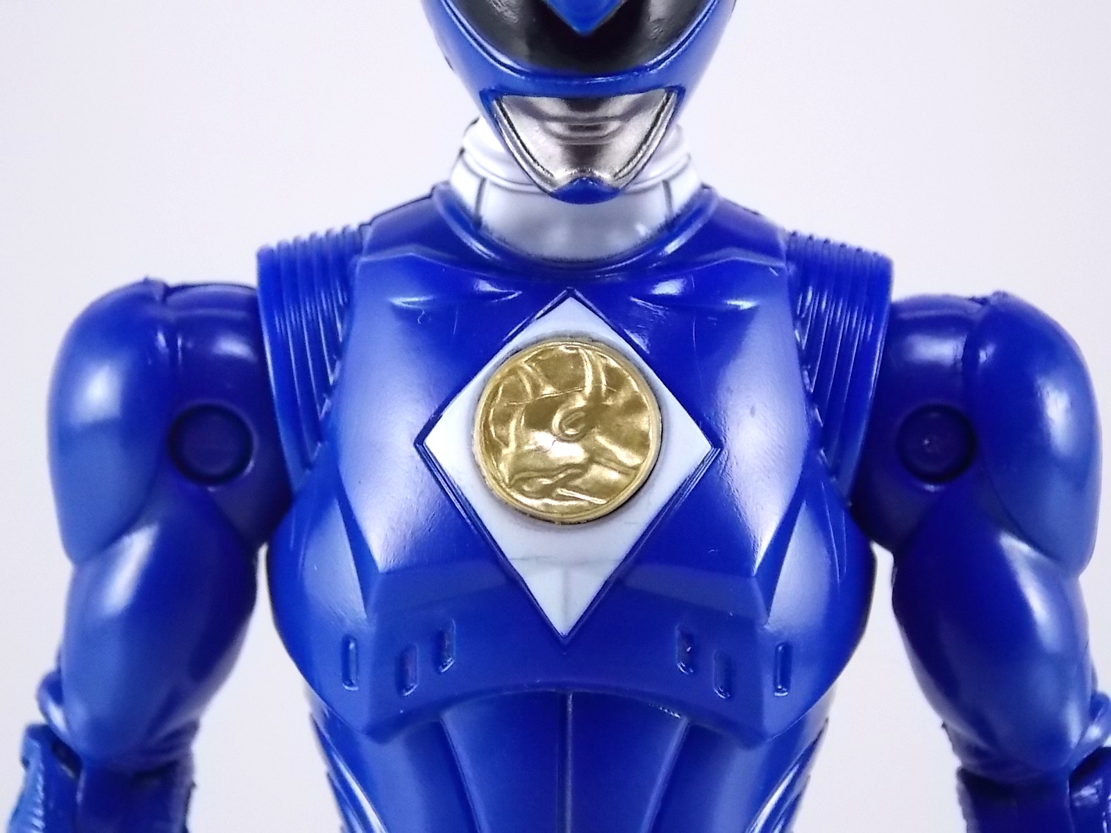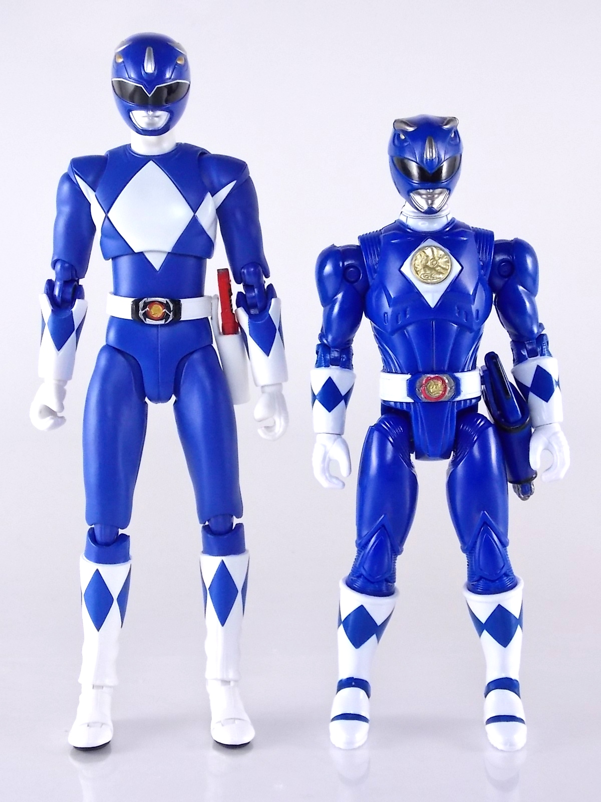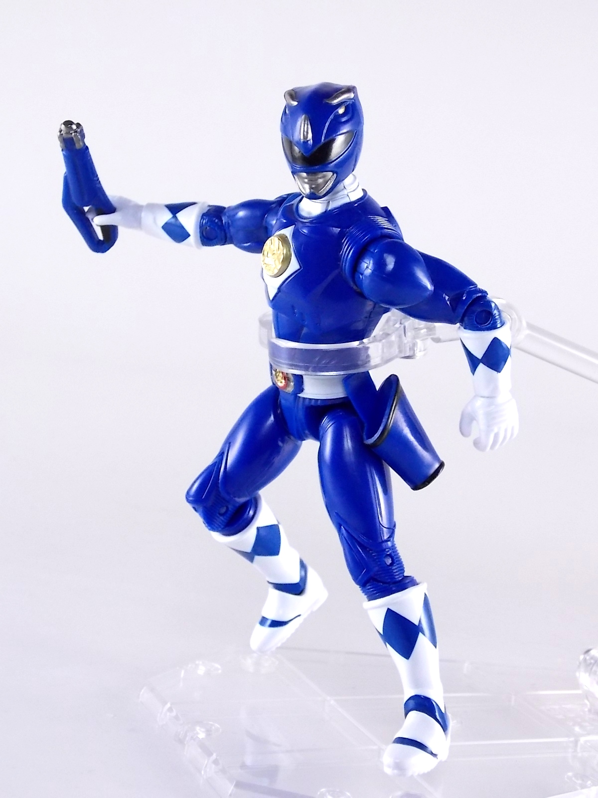 TokuNation is continuing it's celebration of the past with the 1995 film Mighty Morphin Power Rangers: The Movie! After a short hiatus we're back with yet another figure gallery honoring this movie, the 5" Legacy Movie Blue Ranger! Packaging If you haven't picked up a Power Rangers Movie Legacy figure by now, the Movie Blue Ranger follows the same basic formula. Packaged in a triangular box Bandai has done the best job they could at evoking the look of the vintage toys from the original movie toyline. Just as with the Legacy Mighty Morphin TV themed figures this box perfectly replicates the look of the movie toys, right down to the more bare bones black & white colors. It may look a little more drab but it's still a great package. Included on the front of the box is a call out to the 1995 film and to further that connection on the back is a brief description of the films plot. Even going so far as to mention Ivan Ooze & Dulcea. A brief bio about the Blue Ranger (Billy) is also given. Oddly the bio only makes mention of his Wolf Ninjazord, when technically speaking these figures are based on the rangers pre-ninja based suits from early into the film. The rangers received the ninja zords/powers after losing their original powers. Though the Triceratops and other dino zords were never seen in the film, Billy calls out "Triceratops!" to morph in the initial fight, and the Triceratops coin is still present both on his belt and chest on this figure. An oddity but not necessarily a detriment depending on how picky you are. More odd though I suppose was the total ignorance of the Thunder Zords having even existed in this films continuity. Figure As far as 5" figures go the Movie Blue Ranger at first glance appears to offer more than the stadard. To start you should know that this line of 5" Movie figures is literally the first time ever that the actual movie designs have been put into figure form. The original toys were mere metallic repaints of the TV show toys in movie packaging. But this figure is the real deal. From a sculpt and detail perspective alone this figure is leagues beyond the generally simple toys of the normal Power Rangers retail lines. Where those 5" figures feel flat and artificially roided out, the movie rangers are covered in armored technological detailing that really goes a long way to replicating the look of the actual costumes. Since these suits were more armor than spandex they had a lot of detail to them, so I'm pleased that the toy has managed to capture that. Though the finer details are pretty bad. The morpher/belt area and chest emblem have incredibly soft details. They just aren't properly sculpted. and look like they're made of butter or something. The head is also a little bit off to me, a little fuzzy and undefined. On the articulation front the figure has much of what we've come to expect. Hips that swing forward/back & side to side. Knees & shin swivels with surprisingly decent rocker ankles. No waist joint sadly. The arms however are as bad as I've come to expect generally. Simple shoulders that move forward & back and can't properly stretch out to allow the arm a full range of up/down movement. This is mostly due to the sculpted in shoulder pads, but it keeps the arms from getting into dynamic poses. Elbow articulation is limited to a 90 degree angle only, and the wrists while on ball joints don't have much clearance to make use of them, they also pop off. A lot. The arms are kind of frustrating to me though as a whole. A simple bicep swivel could have made them so much more dynamic. The head is on a fairly decent ball joint that allows for a good bit of tilting in all the primary directions too. I honestly didn't expect it to be as decent as it is. If only it had a little more clearance in the back. Also a peg hole is built into the left side of the belt area to accommodate the included accessories, or a similar one from another 5" Ranger figure. While I don't own the 5" Legacy MMPR TV Blue Ranger to compare this figure too, I did have the S.H. Figuarts Tricera Ranger on hand for a general comparison. Accessories 1 - holster. Used for the included weapon accessory 1 - Power Blaster/Blade Blaster. This is an odd one. While this item most certainly is in the film, in fact the 5 core rangers each have one holstered in the movie, none of them are ever used or seen outside the holster. Though the name Power Blaster has been given to the unused weapon, it's apparent that it's very much meant to be the film version of the TV shows Blade Blaster. The sculpt is a bit soft but whats worse is there are only minimal paint apps on the tip of the blade. Nothing elsr. Just a cheap piece of softly sculpted plastic. 1 - Stega Stinger. Though I would generously call it that. A small hunk of blue plastic that's hardly accurate to the real thing and has no functionality or unique sculpting at all that would lead you to believe it's a grappling hook device as it was on screen. Honestly it looks like a poor mans walkie talkie more than anything and can't be used for any really dynamic purposes, Sadly that's it. The Movie Blue Ranger comes only with the above items. I'd really hopedat least the Power Lance to be included as some sort of bonus to justify the supposed collector nature of this figure and it's price. While it may never have been seen in the film, the Blade/Power Blasters were never used either despite their appearance. And the weapon could easily have just been a repack form the Legacy 5" TV figure. As with the Movie Red Ranger, Movie Black Ranger, & Movie Pink Rangers' lack of an additional accessory I expected better. After this many figures though I shouldn't be surprised. Final Thoughts As I've said in my previous Movie Ranger reviews, I love that original movie. Terrible characters, plot, CG and all. The suit designs have never been properly put into toy form til now. Which nudged me into buying these figures. However I find myself disappointed with each of the