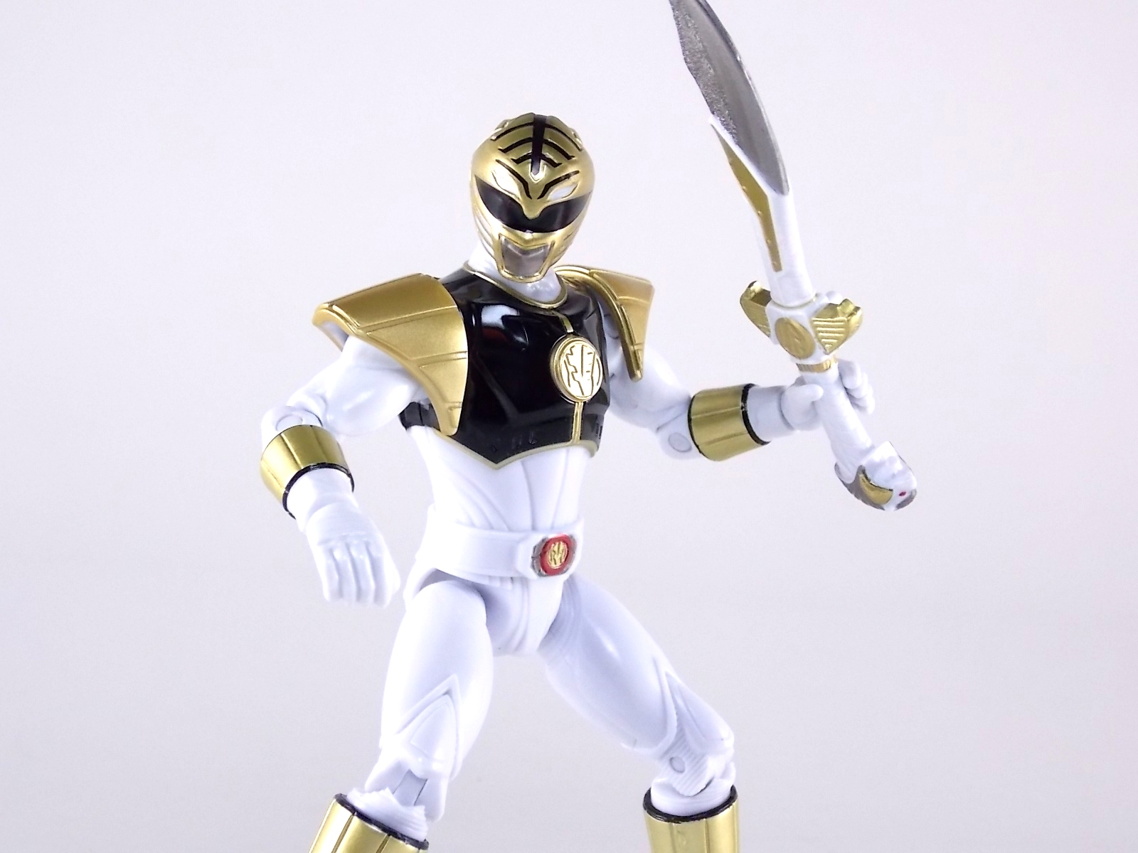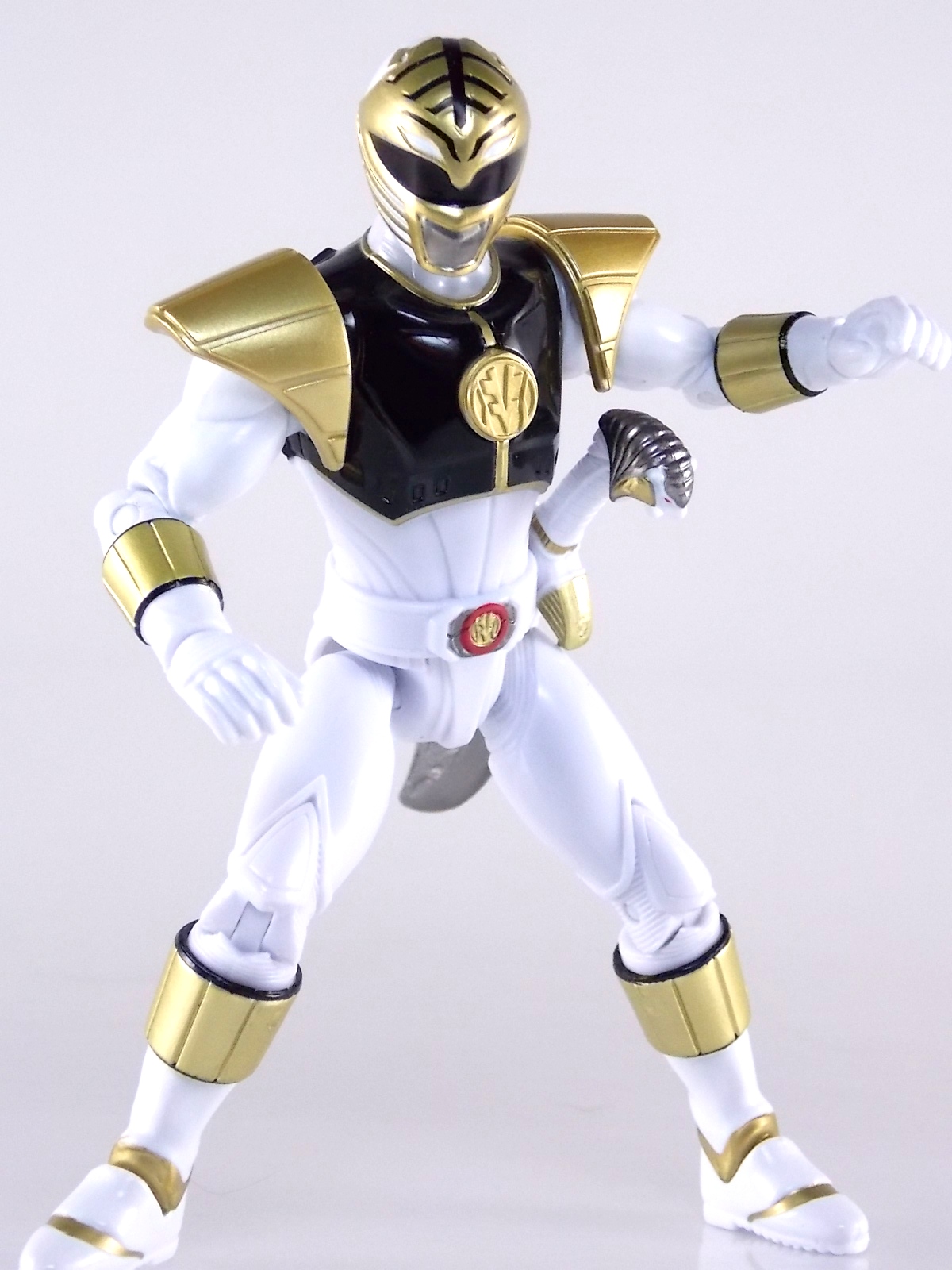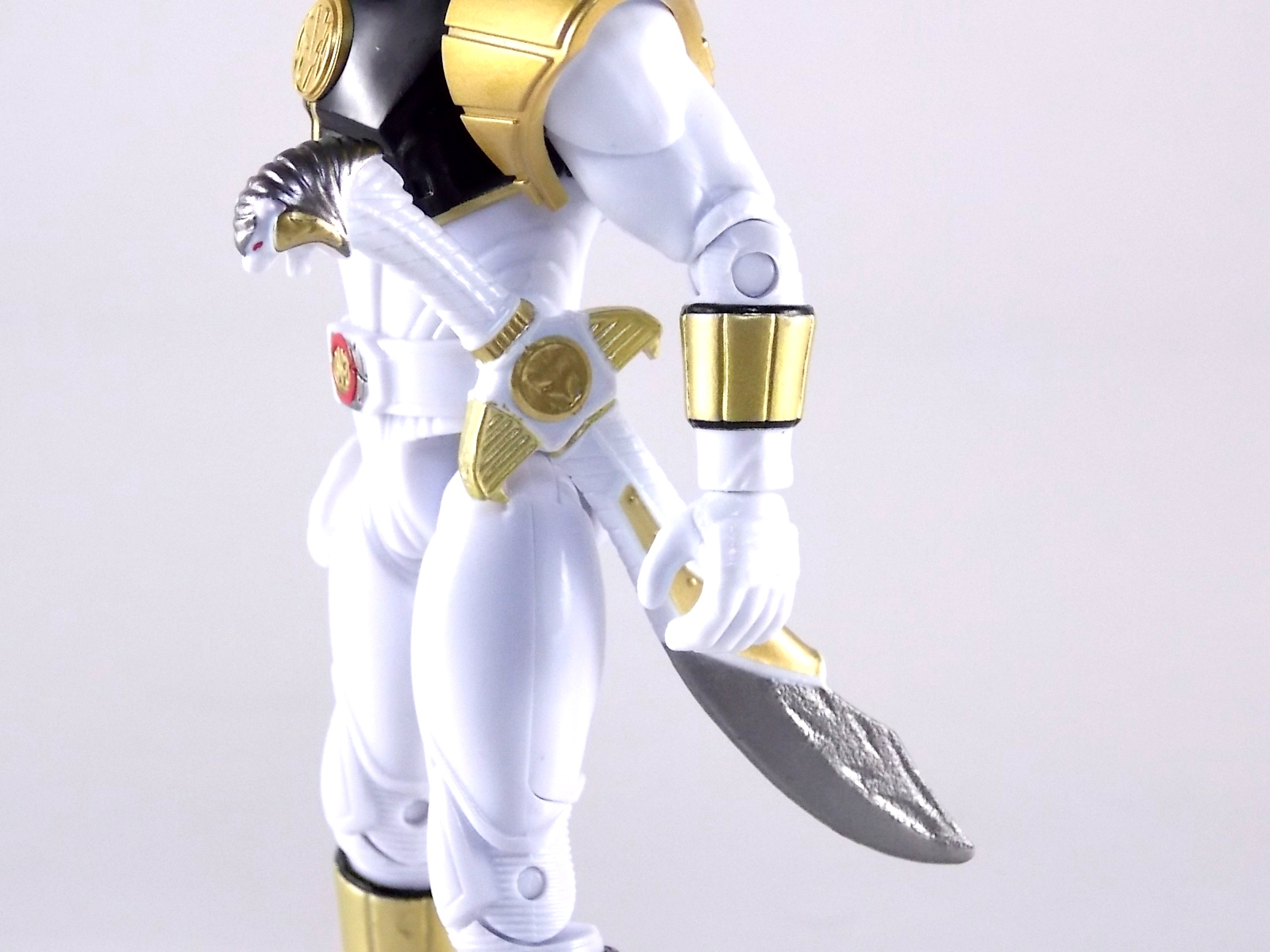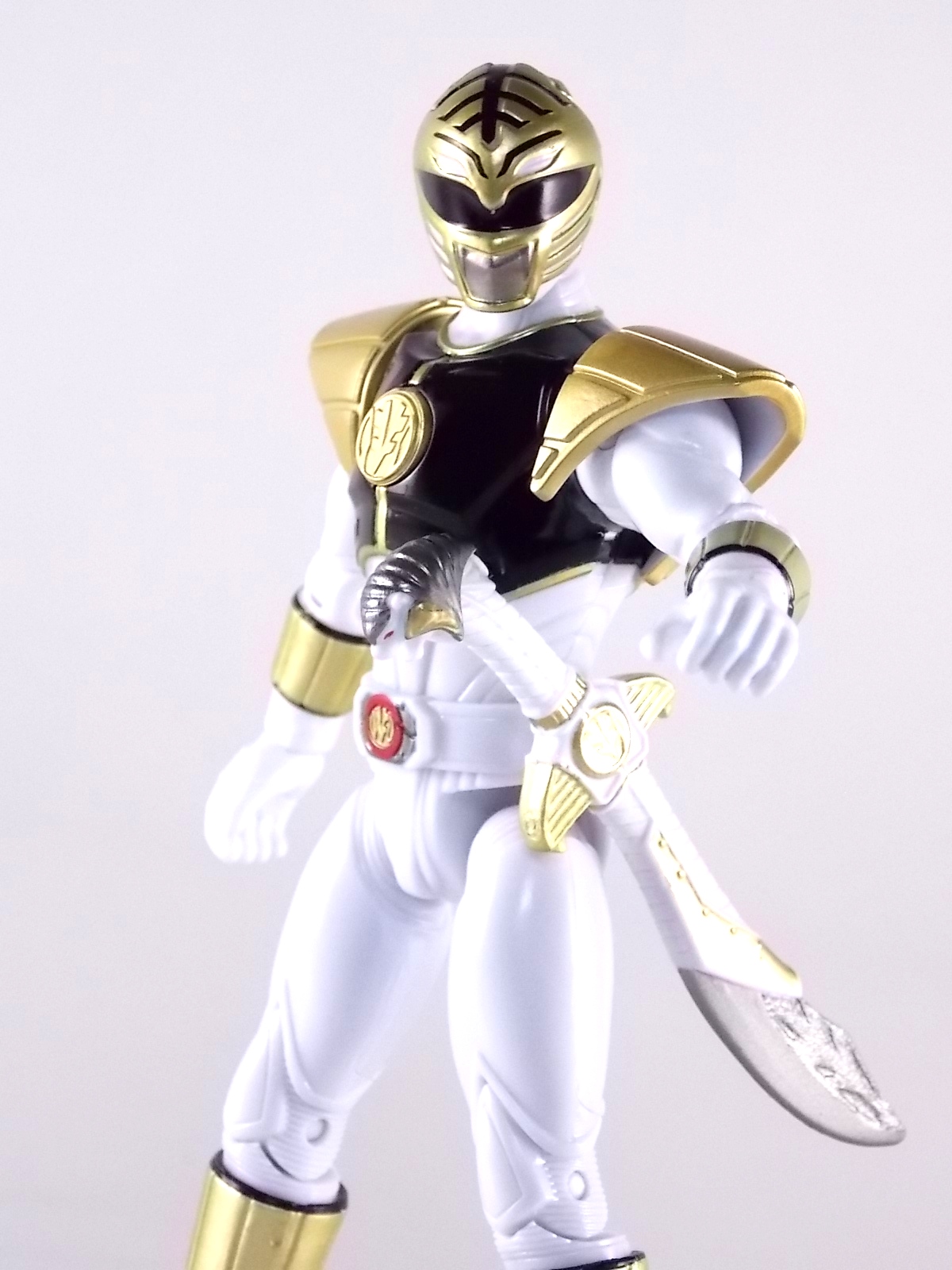 TokuNation is back with it's FINAL installment in our recent series of Mighty Morphin Power Rangers: The Movie galleries! The 7th and final figure in Bandai of America's Lecay 5" Movie line, the Movie White Ranger! Packaging If you haven't picked up a Power Rangers Movie Legacy figure by now, the Movie White Ranger follows the same basic formula. Packaged in a triangular box Bandai has done the best job they could at evoking the look of the vintage toys from the original movie toyline. The black & white color scheme may look a little more drab but it's still a great package. Showcased on the front of the box is a call out to the 1995 film itself and to further that connection on the back is a brief description of the films plot. Even going so far as to mention Ivan Ooze & Dulcea. A brief bio about the White Ranger (Tommy) is also given. Oddly the bio only makes mention of his Falconzord, when actually these figures are based on the rangers pre-ninja based suits from early into the film. The rangers received the ninja zords/powers after losing their original powers. Though the Tigerzord and other Dino & Thunder zords were never seen in the film, Tommy calls out "Tigerzord!" to morph in the initial fight, and the Tigerzord coin is still present both on his belt and chest on this figure. An oddity but not necessarily a detriment depending on how picky you are. More odd though I suppose was the total ignorance of the Thunder Zords having even existed in this films continuity. Figure As far as 5" figures go the Movie White Ranger at first glance appears to offer more than the standard. To start you should know that this line of 5" Movie figures is literally the first time ever that the actual movie designs have been put into figure form. The original toys were mere metallic repaints of the TV show toys in movie packaging. But this figure is the real deal. From a sculpt and detail perspective alone this figure is leagues beyond the generally simple toys of the normal Power Rangers retail lines. Where those 5" figures feel flat and artificially roided out, the movie rangers are covered in armored technological detailing that really goes a long way to replicating the look of the actual costumes. Since these suits were more armor than spandex they had a lot of detail to them, so I'm pleased that the toy has managed to capture that. Though finer details at least on this figure are a bit superior to the other 5 rangers released in this line. Though the head still feels a little undefined. On the articulation front the figure has much of what we've come to expect. Hips that swing forward/back & side to side. Knees & shin swivels with surprisingly decent rocker ankles. No waist joint sadly. The arms however are as bad as I've come to expect generally. Simple shoulders that move forward & back and can't properly stretch out to allow the arm a full range of up/down movement. Though it must be pointed out that the shoulder armor is hinged to move up and down a little bit to make this more manageable. Already an improvement on the core 5 rangers. Elbow articulation is limited to a 90 degree angle only, and the wrists while on ball joints don't have much clearance to make use of them, they also pop off. A lot. The arms are still kind of frustrating to me but this figure succeeds in having a slightly better version of them. The head is on a fairly decent ball joint that allows for a good bit of tilting in all the primary directions too. And after seeing this same design 6 times over it's still about as serviceable as when I first encountered it. Also a peg hole is built into the left side of the belt area to accommodate the included accessory, or a similar one from another 5" Ranger figure. While I don't own the 5" Legacy MMPR TV White Ranger to compare this figure too, I did have the S.H. Figuarts Kiba Ranger on hand for a general comparison. Accessories The Legacy 5" Movie White Ranger includes a mere single accessory. Though arguably this figure has the most appropriate accessory placement of any of the Movie Legacy figures: 1 - Saba. The patented sidekick and trademark special weapon of the White ranger. Honestly this is a pretty great accessory, it's detailed pretty nicely, painted very very well and is just about the right scale to the figure. It has a peg built into it to allow you to store it on the figures hip which is odd. I would have thought a holster would have been more appropriate, especially considering the other 5 rangers have them. And that's it. The Movie White Ranger comes only with Saba. Unlike the other 5 figures in this line I'm okay with this. Tommy only ever used Saba in both the TV show and Movie. He didn't use a Power Blaster and had no other additional weapons or powers exclusive to him for the film. Would it have been nice for a Blaster & Holster to be thrown in as bonuses? Sure. But in this case I'm not bothered by the lack of them either. Final Thoughts And that's that! After 7 long reviews and galleries we've officially taken a look at Bandai of America's ENTIRE Legacy offering for the original Mighty Morphin Power Rangers Movie! It's easy for me to admit that a majority (all but one of these figures) were quite disappointing to me personally. What's more odd is that the White Ranger would wind up being the one not only with the best design and QC but the one I liked the most. This figure seems to have a bit more thought put into than the other 5 rangers or Ivan. To check out our previous gallery/reviews of the other Movie Legacy 5" figures follow the helpful links below: Legacy 5" Movie Red Ranger Gallery Legacy 5" Movie Black Ranger Gallery Legacy 5" Movie Pink Ranger Gallery Legacy 5" Movie Blue Ranger Gallery Legacy 5" Movie Yellow Ranger Gallery Legacy 5" Movie Ivan Ooze Gallery May the power protect you!