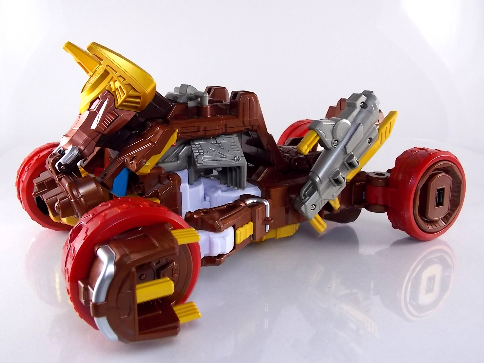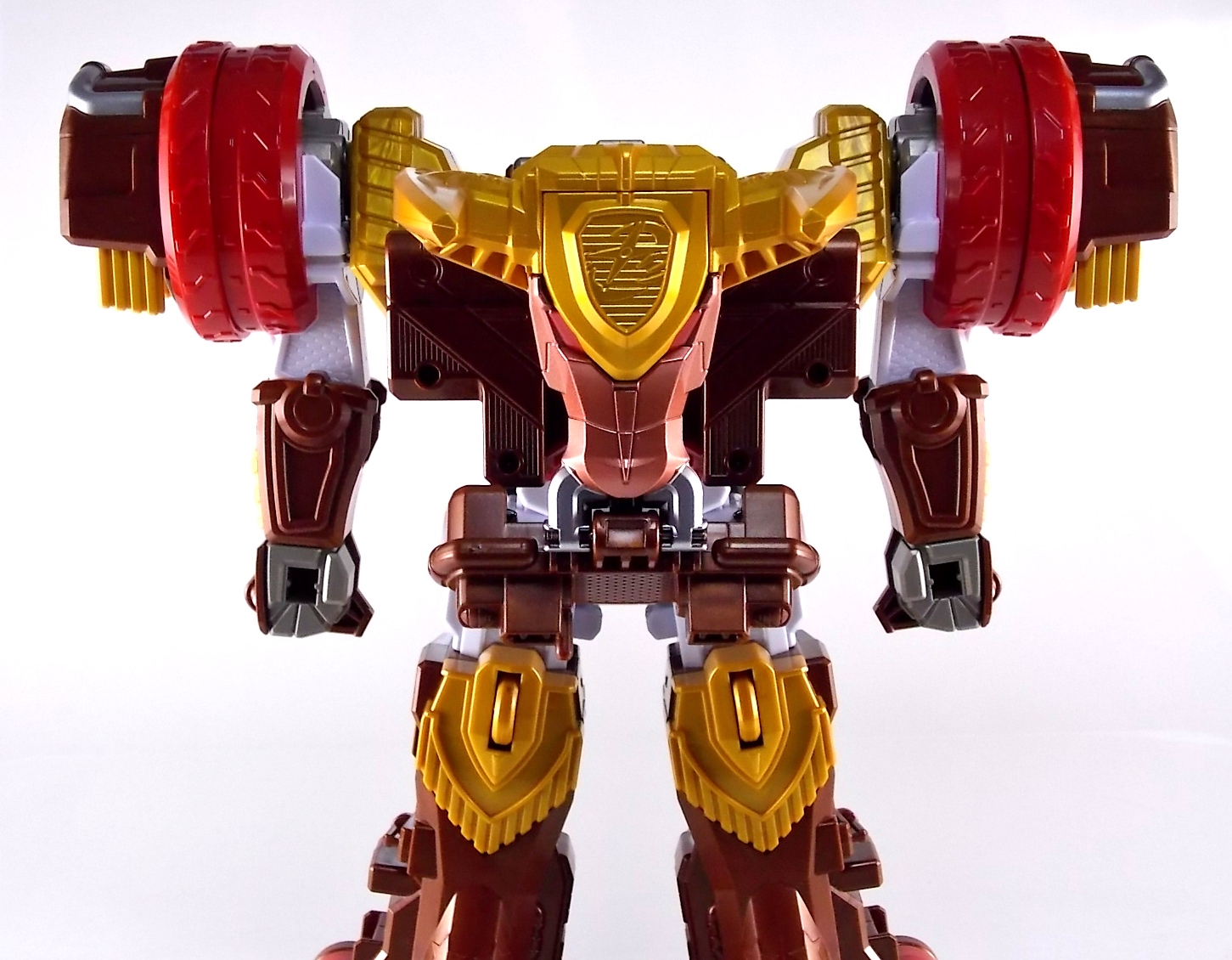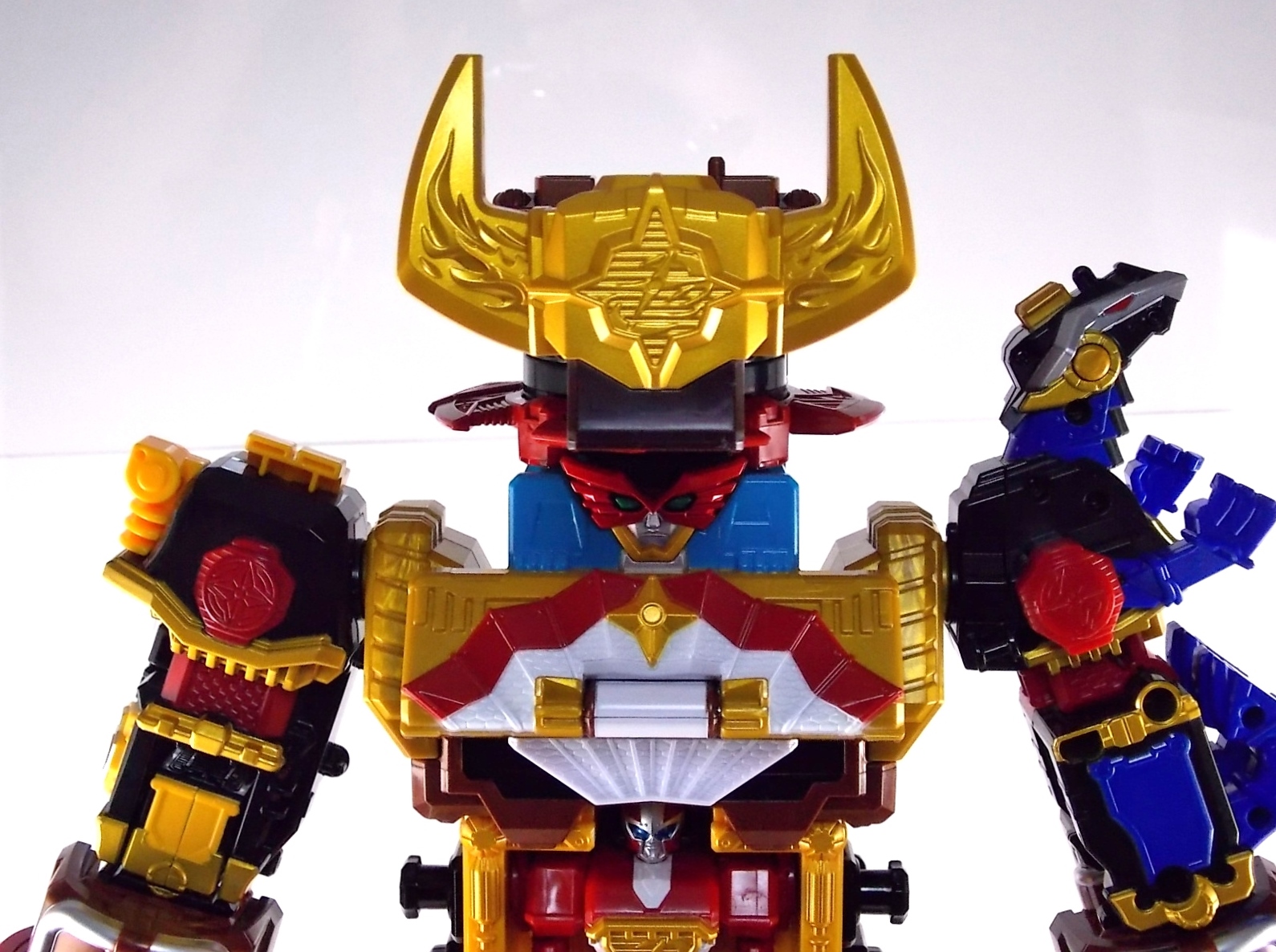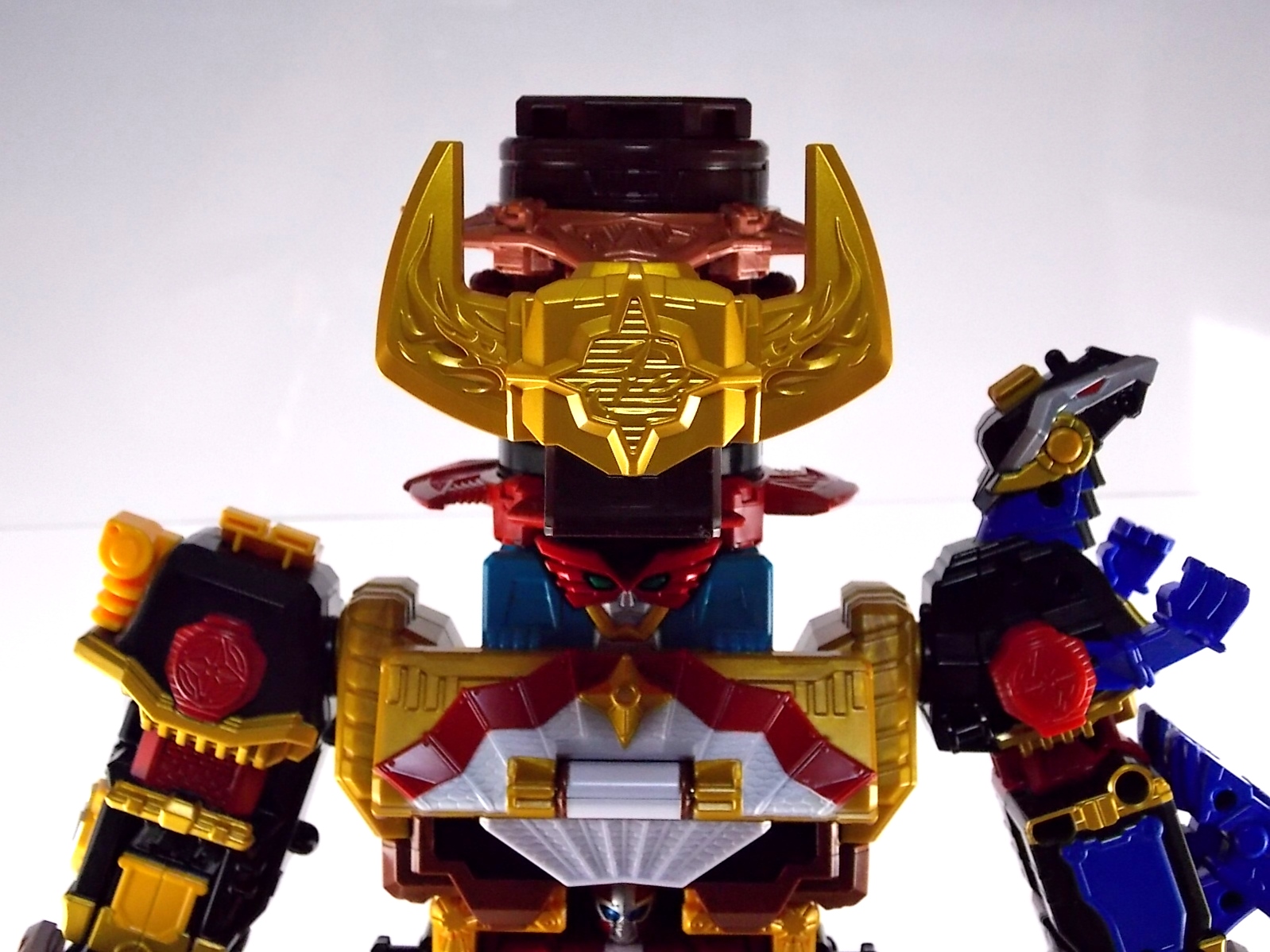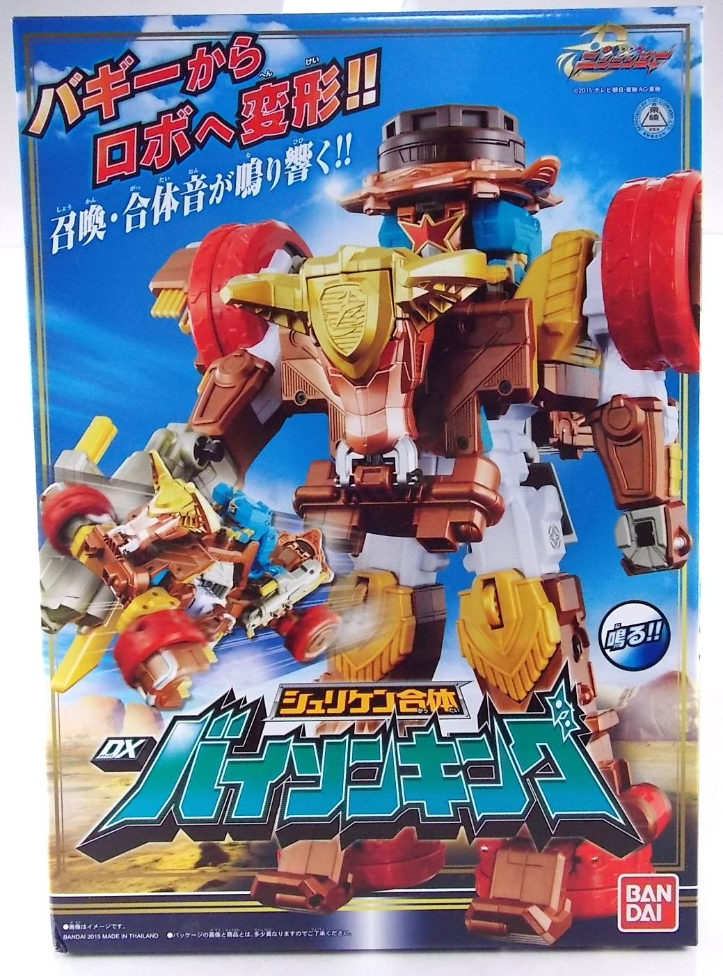 TokuNation is proud to present the fourth in it's series of galleries looking at the DX mecha line of Shuriken Sentai Ninninger! This galleries' subject is the recent release DX Bison King! ** This gallery contains 100 images! So it's spread across 3 posts, check each to see a different selection of images. Pacakging The box itself is very busy in it's presentation, as DX sentai robos tend to be. Not quite as dynamic as the DX Shurikenjin box, Bison Kings' still gives us a good look at all the modes of play as well as the eventual combined form with Shurikenjin. Nin Shuriken Included with this set is a Bison King Shuriken. This electronic item is what forms the head and face of Bison King. It's normally stored on the rear end of the Bison Buggy when not used to form the main robo. A pair of triggers on this piece detect when it's combined to form either Bison King or King Shurikenjin and plays out the appropriate phrases when done. When not connected pressing the physical button on top will cycle through a couple of phrases: "The Come on!" "Who are you? Who arrrrre you?!" "Rodeomaru!" When adding one of the Nin Shuriken discs to this base component you slide them on at an angle, lining up the side tabs. When it's all the way down, turn it to the right to lock it in place. A release trigger can be held down to ensure you don't damage the very rubbery plastic of the disc when it's removed later. Rodeomaru Diving right in with the main review we take a look at the true core of Bison King with Rodeomaru! As the name implies Rodeomaru is a cowboy themed Otomonin very similar in design and premise to Shinobimaru. Rodeomaru is a bit different functionally however. You'll see that while it may not have the same number of painted details as the other Otomonin that the base blue is striking and the details that are painted on, like the head, are crisp and perfect. Speaking of the head is on a jointed arm to allow it to get into the correct position for combinations. Where Shinobimaru sits down to combine, Rodeomaru lays out like he's riding a horse almost. Hands and arms molded in a position that evokes holding the saddle of a bull. As you can see the transformation joints allow for Rodeomaru to kneel down fully but that's about it, because of the way the arms are molded they look rather silly when raised up and the legs are jointed together. Rodeomaru's transformation joints also allow him to assume the same position as Shinobimaru, meaning you can combine just Rodeomaru & the Bison King Shuriken with Shurikenjin to form Shurikenjin Texas! Overall he's just a fun little figure that looks right at home with Shinobi, Paon, & UFOmaru's. The recently revealed Sentai Artisan version of Rodeomaru will likely be hyper articulated and feature many more show accurate paint applications and details, but for what it is I like the DX version. Bison Buggy This conglomeration of the various parts included is actually pretty awesome. A first of it's kind if I'm not mistaken, Bison Buggy is just that. A Bison themed 4-wheeled vehicle that can accommodate Rodeomaru on a saddle like base. It's big, hefty, pretty solid, and frankly just cool. I like wild conceptualized animal vehicle hybrids like this. Takes me way back in terms of creativity. Combinations Bison King This is where the figure succeeds and fails simultaneously. On the one hand Bison King is a dynamic looking robot with some excellent detailing that simultaneously evokes thoughts of DX Red Puncher in design & DX Gao God in color scheme. However some of the figure is compromised a bit to allow for it's further combination with DX Shurikenjin & the previous buggy formation. I.E. it parts-forms. As a result there are some decent sized "gaps" in the figure that take away from the bulk it should otherwise have, especially in the neck/shoulder area. Don't get me wrong I still think it looks great but the hollowness of the upper body is noticeable. It should also be noted that the the plate that goes across the shoulder to form the chest area does not have to remain stretched straight out off the back. While technically accurate to the instructions and show (though the show lessens the issue) the saddle which Rodeomaru rides on looks ridiculous when fully extended out. Thanks to his jointed legs and the extra hinge in the saddle the two can mostly be folded down against Bison Kings' back to avoid that strangeness. It's odd that the designers at PLEX wanted the extended out saddle to be the "proper" transformation but so it is. You can always do it this way instead. Bison King is also armed with a pretty damn awesome gunblade in this form. Originally an exhaust pipe of sorts for the Buggy mode. It can sort of be stored on the left thigh of Bison King if you so choose but really why not have him holding it? It just looks cool. Also You can at least use the UFO & Paon Shurikens & weaoibs with Bison King, but the Maru's themselves are totally incompatible with Bison King. So I've posted what those half combos look like. Shurikenjin Texas As mentioned above, Rodeomaru has some useful articulation, such that he can actually take Shinobimaru's place on Shurikenjins' throne! When configured this way and using the Bison King Shuriken in place of the Shurikenjin one, Shurikenjin Texas can be formed! While it isn't all that different from the basic Shurikenjin combo, Rodeomaru adds a bit of brighter color to the combined robot that I quite like. King Shurikenjin And here's the main event. The HUGE combination that is King Shurikenjin. I should also note that it definitely falls into the category of "stackers" for sentai robos. In this figures case even more literally than normal. To create King Shurikenjin you want to break down Bison King to it's base components and remove the arms and head from Shurikenjin. Each of Bison King's legs forms a "shoe" for Shurikenjin to wear. Nicely enough they are also color coded for which leg they go with. So white for Wanmaru, Pink f