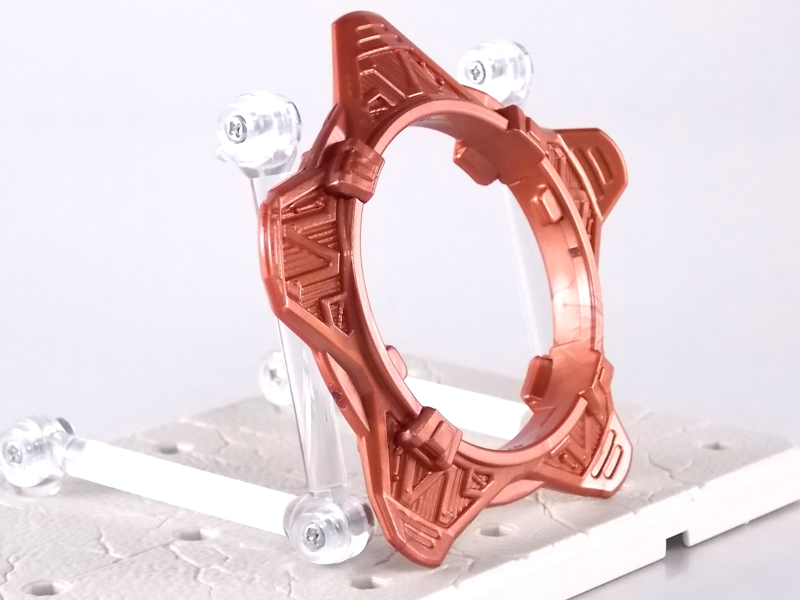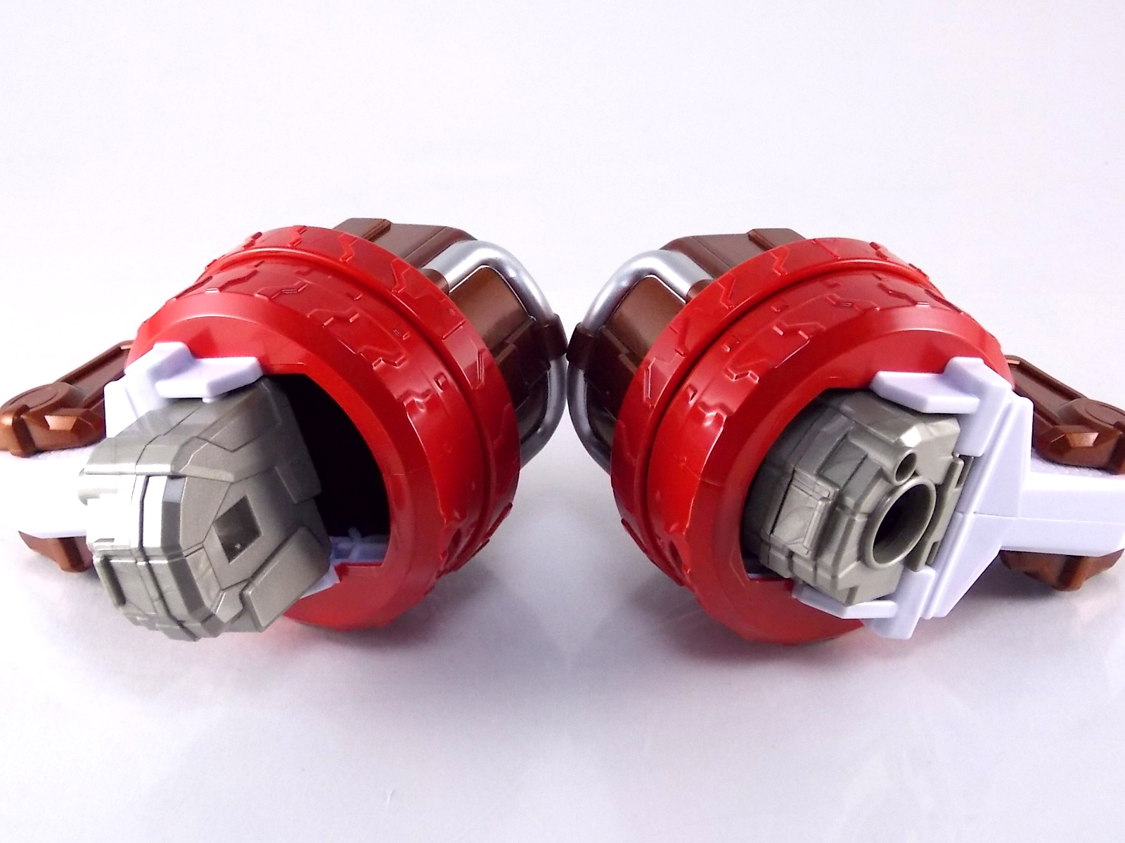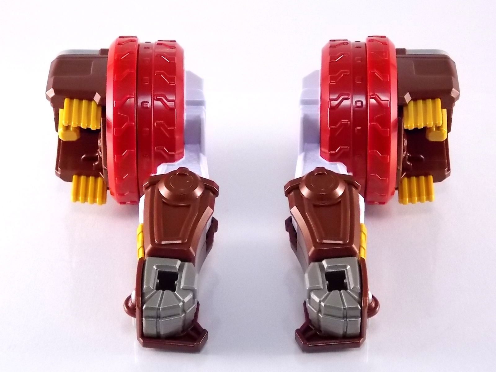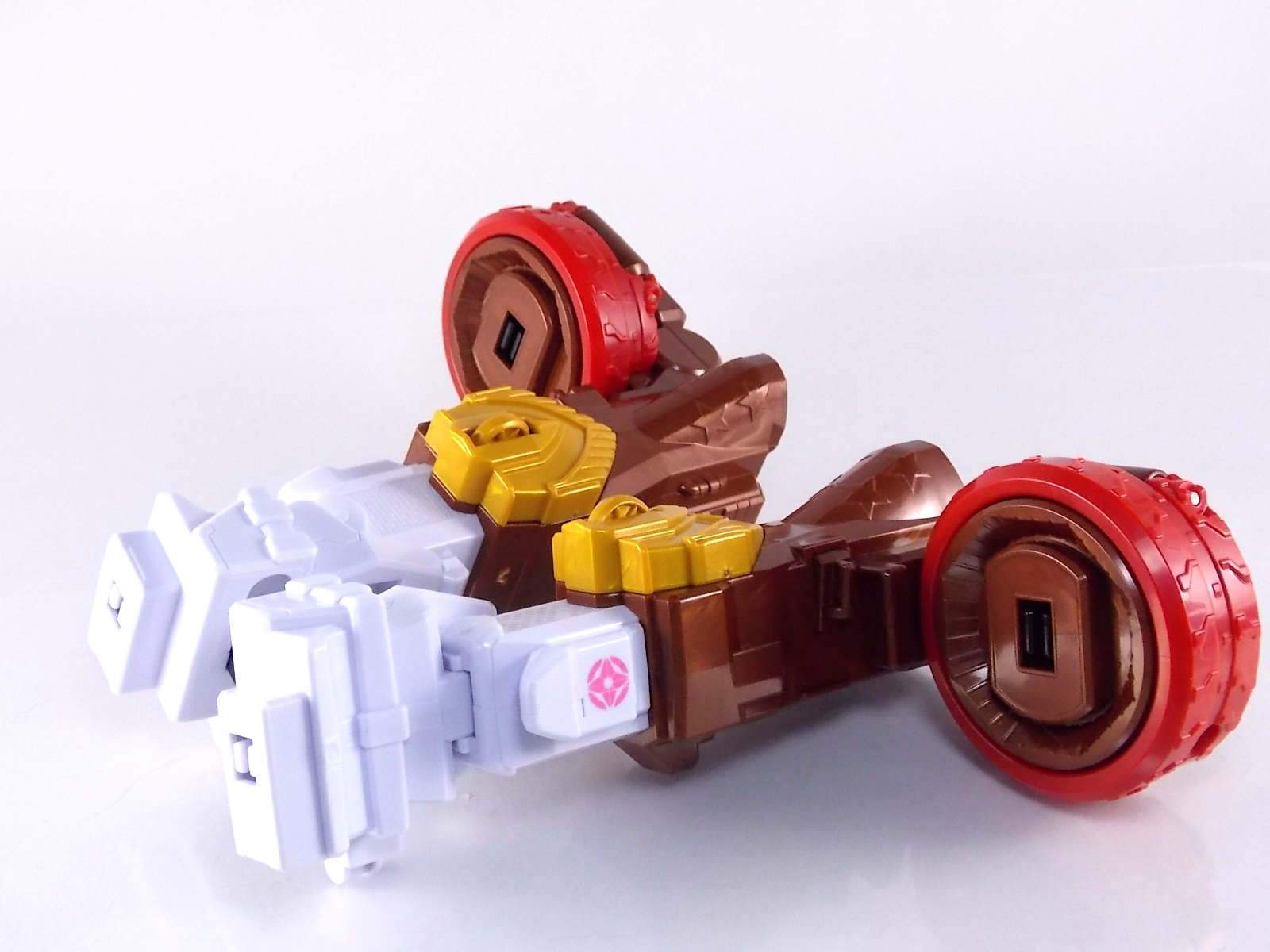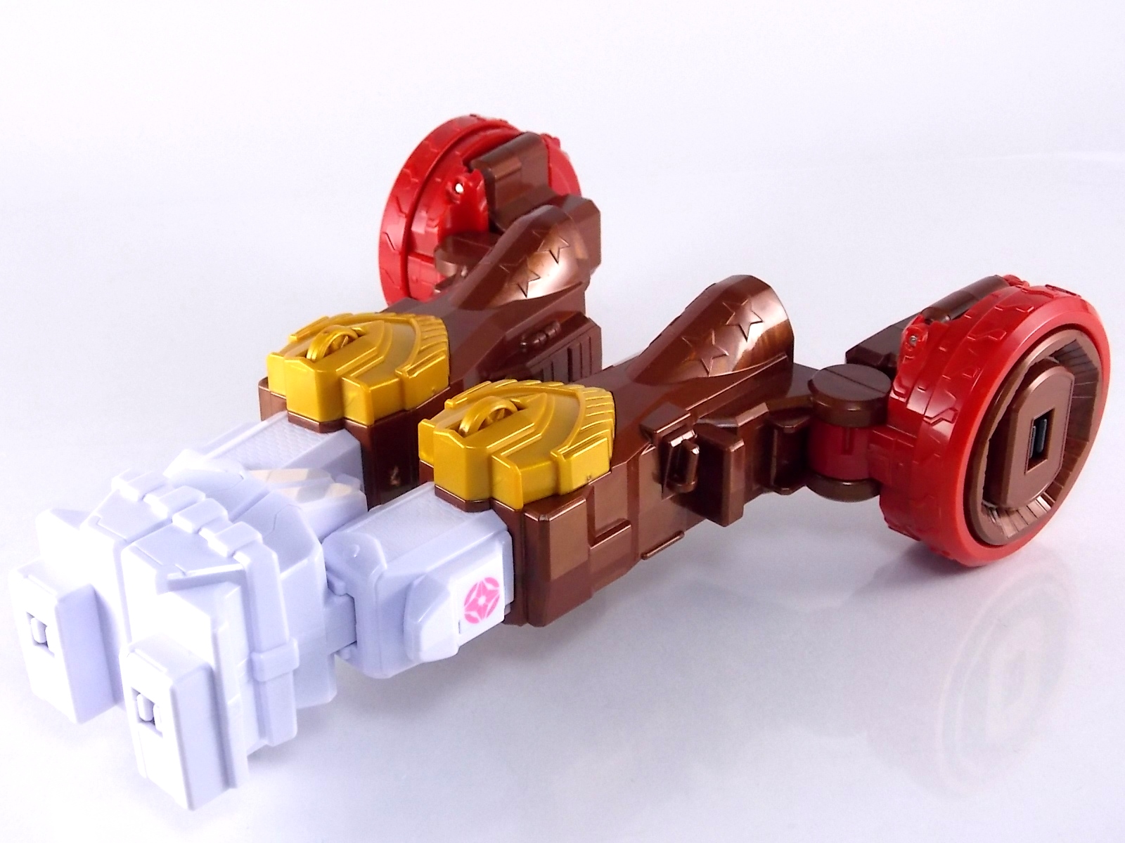 TokuNation is proud to present the fourth in it's series of galleries looking at the DX mecha line of Shuriken Sentai Ninninger! This galleries' subject is the recent release DX Bison King! ** This gallery contains 100 images! So it's spread across 3 posts, check each to see a different selection of images. Pacakging The box itself is very busy in it's presentation, as DX sentai robos tend to be. Not quite as dynamic as the DX Shurikenjin box, Bison Kings' still gives us a good look at all the modes of play as well as the eventual combined form with Shurikenjin. Nin Shuriken Included with this set is a Bison King Shuriken. This electronic item is what forms the head and face of Bison King. It's normally stored on the rear end of the Bison Buggy when not used to form the main robo. A pair of triggers on this piece detect when it's combined to form either Bison King or King Shurikenjin and plays out the appropriate phrases when done. When not connected pressing the physical button on top will cycle through a couple of phrases: "The Come on!" "Who are you? Who arrrrre you?!" "Rodeomaru!" When adding one of the Nin Shuriken discs to this base component you slide them on at an angle, lining up the side tabs. When it's all the way down, turn it to the right to lock it in place. A release trigger can be held down to ensure you don't damage the very rubbery plastic of the disc when it's removed later. Rodeomaru Diving right in with the main review we take a look at the true core of Bison King with Rodeomaru! As the name implies Rodeomaru is a cowboy themed Otomonin very similar in design and premise to Shinobimaru. Rodeomaru is a bit different functionally however. You'll see that while it may not have the same number of painted details as the other Otomonin that the base blue is striking and the details that are painted on, like the head, are crisp and perfect. Speaking of the head is on a jointed arm to allow it to get into the correct position for combinations. Where Shinobimaru sits down to combine, Rodeomaru lays out like he's riding a horse almost. Hands and arms molded in a position that evokes holding the saddle of a bull. As you can see the transformation joints allow for Rodeomaru to kneel down fully but that's about it, because of the way the arms are molded they look rather silly when raised up and the legs are jointed together. Rodeomaru's transformation joints also allow him to assume the same position as Shinobimaru, meaning you can combine just Rodeomaru & the Bison King Shuriken with Shurikenjin to form Shurikenjin Texas! Overall he's just a fun little figure that looks right at home with Shinobi, Paon, & UFOmaru's. The recently revealed Sentai Artisan version of Rodeomaru will likely be hyper articulated and feature many more show accurate paint applications and details, but for what it is I like the DX version. Bison Buggy This conglomeration of the various parts included is actually pretty awesome. A first of it's kind if I'm not mistaken, Bison Buggy is just that. A Bison themed 4-wheeled vehicle that can accommodate Rodeomaru on a saddle like base. It's big, hefty, pretty solid, and frankly just cool. I like wild conceptualized animal vehicle hybrids like this. Takes me way back in terms of creativity. Combinations Bison King This is where the figure succeeds and fails simultaneously. On the one hand Bison King is a dynamic looking robot with some excellent detailing that simultaneously evokes thoughts of DX Red Puncher in design & DX Gao God in color scheme. However some of the figure is compromised a bit to allow for it's further combination with DX Shurikenjin & the previous buggy formation. I.E. it parts-forms. As a result there are some decent sized "gaps" in the figure that take away from the bulk it should otherwise have, especially in the neck/shoulder area. Don't get me wrong I still think it looks great but the hollowness of the upper body is noticeable. It should also be noted that the the plate that goes across the shoulder to form the chest area does not have to remain stretched straight out off the back. While technically accurate to the instructions and show (though the show lessens the issue) the saddle which Rodeomaru rides on looks ridiculous when fully extended out. Thanks to his jointed legs and the extra hinge in the saddle the two can mostly be folded down against Bison Kings' back to avoid that strangeness. It's odd that the designers at PLEX wanted the extended out saddle to be the "proper" transformation but so it is. You can always do it this way instead. Bison King is also armed with a pretty damn awesome gunblade in this form. Originally an exhaust pipe of sorts for the Buggy mode. It can sort of be stored on the left thigh of Bison King if you so choose but really why not have him holding it? It just looks cool. Also You can at least use the UFO & Paon Shurikens & weaoibs with Bison King, but the Maru's themselves are totally incompatible with Bison King. So I've posted what those half combos look like. Shurikenjin Texas As mentioned above, Rodeomaru has some useful articulation, such that he can actually take Shinobimaru's place on Shurikenjins' throne! When configured this way and using the Bison King Shuriken in place of the Shurikenjin one, Shurikenjin Texas can be formed! While it isn't all that different from the basic Shurikenjin combo, Rodeomaru adds a bit of brighter color to the combined robot that I quite like. King Shurikenjin And here's the main event. The HUGE combination that is King Shurikenjin. I should also note that it definitely falls into the category of "stackers" for sentai robos. In this figures case even more literally than normal. To create King Shurikenjin you want to break down Bison King to it's base components and remove the arms and head from Shurikenjin. Each of Bison King's legs forms a "shoe" for Shurikenjin to wear. Nicely enough they are also color coded for which leg they go with. So white for Wanmaru, Pink f