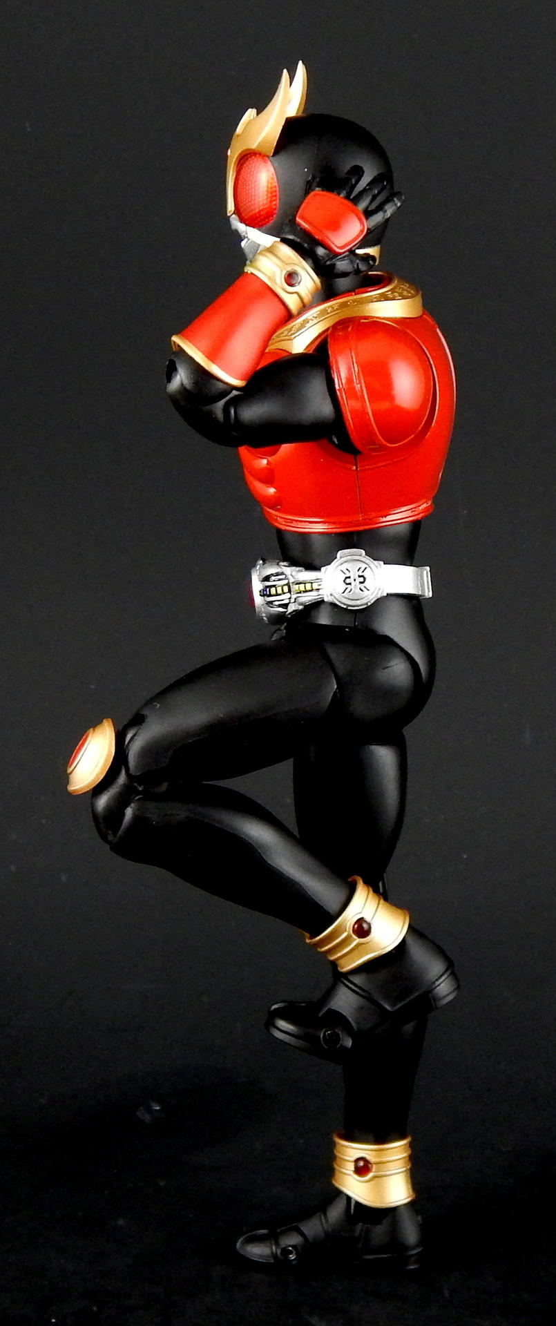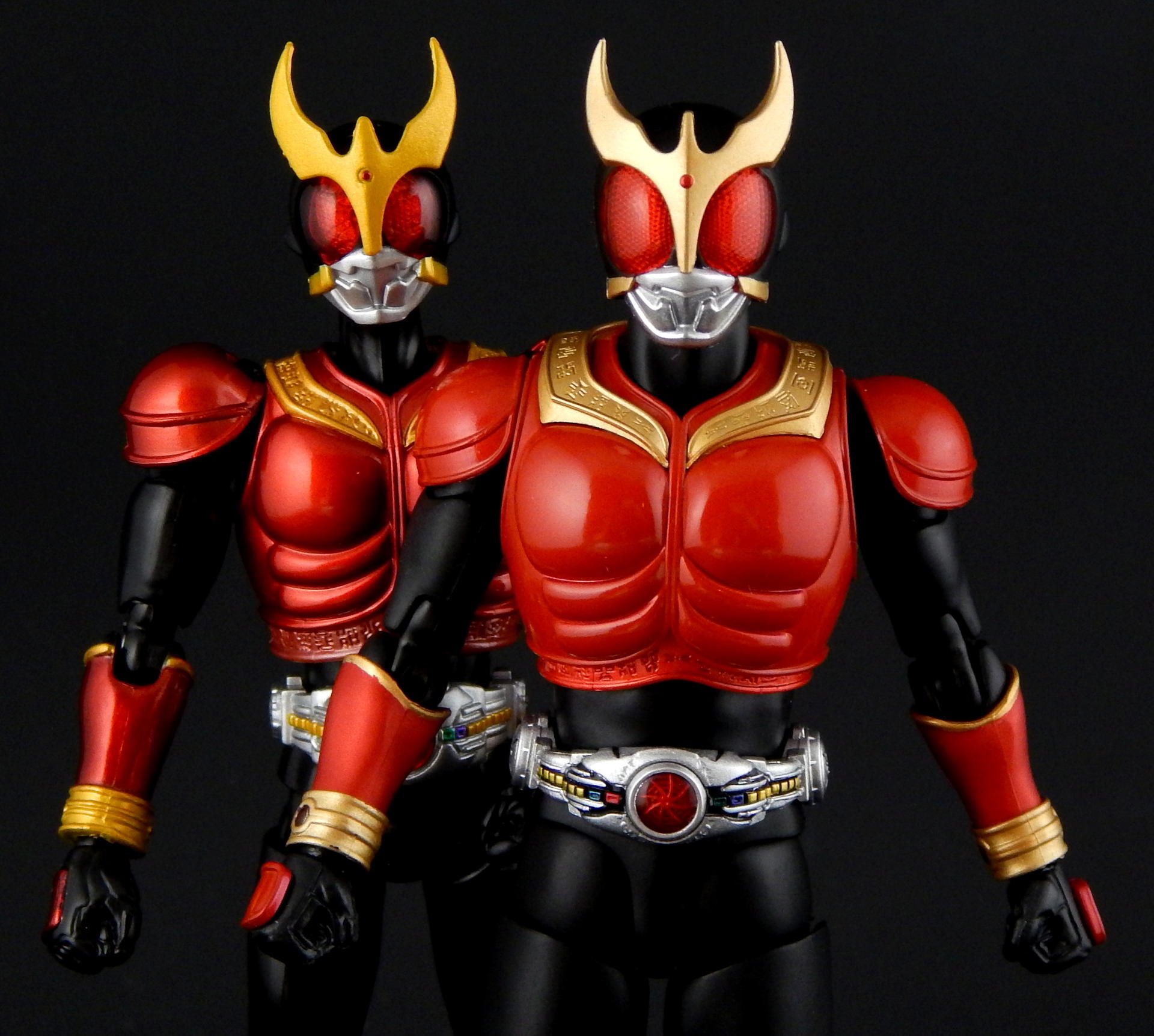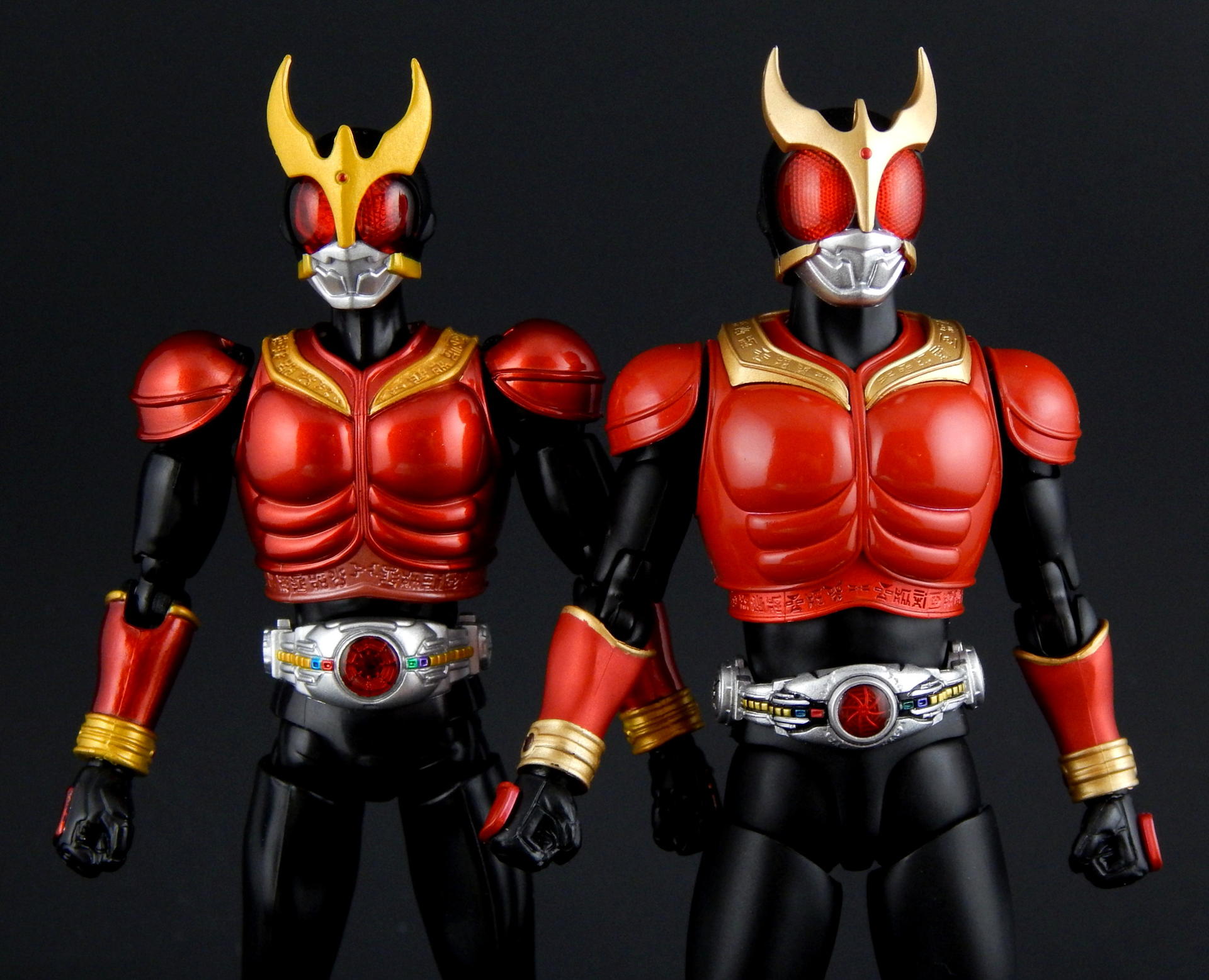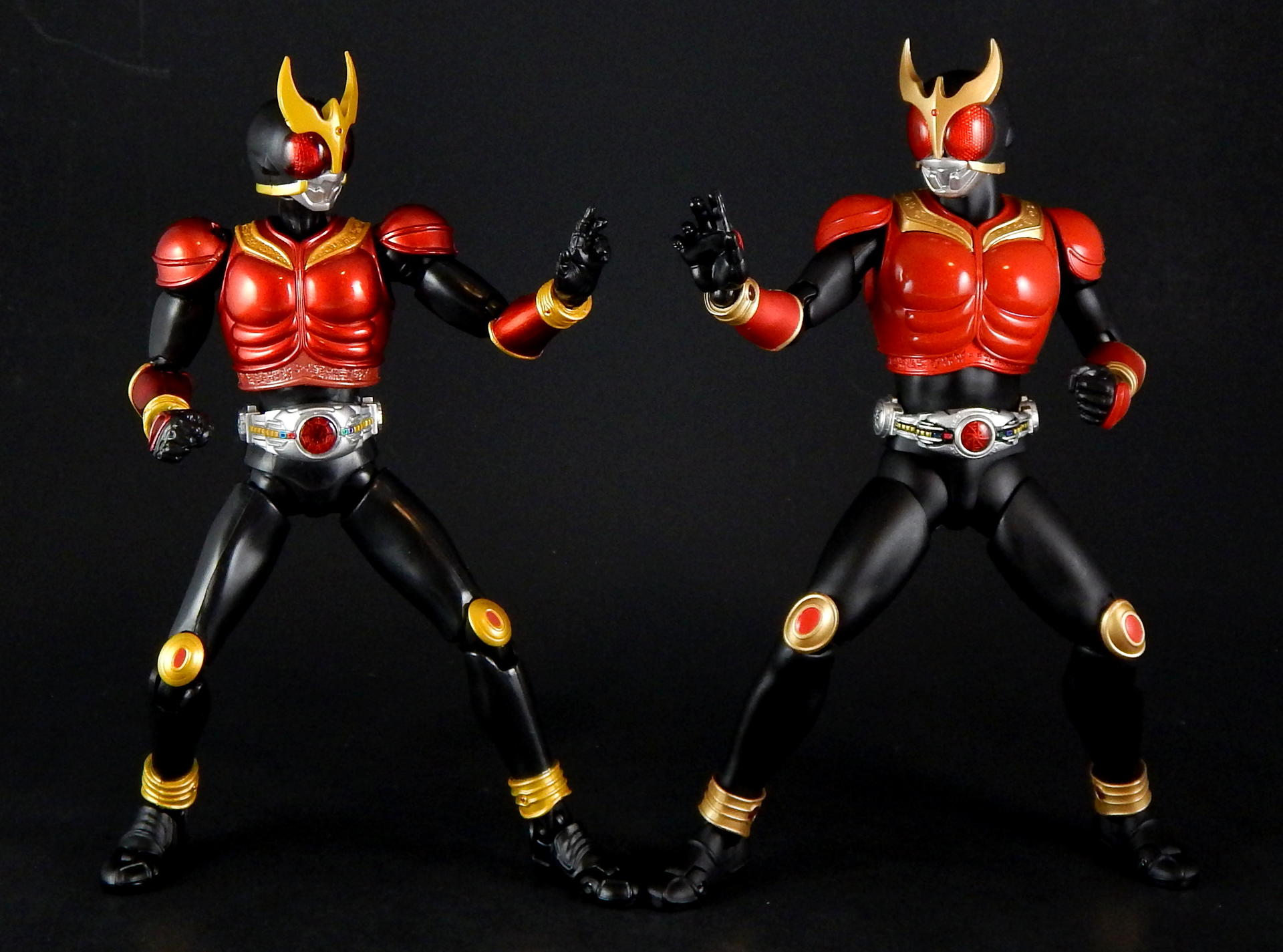 Packaging The boxes for these Shinkochu Seiho Figuarts are both very simple, and very attractive. The back is pretty much the same as a standard figure with text on the back and a couple of action shots of the figure. The front, however, features a close-up of the Kuuga's head, which is grainy in a stylized way, with heavy shadowing which just looks absolutely gorgeous. Inside are two trays, one for the figure and one for the hands. Main Figure Renewal Kuuga is absolutely gorgeous. The finish on the black is a very nice matte, the red is a nice, glossy candy red, while the gold and silver bits have a metallic finish. The different finishes provide a great contrast between the different parts of the costume, and combine to look fantastic. It's a significant improvement over the original version of Kuuga, which lacks the matte black (it's more of a semi-gloss to gloss finish). I do rather like the deeper, metallic red of the original Kuuga, but the Renewal is more show accurate. Original Kuuga also has a much more yellow color to the gold, which honestly looks rather bad, next to the Renewal. The detail on Renewal Kuuga is similarly amazing. The belt buttons are more cleanly separated, than on the original figure, and the black paint between all the buttons really helps them pop out. The detail of the arcle on the belt is also improved. The Gurongi text on the armor is sculpted with very fine lines and the paint is clean and thin such that no detail is lost. This text on the original figure looks just a bit sloppy. I think it's sculpted with thicker lines, that the paint then filled in in uneven ways to make it look clumpy or gloppy. It just looks far superior on the Renewal. The sculpting on the soles of Kuuga's boots is also much improved on the Renewal, such that you can actually see the symbol on the ball of his foot. Finally, the gemstones in Kuuga's wrist and ankle cuffs are separate, translucent plastic pieces, which really improves the look of them (on original Kuuga they are simply a dot of paint that wasn't always cleanly applied to the small sculpted blip). Bandai has also improved the proportions of the figure. Where the original figure is lanky, with thin, almost stretched out looking limbs, Renewal Kuuga looks like a person, from the length and width of the legs, to the subtle sculpting of the musculature on the legs, so it looks like someone wearing spandex. Couple this improved look of the body with the fantastic articulation, and it's difficult to put Kuuga into a not-realistic looking pose. Every pose just looks so natural, it's amazing. And sadly, it makes the old figure look that much worse for how gangly it is. Even just standing at rest Kuuga looks like a tiny person in a costume. One of the ways the articulation is improved over the original figure is the torso is now five separate parts. The chest armor has separate under-piece with the Gurongi writing, which is separate from the lower torso piece, which is separate from the belt, which is separate from the crotch. All of these different pieces give Renewal Kuuga great range of movement, from deeper forward crunches, to excellent side crunches, as well as being able to twist from side to side. Original Kuuga had great motion in the head, tilting sideways and forward/backward, and the Renewal is just as good, and looks more natural doing so, because of better proportions (Original Kuuga is a pencil-neck). The shoulder pad articulation is distinct from the original figure in being attached to a ball joint, that is attached to a hinge joint in the upper part of the shoulder. It has great range, and I never had a problem positioning it where I wanted it, again, in very natural looking ways. It's a really well-designed pair of joints, and I much prefer it to the older style of the shoulder pad being attached on a single hinge on the top of the shoulder, like original Kuuga and many many others. (Side note, this is the same attachment that SHF Darth Vader and Stormtrooper use on their shoulder pads.) The only place in which there's a bit of restriction is in the ability of the arms to cross in front of the chest, and this is the only place in which original Kuuga has even the slightest advantage. Original Kuuga's arms are very thin, so they're able to move inward over the chest slightly more than Renewal Kuuga, as his bigger biceps encounter the chest armor earlier. It's a bit of a slight disappointment, but so heavily outweighed by all the other improvements this figure features that it's almost a non-issue. Accessories Kuuga comes with a bunch of hands, and nothing else. But then, Kuuga Mighty Form needs no other accessories, as he was purely a melee fighter in this form. He's got his punching hands, open fighting pose hands, and two pairs of variations on fully opened hands. And of course, Godai's trademark thumbs up hand. This figure has all the hands he needs to replicate pretty much anything Kuuga did in the show. And while I always appreciate more accessories, I can't think of anything else this figure needed. Okay, maybe some flame effects parts, but seeing as how Bandai has already released a Flame Effect set I can understand them not including a couple of those flames here. But it would have been nice (and Kamen Rider Drive's first release bonus includes a couple...). Final Thoughts Without trying to over-hype this figure, I can say it's easily one of the best Figuarts ever made. Renewal Kuuga is in nearly every way imaginable a big improvement over the original release of the character, and the more I play with it the more I love it. Everything about it is fantastically design and executed. It may help that Kuuga is one of my favorite designs, but even with my rather high expectations, this figure wow-ed me like few others. When it was announced, months ago, I said something to the effect of, I would buy the Renewal of Mighty Form, but didn't feel like I'd need to replace all the other forms he has (of which I 