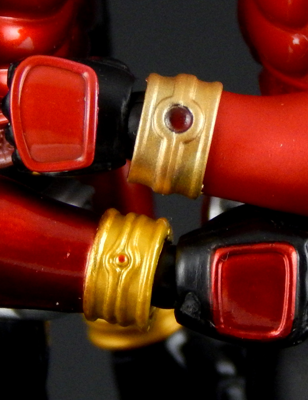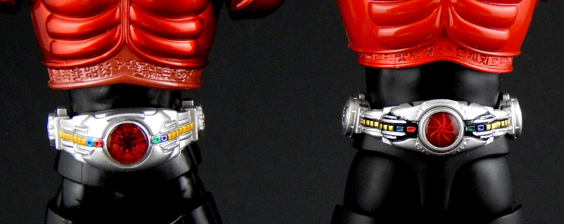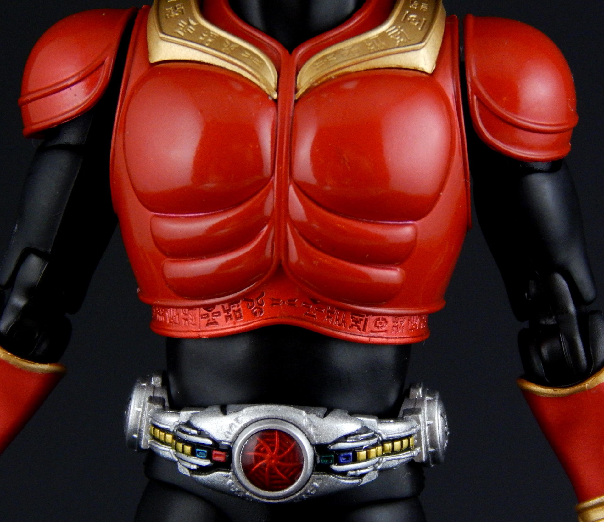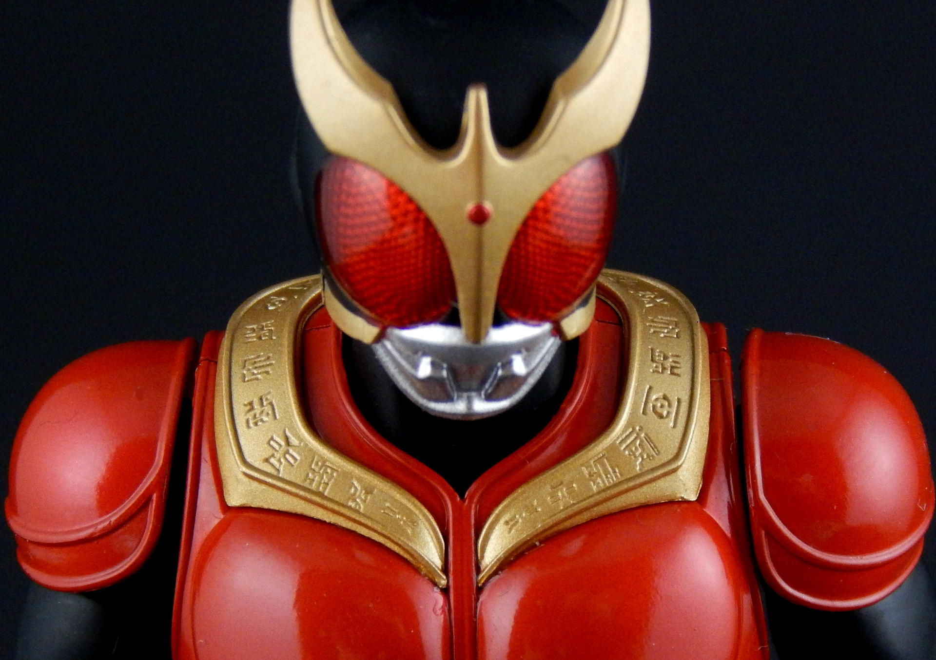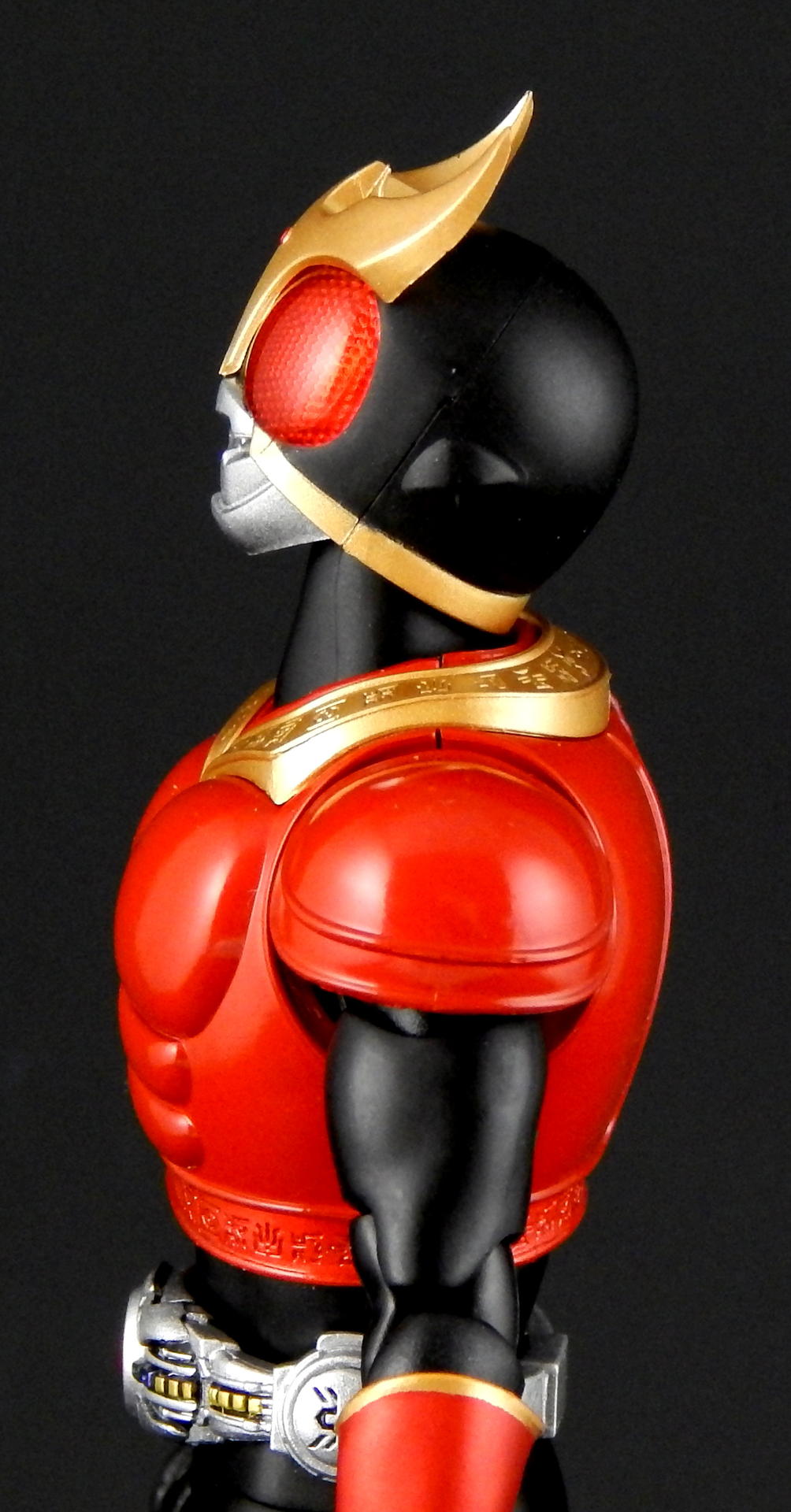 Packaging The boxes for these Shinkochu Seiho Figuarts are both very simple, and very attractive. The back is pretty much the same as a standard figure with text on the back and a couple of action shots of the figure. The front, however, features a close-up of the Kuuga's head, which is grainy in a stylized way, with heavy shadowing which just looks absolutely gorgeous. Inside are two trays, one for the figure and one for the hands. Main Figure Renewal Kuuga is absolutely gorgeous. The finish on the black is a very nice matte, the red is a nice, glossy candy red, while the gold and silver bits have a metallic finish. The different finishes provide a great contrast between the different parts of the costume, and combine to look fantastic. It's a significant improvement over the original version of Kuuga, which lacks the matte black (it's more of a semi-gloss to gloss finish). I do rather like the deeper, metallic red of the original Kuuga, but the Renewal is more show accurate. Original Kuuga also has a much more yellow color to the gold, which honestly looks rather bad, next to the Renewal. The detail on Renewal Kuuga is similarly amazing. The belt buttons are more cleanly separated, than on the original figure, and the black paint between all the buttons really helps them pop out. The detail of the arcle on the belt is also improved. The Gurongi text on the armor is sculpted with very fine lines and the paint is clean and thin such that no detail is lost. This text on the original figure looks just a bit sloppy. I think it's sculpted with thicker lines, that the paint then filled in in uneven ways to make it look clumpy or gloppy. It just looks far superior on the Renewal. The sculpting on the soles of Kuuga's boots is also much improved on the Renewal, such that you can actually see the symbol on the ball of his foot. Finally, the gemstones in Kuuga's wrist and ankle cuffs are separate, translucent plastic pieces, which really improves the look of them (on original Kuuga they are simply a dot of paint that wasn't always cleanly applied to the small sculpted blip). Bandai has also improved the proportions of the figure. Where the original figure is lanky, with thin, almost stretched out looking limbs, Renewal Kuuga looks like a person, from the length and width of the legs, to the subtle sculpting of the musculature on the legs, so it looks like someone wearing spandex. Couple this improved look of the body with the fantastic articulation, and it's difficult to put Kuuga into a not-realistic looking pose. Every pose just looks so natural, it's amazing. And sadly, it makes the old figure look that much worse for how gangly it is. Even just standing at rest Kuuga looks like a tiny person in a costume. One of the ways the articulation is improved over the original figure is the torso is now five separate parts. The chest armor has separate under-piece with the Gurongi writing, which is separate from the lower torso piece, which is separate from the belt, which is separate from the crotch. All of these different pieces give Renewal Kuuga great range of movement, from deeper forward crunches, to excellent side crunches, as well as being able to twist from side to side. Original Kuuga had great motion in the head, tilting sideways and forward/backward, and the Renewal is just as good, and looks more natural doing so, because of better proportions (Original Kuuga is a pencil-neck). The shoulder pad articulation is distinct from the original figure in being attached to a ball joint, that is attached to a hinge joint in the upper part of the shoulder. It has great range, and I never had a problem positioning it where I wanted it, again, in very natural looking ways. It's a really well-designed pair of joints, and I much prefer it to the older style of the shoulder pad being attached on a single hinge on the top of the shoulder, like original Kuuga and many many others. (Side note, this is the same attachment that SHF Darth Vader and Stormtrooper use on their shoulder pads.) The only place in which there's a bit of restriction is in the ability of the arms to cross in front of the chest, and this is the only place in which original Kuuga has even the slightest advantage. Original Kuuga's arms are very thin, so they're able to move inward over the chest slightly more than Renewal Kuuga, as his bigger biceps encounter the chest armor earlier. It's a bit of a slight disappointment, but so heavily outweighed by all the other improvements this figure features that it's almost a non-issue. Accessories Kuuga comes with a bunch of hands, and nothing else. But then, Kuuga Mighty Form needs no other accessories, as he was purely a melee fighter in this form. He's got his punching hands, open fighting pose hands, and two pairs of variations on fully opened hands. And of course, Godai's trademark thumbs up hand. This figure has all the hands he needs to replicate pretty much anything Kuuga did in the show. And while I always appreciate more accessories, I can't think of anything else this figure needed. Okay, maybe some flame effects parts, but seeing as how Bandai has already released a Flame Effect set I can understand them not including a couple of those flames here. But it would have been nice (and Kamen Rider Drive's first release bonus includes a couple...). Final Thoughts Without trying to over-hype this figure, I can say it's easily one of the best Figuarts ever made. Renewal Kuuga is in nearly every way imaginable a big improvement over the original release of the character, and the more I play with it the more I love it. Everything about it is fantastically design and executed. It may help that Kuuga is one of my favorite designs, but even with my rather high expectations, this figure wow-ed me like few others. When it was announced, months ago, I said something to the effect of, I would buy the Renewal of Mighty Form, but didn't feel like I'd need to replace all the other forms he has (of which I 