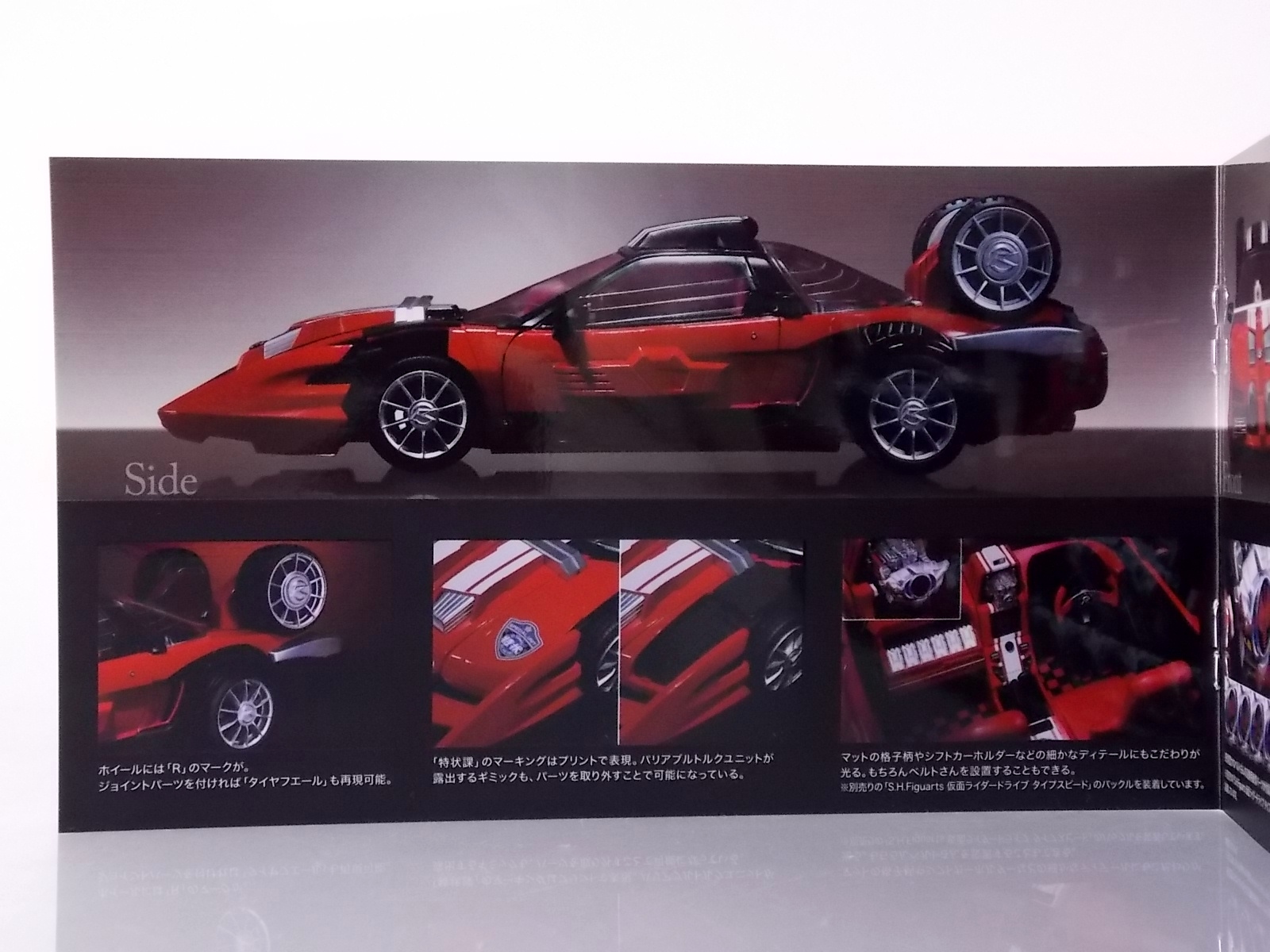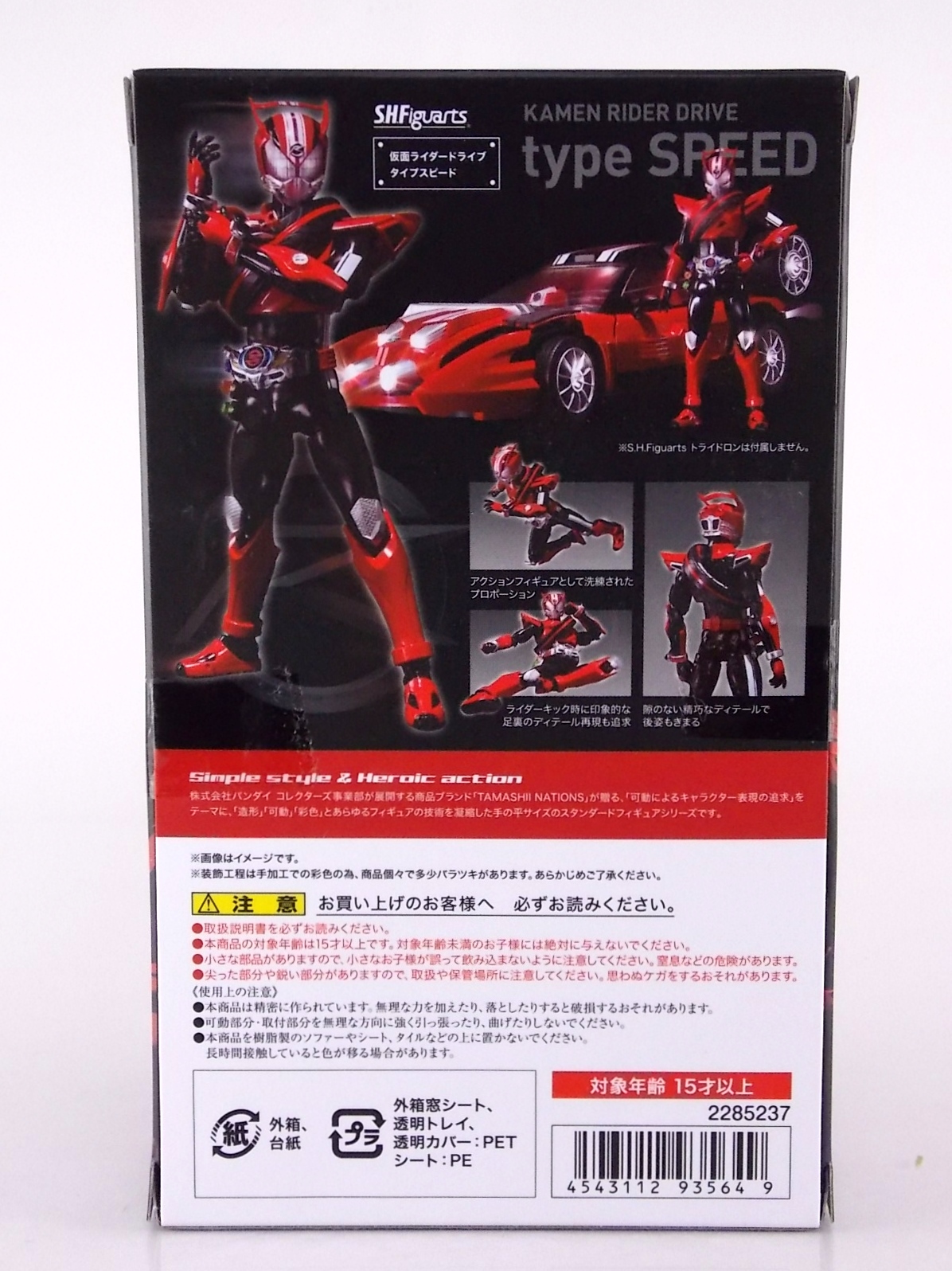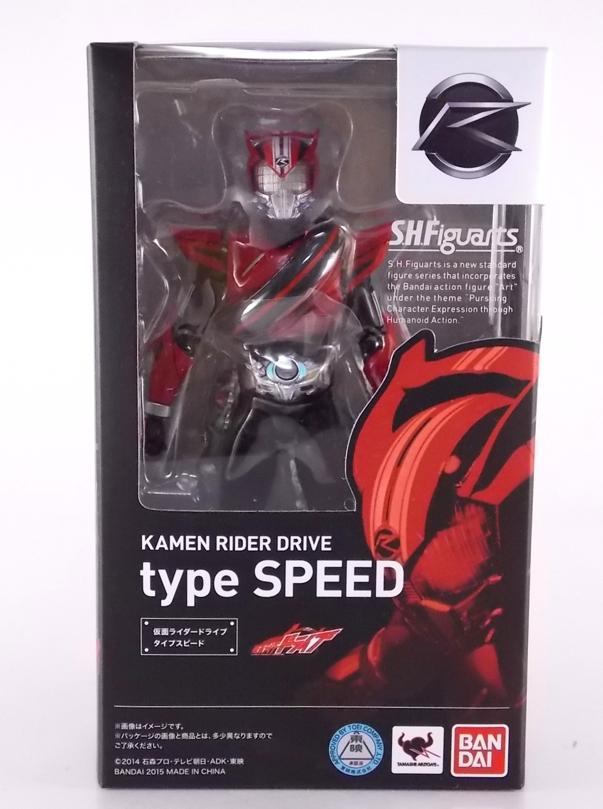 Tokunation is proud to finally present an in depth look at the newest Heisei Rider to join the S.H. Figuarts line, Kamen Rider Drive Type Speed and the included 1st Run Max Flare Bonus! Packaging Kamen Rider Drive comes packaged in what appears to be the new standard for most S.H. Figuarts. A new slim style box. We've seen a recent trend of Figuarts boxes getting a bit smaller over time, Vul Eagle was slimmer but taller than the average, Hakaider & Kikaider were the first of the true slim styles, and now Drive and even Imperial Stormtroopers are being packaged this way. In Drive's case it could have to do with his low accessory count, but either way I'm totally okay with the slimmer box design. As has become the case in recent years, rider boxes have gotten fairly elaborate and very nicely themed to each character, this one feels very much the same in that regard. The Max Flare Bonus (as most bonuses do) comes packed in it's own small square 2-tone box. Traditionally most add on 1st run extras like this come in similarly themed packaging. Even as far back as the Gokaiger Darins. Included in the main Drive box however, other than the instructions, is a premium glossy mini-booklet focusing on the upcoming S.H. Figuarts Tridoron! A nice little bonus to get people salivating for that expensive beast. Main Figure Wow. Let me just say that up front. WOW. Last year I was convinced that Kamen Rider Gaim Orange Arms was hands down one of the best Figuarts I'd ever owned. Let me just say that for all that amazement I am even more blown away by Kamen Rider Drive Type Speed. This figure, in nearly every way possible, captures the true essence of the on screen Drive suit, and even manages to replicate it's real life counterparts gimmick in practical prop fashion. Let's start by looking at the amazing level of detailing this beauty has. You expect an S.H. Figuart to exude a certain level of quality because of it's nature as a collector's piece. Then you handle Drive. Everything from the gorgeously detailed head to the wonderfully painted belt looks great. Looking head on you get Drive in all his glory. Perhaps the best area on the figure though is the Driver Driver & belt. The Driver itself is immaculate, just perfectly detailed at this scale. It's also removable! The face of the driver itself can be removed exposing the cylindrical part that displays Mr. Belt's facial expressions/Tire Koukans. From the ground up this figure is designed for cross compatibility with future Shift Car/Tire sets. Meanwhile the Shift Car holster looks fantastic. You think to yourself, wow these cars look so good, almost like they're removable. And they are! You can literally remove the Funky Spike, Midnight Shadow, & Max Flare Shift Cars from the holsters and replace them with other cars from future releases. In much the same way that Gaim Orange Arms could hold additional Lock Seeds on his holster. The Shift Brace is likewise magnificent, the flipped Type Speed Shift Car pre-packaged into it is also removable! Allowing for you to use future flipped Shift Cars in the brace to recreate various Tire Koukans! Seriously anything you need to to do accommodate a Tire Koukan can be done. As if that kind of ingenuity weren't enough the chest is just magical. The Type Speed Tire, which is made of rubber material, also happens to be modular and entirely removable! This is easily going to be the highlight of the Drive Figuarts line, the reason why it outshines other current releases. Because it's just genius that they've recreated Tire Koukan in this way. This basic Tire breaks up into 2 components, a small connector piece comes straight off Drive's back. A hint at the future, this piece was designed to be removed in that way so that a flattened back tire piece could be included with S.H. Figuarts Triodorn, thus giving Drive a smooth back to fit in the vehicle better. The larger front half which wraps all the way around the figure slides right off thanks to the bendable rubber material its made from, exposing the tireless flat diagonal across Drive's chest underneath. Where the Tire Koukan (TK) figures opted to make the Tire's full components without which Drive would be missing huge chunks of body mass, this figure takes the gimmick in the more practical direction of the actual show suit. In doing so it gives a truly truly accurate version of Drive that I jut did not expect. And Tire swapping is oh so simple on this guy as I'll explain below in the accessories portion of the review. And the rest of the detailing on this guy is just fantastic as well. The head is a dead ringer for the actual prop, though I'm sure some avid customizers out there will figure out how to incorporate LED's into the eyes. And the entire back half of the figure features that gorgeous undercarriage detailing we've come to know and love from the actual show suit. The TK fgure even included this detailing so I knew the S.H. Figuart would pull it off fantastically. I was not disappointed. I think special mention should be made that the articulation on Drive Type Speed is not hindered in any realistic way that I've found either. Despite having a diagonal rubber tire through his chest Drive's neck and head articulation aren't really impacated at all. Honestly the neck ball joint is so good that it just works around the tire. And the left shoulder which would otherwise have trouble with it, has a groove cut into it to allow it to slide under the tire's edge. The hips have a wonderful full range of motion, this is the style of Figuart hip I absolutely adore as well. Can't stand drop down hips at all. Frankly this figure is just the full package. It's absolutely one of my favorite Figuarts ever. Just a home run this year Bandai. Accessories It should come as no surprise to anyone that's followed Drive that he has a rather lite accessory count. Included with the primary figure are: 2 - sets of additional hands. Granted I know that doesn't seem like much. But we also 