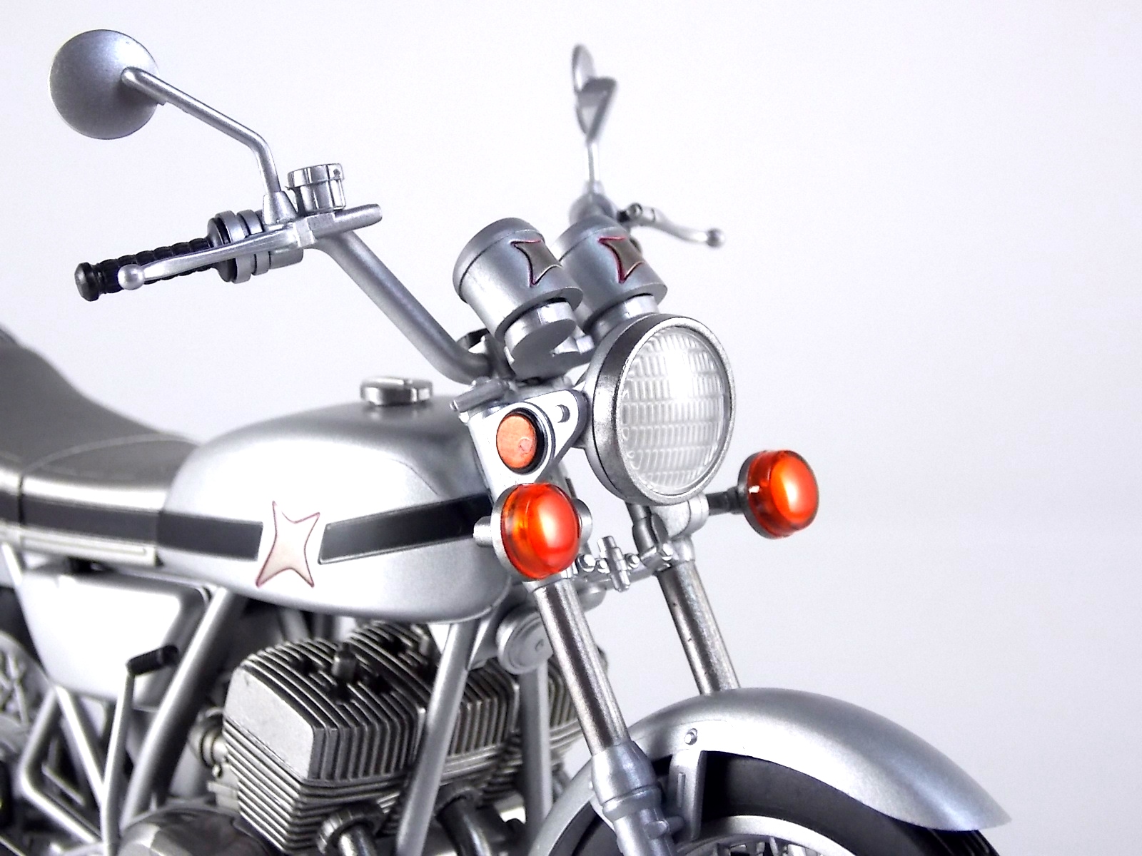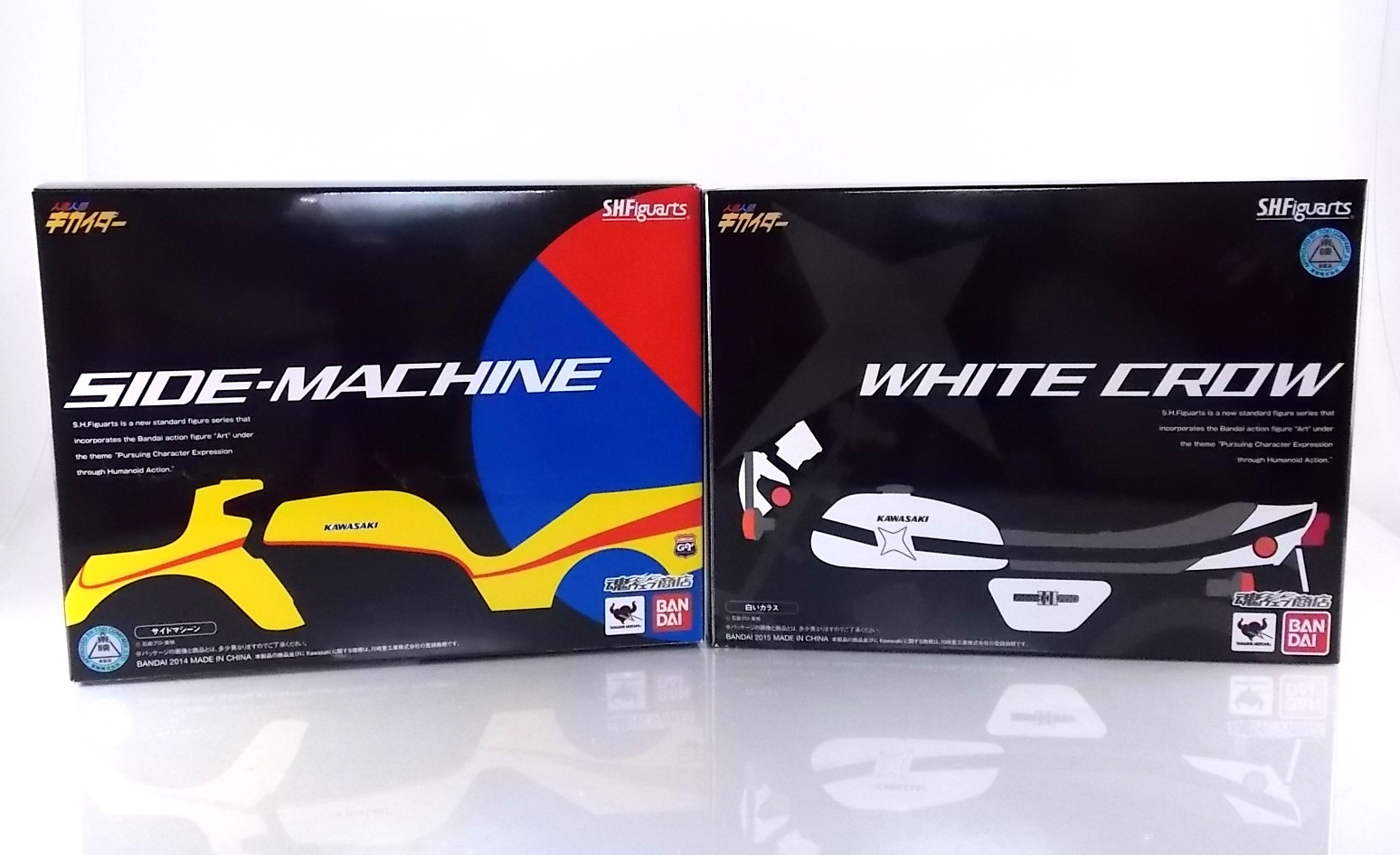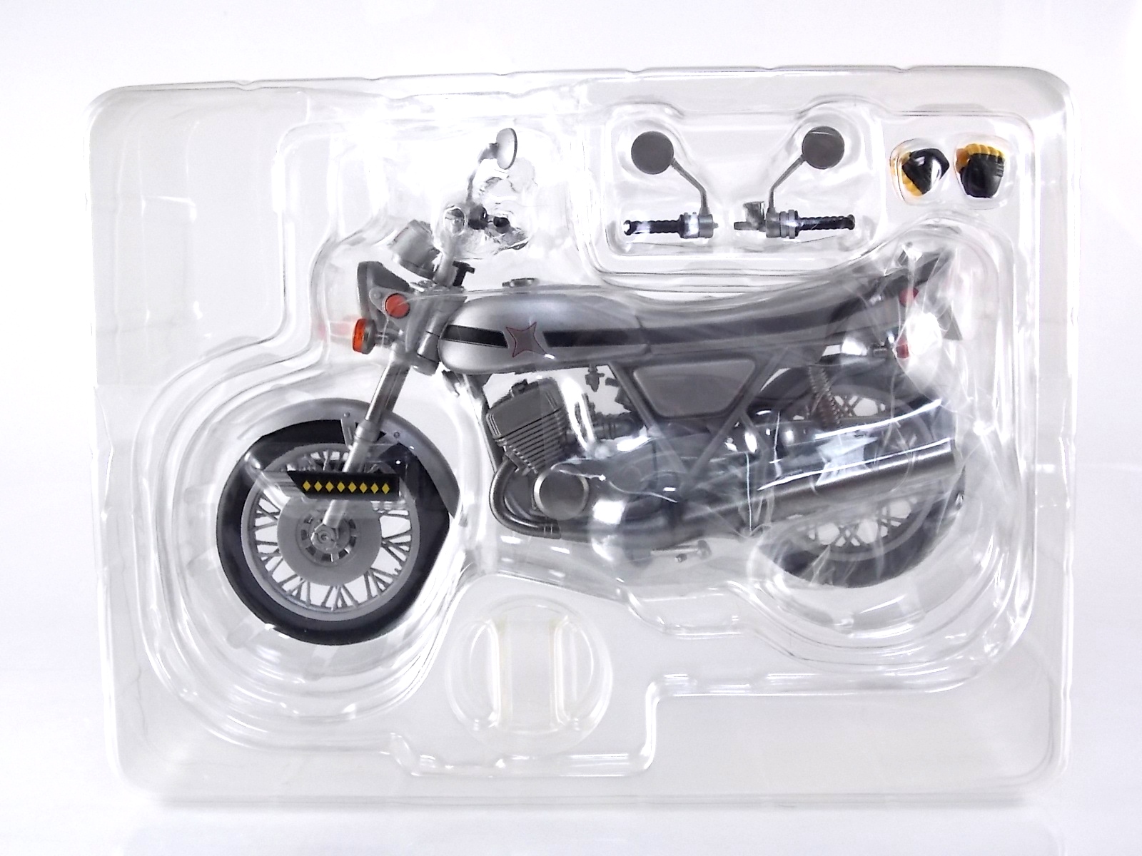 Packaging As has become the case with most bikes produced in this like, the packaging is all business as usual. The White Crow's box is modeled after Kikaider, Hakaider, & the Side Machine. Very cool minimalist artwork with one dynamic box shot on the back. Otherwise nothing new to see. Main Figure S.H. Figuarts White Crow is a very straight forward release. Unlike some Rider machines released in this line, it's more or less a standard motorcycle with some new accents added for flare. At it's base the White Crow is a standard 1972 model Kawasaki H1 Mach III. A gorgeous and classic bike design in it's own right. Here the bike is presented in fantastic painted silver with a few extra details. Primarily a set of diamond patterned bars on the front wheel. They almost appear to be Katana grips. Perhaps that's what the production staff of the show was going for? They look nice regardless of their purpose. Contrasting with the silver is a slick curved black stripe along the body of the bike. It helps to give the vehicle a bit of curvature to it, or at least it forces your eye to see it that way. It makes it feel a bit more alive. Otherwise the only other unique feature of the bike is Hakaider's emblem on the fuel tank. Everything else about White Crow is incredibly typical like the working rear suspension and turning front wheel. Nothing else spectacular to report. Although the gauges on the handlebars are fully painted which I always love. Accessories As (generally) is the case, S.H. Figuarts White Crow is lite on the accessories but gives us soemthing that's much needed: 1 - set of fully licensed Kawasaki labels! Just as with Side Machine, White Crow includes manufacturer labels to give the figure a bit more of that factory feel to it if you so choose. They're entirely optional but so so welcome as a bonus. I may never use them but I LOVE having them. 1 - set of riding hands. Most Figuarts these days tend to come with some form of "holding things" hands that while not perfect can at least double and work for this, but on occasion a vehicle includes them. In this case I'm very happy to have them and they could serve as hands for Hakaider or the recently release and very similar Gill Hakider if you so choose. 1 - wheel base. Standard size wheel base to hold the bike in place when not using the kickstand. 1 - set of additional handlebars. As usual I never have any idea why these are included. Final Thoughts S.H. Figuarts White Crow is a gorgeous bike to be certain and accurately represents what we saw in the original series. But for most it won't hold any special meaning unless they were fans of the series or character. For me it's a winner, but for most I can easily see why it would be a pass. But it's just so damn nice to have it side by side with the Side Machine. Next time we take a look at the titular hero of the second Kikaider live action series, S.H. Figuarts Kikaider 01!