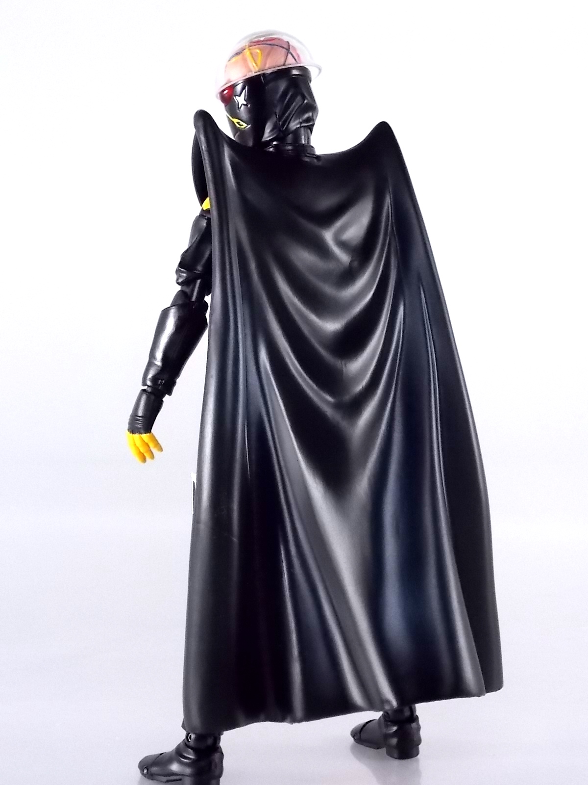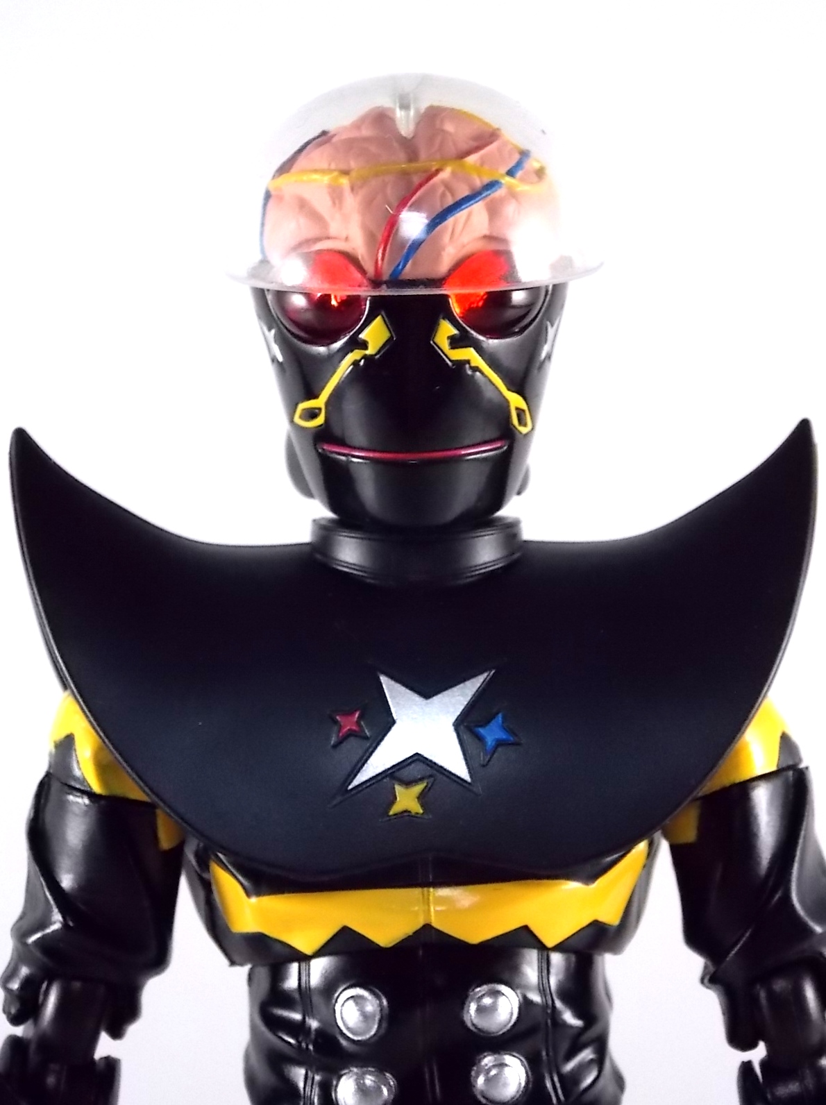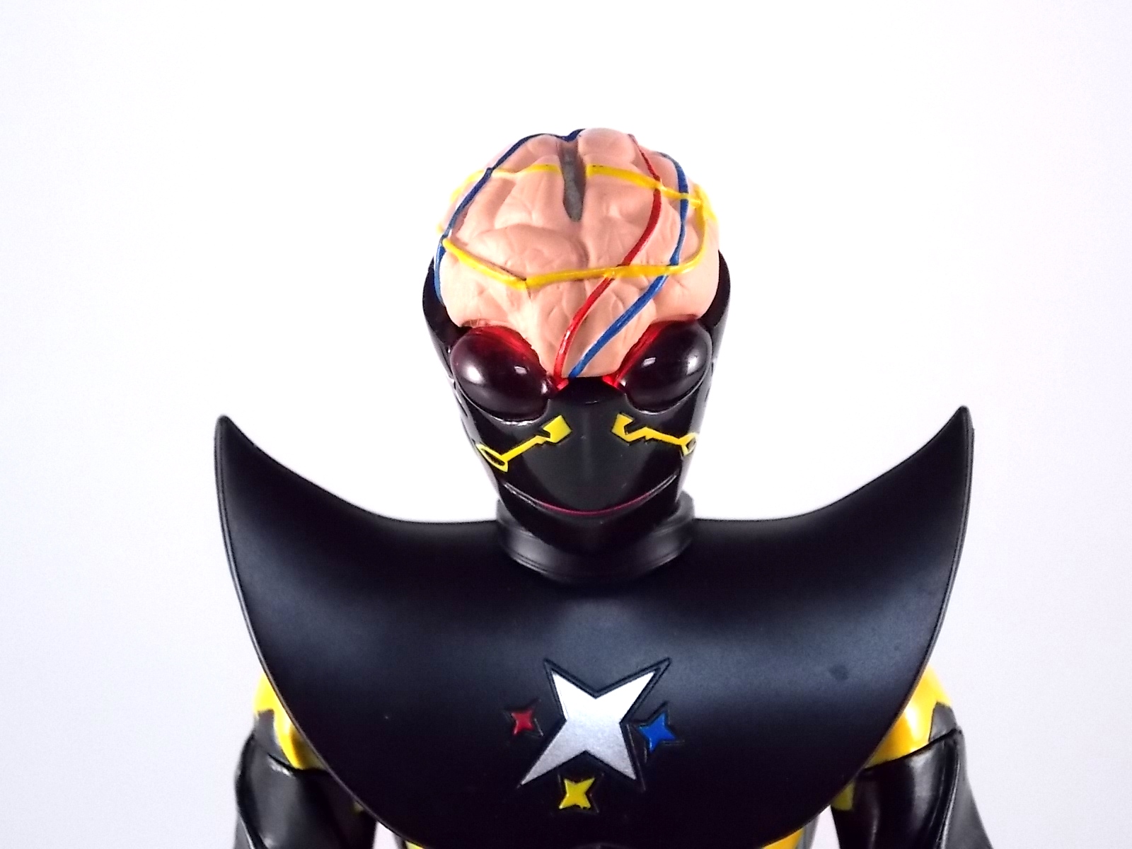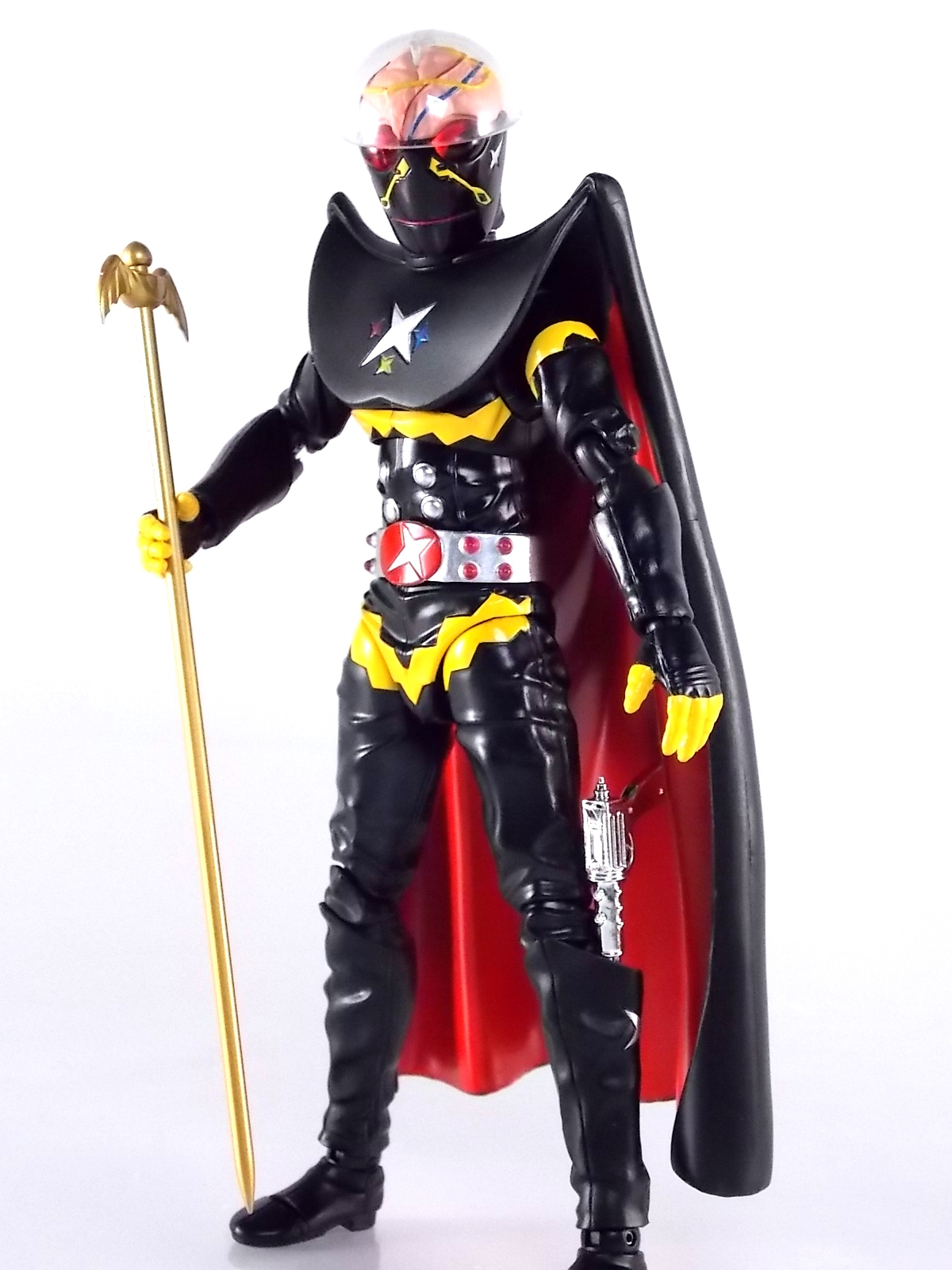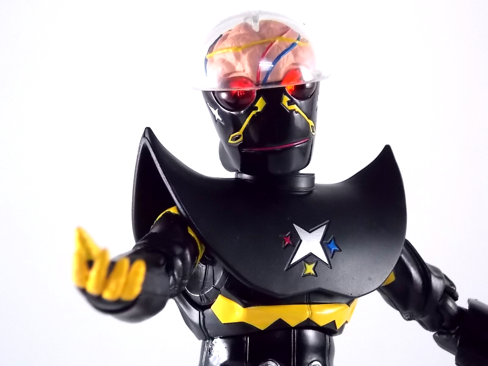 S.H. Figuarts Gill Hakaider! Released as a companion piece to the recent S.H. Figuarts Kikaider 01, the evil android Hakaider was originally created by Dr. Komyoji to destroy Kikaider. Of course this was while under coercion from Professor Gill & DARK. Though Komoyoji built the Android known as Saburo his brain would later be implanted into it by Professor Gill, thus creating the original monster we knew. This figure specifically represents what happened after the fall of DARK, when Professor Gill successfully escaped his headquarters destruction by transplanting his own brain into the Hakaider body, creating Gill Hakaider! The villainous leader of SHADOW who would dog Kikaider 01 throughout his own series! Packaging The packaging is all business as usual. The Gill Hakaider's box is modeled specifically after Saburo Hakaider's but is in line with the rest of the Kikaider release. Very cool minimalist artwork with one dynamic box shot on the back, but nothing new to see. Main Figure After the extensive wait endured by many for an S.H.Figuarts Kikaider, a beloved hero by Japanese and western fans alike, the turn around to get his arch nemesis Hakaider was comparatively quick. Getting this repaint/slight retool of him however took longer. Despite the only differences really being some paint apps and some additional accessories, Gill Hakaider was release nearly 5 months after Hakaider. As a slight repaint a bulk of my review will be identical to Hakaider's. As many recent sentai & rider S.H.Figuarts releases have done, Gill Hakaider features gorgeously sculpted in "fabric" details. The real suit was a bit of a leathery vinyl material and while that kind of look can't be entirely replicated in plastic, this is an excellent attempt to do so. Since Hakaider's primarily black as well there aren't very many paint apps to worry about, but what's there is done just right. The difference with Gill vs standard hakaider is the newly painted Hakaider emblem on his chest accompanied by 3 multi-colored stars. And the lines down his cheeks are of a thinner and altogether different design. The QC on these paint apps is just as top notch as the original release though. The real excellence of this figure is all in the head though. Not only is Gill Hakaider's brain sculpted beautifully, the electrical wires are painted as well, and the skull cap is removable! And the brain is too! That's right, Gill Hakaider's brain is entirely removable to replicate any and all wacky mad doctor scenarios you wish! This is an incredible bonus feature of the figures design. Meanwhile the other incredible bonus of how the head is designed is that Hakaiders' eyes have incredible light piping. Since the skull cap is open and clear his eyes capture a ton of light and almost appear to glow artificially. Perhaps the only complaint I can levy against the figure is the shoulder design. Though the shoulder pads are accurate to the suit, they are molded as one gigantic piece that stretches across the chest. It can angle upward somewhat on either side to give the arms a bit more room, but ultimately this shoulder/chest piece hybrid interferes with the arms movement a bit. But this is an issue I experienced with the original figure as well. Otherwise this figure is pretty excellent and a wonderful companion/rival piece to Kikaider 01 that's very much on par with his quality. Accessories Unlike the other releases in the Kikaider subline so far, Gill Hakaider boasts an impressive accessory selection: 4 - full sets of extra hands. Sadly they don't seem to be intelligent choices for hands though. As with Hakaider, Gill Hakider suffers from having only one left hand to hold his gun and no real right hand for it. And he includes a right hand to hold his flute staff but it doesn't very well and there's no left hand laternative. 1 - Hakaider Shot handgun. A beautiful silver chromed handgun that's as comedically long as it is in the show. It looks like something the Joker would be packing except Hakaider's gun is deadly and awesome. The next accessory is directly tied to the gun. 1 - replacement shin. This shin can be attached to by removing the previous one at the knee and ankle joints. The advantage of this one is that it has a built in holster for the Hakaider Shot. I love that this is included but my Hakaider is almost always holding the Shot so it's just a bonus to me. But a welcome bonus none the less. 1- cape/mantle. To use this simply pull Gill Hakaider's head off at the neck joint and pull his chest/shoulder armor off, swap it for this one and bingo you have an awesome cape. Sadly as is the case with practically all figuarts of characters who should have cloth capes, he does not. So it's statically posed and a bit back heavy. Not so bad that you can't pose Gill with it, but cumbersome. It still manages to give him a devilish and menacing look that I love. The cape itself is actually more associated with the animated version of Gill Hakaider from the Kikaider 01 OVA. But it's still a cool bonus to see here. 1 - flute/staff. Though we've seen several toku characters, mostly heroes, over the years use flutes Gill's is far from heroic. An evil staff that seems pretty ornate at first, it has a sharpened for skewering enemies and when played as a flute can control mechanical life forms, as it's been used to control Kikaider on more than one occasion. The toy version here looks great and even has small sculpted in finger depressions to replicate the flute playing. Though sadly he doesn't have a hand that's really designed properly enough to hold it correctly, you can still pull of some decent poses. This release sets itself apart from all the other Kikaider releases so far. Not only does it have the most accessories quantity wise but it also has arguably the best selection generally speaking. Even going so far as to throw in something from the characters animated counterpart in the form of his cape. Final Thoughts While the sculpt and paint apps