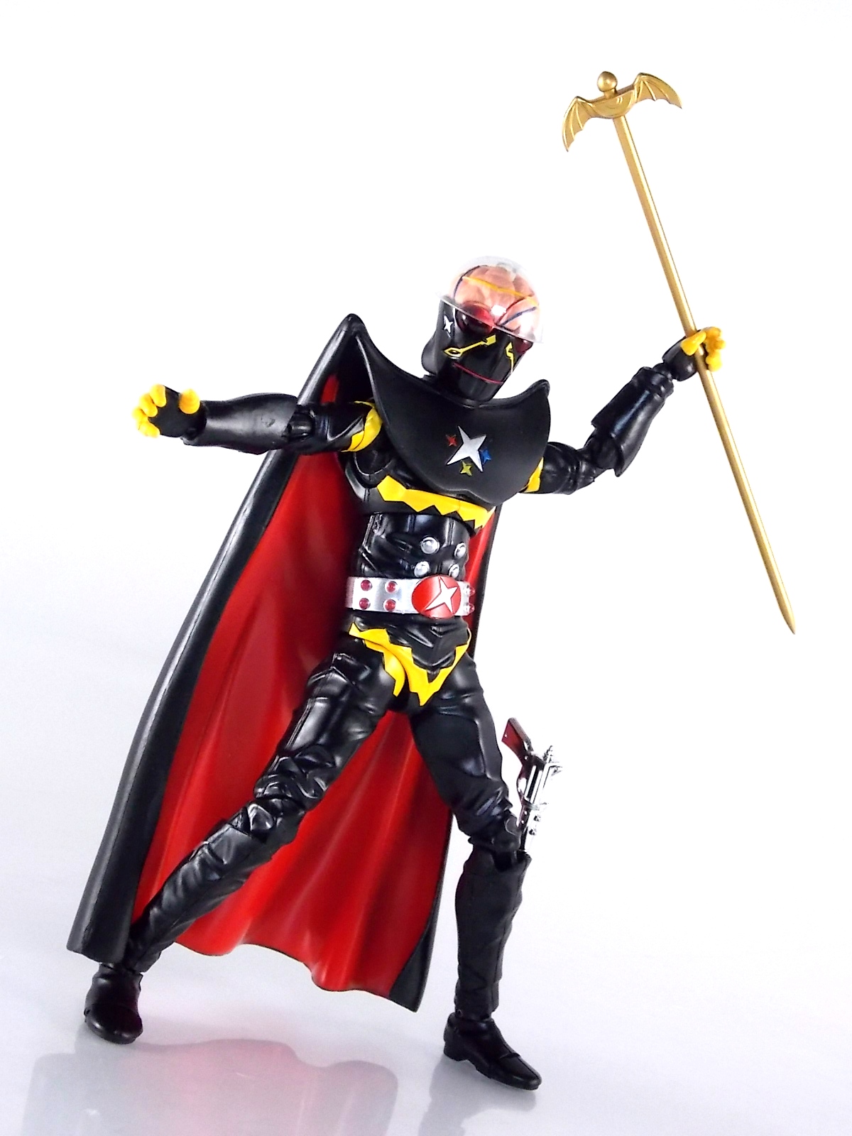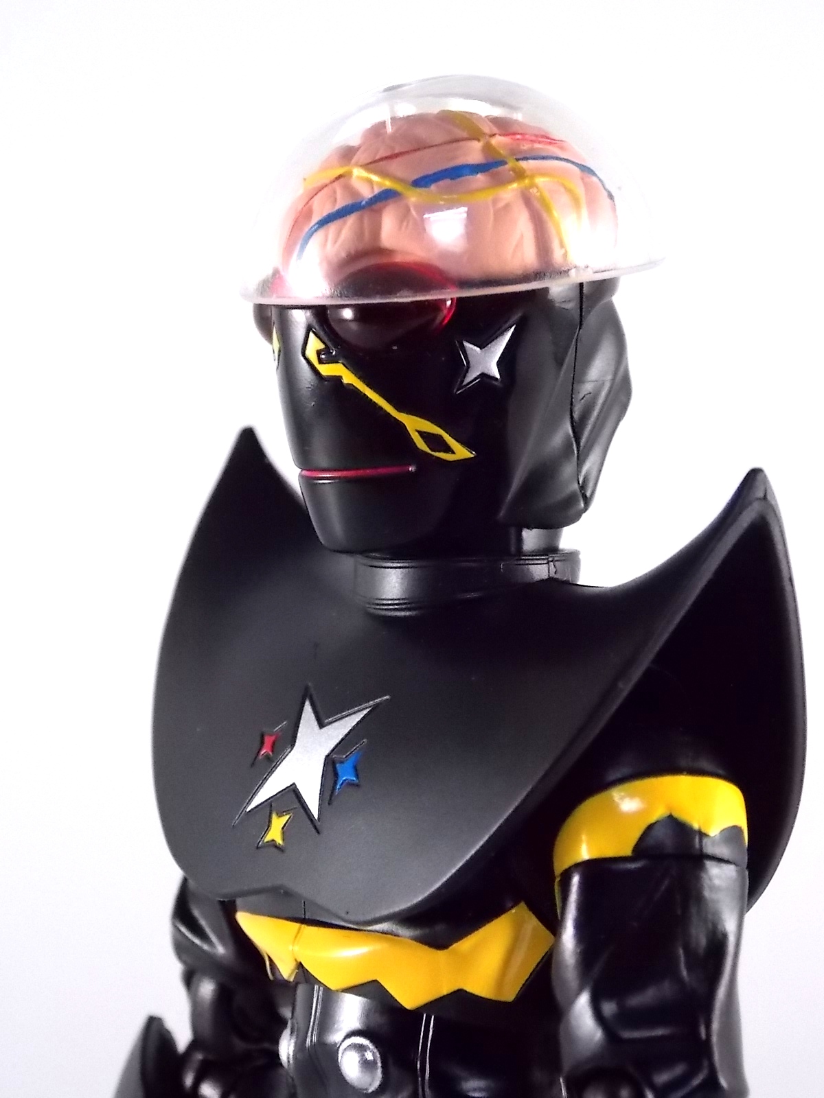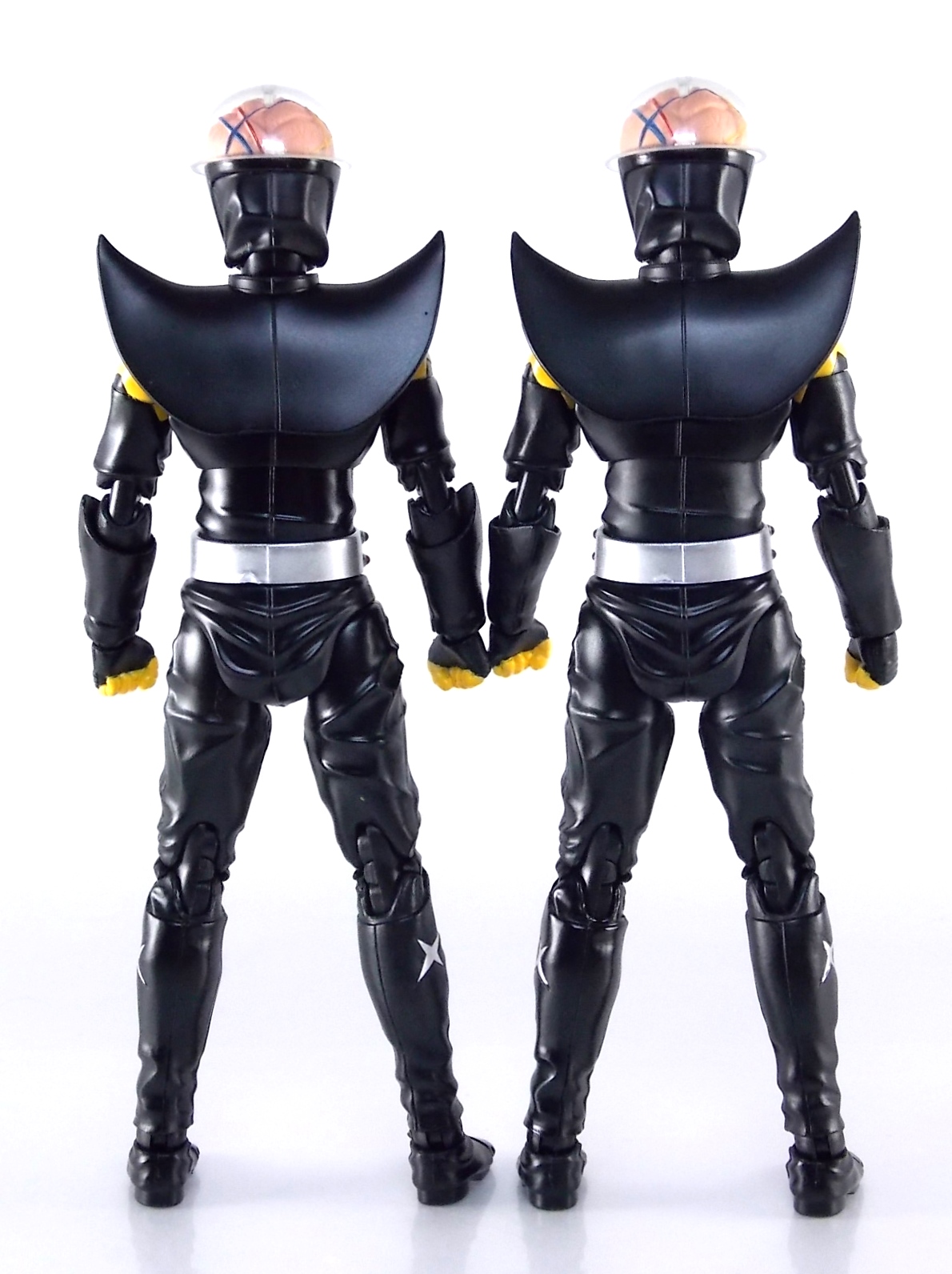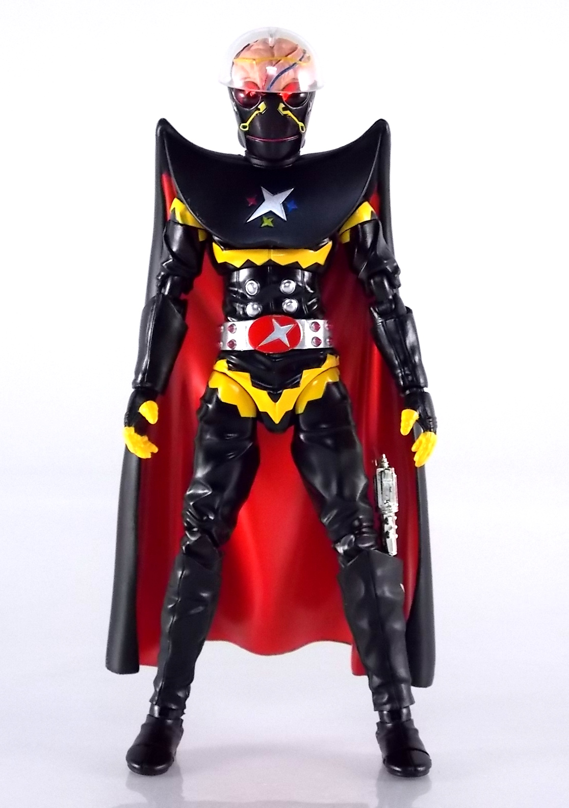 S.H. Figuarts Gill Hakaider! Released as a companion piece to the recent S.H. Figuarts Kikaider 01, the evil android Hakaider was originally created by Dr. Komyoji to destroy Kikaider. Of course this was while under coercion from Professor Gill & DARK. Though Komoyoji built the Android known as Saburo his brain would later be implanted into it by Professor Gill, thus creating the original monster we knew. This figure specifically represents what happened after the fall of DARK, when Professor Gill successfully escaped his headquarters destruction by transplanting his own brain into the Hakaider body, creating Gill Hakaider! The villainous leader of SHADOW who would dog Kikaider 01 throughout his own series! Packaging The packaging is all business as usual. The Gill Hakaider's box is modeled specifically after Saburo Hakaider's but is in line with the rest of the Kikaider release. Very cool minimalist artwork with one dynamic box shot on the back, but nothing new to see. Main Figure After the extensive wait endured by many for an S.H.Figuarts Kikaider, a beloved hero by Japanese and western fans alike, the turn around to get his arch nemesis Hakaider was comparatively quick. Getting this repaint/slight retool of him however took longer. Despite the only differences really being some paint apps and some additional accessories, Gill Hakaider was release nearly 5 months after Hakaider. As a slight repaint a bulk of my review will be identical to Hakaider's. As many recent sentai & rider S.H.Figuarts releases have done, Gill Hakaider features gorgeously sculpted in "fabric" details. The real suit was a bit of a leathery vinyl material and while that kind of look can't be entirely replicated in plastic, this is an excellent attempt to do so. Since Hakaider's primarily black as well there aren't very many paint apps to worry about, but what's there is done just right. The difference with Gill vs standard hakaider is the newly painted Hakaider emblem on his chest accompanied by 3 multi-colored stars. And the lines down his cheeks are of a thinner and altogether different design. The QC on these paint apps is just as top notch as the original release though. The real excellence of this figure is all in the head though. Not only is Gill Hakaider's brain sculpted beautifully, the electrical wires are painted as well, and the skull cap is removable! And the brain is too! That's right, Gill Hakaider's brain is entirely removable to replicate any and all wacky mad doctor scenarios you wish! This is an incredible bonus feature of the figures design. Meanwhile the other incredible bonus of how the head is designed is that Hakaiders' eyes have incredible light piping. Since the skull cap is open and clear his eyes capture a ton of light and almost appear to glow artificially. Perhaps the only complaint I can levy against the figure is the shoulder design. Though the shoulder pads are accurate to the suit, they are molded as one gigantic piece that stretches across the chest. It can angle upward somewhat on either side to give the arms a bit more room, but ultimately this shoulder/chest piece hybrid interferes with the arms movement a bit. But this is an issue I experienced with the original figure as well. Otherwise this figure is pretty excellent and a wonderful companion/rival piece to Kikaider 01 that's very much on par with his quality. Accessories Unlike the other releases in the Kikaider subline so far, Gill Hakaider boasts an impressive accessory selection: 4 - full sets of extra hands. Sadly they don't seem to be intelligent choices for hands though. As with Hakaider, Gill Hakider suffers from having only one left hand to hold his gun and no real right hand for it. And he includes a right hand to hold his flute staff but it doesn't very well and there's no left hand laternative. 1 - Hakaider Shot handgun. A beautiful silver chromed handgun that's as comedically long as it is in the show. It looks like something the Joker would be packing except Hakaider's gun is deadly and awesome. The next accessory is directly tied to the gun. 1 - replacement shin. This shin can be attached to by removing the previous one at the knee and ankle joints. The advantage of this one is that it has a built in holster for the Hakaider Shot. I love that this is included but my Hakaider is almost always holding the Shot so it's just a bonus to me. But a welcome bonus none the less. 1- cape/mantle. To use this simply pull Gill Hakaider's head off at the neck joint and pull his chest/shoulder armor off, swap it for this one and bingo you have an awesome cape. Sadly as is the case with practically all figuarts of characters who should have cloth capes, he does not. So it's statically posed and a bit back heavy. Not so bad that you can't pose Gill with it, but cumbersome. It still manages to give him a devilish and menacing look that I love. The cape itself is actually more associated with the animated version of Gill Hakaider from the Kikaider 01 OVA. But it's still a cool bonus to see here. 1 - flute/staff. Though we've seen several toku characters, mostly heroes, over the years use flutes Gill's is far from heroic. An evil staff that seems pretty ornate at first, it has a sharpened for skewering enemies and when played as a flute can control mechanical life forms, as it's been used to control Kikaider on more than one occasion. The toy version here looks great and even has small sculpted in finger depressions to replicate the flute playing. Though sadly he doesn't have a hand that's really designed properly enough to hold it correctly, you can still pull of some decent poses. This release sets itself apart from all the other Kikaider releases so far. Not only does it have the most accessories quantity wise but it also has arguably the best selection generally speaking. Even going so far as to throw in something from the characters animated counterpart in the form of his cape. Final Thoughts While the sculpt and paint apps