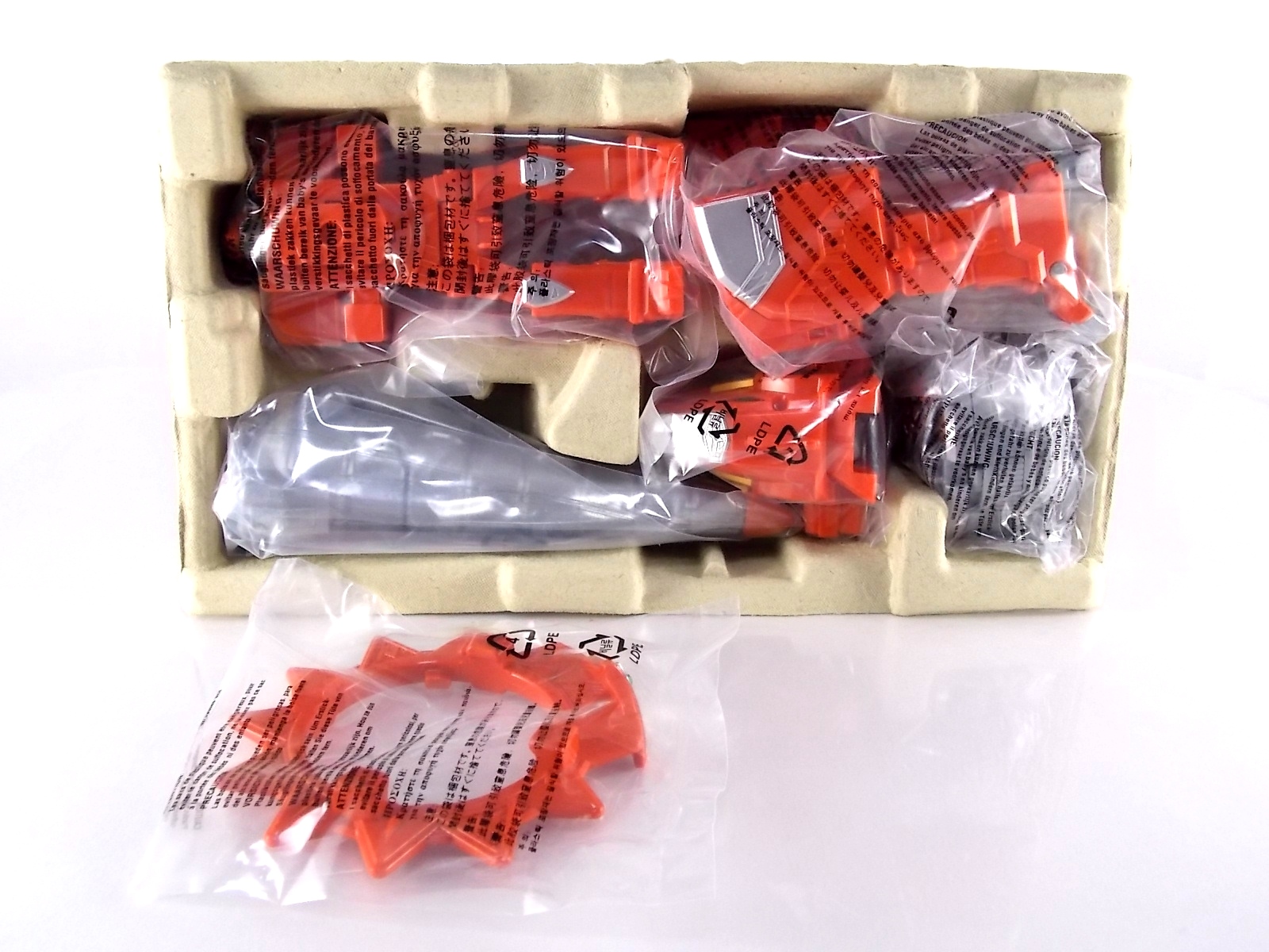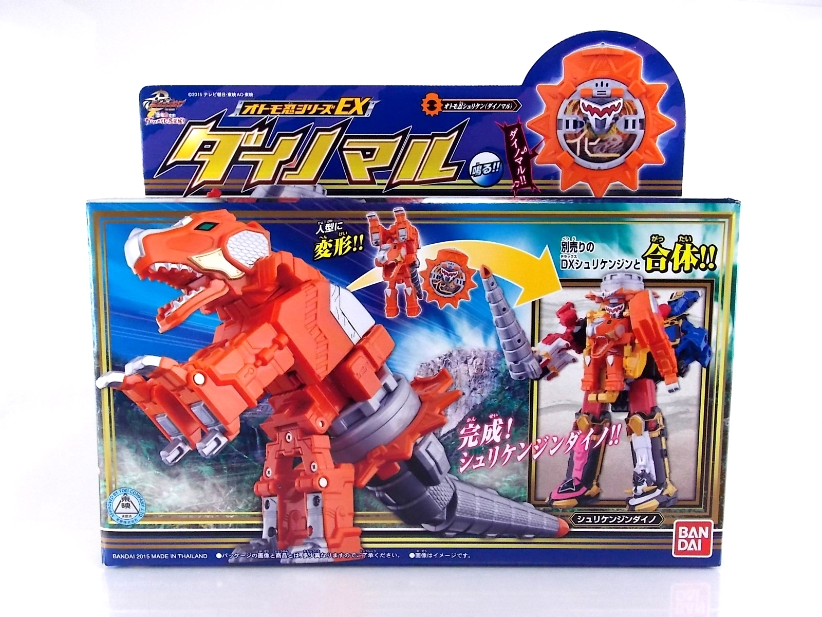 Packaging DX Dinomaru comes in the now standard packaging that all of the additional Otomonin of this toyline have shared. Nothing new to report here as the only changes to the basic packaging are the images of Dinomaru and the "EX" designation for this special release. Main Figure It needs to first be noted that DX Dinomaru is a remold & repaint of the first Otomonin released in the line, DX Paonmaru! It's kind of bonkers that Bandai were able to get an elephant & a dinosaur out of essentially the same toy, but they did it. And while the results are a little mixed it's still pretty damn cool. Dinomaru has an interesting transformation method to say the least. The standard configuration of this figure is obviously it's T-Rex form. To create it you need to first take the core humanoid body and ben it forward at the hips. Then take the the two hammer like weapons (which were axes on Paonmaru) and plug them on to the back of of the robot. Then attach the included T-Rex head onto the pair of clips on this back section and rotate the face down, the mouth can then open as well. The Shuriken itself with the disc attached then plugs onto what winds up being the tail of the figure, on Paonmaru it would have been the chest. Then simply plug the T-Rex tail on and use the joint at it's base to angle it up to allow clearance. Thus completing the look! It's actually a pretty intricate little figure in this mode, it's a little orange brick, but a fun one. The basic robot mode for Dinomaru can be achieved by reassembling the given components. Separate everything back down to it's base and start from scratch with the small humanoid robot. Straighten the legs out properly and then fold the head up out of the back of it's chest. Take the T-Rex head and plug it onto the Dinomaru robot's chest which gives you the basic robot. The head actually completes the arms of the robot weirdly enough, though not quite in the same way as Paonmaru did. The base robot only has elbow length arms but some tiny fists are sculpted into the head section to complete them. Then take the Hammers/arms and attach them to the shoulder/backpack area. This give the appearance of 2 giant claws coming off his bath and sadly means there's a lack of missle launchers that were present on Paonmaru. The actual Shuriken and disc aren't used for this mode at all. But that gives you Dinomaru in robot mode. As you can see the molding differences between Dion & Paon are that great but the affect the figure greatly here. The moving joins in the hammer weapons are gone entirely. Premanently molded handles give the impresseion of claws so this figure can't really assume a "down on all fours" type of mode. Accessories Included with DX Dinomaru are 2 accessories integral to it's T-Rex mode, and it's further combination with Shurikenjin. The Nin Shuriken Base & Disc. This electronic item is what forms the head and face of Shurikenjin Dino. It's normally stored on Dinomaru's animal form as the connector for the tail. I still think it's weird these Shurikens only have storage options in one mode for the Otomonin rather both forms. A pair of triggers on this piece detect when it's combined to form Shurikenjin Dino and plays out the appropriate phrase & music when done. When not connected pressing the physical button on top will cycle through three sound bytes "Dinoger" "Dinomaru" & "Otomonin Shuriken". Shurikenjin Dino To get Shurikenjin ready for this combination you need to remove and rearrange a few things. Remove the standard Shurikenjin Shuriken and leaving that to the side, it won't be used. Remove Shinobimaru from the throne, then remove the right arm made from Dumpmaru. Plug Dumpmaru arm onto the back peg of Shurikenjin & transform Shinobimaru into the new right arm and plug him on. Now take the basic Dinomaru robot minus the shoulder cannons and fold his legs up to seat him in the throne. Then simply plug the Dino Shuriken onto the the neck of Shurikenjin. As a side not the new faceplate is pretty awesome looking compared to the standard Shurikenjin face or the on the Paon Shuriken. It's sort of reminds me of Abare Killer's helmet. Now take the T-Rex tail and straighten it back out, then flip the small handle out at the base. Plug it into the combined robot's hands and there you have it, Shurikenjin Dino is formed! Whether it's intentional or not you can plug the unnamed hammer like weapons onto Shurikenjin's back for storage, or you can alternatively plug them right into Shurikenjin's hands in lieu of the Sword. While you won't be using the standard Shurikenjin shuriken in this combo, you can still use the Drago Sword & Shield optionally. Either way Shurikenjin Dino is pretty great. It's by far my favorite combination thus far. It may only have appeared in one movie thus far, but I'd say it isn't out of the realm of possibility to see it in the show at least once if the past is any indicator. Oh, and because of the dynamic hips Shurikenjin has you can get some decent poses out this form! Final Thoughts With what seems to be the final single Otomonin release in the line I have to say I'm satisfied. The 4 unique releases have been a bit hit or miss, but EX DX Dinomaru is the clear winner of the bunch. Check out our previous DX Ninninger galleries below! DX Shurikenjin DX Paonmaru DX UFOmaru DX Surfermaru DX Bison King