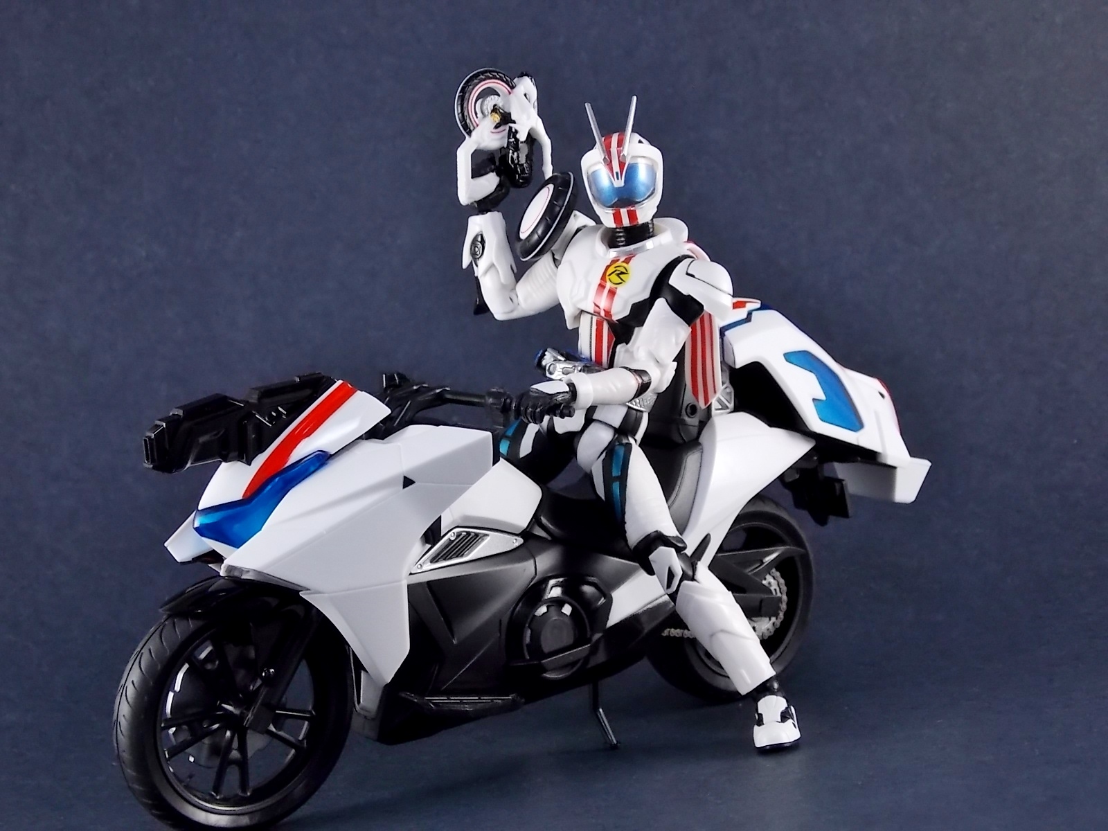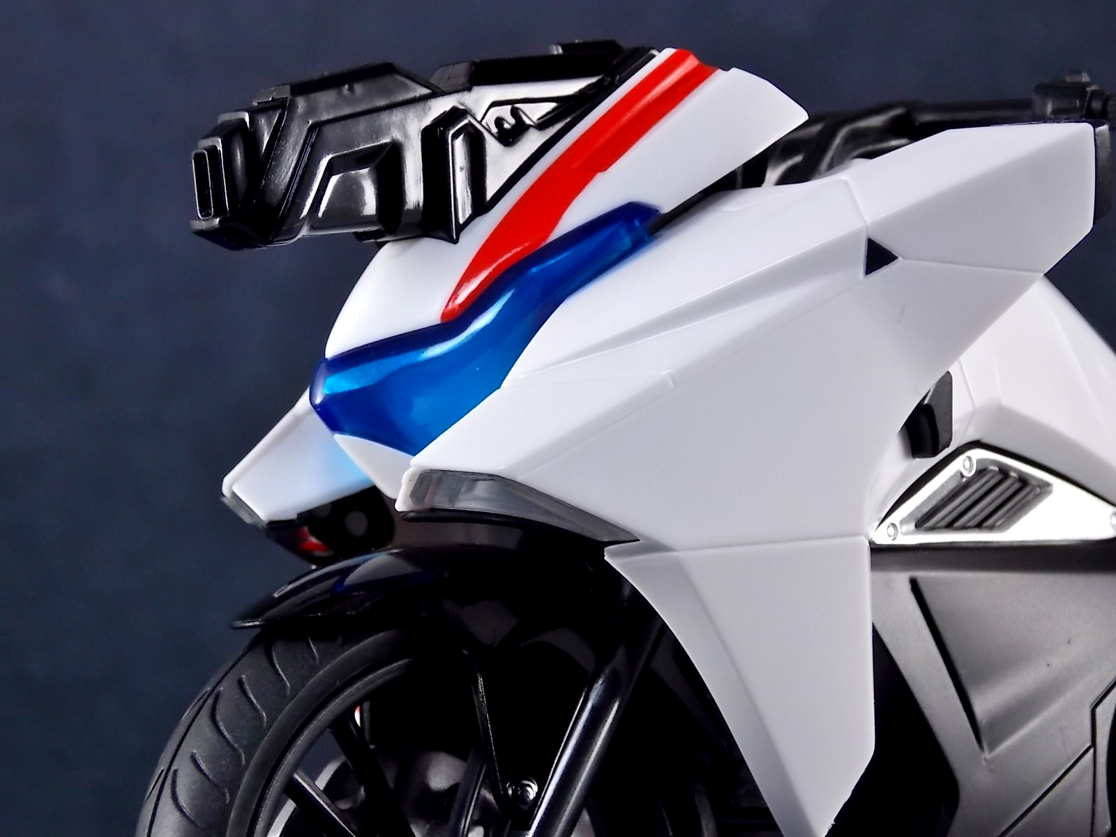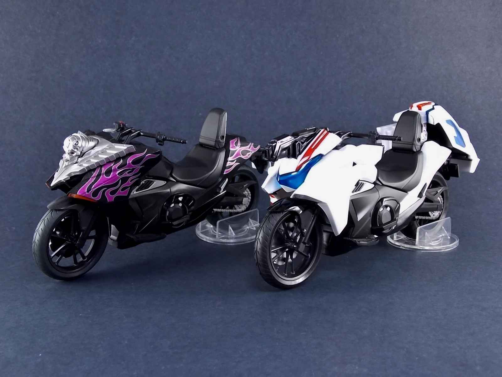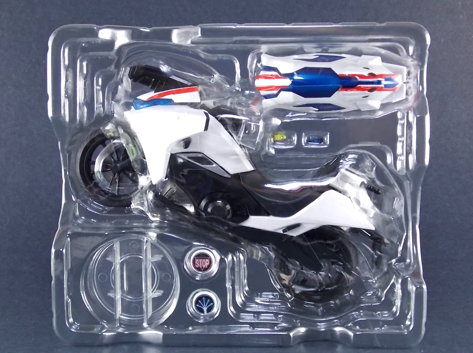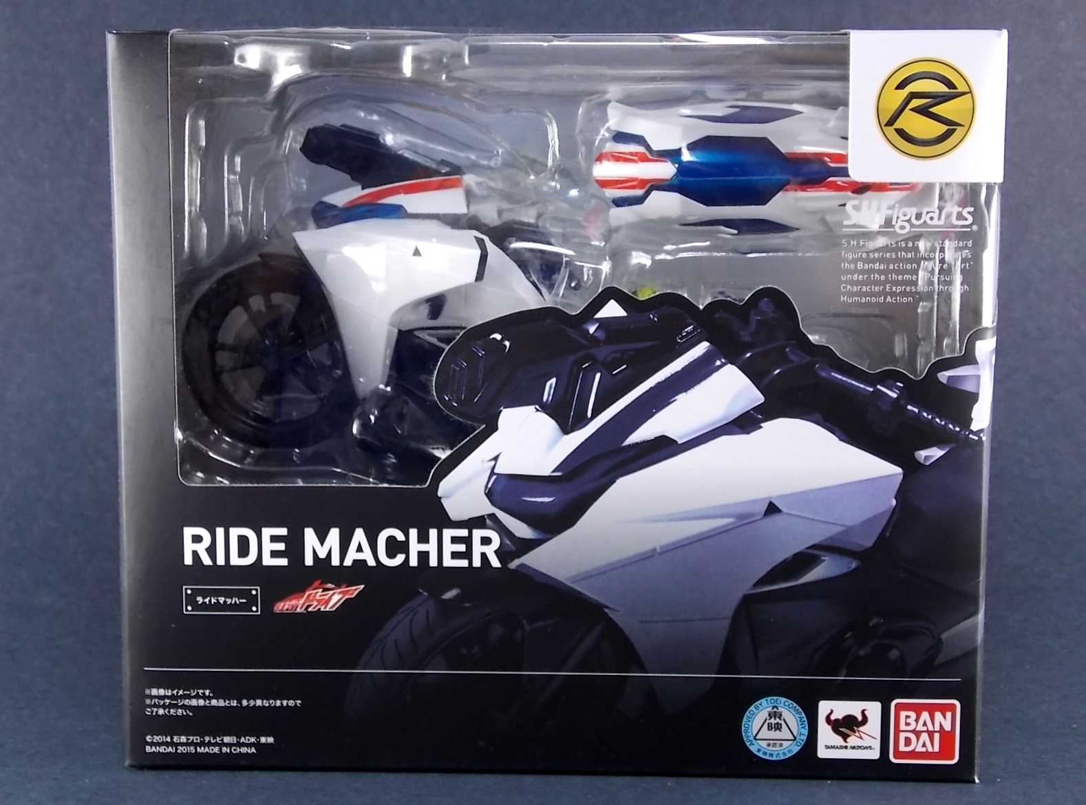 Packaging Ride Macher comes in a very similar box to the Ride Chaser. The basic design and layout are identical, right down the way the bike is in a diagonal tray. Seriously the packaging is barely different aside from the artwork. Ride Macher The main event so to speak is the bike itself. While there are some accessories to break down further below, for now let's talk about the Ride Macher itself. Again, at it's core the Ride Macher is the "brother" unit of the Ride Chaser. The two share some familial ties being based on the same Honda NM4 model bike. As with the Chaser the Macher frankly doesn't do much. It's a bike. It's gets the job done having working rear suspension and a turning front wheel. But as far as functionality is concerned that's it. Outwardly the bike is gorgeous, even if it doesn't do much. The Ride Macher trades out the Ride Chaser's dark motif of black purple and skulls for a more futuristic super bike styling. It's very angular and modern looking. While the bike has no serious ornamentation like the Chaser's skulls it has some really gorgeous blue visors that break up some of that white. By the way to complete the bikes basic look you'll need to pop on that rear part/bumper/monstrosity that hangs off the back. In show this part serves a purpose by eventually being the cockpit for the Ride Crosser, here it just looks a bit ugly. Sadly there's absolutely no indication at all that this bike can combine with the Ride Chaser to become the Ride Crosser. There are no moving parts or removable bits at all on the Rider Macher, aside from the Tail piece that has to be added when you take it out of the box. So my speculation would be that the Ride Crosser could be released as it's own stand alone vehicle, if it were to happen at all. The production & sale of such a thing would be entirely dependent on the sales numbers for the upcoming S.H. Figuarts Tridoron. For now if you want a combining version of this bike I suggest picking up the DX Ride Crosser set which is quite cheap these days. Accessories Unlike the Ride Chaser, the Ride Macher shares it's riders penchant for accessories and includes several: 1 - Wheel base. As with most modern S.H. FIguarts bikes this is the standard accessory to include. Though like the Ride Chaser this one is much larger than the norm to accommodate the wider tires and the additional weight of the larger bike. 1 - tail/bumper section. Again this is just the cosmetic rear end of the bike being packaged seperately. 1 - Signal Advent Tomarle. For use with the below accessory. Just exchange this for the default Advent on Mach's chest. 1 - Tomarle Signal Bike. For use in the mach Driver, just remove the default signal bike and peg this one in! 1 - Signal Advent Kaksarn. For use with the below accessory. Just exchange this for the default Advent on Mach's chest. 1 - Kaksarn Signal Bike. For use in the mach Driver, just remove the default signal bike and peg this one in! Frankly that's more accessories than some web exclusive Figuarts riders come with. The Ride Macher includes all it needs and much more for it's separately sold rider than just about any Figuarts vehicle ever has. Bravo. Final Thoughts While I commend Bandai for taking the time to include so much with the S.H. Figuarts Ride Macher, and truly appreciate how good it looks, ultimately it's a pretty boring release. After having the Ride Chaser in hand it's easy to say I like it more. Of course anyone would because of the additional detailing. But ultimately both bikes are a bit boring, but that's to be expected as most S.H. Figuarts bikes look great but rarely do much on their own. The Ride Macher though is at least serviceable in that it includes many more accessories for it's rider than most bikes ever would.