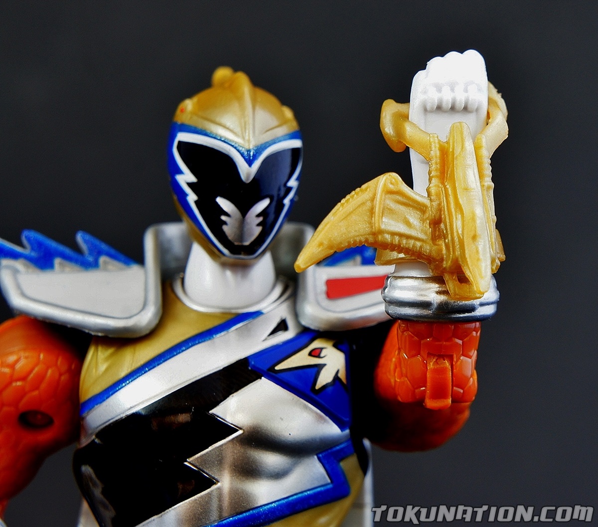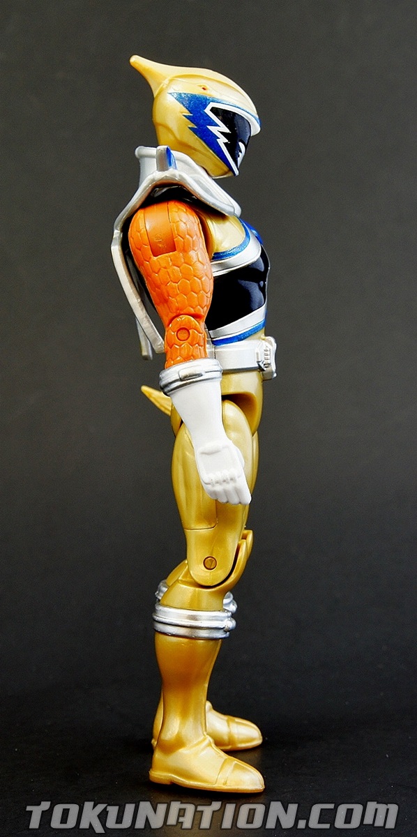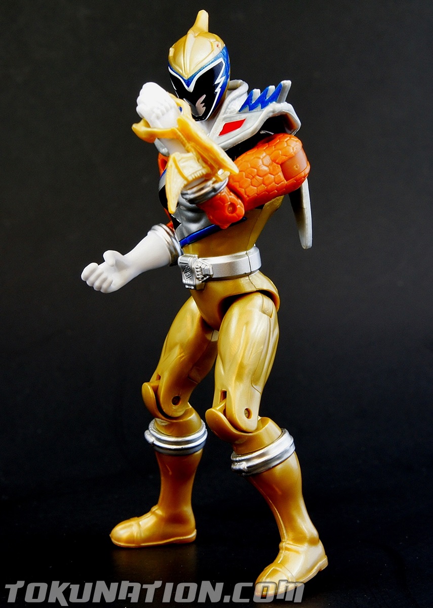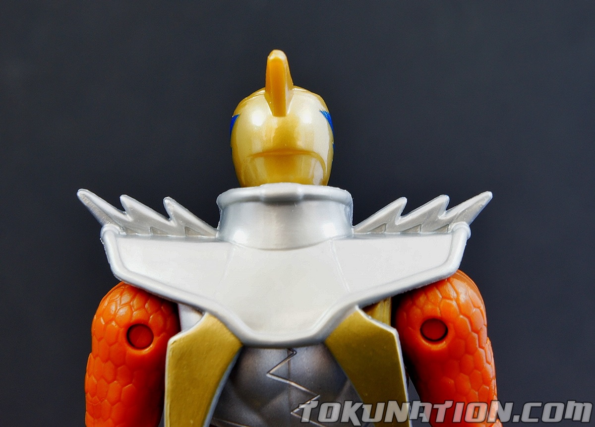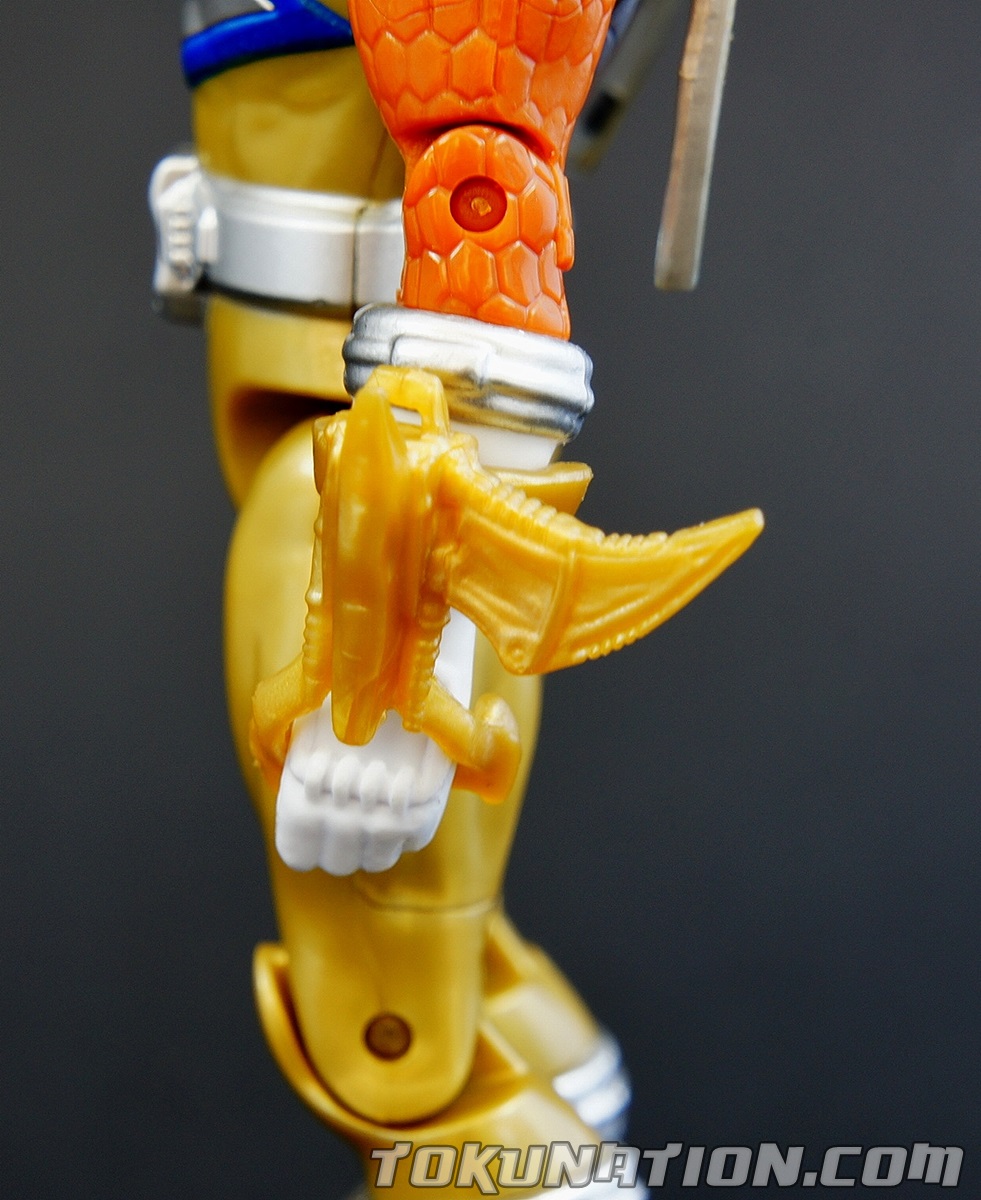 After 800 years of darkness, the Knight of Zandar Sir Ivan, has been released from his imprisonment inside the villainous Fury! With his freedom restored he becomes the Dino Charge Gold Ranger, using the power of the Gold Energem and from the Ptera Zord to vanquish his foes. This 5" figure is the first major retail release of the character, aside from a vinyl figure in Japan. You can find the Kyoryu Gold S.H. Figuart figure on the aftermarket, but it was not available as a retail release, and instead was a web exclusive. Right off the bat it should be noted that this figure is going to have the same quality issues you find in the other 5" figures from the Power Rangers Dino Charge line, because with the exception of a retooled head and chest, it is the same figure you've already purchased with the core four male Ranger figures. So ignoring those, we're going to focus particularly on this figure and what it brings to the table. The Figure First and foremost, Bandai America knocked it out of the park when they did the head sculpting. It looks incredible and the paint detail is outstanding. The metallic blue details on the helmet as well as remembering to add the red eyes are incredible. The paint on the chest is also top notch. Obviously, there's no paint on the back but on this figure you don't really notice it. But the colors picked create a bright and glorious looking figure in the package and even more so when you put the lights on it to take pictures. It just pops - and that's awesome. The Accessories The Ptera Sword is very detailed and nice looking. Obviously, it isn't painted. But it still looks incredibly sculpted as most of the Bandai America accessories do. Again, it's just the lack of painting that ruins what was otherwise a glorious looking weapon. The Ptera Morpher on his wrist is also unpainted, and comes in what I'm calling the "800 years of rust" colors (kind of like when he first calls for it in the show!). Obviously, the morpher is supposed to be blue and silver, but this is more of a rust-brown. Either way, it has great detail to it. Just more paint please! Or any paint, really. So let's break it down in bullet points, because bullet points are fun. The Good!