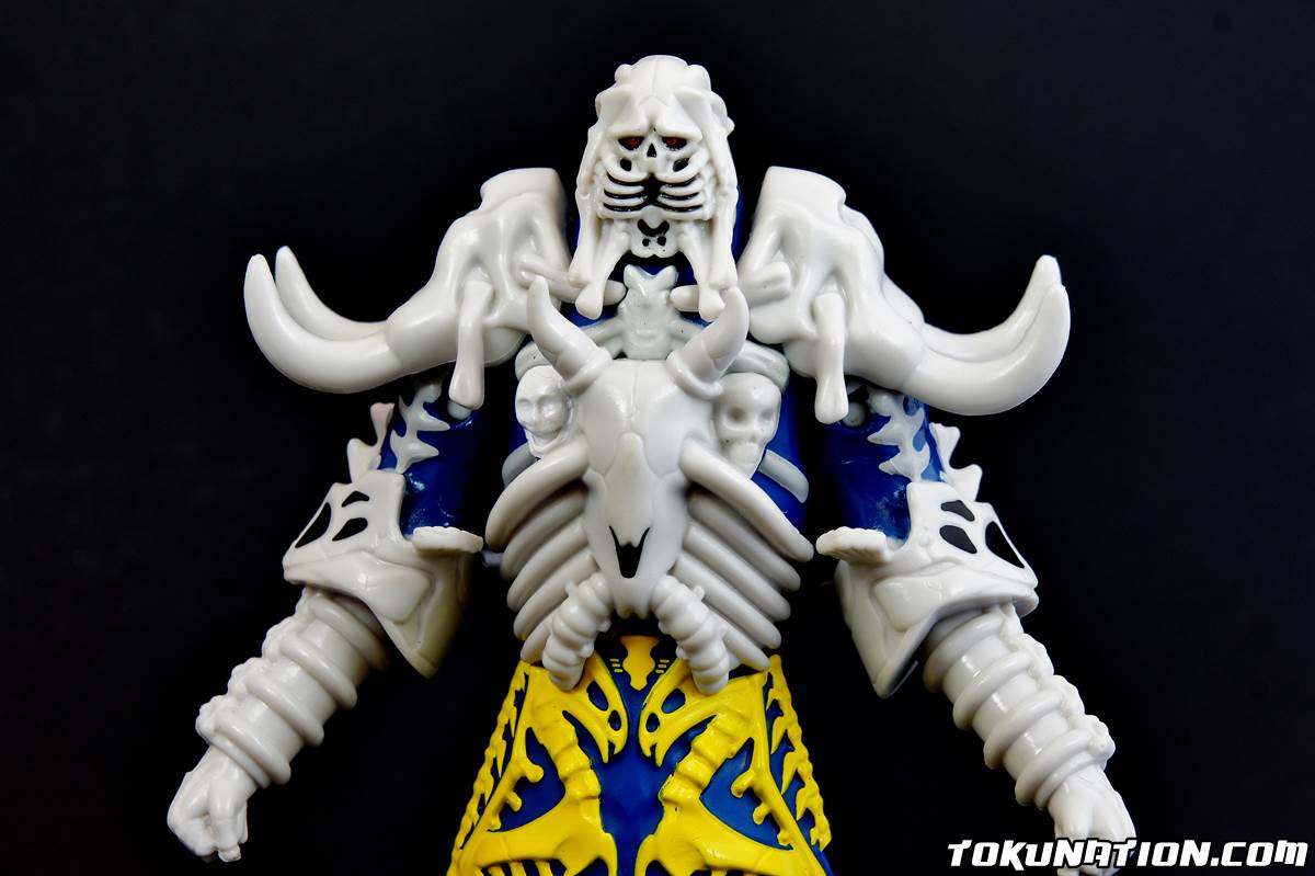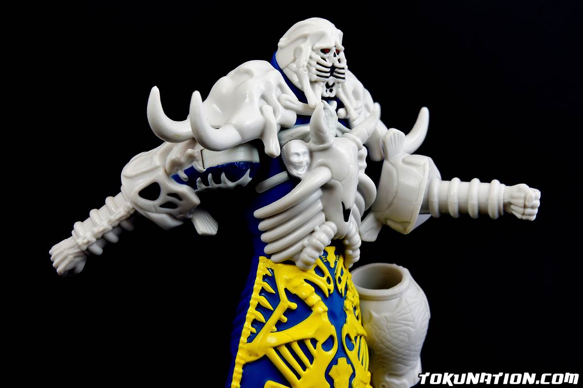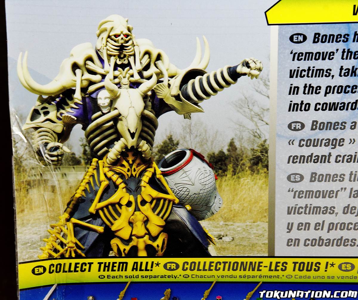 The Power Rangers Dino Charge five-inch toy line continues on with more villains! This is an important event in the franchise's toy line history as this is the first time in nearly a decade or so since we've received various "monsters of the day" as actual action figures. With these figures trickling out we managed to grab them all - and we're going to review each and every single one of them! The Figure Let's just start off with what everyone is curious about - articulation. Bones features 6.250 points of articulation. His arms move up, down, forward, and backwards. He has two shin joints that allow for 360 degree movement. And the ".250" comes from the head as it does move but due to the shoulder gear only about 5 to 10 degrees in either direction. However this figure is absolutely gorgeous. The sheer amount of detailing in the mold is astounding. Could it be better? Yeah, if it was a S.H. Figuart probably. But for Bandai America this thing is as close to masterpiece sculpting as you'll ever see. The head sculpt is damn impressive, to the point that the red eyes even have black pupils put on. What this figure lacks in articulation it absolutely makes up in how it looks. It is easily one of the most impressive looking figures out of Bandai America in the last 5 years if not longer. The Accessory Bones comes with his bucket'o'bones, minus the bones. When he pulls out someone's backbone it goes in to this bucket. It is highly detailed (but not painted) and aside from a piece or two of leftover melted plastic it looks fantastic. I was half tempted during the gallery to rip off some Vivix body parts and put them in there for show. The bucket attaches via a rough 3 to 4mm peg (not a 5mm peg) and can spin all around. The Good!