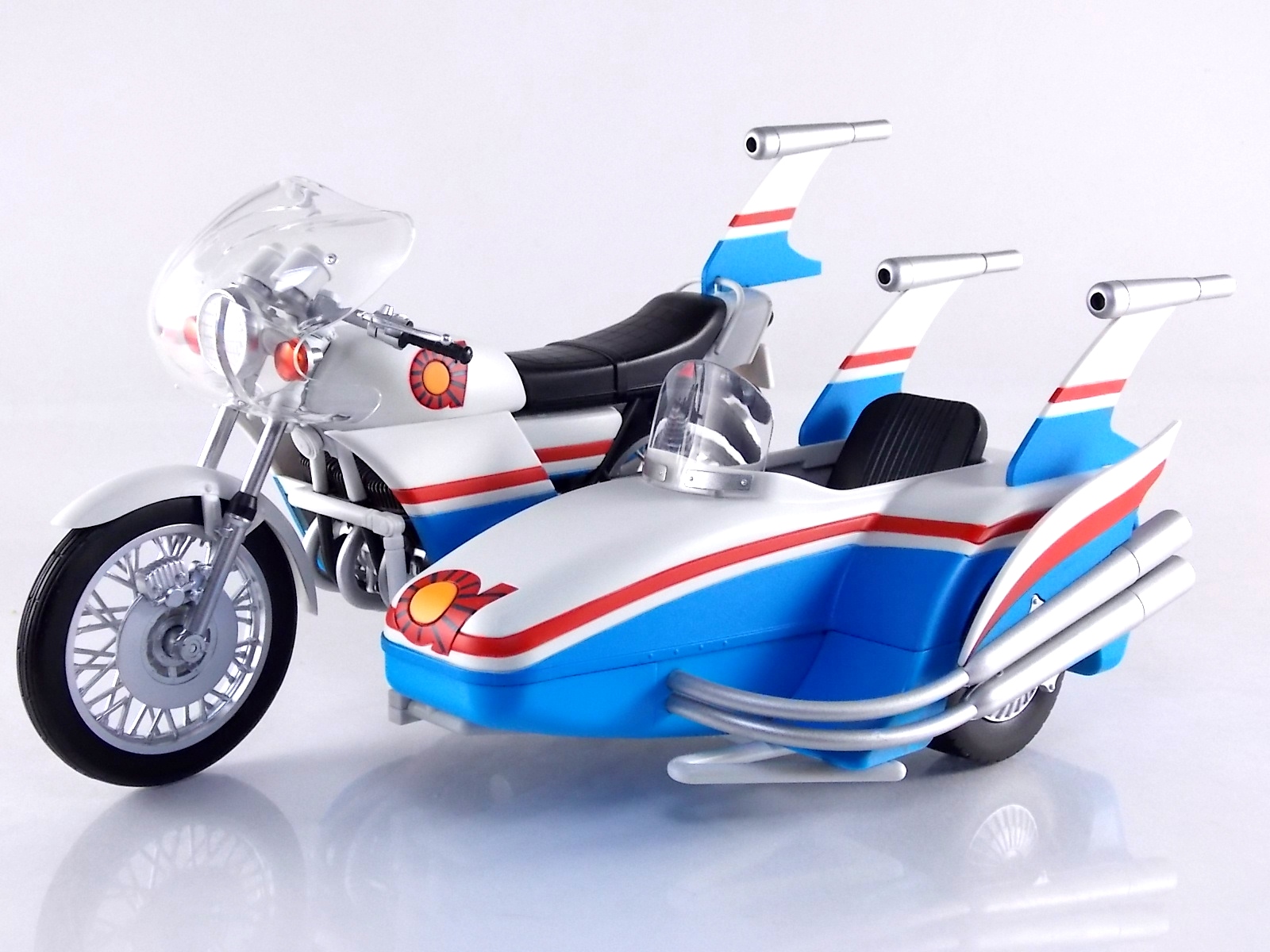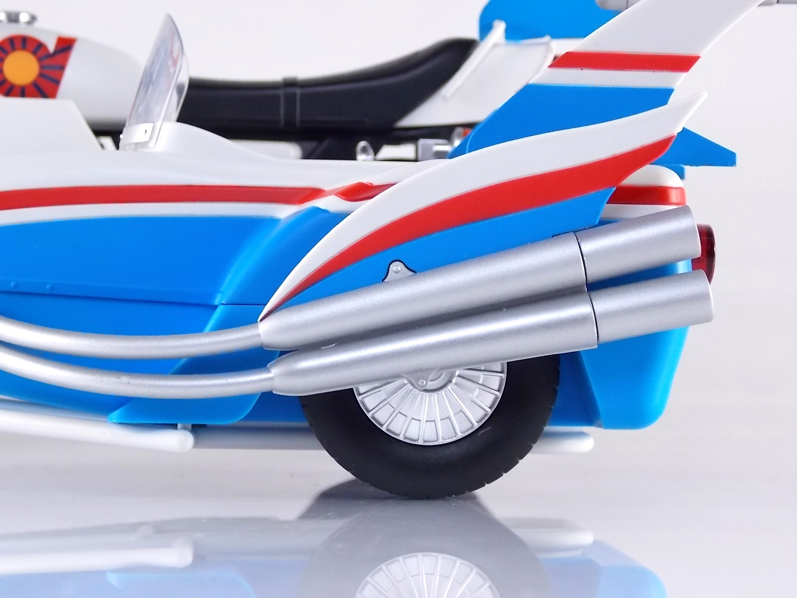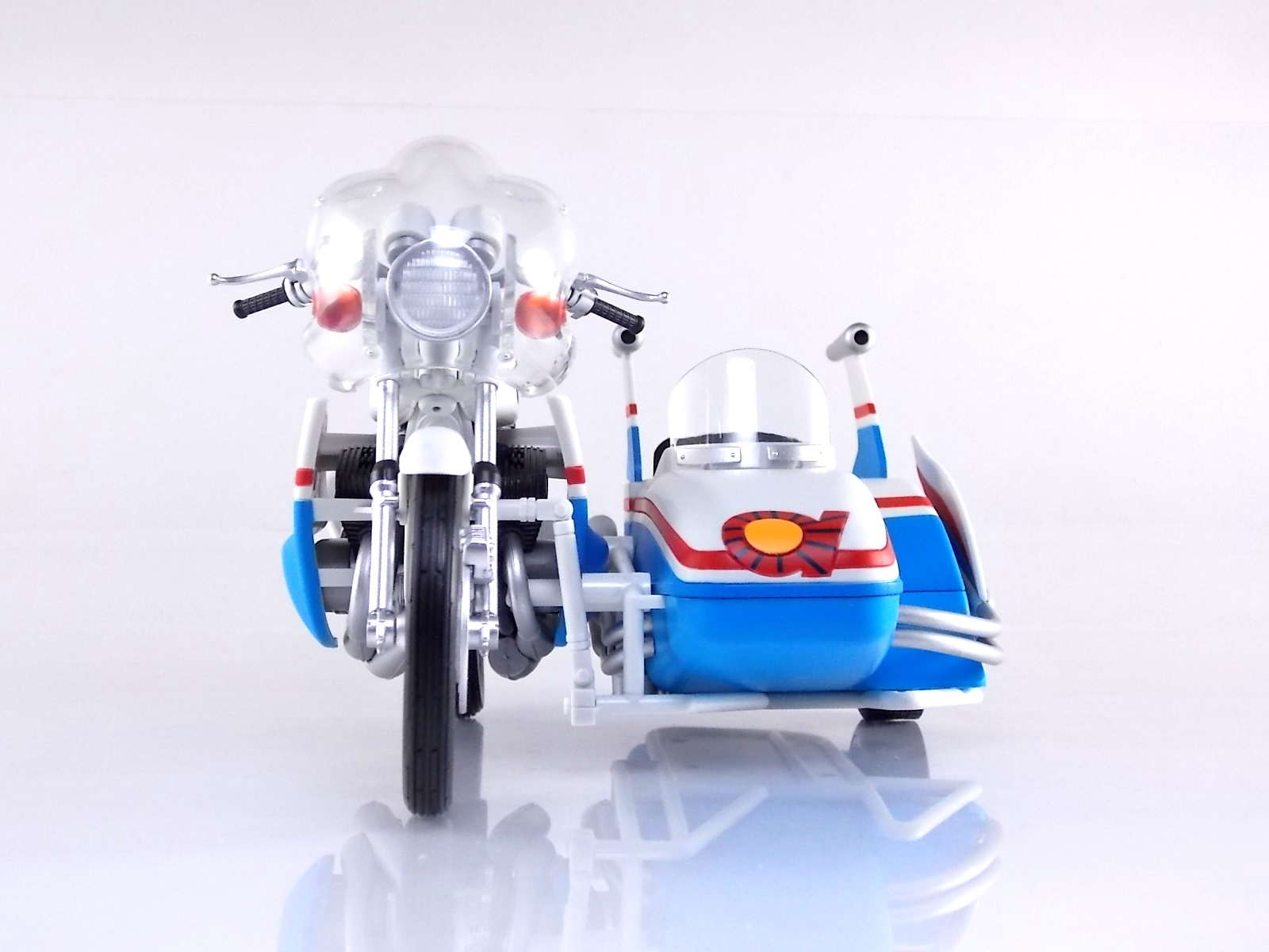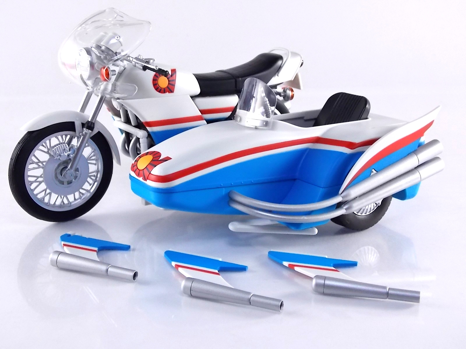 Befor checking out the below gallery, please be sure to check out all of our previous Kikaider related galleries as well! S.H. Figuarts Kikaider S.H. Figuarts Hakaider S.H. Figuarts Kikaider's Side Machine S.H. Figuarts Hakaider's White Crow S.H. Figuarts Kikaider 01 S.H. Figuarts Gill Hakaider S.H. Figuarts Hakaider Squad (Red/Blue/Silver) Packaging It's all business as usual with this release. The Double Machine comes in the same type of box as all of the other Kikaider & Hakaider releases in the line. Same gorgeous minimalist art on the box and sleek packaging all around. Only difference here is the size. Due to the Double Machines' size the box is basically about as large as the Hakaider Squad 3-pack. Main Figure The main event so to speak is here! The Double Machine itself is an impressive follow up to the older model Side Machine. Both Machines clearly share basic design choices that unite them in the same family of vehicles. The Side Machine was of course based on a Kawasaki GT 500 Mach III, though the Double Machine's heritage is a bit more dubious to my knowledge. The Double Machine comes packed as one gigantic piece. The only assembly necessary is the 3 spoilers that are included detached. 2 of them plug onto the sidecar and one on the main bike. With that little bit done we've got the completed Double Machine! Obviously the immediate take away is that this sucker is huge. Significantly larger than even the Side Machine which is itself a huge bike. Both of them share the unique honor of being the only side-car bikes in the entire S.H. Figuarts toyline. On top of this the Double Machine simply is a more extravagant vehicle. There are quite a few more ornamentation's and paint apps applied here than on most Figuarts bikes. That's just a product of the time in which this bike was designed. 70's toku is a hell of a drug. As is though the Double Machine is just gorgeous. And frankly mine is flawless. Very impressed with the QC on this thing. The paint is crisp, the molding is sharp. No scratches on the windshield. The Kikaider 01 emblems look gorgeous. And all the right details are sculpted in. The Double Machine is likely the best detailed bike I've seen in the S.H. Figuarts line. It just screams 70's in all the best ways and looks even better when you put Kikaider 01 on it. Obviously this is just a bike so it doesn't do much on it's own. If you don't own 01 then there's not much point in having this. But with at least a driver on board it looks fantastic. The side car can accommodate pretty much any other S.H. Figuart you want it to as well. I had fun putting Kikaider in there. Accessories Just the 3 above mentioned spoilers. No hands or extra handlebars or any of the usual stuff. This is an extravagant bike all it's own and Kikaider 01 already came with the hands he needed to hold the handlebars. So this is a pretty much complete package already. Final Thoughts I've been more than happy to throw myself whole-heartedly into the Kikaider subline of S.H. Figuarts. I've devoured every successive release and been left wanting more. Bandai could crank out as many Kikaider releases a year as they wanted to and I'd take them all. In the course of the last 11 months we've gotten 8, at roughly 1 new release every month or so I am totally pleased with that pace. Considering how Sentai Figuarts seem to struggle with releases and sales, I'm shocked Bandai wound up so dedicated with Kiakdier. If the quality continues at this upward trend I doubt I'll be disappointed any time soon either. While Kikaider himself was in my eyes a fairly substandard release, Hakaider was an improvement. And the trend continued from there until we're here with the gorgeous S.H. Figuarts Double Machine! While I could continue to profess my love for Kikaider figures all day long I'll just say this, a bike like this is for a completionist or a true lover of the franchise only. If you don't have an immediate and reactive desire to own the Double Machine, then you don't need it. I needed it, and I'm happy to have it for the impressive piece of toy it wound up being. If this is the last releases that Bandai chooses to end the Showa Kikaider line on then I'm certainly not disappointed. But please give us more Bandai, there are so many figures and vehicles left to do. I'll buy every one.