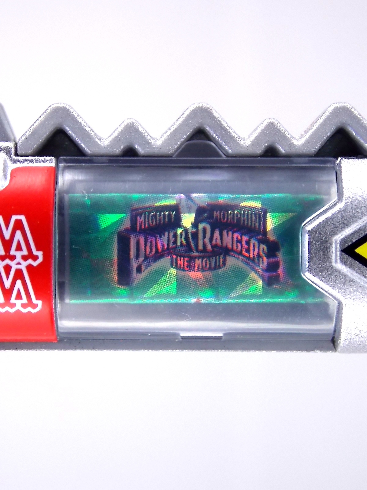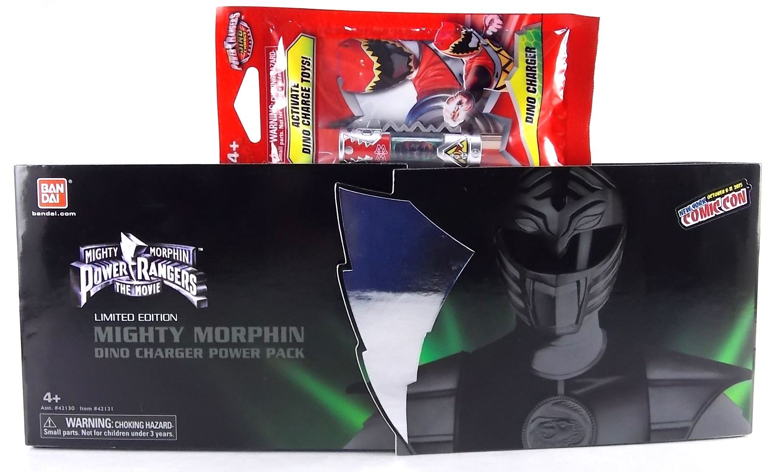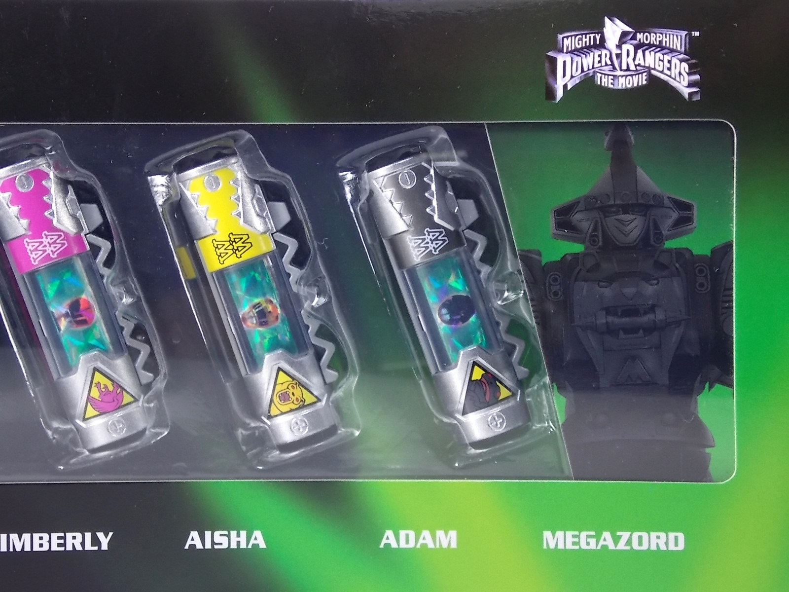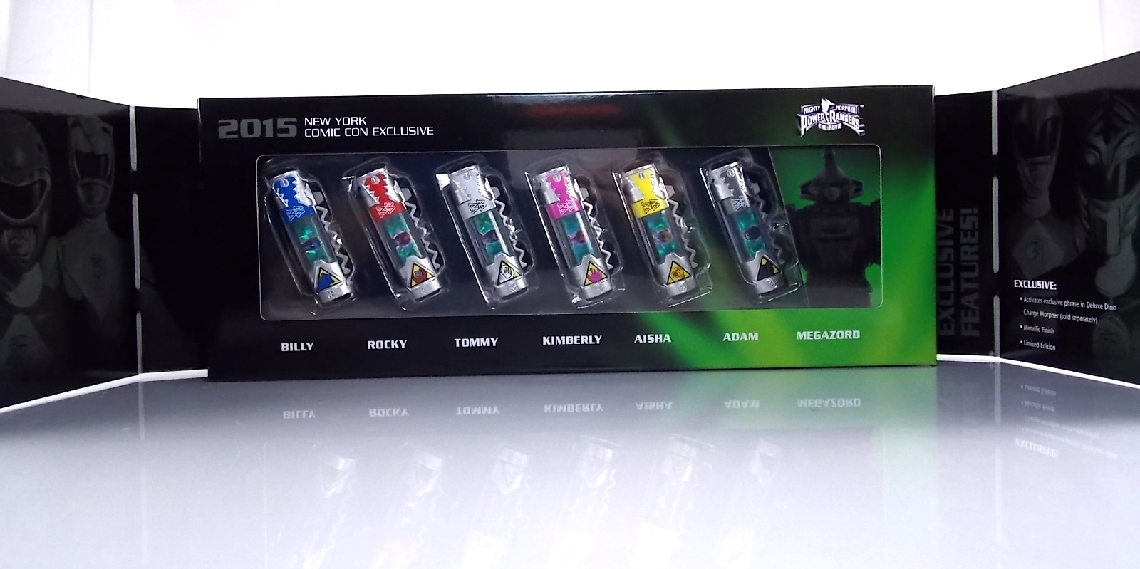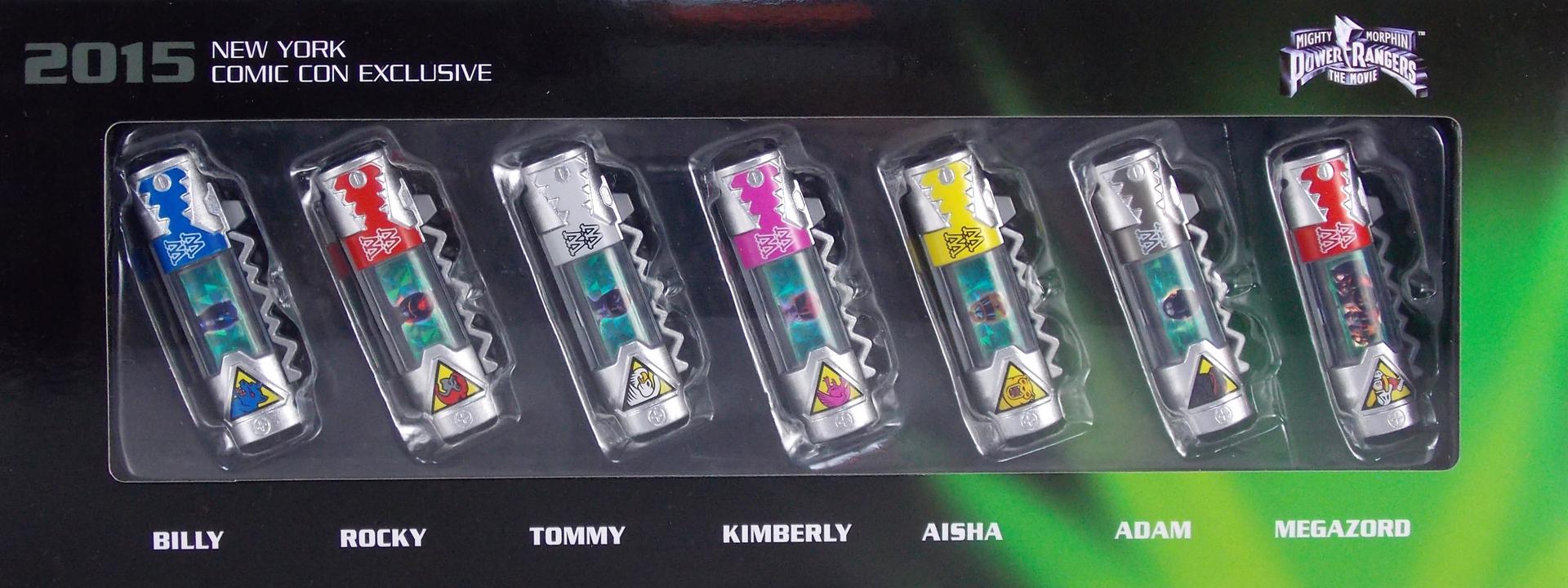 New York Comic Con 2015 may have come and gone but we've got at least one souvenir to remind us of the show. It's the Exclusive Mighty Morphin Power Rangers Movie Dino Charger Power Pack! And the accompanying Toys 'R' Us exclusive Ninja Mega Falconzord Charger as well! Read on below for a review and gallery of this exclusive grouping, and be sure to check out the brief video attached to this story to see what sounds these exclusive Dino Chargers make in the Dino Charge Morpher! ** It should be noted that technically the Megazord Charger would be the incorrect one to go with this set as it has the wrong wording of the name. That Charger is explicitly labeled as "Ninja Mega Falconzord" which is the TV version of the name. While the actual mecha featured in the movie was referred to as the "Ninja Falcon Megazord". It's minor but worth pointing out. Packaging What became the norm for Bandai America's previous Power Rangers con exclusive Ranger Key sets has now transitioned to Dino Chargers. Although this is only the 2nd set we've seen of them, I'm sure more will follow. The packaging is the same kind of long box door style box that the SDCC Mighty Morphin TV Series Dino Chargers were packaged in. Since this is Original Movie tie-in merchandise the front flaps of course feature the movie logo and White Ranger, being the most marketable member of the team. The back of the box features some nice head shot artwork of the whole team and the Ninja Megafalconzord as well as a brief overview of the Movie's plot. Open the velcro flap on the front to feast your eyes on this beautifully packaged set of Dino Chargers. As with the previous con exclusive set this is a fantastic presentation that feels the right level of fancy for an exclusive. Again we're treated to artwork of the rangers on each flap, only a bit more detailed this time. The packaging itself presents the Dino Chargers in the order that the Movie Rangers would traditionally stand when morphed such as on the DVD box art. The box has each of the rangers' names below their corresponding Charger as well. From left to right; Billy, Rocky, Tommy, Kimberly, Aisha, Adam. The 7th slot in this set is a special placeholder for the sold separately Toys 'R' Us Exclusive Ninja Megafalconzord Charger! A small flap with artwork of the Megazord is placed here to represent it until you get that one in hand, something which I already have for this review. The nice thing about this set is that it isn't taped or sealed shut. So you can easily open it to get that flap out of there once you have the final charger. The Dino Chargers themselves are packed into a small plastic tray within a cardboard insert. Dino Chargers Each of the Power Rangers Movie Dino Chargers is painted in a really gorgeous metallic silver. Something really befitting of a con exclusive pack. Much like the metallic Ranger Key sets we've gotten in recent years. Each one of the Chargers of course has it's own unique markings to go over as well. Each of them in default mode features the helmet of a movie ranger on a holofoil surface inside the middle of the charger. Standard stuff for Dino Chargers. What's really cool to see here is that each Charger has artwork on the end based on each rangers Ninjetti or Ninjazord! This is really fascinating as the Dino Charger artwork is a hold over from the Zyuden Sentai Kyoryuger collectible Zyudenchi gimmick. So seeing this set of Zords interpreted through that art style is kind of amazing. From left to right; Wolf, Ape, Falcon, Crane, Bear, Frog, & Ninja Megafalconzord head. Each of these Chargers also features what standard Dino Chargers do, and that's 3 additional images within the rotating prism. Simply press the button to cycle through each. However these are a bit more unique than cycling through active and inactive dinosaur images. Each Movie Dino Charger features the Rangers helmet at default but the 1st click brings you to their Movie exclusive weapon or power-up! But that's not all, here's the breakdown of what each Dino Charger will yield when clicked: Wolf Charger - Blue Ranger Helmet>Stega Stinger>Wolf Ninja Zord>Movie Logo Ape Charger - Red Ranger Helmet>Power Scope Helmet>Ape Ninja Zord>Movie Logo Falcon Charger - White Ranger Helmet>Saba>Ninja Falconzord>Movie Logo Crane Charger - Pink Ranger Helmet>Pterodactyl Thunder Whip>Crane Ninja Zord>Movie Logo Bear Charger - Yellow Ranger Helmet>Power Beam Helmet>Bear Ninja Zord>Movie Logo Frog Charger - Black Ranger Helmet>Movie Power/Blade Blaster>Frog Ninja Zord>Movie Logo Ninja Mega Falconzord Charger - Team Helmet Shot>White Ranger Morpher (Falcon)>Ninja Megafalconzord>Movie Logo This is a pretty creative way to get some variety out of each of these Chargers, though I can't help but feel that Black Ranger (Adam) got the short end of the stick by merely having the Power Blaster on his Charger. Though he got the shaft in the movie as well with no special weapon or power-up making an appearance. And the White Ranger Morpher being on the Megazord Charger seems a bit odd, but it works. All in all this is an excellent execution of the Dino Charger gimmick. The only other notable feature of these Movie Dino Chargers is the name of the aformentioned Ninja Zord on the back of each as well as a unique QR Code on the front of the charger. All of these chargers are of course compatible with the previously released Dino Charge Morpher and any other Dino Charger compatible toy released in this line. We'd known for some time that a some special sound effects were programmed into the Dino Charge Morpher and this set activates one. Just at the SDCC 2015 MMPR Dino Chargers did, the Mighty Morphin Power Rangers Movie Dino Chargers, all 6 in fact activate the "Comic-Con" sound byte! The separately sold Ninja Mega FalconzordCharger activates the "Legendary" sound byte much like the Dino Megazord Charger released at Toys 'R' Us earlier this year. Final Thoughts As far as convention exclusives go this is a creative 