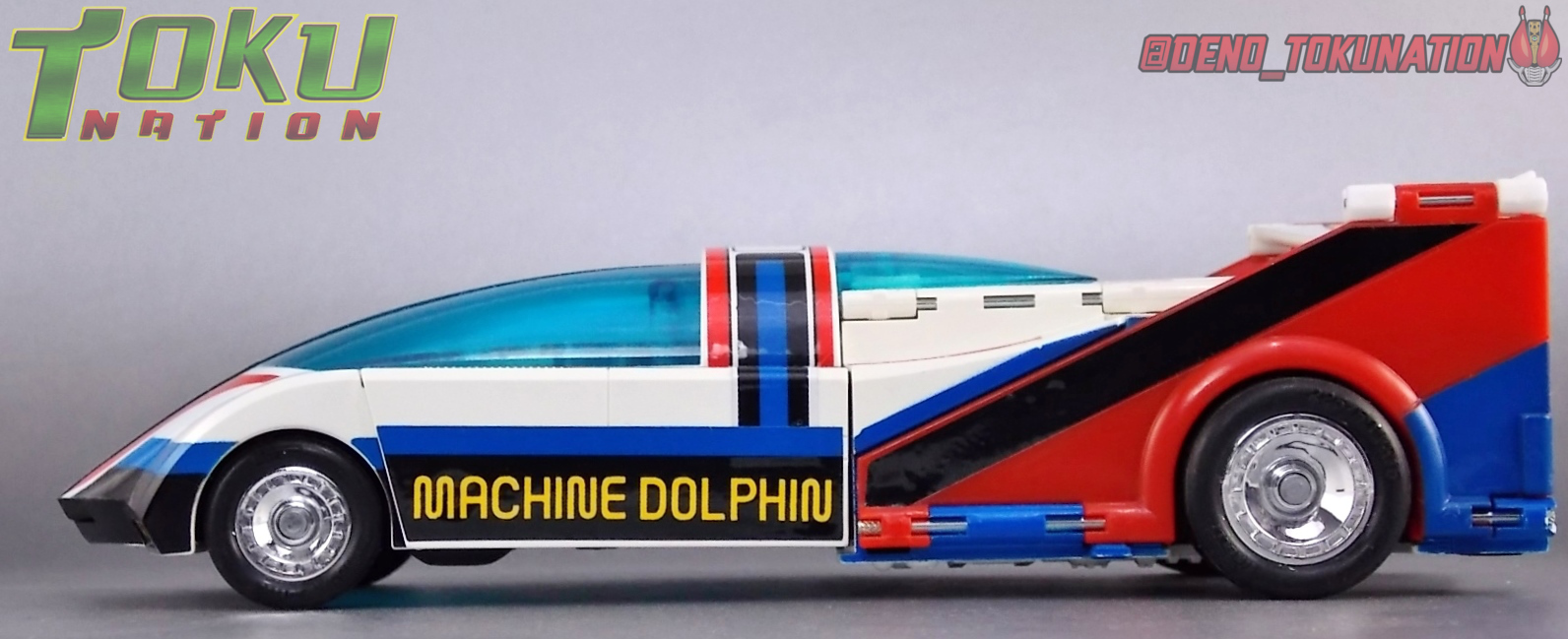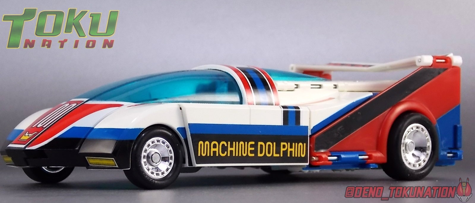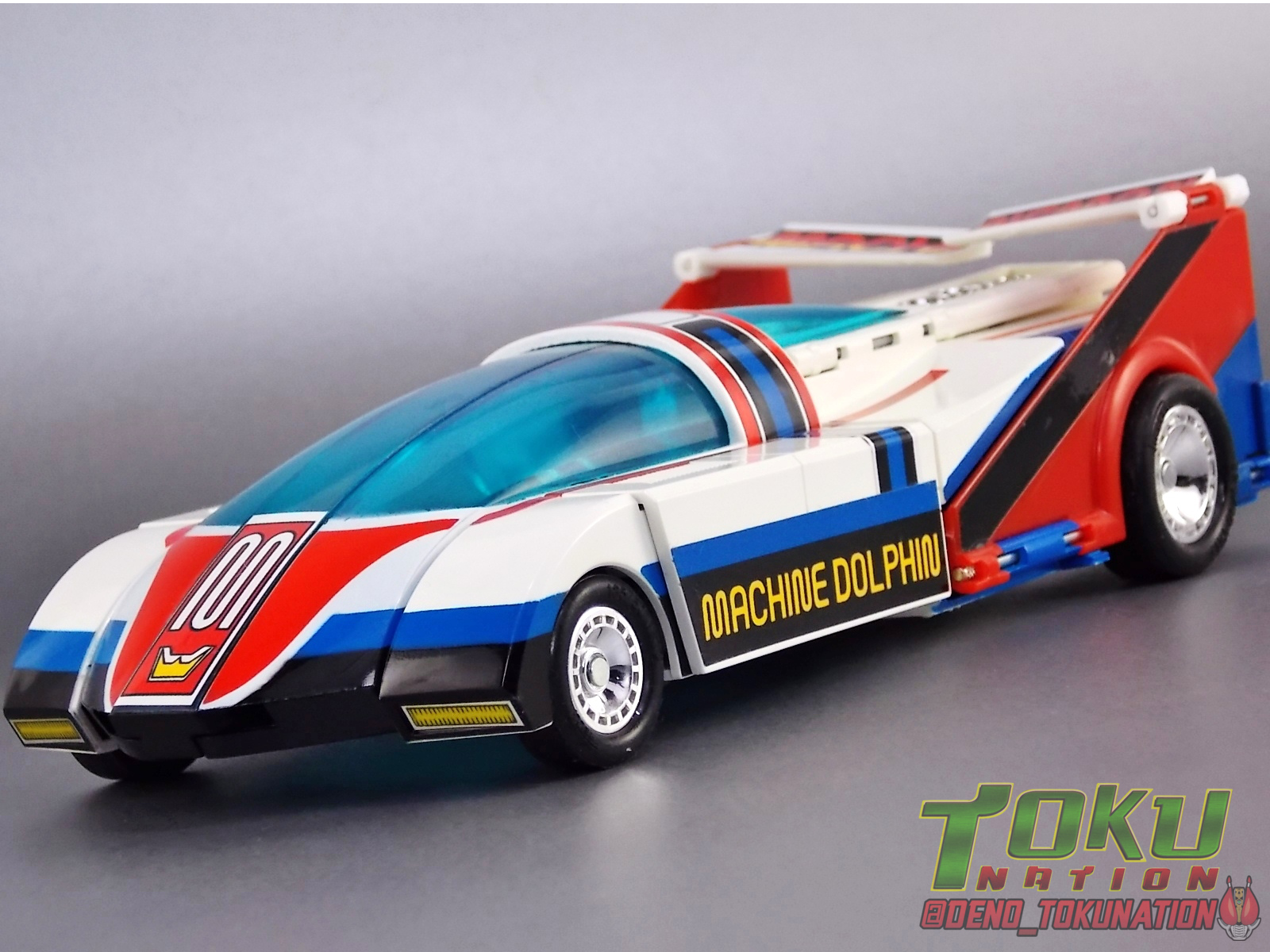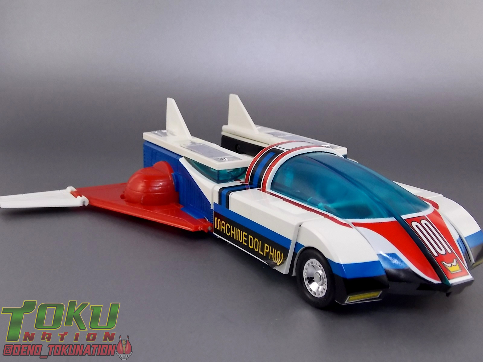 For a little background, Seiun Kamen Machineman was a series created by the late great Shotaro Ishinimori in 1984. The lead hero hails from the planet Ivy and has come to Earth to study humans for his doctoral thesis, taking on an alias as Ken Takase. Ken winds up staying on Earth much longer than he intended (36 episodes) when he discovers that the evil organization Tentacle, later Octopus, seeks to remove all children form the world. As a result he dons the technology of his home world and becomes Machineman! ![]() Machineman is a series that I, like many, have never actually gotten to watch. It's certainly not something your typical fansub groups would ever tackle, and raws aren't even something you can find normally. I've always been intrigued by the characters backstory and unique look though. So I'm happy to be able to share at least a piece of this series it with you. For additional context I've included some images from the series to illustrate a bit better some of my points. Packaging Having picked mine up some time ago, I'm afraid I don't actually have the outer box for my Godaikin Machine Dolphin. Only the styrofoam insert. That would be because technically, this is the original Japanese release. For those unaware, Godaikin was a short lived high end series of releases that came to America directly via Bandai Japan in the late 80's. These were literally the same toys released by Bandai domestically in Japan. They were even shipped to the states in their original Japanese packaging and repacked into the new Godaikin boxes stateside. So mine comes from a warehouse stock of samples that were never reboxed or circulated, hence it's near immaculate condition. Godakin didn't last long here due to it's high price point for the time but it allowed many american collectors to experience for the first time the wonder of such amazing toys as Sun Vulcan Robo, Bio Robo, Daltaneous, Combattler V, Daitetsujin 17, and many more. Many of these release still fetch incredible prices today as well. Main Figures Machineman Of the two primary components in this set, Machineman himself is the least impressive. Now of course this set was released in 1984 in Japan so I can't be too critical of it after all. So I'll try to stick to the basics. Machineman is himself a hefty little Chogokin figure. One of a similar style as those released for Super Sentai & Kamen Rider in the 80's & 90's. He's squat, bulky, and heavy with limited articulation that was excellent for the time. He has moving shoulders, elbows, and knees. The neck joint can also collapse backwards to allow him to sit in more of a piloting position when in Machine Dolphin. This figure is quite small by today's standards but still manages to look pretty great thanks to a few decent paint apps and some well applied labels for detail. You won't get any dynamic poses out of him but for what it is this is a good figure. The only weird thing is that this figure doesn't feature Machineman's iconic clear cape. It's a very weird accessory in show, as it basically looks like a shower curtain, but the toy doesn't feature it at all. On the flip side though Machineman didn't always use it either. I'd kill for a figuart of Machineman with a nice clear hinged cape. Maybe one day. Machine Dolphin By far the best part of this set is the fully transformable Machine Dolphin! This vehicle is pretty damn close to a 1:1 scale with the figure included with it. If Machineman were a bit larger or Dolphin a bit smaller it would be spot on. The Dolphin acts as an almost exo-suit/skeleton for Machineman so it's not much larger than he is, as can be seen when an actor rides in the vehicle. This is all really unique for a transforming tokusatsu mecha. Imagine a Machine Dolphin to scale with today's S.H. Figuarts line, that would be incredible. Machineman can ride in Machine Dolphin in all 3 of it's forms as well. Just insert him from the underside legs first with his neck joint rotated back, allowing him to stare through the windshield of the car. There's a very sturdy metal clasp to snap his waist into that will keep in there nice and securely. This figure is packaged in it's Jet mode, but for the sake of trasnformation ease we're beginning with the car form. Machine Dolphin is the standard super future car mode for this piece. Hailing from an alien planet it is of course a bit different compared to most vehicles. It's not quite street legal looking but it's really unique. As a Godaikin/Chogokin this figure features some die cast metal to give it some good heft. The tires are also rubber adding another layer of authenticity to it. The labels are pre-applied from the factory as well so there's nothing to worry about there. Mine does have a defective peeling label but it's really not that bad. To get Dolphin into it's flight capable form, Dolphin Jet, you need to do a little bit of transforming. First fold the wings/spoiler section down and out, which rotates the rear wheels out of sight, you'll noticed sculpted in black thrusters with small metal wheels on the rear of the car. Fold these down and the wheels become a landing gear of sorts. The engine detailing on the rear end is also hinged on panels to fold up and out to the side revealing wing tips. Moving to the front end rotate the front fenders down and into the underside of the car, then extend the center of the cockpit forward revealing the forward landing gear. This finishes off the sleek and incredible looking Dolphin Jet! It really is a gorgeous piece in this form. Perhaps my favorite way to display it. The third and by far most bizarre form for this toy is Dolphin Robo! A bipedal robot with Machineman sitting in it's abdomen. After the Jet transformation you're basically half to this form already. The rear tailwing sections are on hinged joints that swing back and inward and lock in palce. This movement reveals the fists connected to the back of the side fender. Bring the wing you folded out earlier back in and 