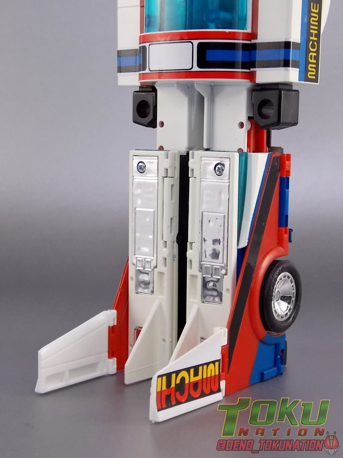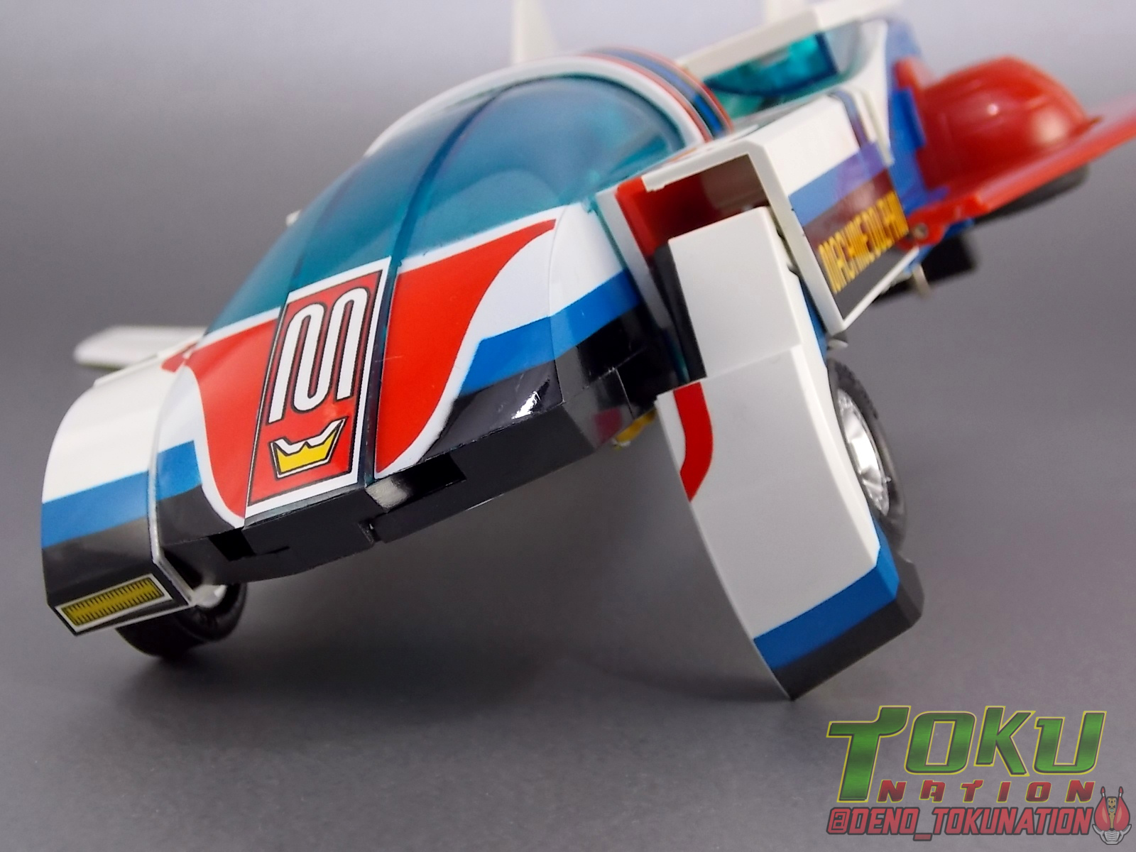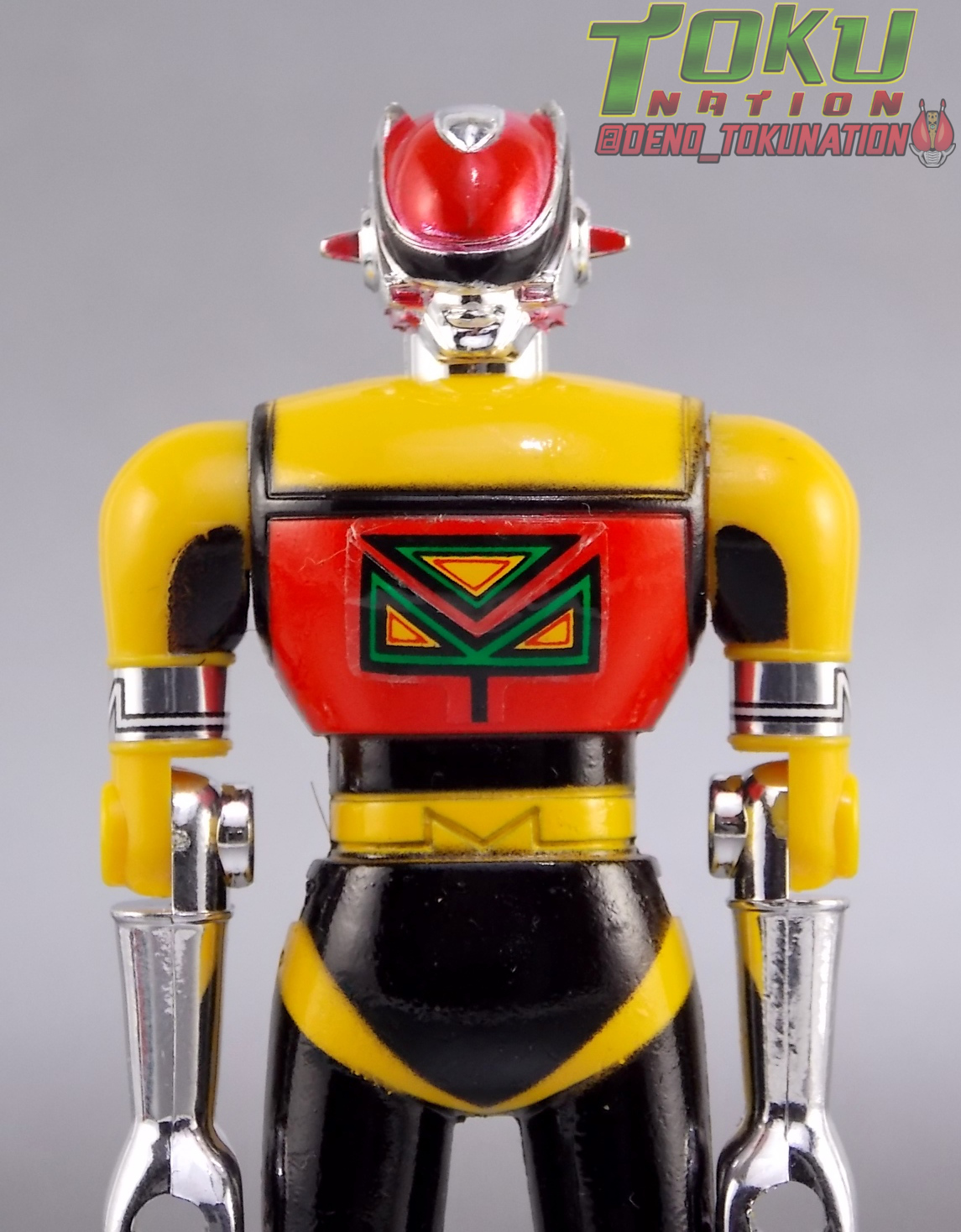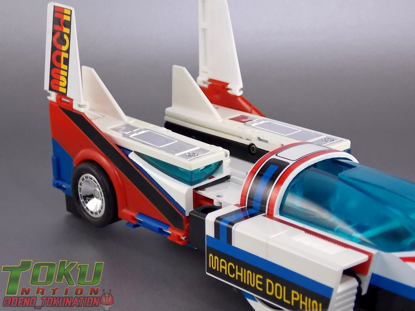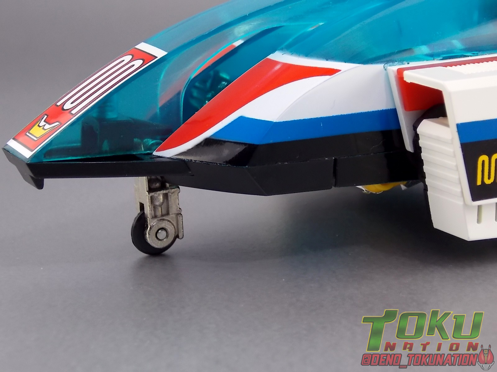 For a little background, Seiun Kamen Machineman was a series created by the late great Shotaro Ishinimori in 1984. The lead hero hails from the planet Ivy and has come to Earth to study humans for his doctoral thesis, taking on an alias as Ken Takase. Ken winds up staying on Earth much longer than he intended (36 episodes) when he discovers that the evil organization Tentacle, later Octopus, seeks to remove all children form the world. As a result he dons the technology of his home world and becomes Machineman! ![]() Machineman is a series that I, like many, have never actually gotten to watch. It's certainly not something your typical fansub groups would ever tackle, and raws aren't even something you can find normally. I've always been intrigued by the characters backstory and unique look though. So I'm happy to be able to share at least a piece of this series it with you. For additional context I've included some images from the series to illustrate a bit better some of my points. Packaging Having picked mine up some time ago, I'm afraid I don't actually have the outer box for my Godaikin Machine Dolphin. Only the styrofoam insert. That would be because technically, this is the original Japanese release. For those unaware, Godaikin was a short lived high end series of releases that came to America directly via Bandai Japan in the late 80's. These were literally the same toys released by Bandai domestically in Japan. They were even shipped to the states in their original Japanese packaging and repacked into the new Godaikin boxes stateside. So mine comes from a warehouse stock of samples that were never reboxed or circulated, hence it's near immaculate condition. Godakin didn't last long here due to it's high price point for the time but it allowed many american collectors to experience for the first time the wonder of such amazing toys as Sun Vulcan Robo, Bio Robo, Daltaneous, Combattler V, Daitetsujin 17, and many more. Many of these release still fetch incredible prices today as well. Main Figures Machineman Of the two primary components in this set, Machineman himself is the least impressive. Now of course this set was released in 1984 in Japan so I can't be too critical of it after all. So I'll try to stick to the basics. Machineman is himself a hefty little Chogokin figure. One of a similar style as those released for Super Sentai & Kamen Rider in the 80's & 90's. He's squat, bulky, and heavy with limited articulation that was excellent for the time. He has moving shoulders, elbows, and knees. The neck joint can also collapse backwards to allow him to sit in more of a piloting position when in Machine Dolphin. This figure is quite small by today's standards but still manages to look pretty great thanks to a few decent paint apps and some well applied labels for detail. You won't get any dynamic poses out of him but for what it is this is a good figure. The only weird thing is that this figure doesn't feature Machineman's iconic clear cape. It's a very weird accessory in show, as it basically looks like a shower curtain, but the toy doesn't feature it at all. On the flip side though Machineman didn't always use it either. I'd kill for a figuart of Machineman with a nice clear hinged cape. Maybe one day. Machine Dolphin By far the best part of this set is the fully transformable Machine Dolphin! This vehicle is pretty damn close to a 1:1 scale with the figure included with it. If Machineman were a bit larger or Dolphin a bit smaller it would be spot on. The Dolphin acts as an almost exo-suit/skeleton for Machineman so it's not much larger than he is, as can be seen when an actor rides in the vehicle. This is all really unique for a transforming tokusatsu mecha. Imagine a Machine Dolphin to scale with today's S.H. Figuarts line, that would be incredible. Machineman can ride in Machine Dolphin in all 3 of it's forms as well. Just insert him from the underside legs first with his neck joint rotated back, allowing him to stare through the windshield of the car. There's a very sturdy metal clasp to snap his waist into that will keep in there nice and securely. This figure is packaged in it's Jet mode, but for the sake of trasnformation ease we're beginning with the car form. Machine Dolphin is the standard super future car mode for this piece. Hailing from an alien planet it is of course a bit different compared to most vehicles. It's not quite street legal looking but it's really unique. As a Godaikin/Chogokin this figure features some die cast metal to give it some good heft. The tires are also rubber adding another layer of authenticity to it. The labels are pre-applied from the factory as well so there's nothing to worry about there. Mine does have a defective peeling label but it's really not that bad. To get Dolphin into it's flight capable form, Dolphin Jet, you need to do a little bit of transforming. First fold the wings/spoiler section down and out, which rotates the rear wheels out of sight, you'll noticed sculpted in black thrusters with small metal wheels on the rear of the car. Fold these down and the wheels become a landing gear of sorts. The engine detailing on the rear end is also hinged on panels to fold up and out to the side revealing wing tips. Moving to the front end rotate the front fenders down and into the underside of the car, then extend the center of the cockpit forward revealing the forward landing gear. This finishes off the sleek and incredible looking Dolphin Jet! It really is a gorgeous piece in this form. Perhaps my favorite way to display it. The third and by far most bizarre form for this toy is Dolphin Robo! A bipedal robot with Machineman sitting in it's abdomen. After the Jet transformation you're basically half to this form already. The rear tailwing sections are on hinged joints that swing back and inward and lock in palce. This movement reveals the fists connected to the back of the side fender. Bring the wing you folded out earlier back in and 