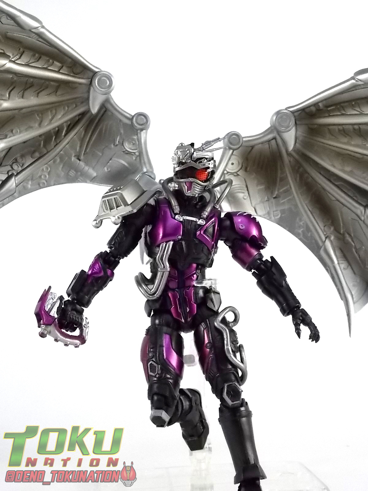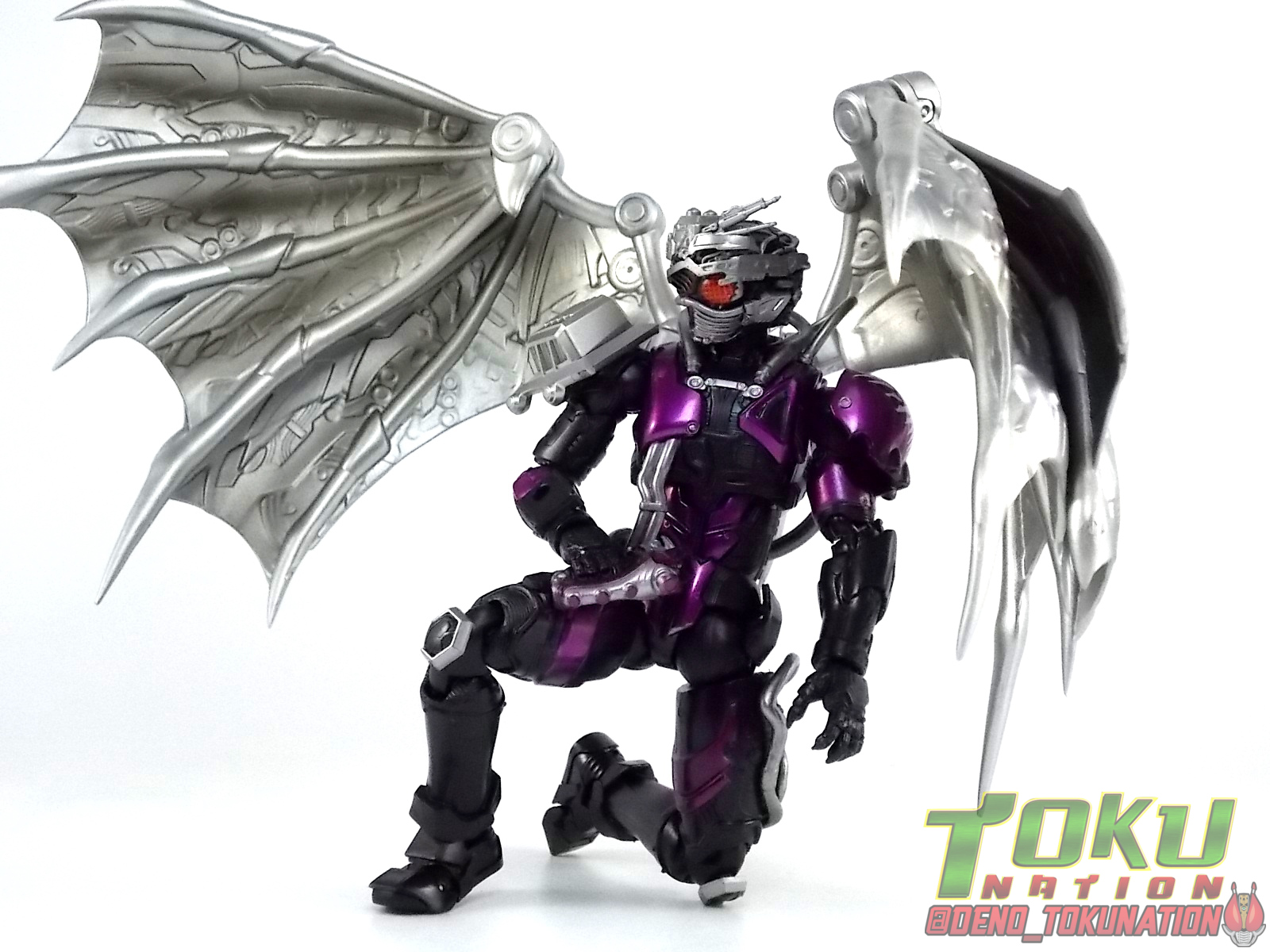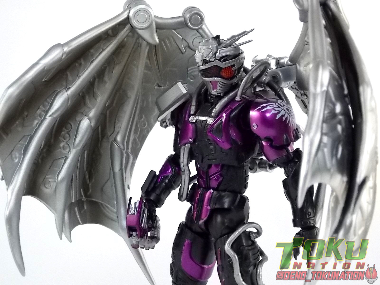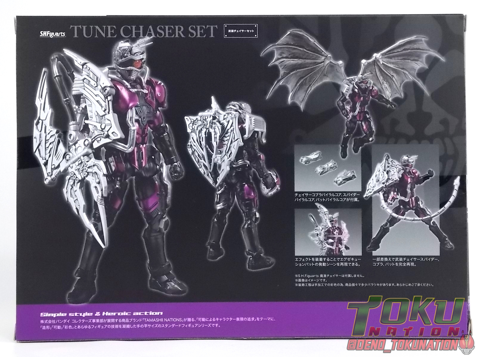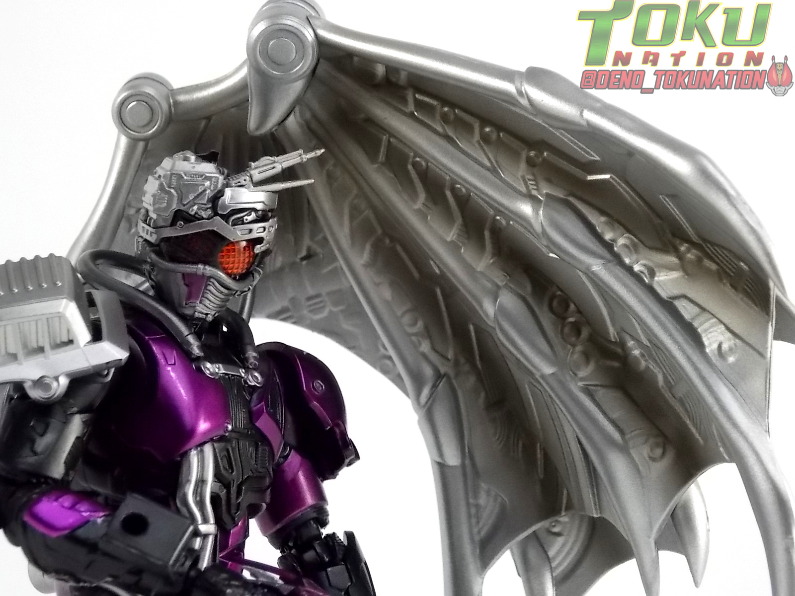 Everyone recalls the awesome abilities of our favorite Rider turned Roidmude hit man turned back to Rider right? Well sadly when S.H. Figuarts Mashin Chaser was released we of course discovered that many of his trademark weapons and accessories were not included. Or rather they simply couldn't be. Frankly it would have been too much for a standard retail release. (As clearly evidenced by this sets price) Well lucky for us Bandai finally saw fit to rectify that situation so today's gallery features the amazing S.H. Figuarts Busou Chaser accessory set! Seeing as this is an accessory set the review will be a bit more brisk. We'll simply focus on each piece individually and how they interact together as well as with Mashin Chaser. Packaging Nothing unusual here! Just a larger wider version of the Kamen Rider Drive theme of box. This one of course is so much larger in to accomodate the rather large wings included in the set. Everything's packed in one gigantic tray so be very careful when you open this set. There are several incredibly tiny pieces that could quite easily be lost when you pry apart the plastic trays. Parts Breakdown As I said above the entire point of this set is for it to interact with your S.H. Figuarts Mashin Chaser. Everything here is designed to interchange with each other to appropriately recreate the various special techniques and weapons made available to Chase by way of his Chaser Viral Cores. So let's start there. Viral Cores: You get one each of the Spider, Cobra, & Bat Viral Cores. Incredibly tiny these are at the exact same scale as Shift Cars & Signal Bikes. Accurately they're just painted in a dull silver but each has some incredible unique sculpting for something at this scale. Each can peg onto Chaser's Break Gunner by removing the guard on top first. Each corresponds to another mode for his Circular Dynamics back mounted weapons pack. To begin building the Circular Dyamics in it's standard backpack formation remove the plug from Chaser back revealing a post which you can plug the small notched gray part included with the set on. Then as pictured take the small tube and combine it with the main body of the Circular. Plug this onto Chaser's back to form the base of the assembly. Next take the weapon portion, the actual E-Circular, and plug the small version of the Tail Whipper onto it. This piece is purely aesthetic, it fills out a kind of symmetry on the opposite side of the circular playing off the tube on the other. A more realistic Tail Whipper is also included which we'll get to below. Plug this assembly onto the backpack and fold it up against Chaser's body. This creates the standard look of the pack. From the side it looks rather odd but straight on it gives Mashin Chaser some much needed bulk. And it succeeds in making him look just a bit more intimidating Now to create the first weapon, the Fang Spidey. Remove everything except the basic back plug and disassemble it. The main Circular Dynamics has a secondary groove in it that will allow you to plug it back on and let it face outward to the right arm. Now instead of the original tube used to accent the circular a larger bendable rubber one is used. This one will attach to the E-Circular itself and give it the free range of motion it needs for posing. Now wait! In order to actually use any of of these new weapons you need to use another part included in the set, the alternate forearm! Surprisingly Mashin Chasers arm can removed very easily and replaced with this one. Which is necessary because of the flat outer surface it features with a port meant to allow the E-Circular to sit flush with the arm. The look in this mode is pretty fierce. While I can't say it's perfect, the range of motion isn't hindered nearly as badly as you might think. The entire assembly can get in it's own way from time to time but all just looks badass. And the E-Circular itself is just ridiculously detailed. Just superb. To create the full Tail Whipper you just need to remove the small plug like port (which we use below) from underneath the pincers. It slides right out and allows you to plug in the larger and more accurate Tail Whipper, NOT the piece we used used for show on the backpack. This new whip has a semi-rigid wire running through it and all the components float freely around it. Allowing you to the have a fully posable and pretty firm whip for action poses. In order to utilize the final mode for the arm you can need to unplug the Tail Whipper and put the original port back in. Now we use the included Wing Sniper Effect Part to simulate a powerful attack. It's honestly not too spectacular but it gets the point across. Last but far from least is the most impressive and ambitious accessory in the entire Busou Chaser set, the Wing Sniper Wings! This huge and beautiful set of wings is just everything you could possibly want. The wings are each split into 2 large sections that can move independently of one another while each of half of the wing set is also independent allowing you create some great flight poses. When in use the other parts of this set are almost entirely taken out of play. You just need to get back down to the original Circular Dynamics parts without the weapons attached. Now remove the small pincer from the Circular and snap it into a similar groove on the back side of the wings. This gives the impression that the wings you have now transformed from the wings on the arm weapon. It's a brilliant way to simulate something that's impossible for this toy to replicate. However here's my one gripe with this entire accessory set. These hefty wings are now plugged into the the small plug on the upper back piece of the circular. This would be fine if the entire backpack could withstand the weight. I don't know if it's just mine or what but even though Mashin Chaser himself can balance with the wings on, perfectly I might add, the entire thing likes to come unplugged from his back. And plugging the wings themselves in