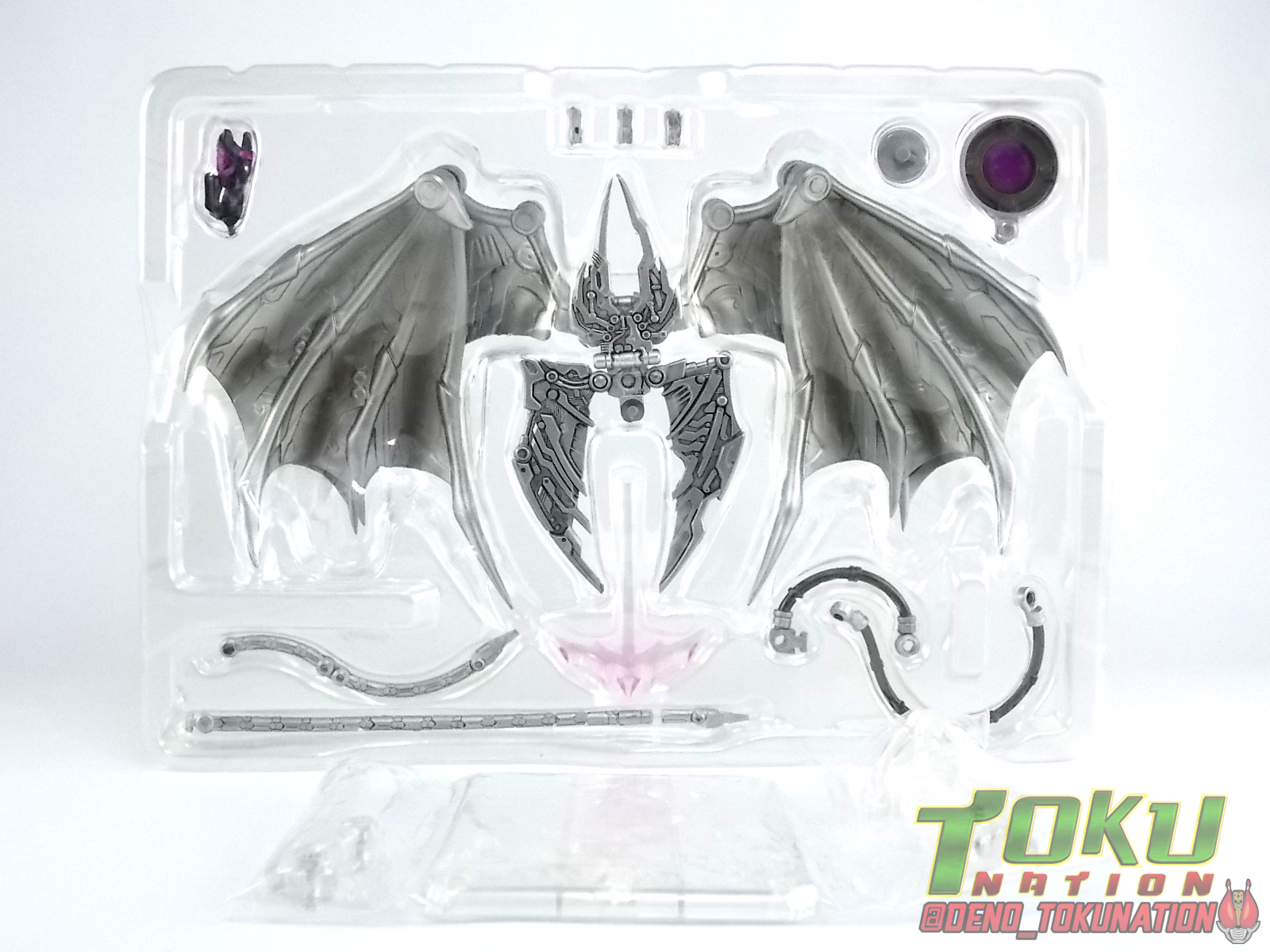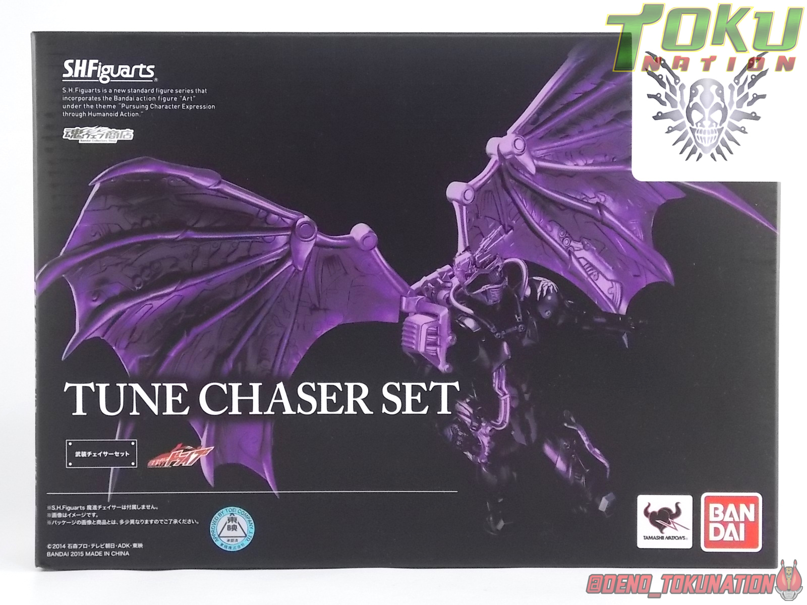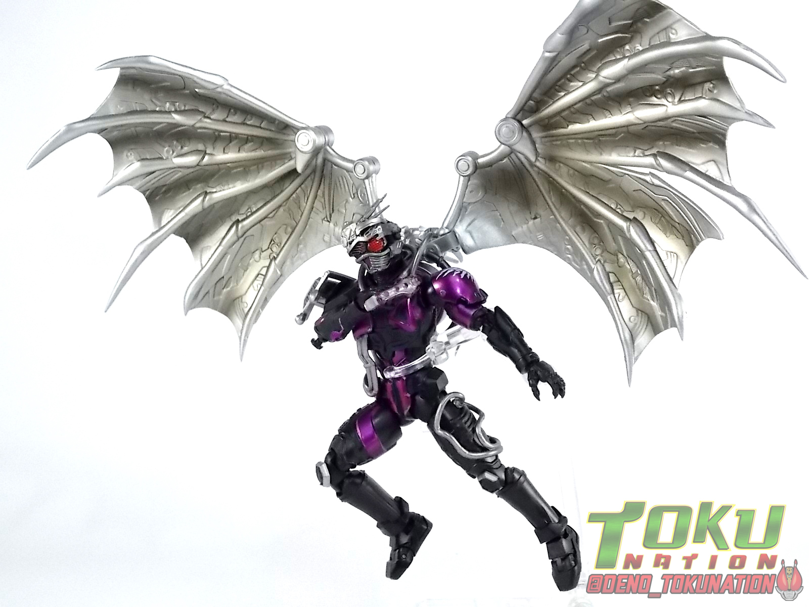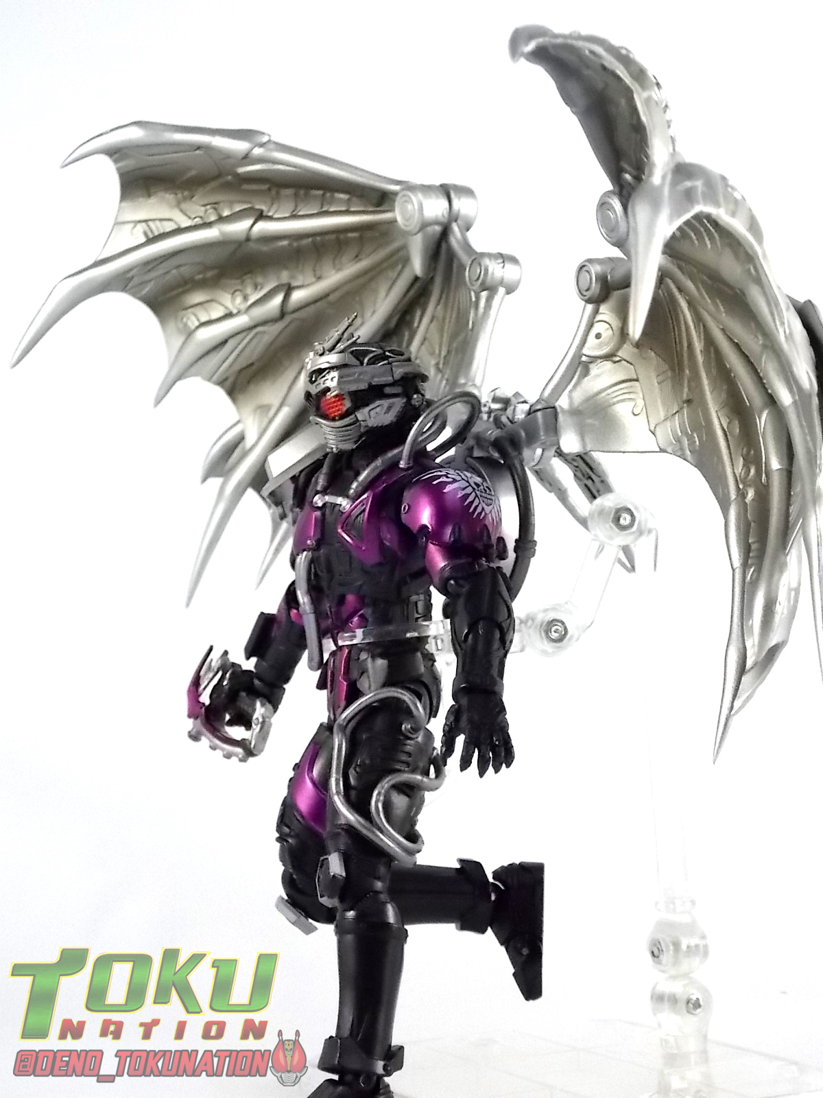 Everyone recalls the awesome abilities of our favorite Rider turned Roidmude hit man turned back to Rider right? Well sadly when S.H. Figuarts Mashin Chaser was released we of course discovered that many of his trademark weapons and accessories were not included. Or rather they simply couldn't be. Frankly it would have been too much for a standard retail release. (As clearly evidenced by this sets price) Well lucky for us Bandai finally saw fit to rectify that situation so today's gallery features the amazing S.H. Figuarts Busou Chaser accessory set! Seeing as this is an accessory set the review will be a bit more brisk. We'll simply focus on each piece individually and how they interact together as well as with Mashin Chaser. Packaging Nothing unusual here! Just a larger wider version of the Kamen Rider Drive theme of box. This one of course is so much larger in to accomodate the rather large wings included in the set. Everything's packed in one gigantic tray so be very careful when you open this set. There are several incredibly tiny pieces that could quite easily be lost when you pry apart the plastic trays. Parts Breakdown As I said above the entire point of this set is for it to interact with your S.H. Figuarts Mashin Chaser. Everything here is designed to interchange with each other to appropriately recreate the various special techniques and weapons made available to Chase by way of his Chaser Viral Cores. So let's start there. Viral Cores: You get one each of the Spider, Cobra, & Bat Viral Cores. Incredibly tiny these are at the exact same scale as Shift Cars & Signal Bikes. Accurately they're just painted in a dull silver but each has some incredible unique sculpting for something at this scale. Each can peg onto Chaser's Break Gunner by removing the guard on top first. Each corresponds to another mode for his Circular Dynamics back mounted weapons pack. To begin building the Circular Dyamics in it's standard backpack formation remove the plug from Chaser back revealing a post which you can plug the small notched gray part included with the set on. Then as pictured take the small tube and combine it with the main body of the Circular. Plug this onto Chaser's back to form the base of the assembly. Next take the weapon portion, the actual E-Circular, and plug the small version of the Tail Whipper onto it. This piece is purely aesthetic, it fills out a kind of symmetry on the opposite side of the circular playing off the tube on the other. A more realistic Tail Whipper is also included which we'll get to below. Plug this assembly onto the backpack and fold it up against Chaser's body. This creates the standard look of the pack. From the side it looks rather odd but straight on it gives Mashin Chaser some much needed bulk. And it succeeds in making him look just a bit more intimidating Now to create the first weapon, the Fang Spidey. Remove everything except the basic back plug and disassemble it. The main Circular Dynamics has a secondary groove in it that will allow you to plug it back on and let it face outward to the right arm. Now instead of the original tube used to accent the circular a larger bendable rubber one is used. This one will attach to the E-Circular itself and give it the free range of motion it needs for posing. Now wait! In order to actually use any of of these new weapons you need to use another part included in the set, the alternate forearm! Surprisingly Mashin Chasers arm can removed very easily and replaced with this one. Which is necessary because of the flat outer surface it features with a port meant to allow the E-Circular to sit flush with the arm. The look in this mode is pretty fierce. While I can't say it's perfect, the range of motion isn't hindered nearly as badly as you might think. The entire assembly can get in it's own way from time to time but all just looks badass. And the E-Circular itself is just ridiculously detailed. Just superb. To create the full Tail Whipper you just need to remove the small plug like port (which we use below) from underneath the pincers. It slides right out and allows you to plug in the larger and more accurate Tail Whipper, NOT the piece we used used for show on the backpack. This new whip has a semi-rigid wire running through it and all the components float freely around it. Allowing you to the have a fully posable and pretty firm whip for action poses. In order to utilize the final mode for the arm you can need to unplug the Tail Whipper and put the original port back in. Now we use the included Wing Sniper Effect Part to simulate a powerful attack. It's honestly not too spectacular but it gets the point across. Last but far from least is the most impressive and ambitious accessory in the entire Busou Chaser set, the Wing Sniper Wings! This huge and beautiful set of wings is just everything you could possibly want. The wings are each split into 2 large sections that can move independently of one another while each of half of the wing set is also independent allowing you create some great flight poses. When in use the other parts of this set are almost entirely taken out of play. You just need to get back down to the original Circular Dynamics parts without the weapons attached. Now remove the small pincer from the Circular and snap it into a similar groove on the back side of the wings. This gives the impression that the wings you have now transformed from the wings on the arm weapon. It's a brilliant way to simulate something that's impossible for this toy to replicate. However here's my one gripe with this entire accessory set. These hefty wings are now plugged into the the small plug on the upper back piece of the circular. This would be fine if the entire backpack could withstand the weight. I don't know if it's just mine or what but even though Mashin Chaser himself can balance with the wings on, perfectly I might add, the entire thing likes to come unplugged from his back. And plugging the wings themselves in