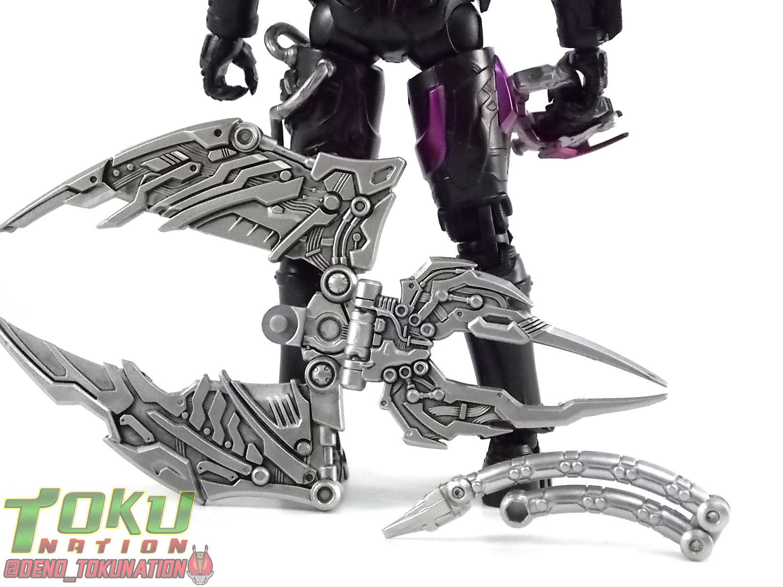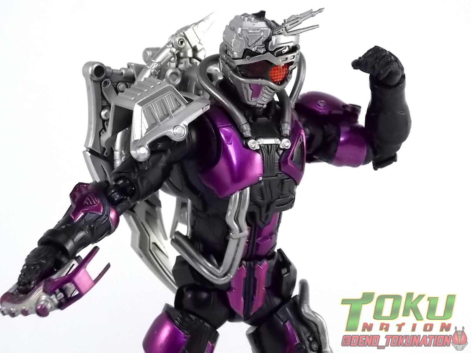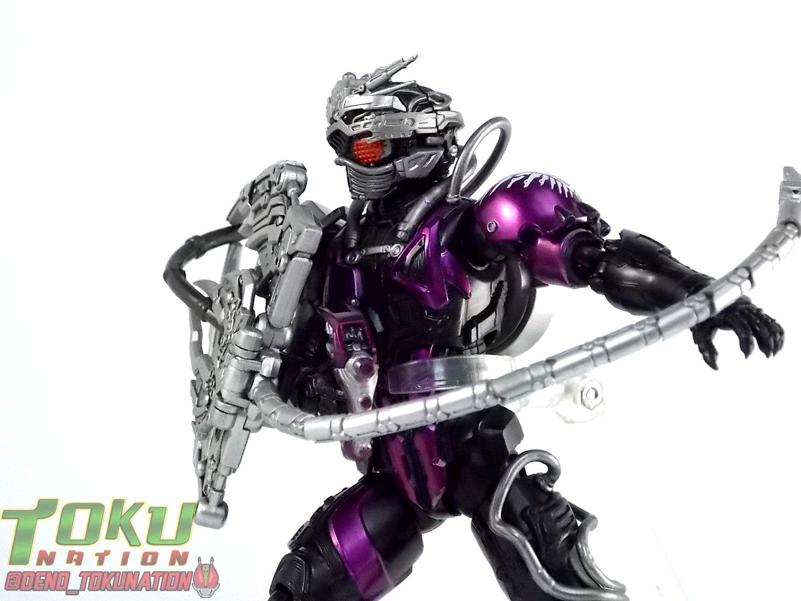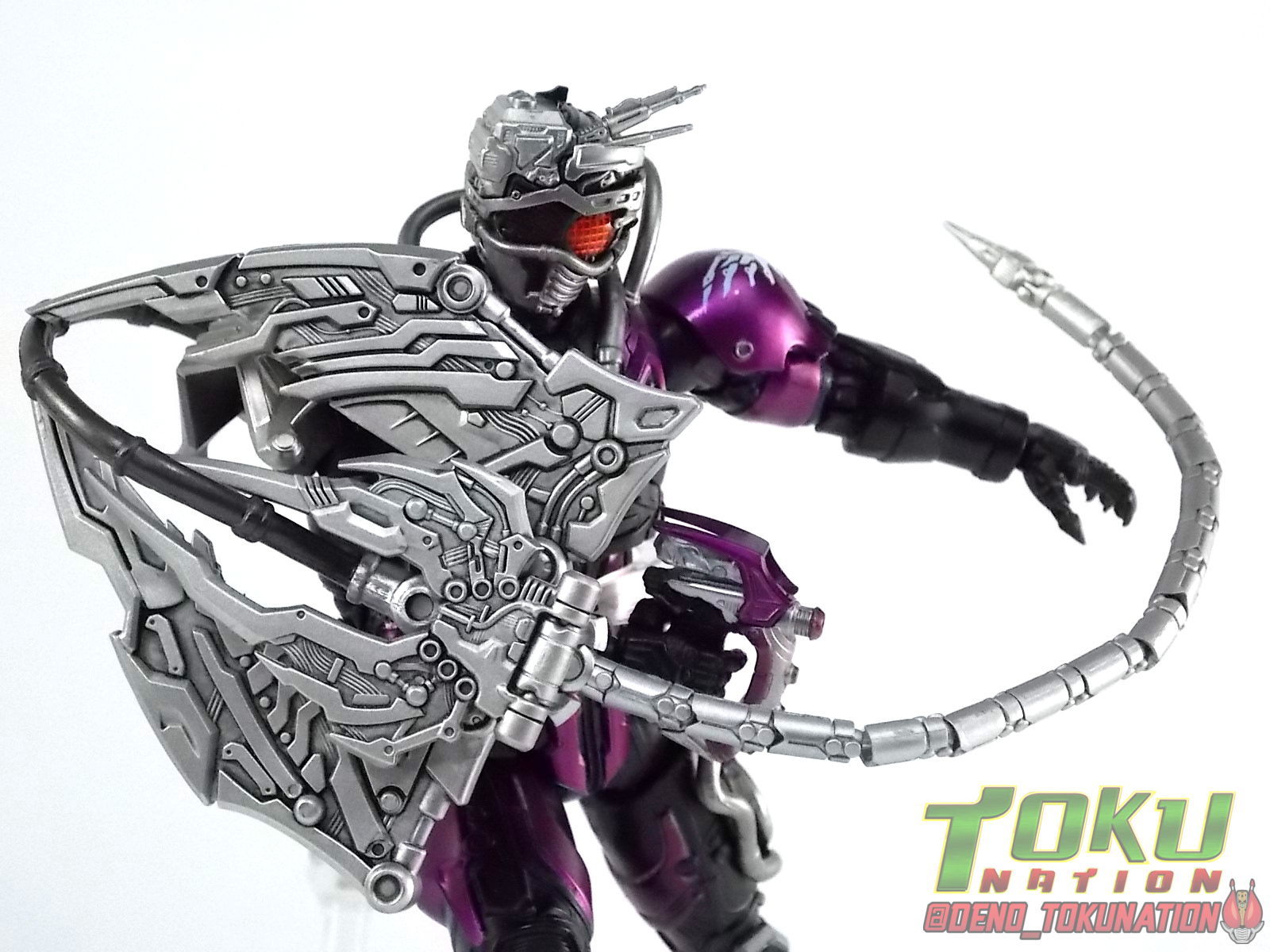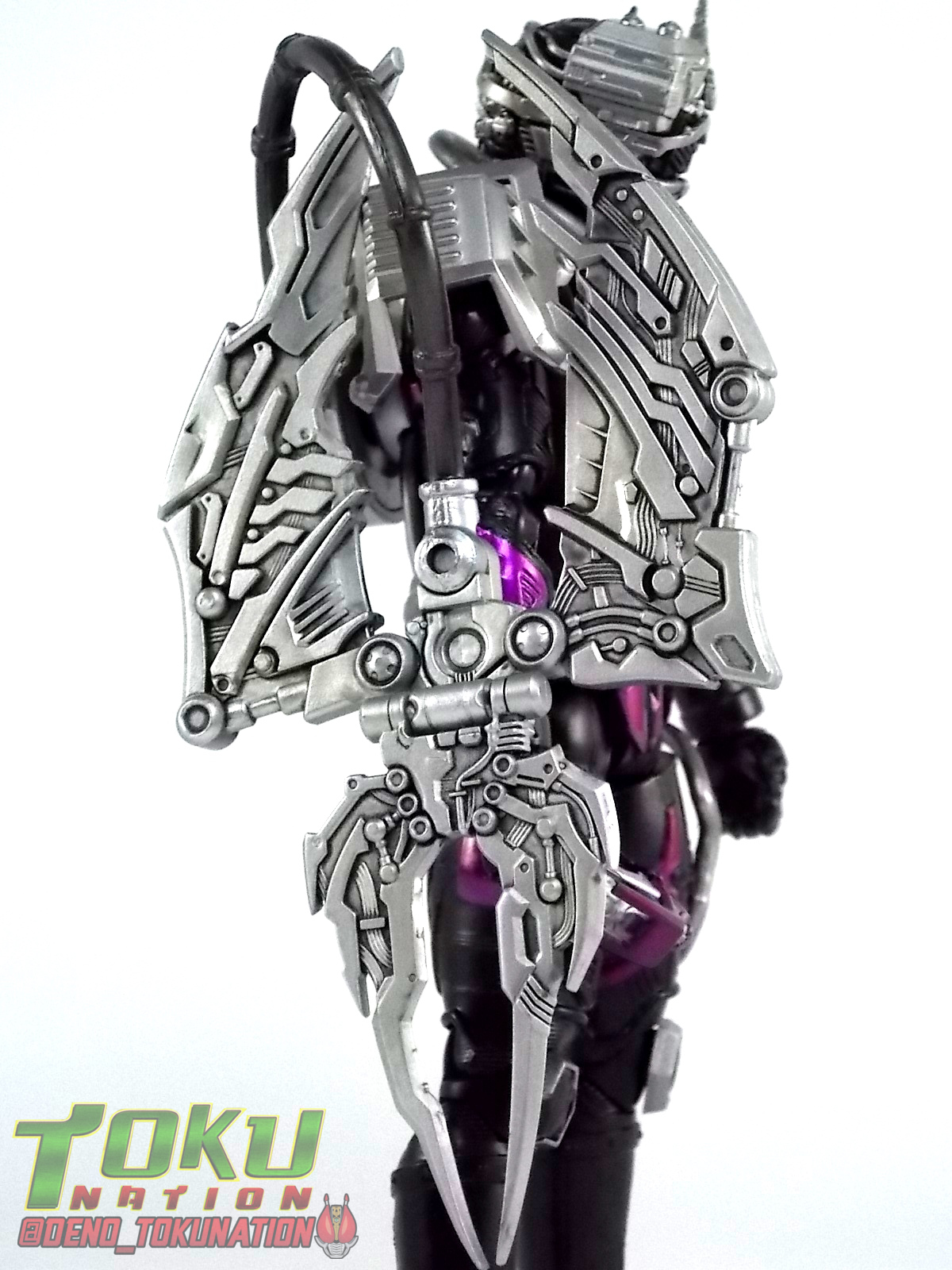 Everyone recalls the awesome abilities of our favorite Rider turned Roidmude hit man turned back to Rider right? Well sadly when S.H. Figuarts Mashin Chaser was released we of course discovered that many of his trademark weapons and accessories were not included. Or rather they simply couldn't be. Frankly it would have been too much for a standard retail release. (As clearly evidenced by this sets price) Well lucky for us Bandai finally saw fit to rectify that situation so today's gallery features the amazing S.H. Figuarts Busou Chaser accessory set! Seeing as this is an accessory set the review will be a bit more brisk. We'll simply focus on each piece individually and how they interact together as well as with Mashin Chaser. Packaging Nothing unusual here! Just a larger wider version of the Kamen Rider Drive theme of box. This one of course is so much larger in to accomodate the rather large wings included in the set. Everything's packed in one gigantic tray so be very careful when you open this set. There are several incredibly tiny pieces that could quite easily be lost when you pry apart the plastic trays. Parts Breakdown As I said above the entire point of this set is for it to interact with your S.H. Figuarts Mashin Chaser. Everything here is designed to interchange with each other to appropriately recreate the various special techniques and weapons made available to Chase by way of his Chaser Viral Cores. So let's start there. Viral Cores: You get one each of the Spider, Cobra, & Bat Viral Cores. Incredibly tiny these are at the exact same scale as Shift Cars & Signal Bikes. Accurately they're just painted in a dull silver but each has some incredible unique sculpting for something at this scale. Each can peg onto Chaser's Break Gunner by removing the guard on top first. Each corresponds to another mode for his Circular Dynamics back mounted weapons pack. To begin building the Circular Dyamics in it's standard backpack formation remove the plug from Chaser back revealing a post which you can plug the small notched gray part included with the set on. Then as pictured take the small tube and combine it with the main body of the Circular. Plug this onto Chaser's back to form the base of the assembly. Next take the weapon portion, the actual E-Circular, and plug the small version of the Tail Whipper onto it. This piece is purely aesthetic, it fills out a kind of symmetry on the opposite side of the circular playing off the tube on the other. A more realistic Tail Whipper is also included which we'll get to below. Plug this assembly onto the backpack and fold it up against Chaser's body. This creates the standard look of the pack. From the side it looks rather odd but straight on it gives Mashin Chaser some much needed bulk. And it succeeds in making him look just a bit more intimidating Now to create the first weapon, the Fang Spidey. Remove everything except the basic back plug and disassemble it. The main Circular Dynamics has a secondary groove in it that will allow you to plug it back on and let it face outward to the right arm. Now instead of the original tube used to accent the circular a larger bendable rubber one is used. This one will attach to the E-Circular itself and give it the free range of motion it needs for posing. Now wait! In order to actually use any of of these new weapons you need to use another part included in the set, the alternate forearm! Surprisingly Mashin Chasers arm can removed very easily and replaced with this one. Which is necessary because of the flat outer surface it features with a port meant to allow the E-Circular to sit flush with the arm. The look in this mode is pretty fierce. While I can't say it's perfect, the range of motion isn't hindered nearly as badly as you might think. The entire assembly can get in it's own way from time to time but all just looks badass. And the E-Circular itself is just ridiculously detailed. Just superb. To create the full Tail Whipper you just need to remove the small plug like port (which we use below) from underneath the pincers. It slides right out and allows you to plug in the larger and more accurate Tail Whipper, NOT the piece we used used for show on the backpack. This new whip has a semi-rigid wire running through it and all the components float freely around it. Allowing you to the have a fully posable and pretty firm whip for action poses. In order to utilize the final mode for the arm you can need to unplug the Tail Whipper and put the original port back in. Now we use the included Wing Sniper Effect Part to simulate a powerful attack. It's honestly not too spectacular but it gets the point across. Last but far from least is the most impressive and ambitious accessory in the entire Busou Chaser set, the Wing Sniper Wings! This huge and beautiful set of wings is just everything you could possibly want. The wings are each split into 2 large sections that can move independently of one another while each of half of the wing set is also independent allowing you create some great flight poses. When in use the other parts of this set are almost entirely taken out of play. You just need to get back down to the original Circular Dynamics parts without the weapons attached. Now remove the small pincer from the Circular and snap it into a similar groove on the back side of the wings. This gives the impression that the wings you have now transformed from the wings on the arm weapon. It's a brilliant way to simulate something that's impossible for this toy to replicate. However here's my one gripe with this entire accessory set. These hefty wings are now plugged into the the small plug on the upper back piece of the circular. This would be fine if the entire backpack could withstand the weight. I don't know if it's just mine or what but even though Mashin Chaser himself can balance with the wings on, perfectly I might add, the entire thing likes to come unplugged from his back. And plugging the wings themselves in