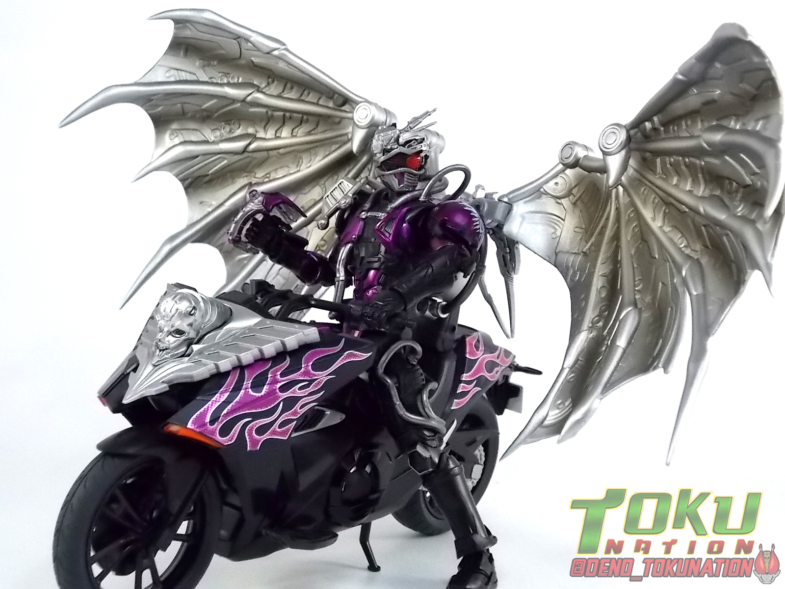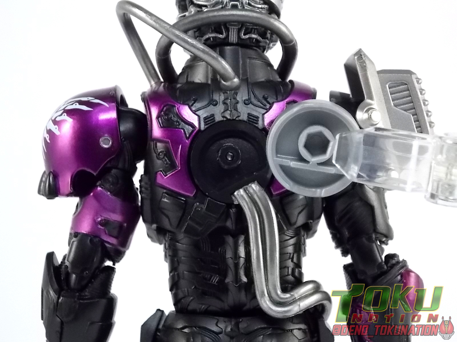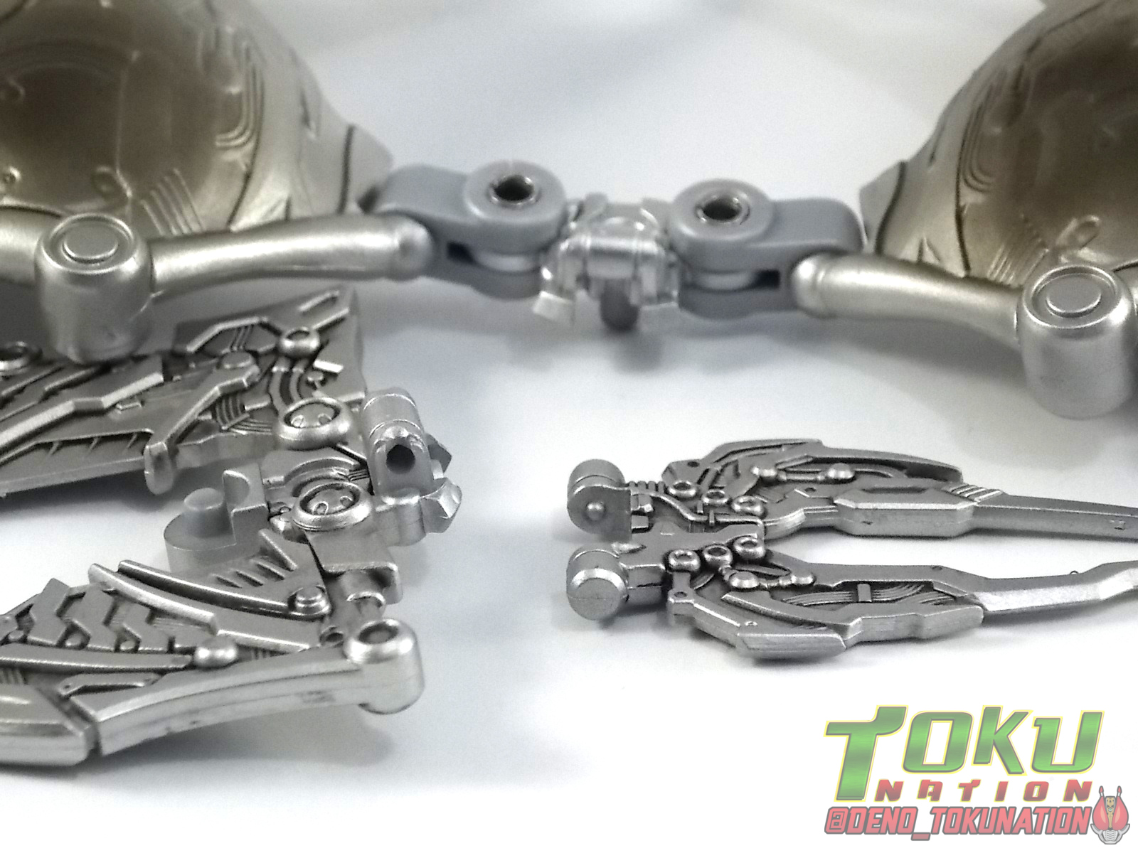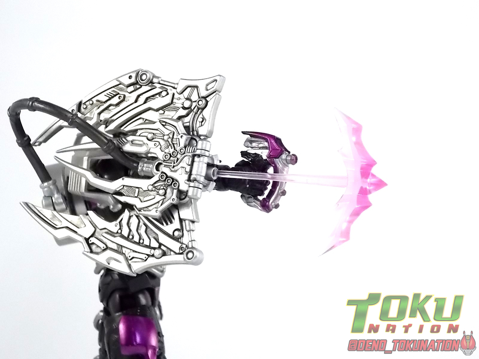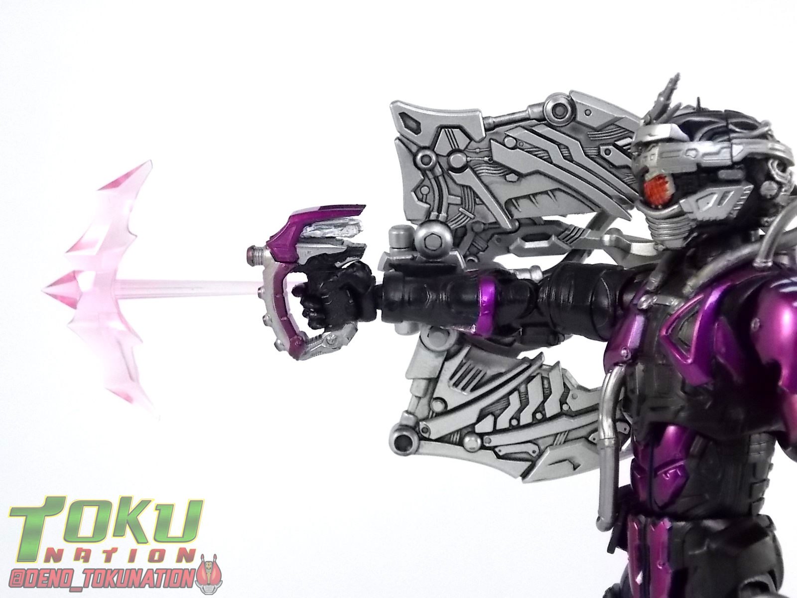 Everyone recalls the awesome abilities of our favorite Rider turned Roidmude hit man turned back to Rider right? Well sadly when S.H. Figuarts Mashin Chaser was released we of course discovered that many of his trademark weapons and accessories were not included. Or rather they simply couldn't be. Frankly it would have been too much for a standard retail release. (As clearly evidenced by this sets price) Well lucky for us Bandai finally saw fit to rectify that situation so today's gallery features the amazing S.H. Figuarts Busou Chaser accessory set! Seeing as this is an accessory set the review will be a bit more brisk. We'll simply focus on each piece individually and how they interact together as well as with Mashin Chaser. Packaging Nothing unusual here! Just a larger wider version of the Kamen Rider Drive theme of box. This one of course is so much larger in to accomodate the rather large wings included in the set. Everything's packed in one gigantic tray so be very careful when you open this set. There are several incredibly tiny pieces that could quite easily be lost when you pry apart the plastic trays. Parts Breakdown As I said above the entire point of this set is for it to interact with your S.H. Figuarts Mashin Chaser. Everything here is designed to interchange with each other to appropriately recreate the various special techniques and weapons made available to Chase by way of his Chaser Viral Cores. So let's start there. Viral Cores: You get one each of the Spider, Cobra, & Bat Viral Cores. Incredibly tiny these are at the exact same scale as Shift Cars & Signal Bikes. Accurately they're just painted in a dull silver but each has some incredible unique sculpting for something at this scale. Each can peg onto Chaser's Break Gunner by removing the guard on top first. Each corresponds to another mode for his Circular Dynamics back mounted weapons pack. To begin building the Circular Dyamics in it's standard backpack formation remove the plug from Chaser back revealing a post which you can plug the small notched gray part included with the set on. Then as pictured take the small tube and combine it with the main body of the Circular. Plug this onto Chaser's back to form the base of the assembly. Next take the weapon portion, the actual E-Circular, and plug the small version of the Tail Whipper onto it. This piece is purely aesthetic, it fills out a kind of symmetry on the opposite side of the circular playing off the tube on the other. A more realistic Tail Whipper is also included which we'll get to below. Plug this assembly onto the backpack and fold it up against Chaser's body. This creates the standard look of the pack. From the side it looks rather odd but straight on it gives Mashin Chaser some much needed bulk. And it succeeds in making him look just a bit more intimidating Now to create the first weapon, the Fang Spidey. Remove everything except the basic back plug and disassemble it. The main Circular Dynamics has a secondary groove in it that will allow you to plug it back on and let it face outward to the right arm. Now instead of the original tube used to accent the circular a larger bendable rubber one is used. This one will attach to the E-Circular itself and give it the free range of motion it needs for posing. Now wait! In order to actually use any of of these new weapons you need to use another part included in the set, the alternate forearm! Surprisingly Mashin Chasers arm can removed very easily and replaced with this one. Which is necessary because of the flat outer surface it features with a port meant to allow the E-Circular to sit flush with the arm. The look in this mode is pretty fierce. While I can't say it's perfect, the range of motion isn't hindered nearly as badly as you might think. The entire assembly can get in it's own way from time to time but all just looks badass. And the E-Circular itself is just ridiculously detailed. Just superb. To create the full Tail Whipper you just need to remove the small plug like port (which we use below) from underneath the pincers. It slides right out and allows you to plug in the larger and more accurate Tail Whipper, NOT the piece we used used for show on the backpack. This new whip has a semi-rigid wire running through it and all the components float freely around it. Allowing you to the have a fully posable and pretty firm whip for action poses. In order to utilize the final mode for the arm you can need to unplug the Tail Whipper and put the original port back in. Now we use the included Wing Sniper Effect Part to simulate a powerful attack. It's honestly not too spectacular but it gets the point across. Last but far from least is the most impressive and ambitious accessory in the entire Busou Chaser set, the Wing Sniper Wings! This huge and beautiful set of wings is just everything you could possibly want. The wings are each split into 2 large sections that can move independently of one another while each of half of the wing set is also independent allowing you create some great flight poses. When in use the other parts of this set are almost entirely taken out of play. You just need to get back down to the original Circular Dynamics parts without the weapons attached. Now remove the small pincer from the Circular and snap it into a similar groove on the back side of the wings. This gives the impression that the wings you have now transformed from the wings on the arm weapon. It's a brilliant way to simulate something that's impossible for this toy to replicate. However here's my one gripe with this entire accessory set. These hefty wings are now plugged into the the small plug on the upper back piece of the circular. This would be fine if the entire backpack could withstand the weight. I don't know if it's just mine or what but even though Mashin Chaser himself can balance with the wings on, perfectly I might add, the entire thing likes to come unplugged from his back. And plugging the wings themselves in