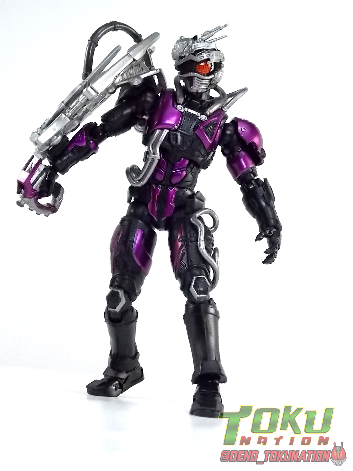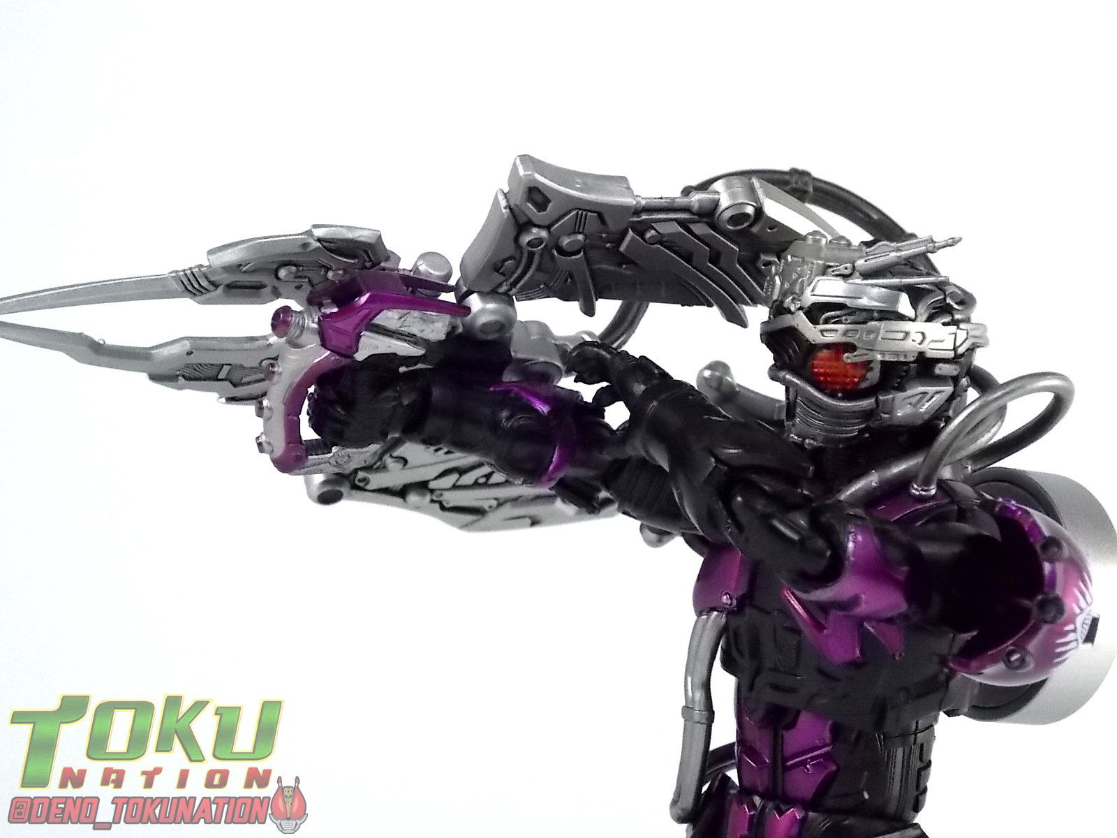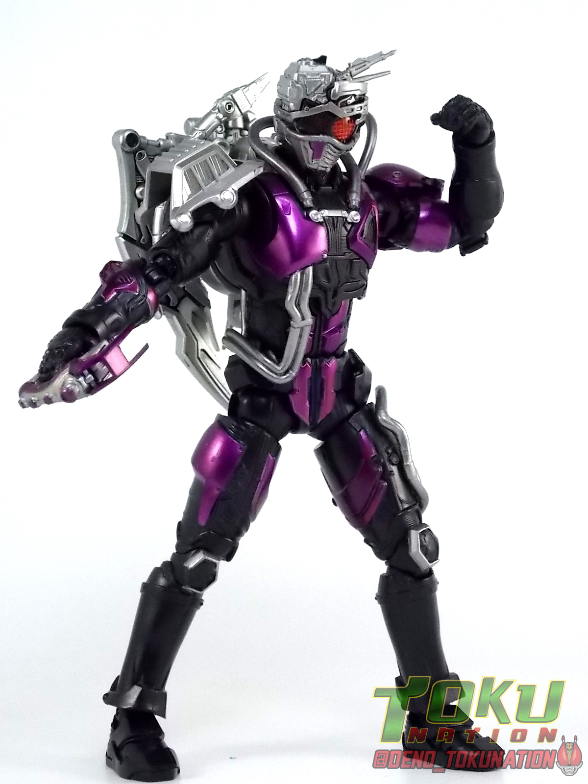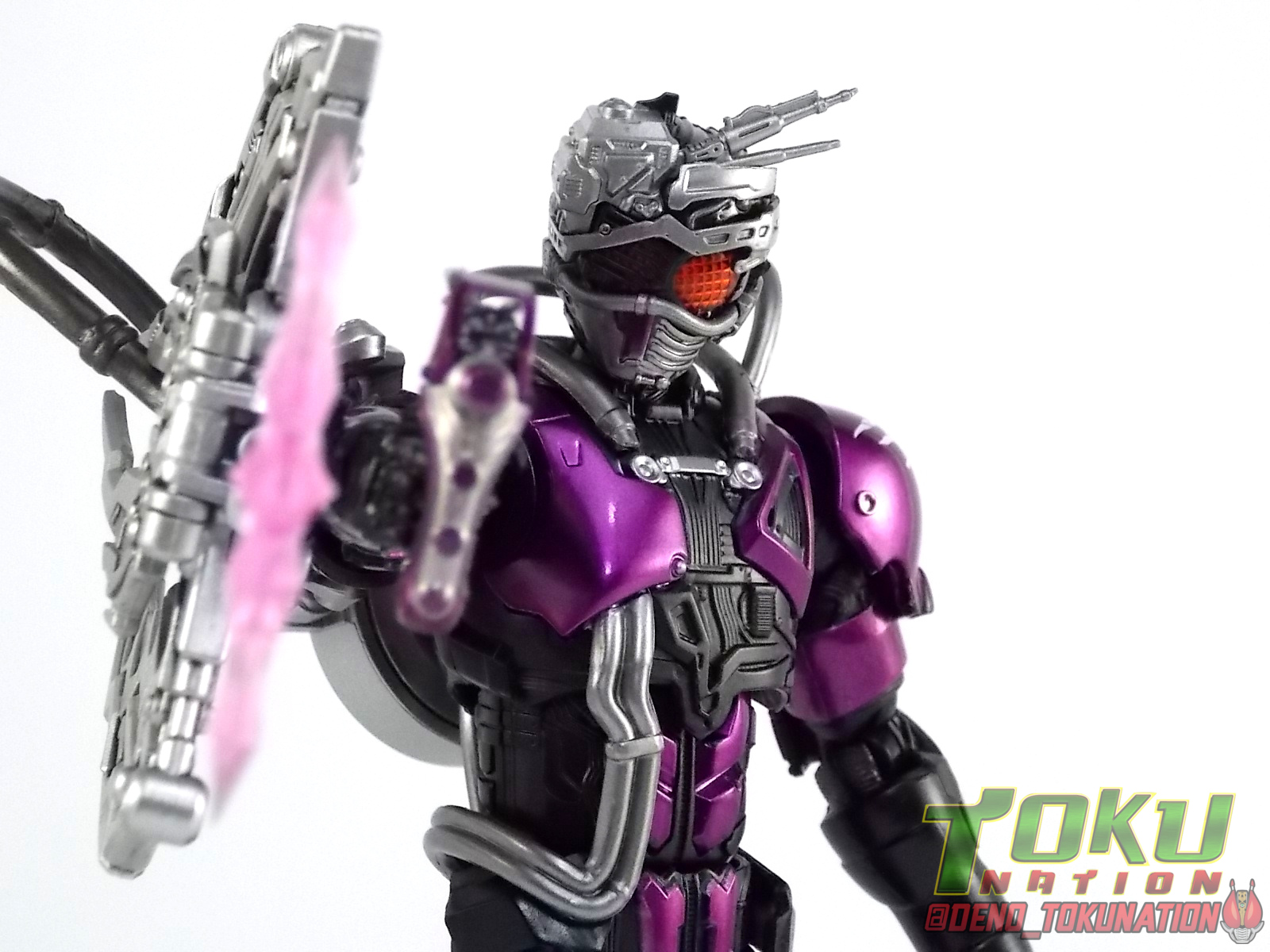 Everyone recalls the awesome abilities of our favorite Rider turned Roidmude hit man turned back to Rider right? Well sadly when S.H. Figuarts Mashin Chaser was released we of course discovered that many of his trademark weapons and accessories were not included. Or rather they simply couldn't be. Frankly it would have been too much for a standard retail release. (As clearly evidenced by this sets price) Well lucky for us Bandai finally saw fit to rectify that situation so today's gallery features the amazing S.H. Figuarts Busou Chaser accessory set! Seeing as this is an accessory set the review will be a bit more brisk. We'll simply focus on each piece individually and how they interact together as well as with Mashin Chaser. Packaging Nothing unusual here! Just a larger wider version of the Kamen Rider Drive theme of box. This one of course is so much larger in to accomodate the rather large wings included in the set. Everything's packed in one gigantic tray so be very careful when you open this set. There are several incredibly tiny pieces that could quite easily be lost when you pry apart the plastic trays. Parts Breakdown As I said above the entire point of this set is for it to interact with your S.H. Figuarts Mashin Chaser. Everything here is designed to interchange with each other to appropriately recreate the various special techniques and weapons made available to Chase by way of his Chaser Viral Cores. So let's start there. Viral Cores: You get one each of the Spider, Cobra, & Bat Viral Cores. Incredibly tiny these are at the exact same scale as Shift Cars & Signal Bikes. Accurately they're just painted in a dull silver but each has some incredible unique sculpting for something at this scale. Each can peg onto Chaser's Break Gunner by removing the guard on top first. Each corresponds to another mode for his Circular Dynamics back mounted weapons pack. To begin building the Circular Dyamics in it's standard backpack formation remove the plug from Chaser back revealing a post which you can plug the small notched gray part included with the set on. Then as pictured take the small tube and combine it with the main body of the Circular. Plug this onto Chaser's back to form the base of the assembly. Next take the weapon portion, the actual E-Circular, and plug the small version of the Tail Whipper onto it. This piece is purely aesthetic, it fills out a kind of symmetry on the opposite side of the circular playing off the tube on the other. A more realistic Tail Whipper is also included which we'll get to below. Plug this assembly onto the backpack and fold it up against Chaser's body. This creates the standard look of the pack. From the side it looks rather odd but straight on it gives Mashin Chaser some much needed bulk. And it succeeds in making him look just a bit more intimidating Now to create the first weapon, the Fang Spidey. Remove everything except the basic back plug and disassemble it. The main Circular Dynamics has a secondary groove in it that will allow you to plug it back on and let it face outward to the right arm. Now instead of the original tube used to accent the circular a larger bendable rubber one is used. This one will attach to the E-Circular itself and give it the free range of motion it needs for posing. Now wait! In order to actually use any of of these new weapons you need to use another part included in the set, the alternate forearm! Surprisingly Mashin Chasers arm can removed very easily and replaced with this one. Which is necessary because of the flat outer surface it features with a port meant to allow the E-Circular to sit flush with the arm. The look in this mode is pretty fierce. While I can't say it's perfect, the range of motion isn't hindered nearly as badly as you might think. The entire assembly can get in it's own way from time to time but all just looks badass. And the E-Circular itself is just ridiculously detailed. Just superb. To create the full Tail Whipper you just need to remove the small plug like port (which we use below) from underneath the pincers. It slides right out and allows you to plug in the larger and more accurate Tail Whipper, NOT the piece we used used for show on the backpack. This new whip has a semi-rigid wire running through it and all the components float freely around it. Allowing you to the have a fully posable and pretty firm whip for action poses. In order to utilize the final mode for the arm you can need to unplug the Tail Whipper and put the original port back in. Now we use the included Wing Sniper Effect Part to simulate a powerful attack. It's honestly not too spectacular but it gets the point across. Last but far from least is the most impressive and ambitious accessory in the entire Busou Chaser set, the Wing Sniper Wings! This huge and beautiful set of wings is just everything you could possibly want. The wings are each split into 2 large sections that can move independently of one another while each of half of the wing set is also independent allowing you create some great flight poses. When in use the other parts of this set are almost entirely taken out of play. You just need to get back down to the original Circular Dynamics parts without the weapons attached. Now remove the small pincer from the Circular and snap it into a similar groove on the back side of the wings. This gives the impression that the wings you have now transformed from the wings on the arm weapon. It's a brilliant way to simulate something that's impossible for this toy to replicate. However here's my one gripe with this entire accessory set. These hefty wings are now plugged into the the small plug on the upper back piece of the circular. This would be fine if the entire backpack could withstand the weight. I don't know if it's just mine or what but even though Mashin Chaser himself can balance with the wings on, perfectly I might add, the entire thing likes to come unplugged from his back. And plugging the wings themselves in