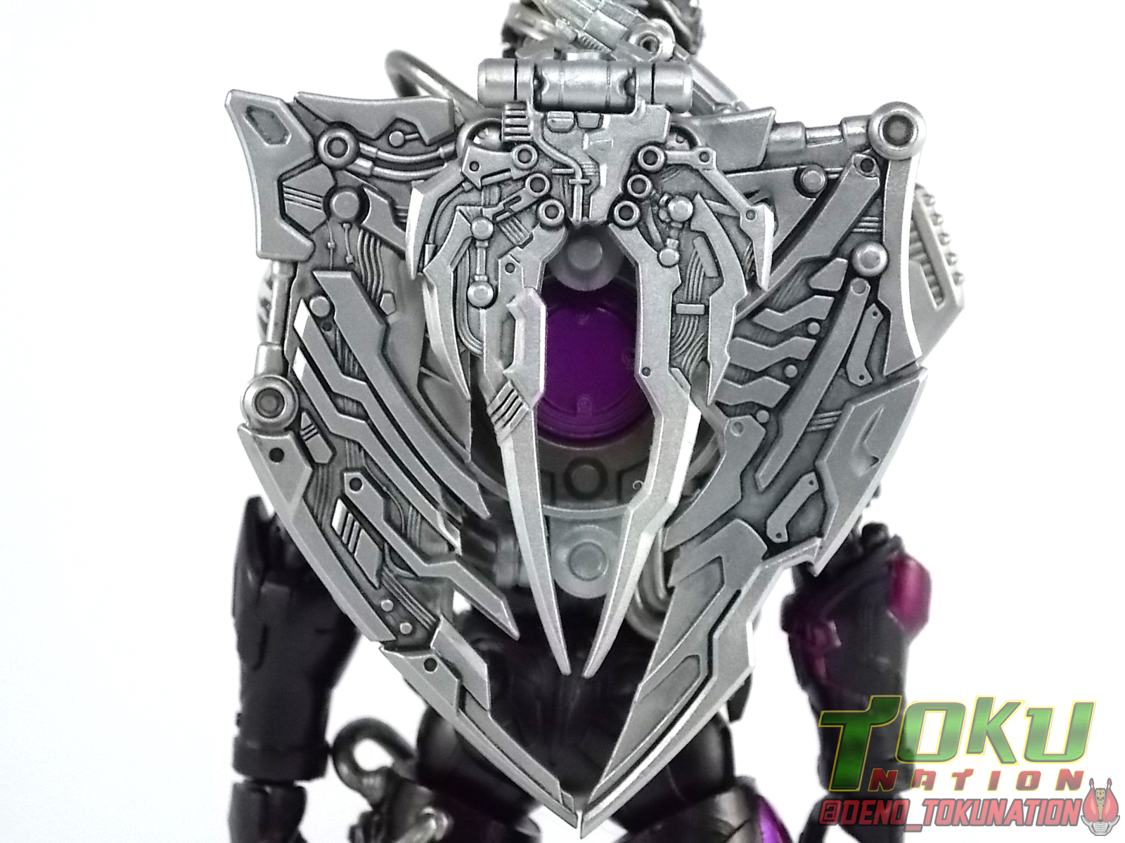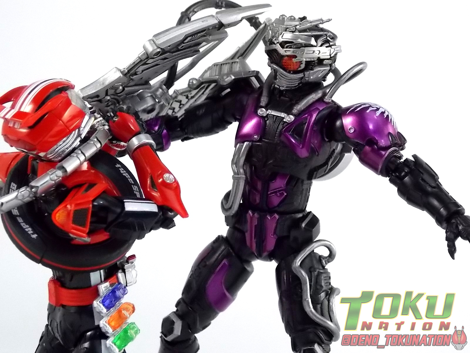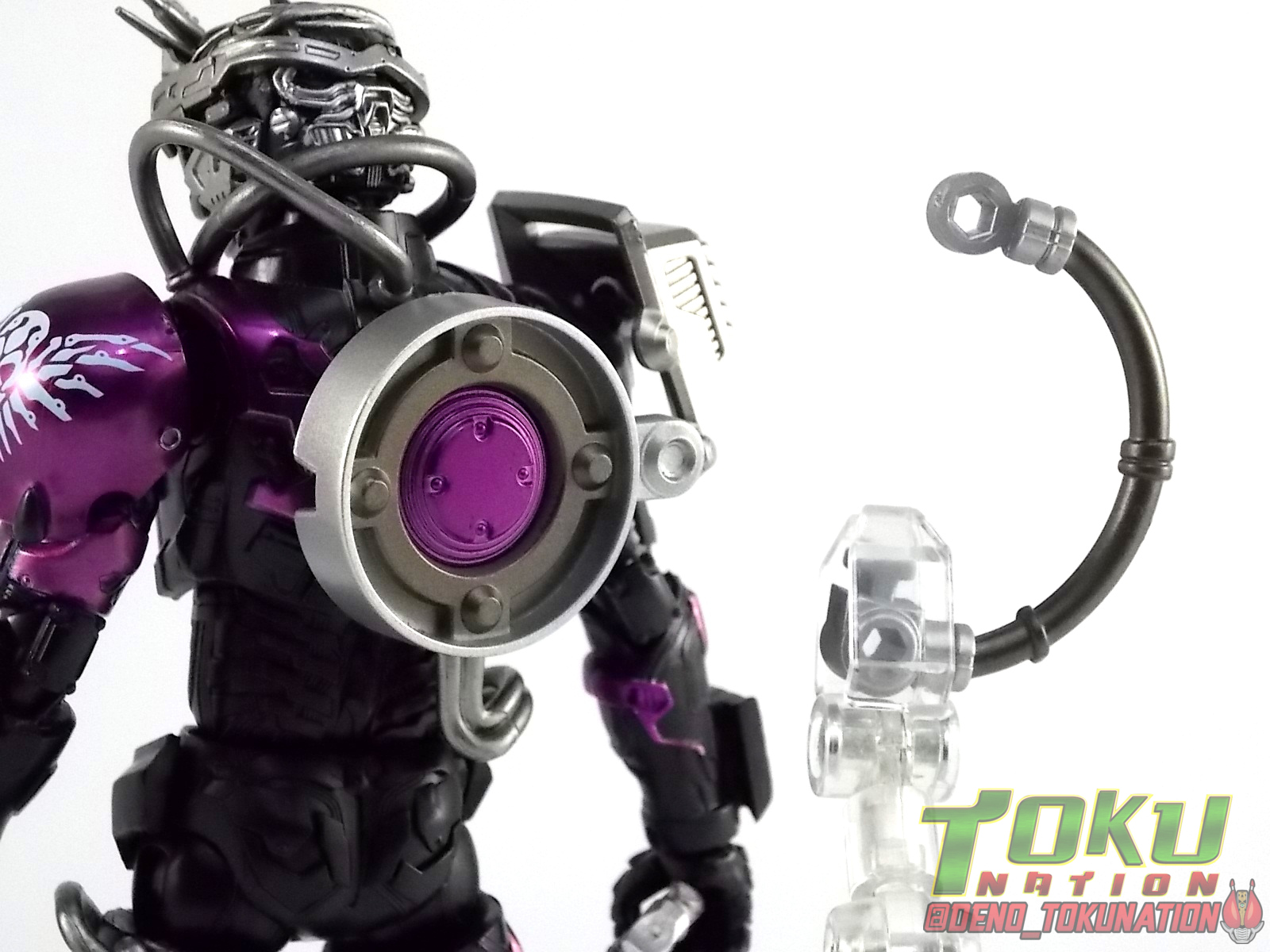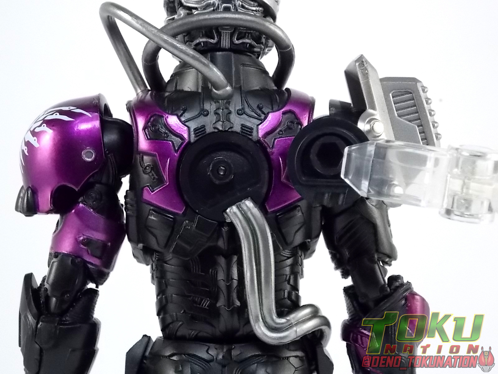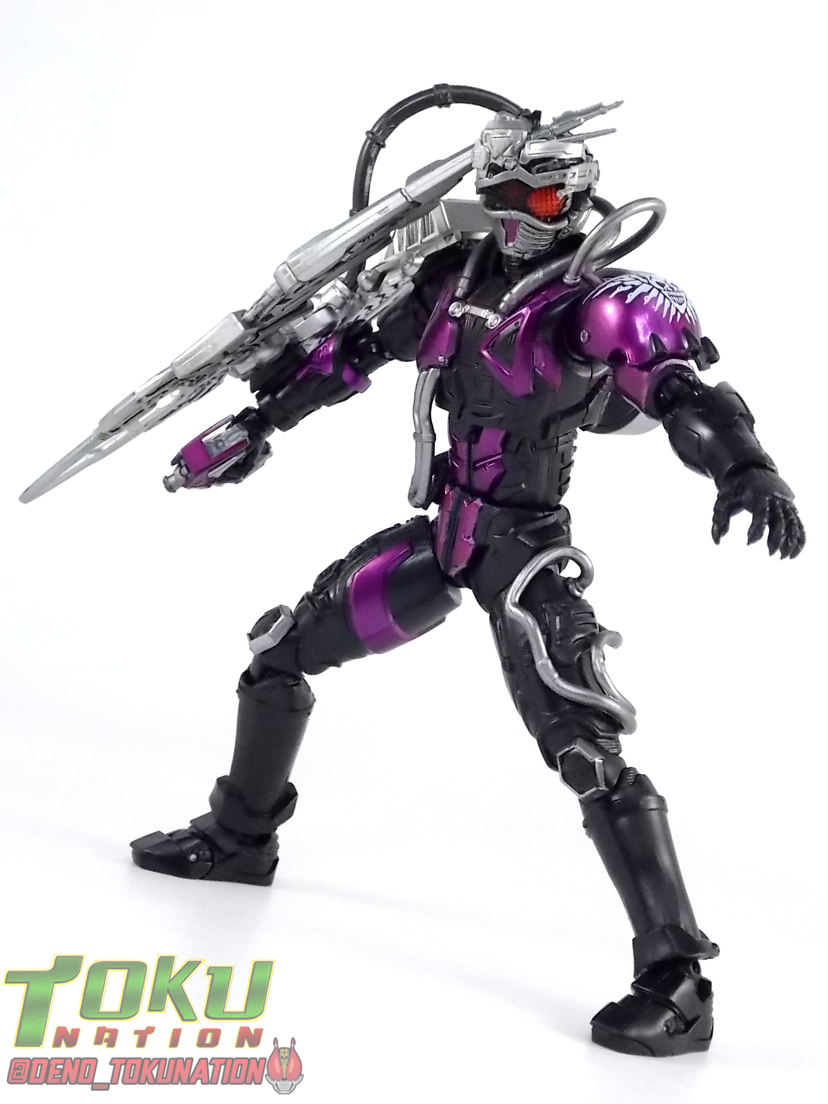 Everyone recalls the awesome abilities of our favorite Rider turned Roidmude hit man turned back to Rider right? Well sadly when S.H. Figuarts Mashin Chaser was released we of course discovered that many of his trademark weapons and accessories were not included. Or rather they simply couldn't be. Frankly it would have been too much for a standard retail release. (As clearly evidenced by this sets price) Well lucky for us Bandai finally saw fit to rectify that situation so today's gallery features the amazing S.H. Figuarts Busou Chaser accessory set! Seeing as this is an accessory set the review will be a bit more brisk. We'll simply focus on each piece individually and how they interact together as well as with Mashin Chaser. Packaging Nothing unusual here! Just a larger wider version of the Kamen Rider Drive theme of box. This one of course is so much larger in to accomodate the rather large wings included in the set. Everything's packed in one gigantic tray so be very careful when you open this set. There are several incredibly tiny pieces that could quite easily be lost when you pry apart the plastic trays. Parts Breakdown As I said above the entire point of this set is for it to interact with your S.H. Figuarts Mashin Chaser. Everything here is designed to interchange with each other to appropriately recreate the various special techniques and weapons made available to Chase by way of his Chaser Viral Cores. So let's start there. Viral Cores: You get one each of the Spider, Cobra, & Bat Viral Cores. Incredibly tiny these are at the exact same scale as Shift Cars & Signal Bikes. Accurately they're just painted in a dull silver but each has some incredible unique sculpting for something at this scale. Each can peg onto Chaser's Break Gunner by removing the guard on top first. Each corresponds to another mode for his Circular Dynamics back mounted weapons pack. To begin building the Circular Dyamics in it's standard backpack formation remove the plug from Chaser back revealing a post which you can plug the small notched gray part included with the set on. Then as pictured take the small tube and combine it with the main body of the Circular. Plug this onto Chaser's back to form the base of the assembly. Next take the weapon portion, the actual E-Circular, and plug the small version of the Tail Whipper onto it. This piece is purely aesthetic, it fills out a kind of symmetry on the opposite side of the circular playing off the tube on the other. A more realistic Tail Whipper is also included which we'll get to below. Plug this assembly onto the backpack and fold it up against Chaser's body. This creates the standard look of the pack. From the side it looks rather odd but straight on it gives Mashin Chaser some much needed bulk. And it succeeds in making him look just a bit more intimidating Now to create the first weapon, the Fang Spidey. Remove everything except the basic back plug and disassemble it. The main Circular Dynamics has a secondary groove in it that will allow you to plug it back on and let it face outward to the right arm. Now instead of the original tube used to accent the circular a larger bendable rubber one is used. This one will attach to the E-Circular itself and give it the free range of motion it needs for posing. Now wait! In order to actually use any of of these new weapons you need to use another part included in the set, the alternate forearm! Surprisingly Mashin Chasers arm can removed very easily and replaced with this one. Which is necessary because of the flat outer surface it features with a port meant to allow the E-Circular to sit flush with the arm. The look in this mode is pretty fierce. While I can't say it's perfect, the range of motion isn't hindered nearly as badly as you might think. The entire assembly can get in it's own way from time to time but all just looks badass. And the E-Circular itself is just ridiculously detailed. Just superb. To create the full Tail Whipper you just need to remove the small plug like port (which we use below) from underneath the pincers. It slides right out and allows you to plug in the larger and more accurate Tail Whipper, NOT the piece we used used for show on the backpack. This new whip has a semi-rigid wire running through it and all the components float freely around it. Allowing you to the have a fully posable and pretty firm whip for action poses. In order to utilize the final mode for the arm you can need to unplug the Tail Whipper and put the original port back in. Now we use the included Wing Sniper Effect Part to simulate a powerful attack. It's honestly not too spectacular but it gets the point across. Last but far from least is the most impressive and ambitious accessory in the entire Busou Chaser set, the Wing Sniper Wings! This huge and beautiful set of wings is just everything you could possibly want. The wings are each split into 2 large sections that can move independently of one another while each of half of the wing set is also independent allowing you create some great flight poses. When in use the other parts of this set are almost entirely taken out of play. You just need to get back down to the original Circular Dynamics parts without the weapons attached. Now remove the small pincer from the Circular and snap it into a similar groove on the back side of the wings. This gives the impression that the wings you have now transformed from the wings on the arm weapon. It's a brilliant way to simulate something that's impossible for this toy to replicate. However here's my one gripe with this entire accessory set. These hefty wings are now plugged into the the small plug on the upper back piece of the circular. This would be fine if the entire backpack could withstand the weight. I don't know if it's just mine or what but even though Mashin Chaser himself can balance with the wings on, perfectly I might add, the entire thing likes to come unplugged from his back. And plugging the wings themselves in