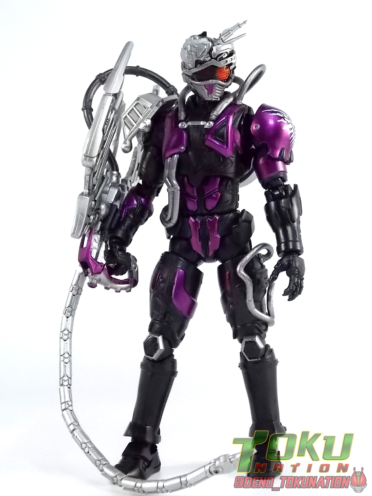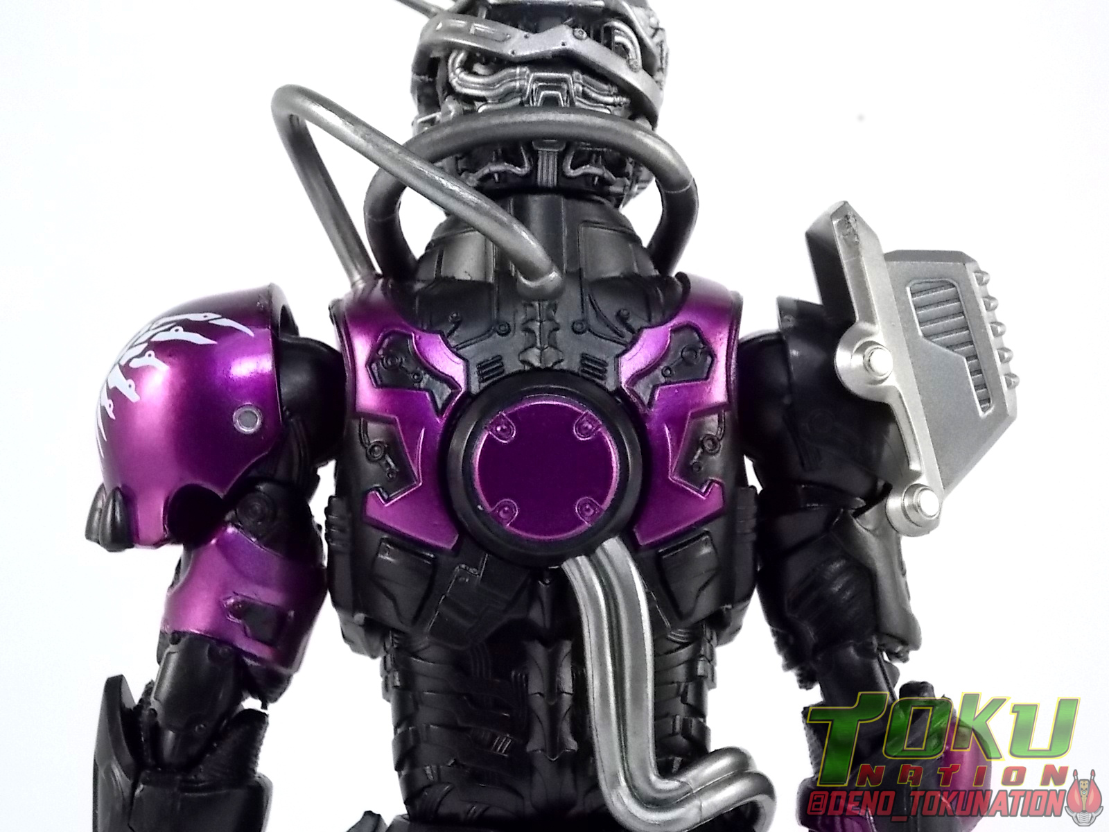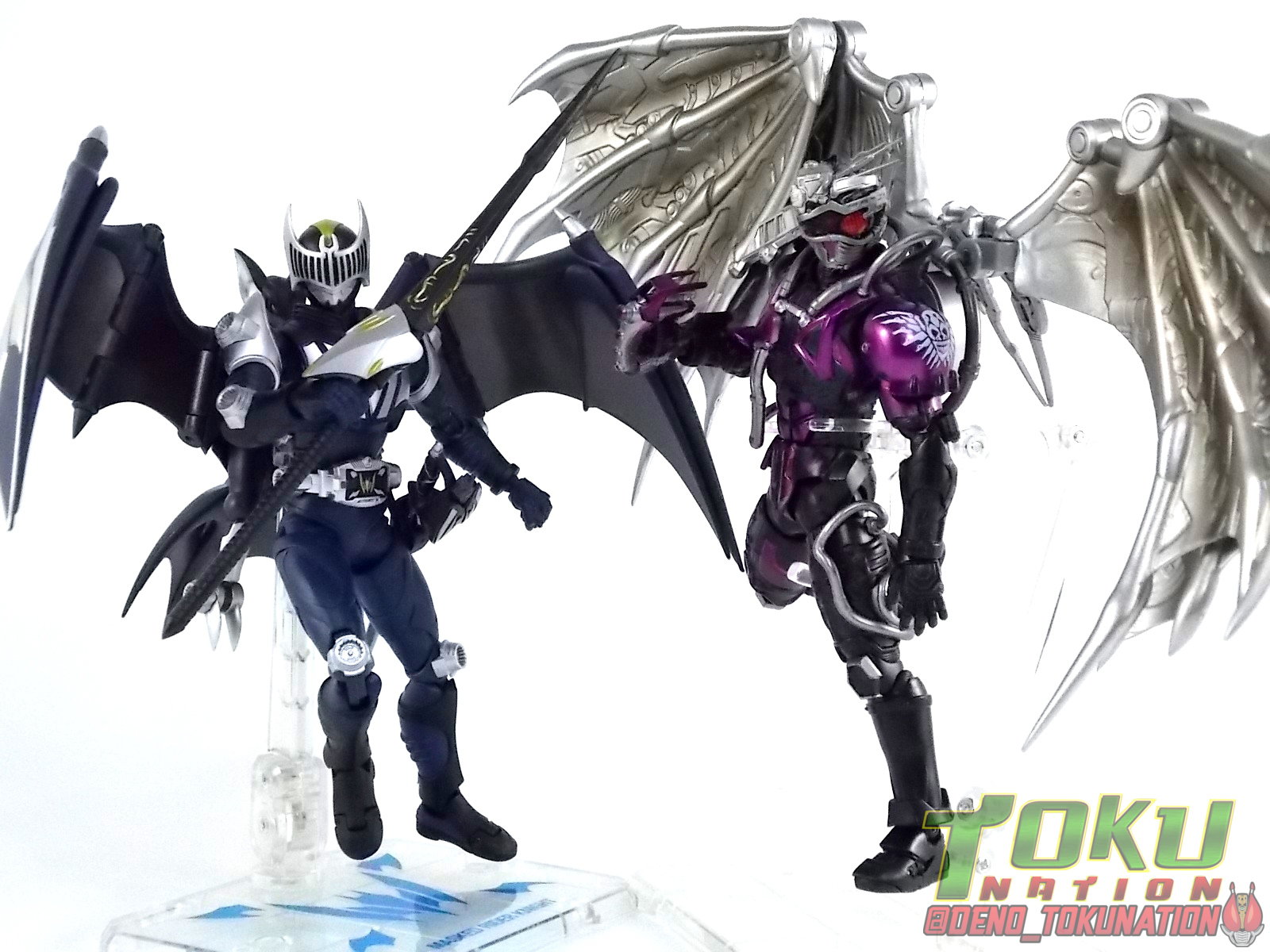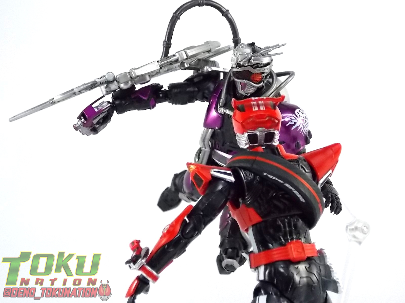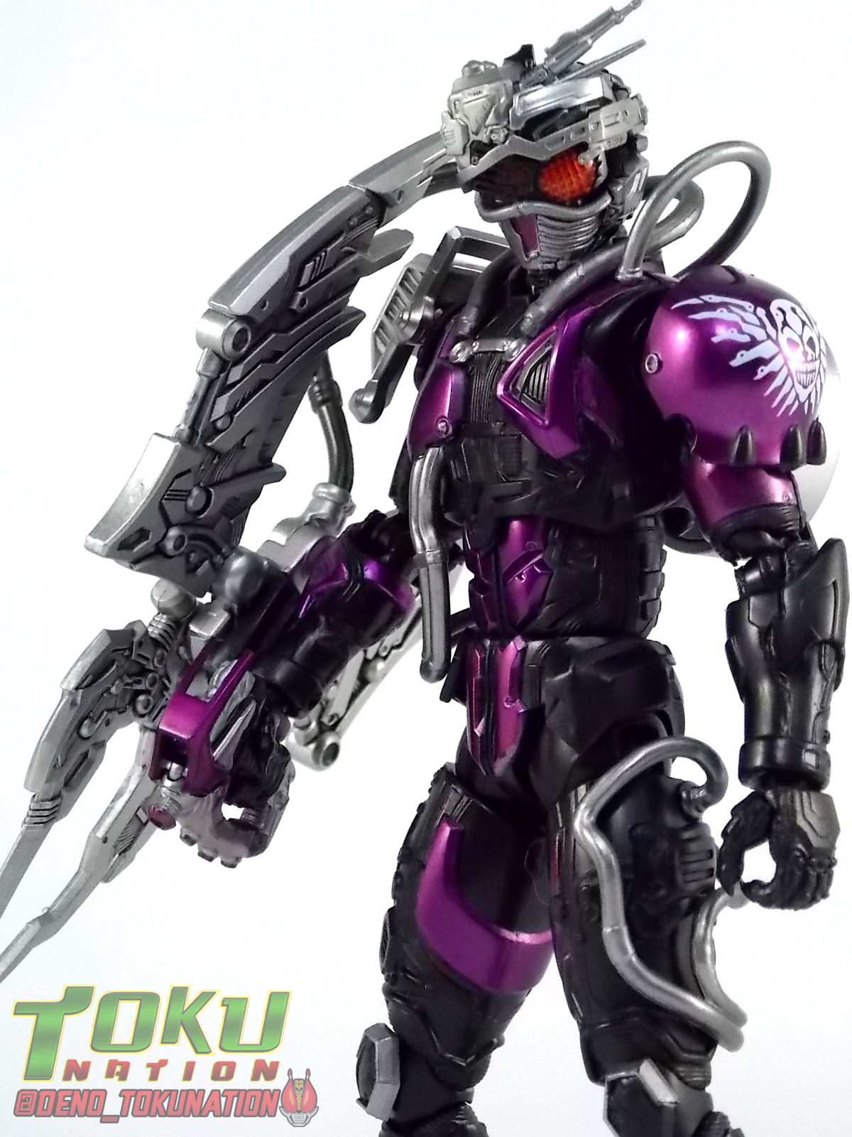 Everyone recalls the awesome abilities of our favorite Rider turned Roidmude hit man turned back to Rider right? Well sadly when S.H. Figuarts Mashin Chaser was released we of course discovered that many of his trademark weapons and accessories were not included. Or rather they simply couldn't be. Frankly it would have been too much for a standard retail release. (As clearly evidenced by this sets price) Well lucky for us Bandai finally saw fit to rectify that situation so today's gallery features the amazing S.H. Figuarts Busou Chaser accessory set! Seeing as this is an accessory set the review will be a bit more brisk. We'll simply focus on each piece individually and how they interact together as well as with Mashin Chaser. Packaging Nothing unusual here! Just a larger wider version of the Kamen Rider Drive theme of box. This one of course is so much larger in to accomodate the rather large wings included in the set. Everything's packed in one gigantic tray so be very careful when you open this set. There are several incredibly tiny pieces that could quite easily be lost when you pry apart the plastic trays. Parts Breakdown As I said above the entire point of this set is for it to interact with your S.H. Figuarts Mashin Chaser. Everything here is designed to interchange with each other to appropriately recreate the various special techniques and weapons made available to Chase by way of his Chaser Viral Cores. So let's start there. Viral Cores: You get one each of the Spider, Cobra, & Bat Viral Cores. Incredibly tiny these are at the exact same scale as Shift Cars & Signal Bikes. Accurately they're just painted in a dull silver but each has some incredible unique sculpting for something at this scale. Each can peg onto Chaser's Break Gunner by removing the guard on top first. Each corresponds to another mode for his Circular Dynamics back mounted weapons pack. To begin building the Circular Dyamics in it's standard backpack formation remove the plug from Chaser back revealing a post which you can plug the small notched gray part included with the set on. Then as pictured take the small tube and combine it with the main body of the Circular. Plug this onto Chaser's back to form the base of the assembly. Next take the weapon portion, the actual E-Circular, and plug the small version of the Tail Whipper onto it. This piece is purely aesthetic, it fills out a kind of symmetry on the opposite side of the circular playing off the tube on the other. A more realistic Tail Whipper is also included which we'll get to below. Plug this assembly onto the backpack and fold it up against Chaser's body. This creates the standard look of the pack. From the side it looks rather odd but straight on it gives Mashin Chaser some much needed bulk. And it succeeds in making him look just a bit more intimidating Now to create the first weapon, the Fang Spidey. Remove everything except the basic back plug and disassemble it. The main Circular Dynamics has a secondary groove in it that will allow you to plug it back on and let it face outward to the right arm. Now instead of the original tube used to accent the circular a larger bendable rubber one is used. This one will attach to the E-Circular itself and give it the free range of motion it needs for posing. Now wait! In order to actually use any of of these new weapons you need to use another part included in the set, the alternate forearm! Surprisingly Mashin Chasers arm can removed very easily and replaced with this one. Which is necessary because of the flat outer surface it features with a port meant to allow the E-Circular to sit flush with the arm. The look in this mode is pretty fierce. While I can't say it's perfect, the range of motion isn't hindered nearly as badly as you might think. The entire assembly can get in it's own way from time to time but all just looks badass. And the E-Circular itself is just ridiculously detailed. Just superb. To create the full Tail Whipper you just need to remove the small plug like port (which we use below) from underneath the pincers. It slides right out and allows you to plug in the larger and more accurate Tail Whipper, NOT the piece we used used for show on the backpack. This new whip has a semi-rigid wire running through it and all the components float freely around it. Allowing you to the have a fully posable and pretty firm whip for action poses. In order to utilize the final mode for the arm you can need to unplug the Tail Whipper and put the original port back in. Now we use the included Wing Sniper Effect Part to simulate a powerful attack. It's honestly not too spectacular but it gets the point across. Last but far from least is the most impressive and ambitious accessory in the entire Busou Chaser set, the Wing Sniper Wings! This huge and beautiful set of wings is just everything you could possibly want. The wings are each split into 2 large sections that can move independently of one another while each of half of the wing set is also independent allowing you create some great flight poses. When in use the other parts of this set are almost entirely taken out of play. You just need to get back down to the original Circular Dynamics parts without the weapons attached. Now remove the small pincer from the Circular and snap it into a similar groove on the back side of the wings. This gives the impression that the wings you have now transformed from the wings on the arm weapon. It's a brilliant way to simulate something that's impossible for this toy to replicate. However here's my one gripe with this entire accessory set. These hefty wings are now plugged into the the small plug on the upper back piece of the circular. This would be fine if the entire backpack could withstand the weight. I don't know if it's just mine or what but even though Mashin Chaser himself can balance with the wings on, perfectly I might add, the entire thing likes to come unplugged from his back. And plugging the wings themselves in