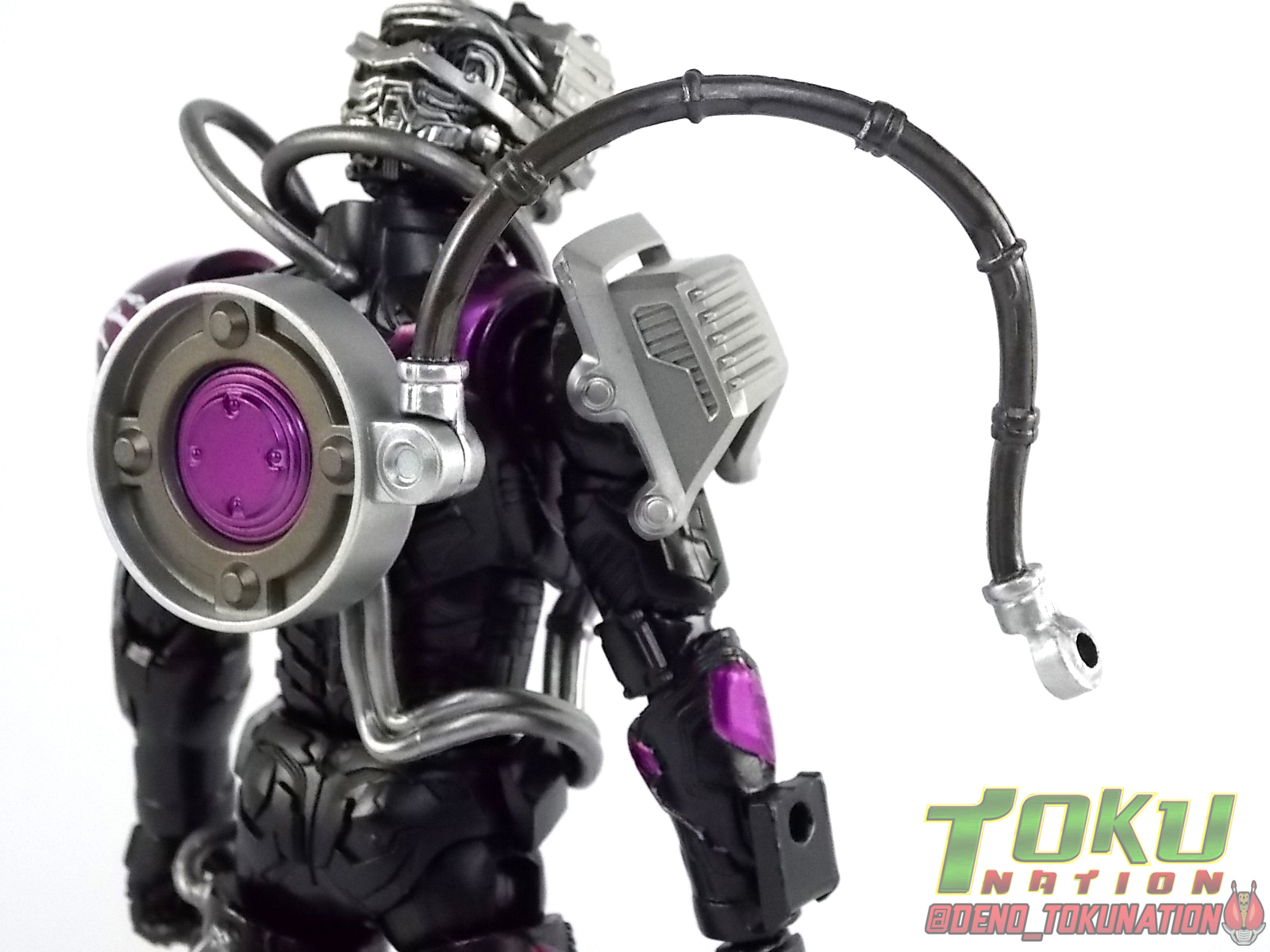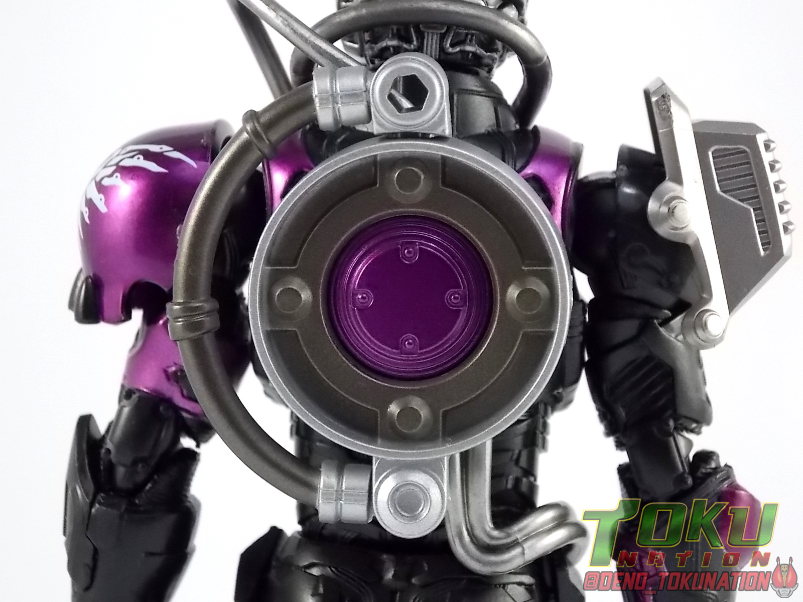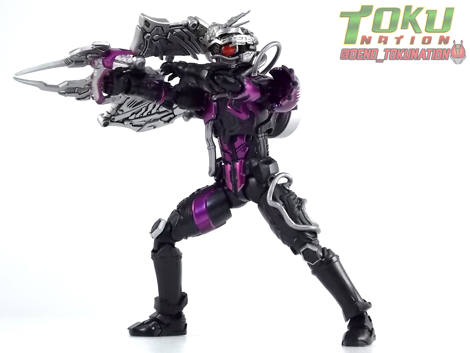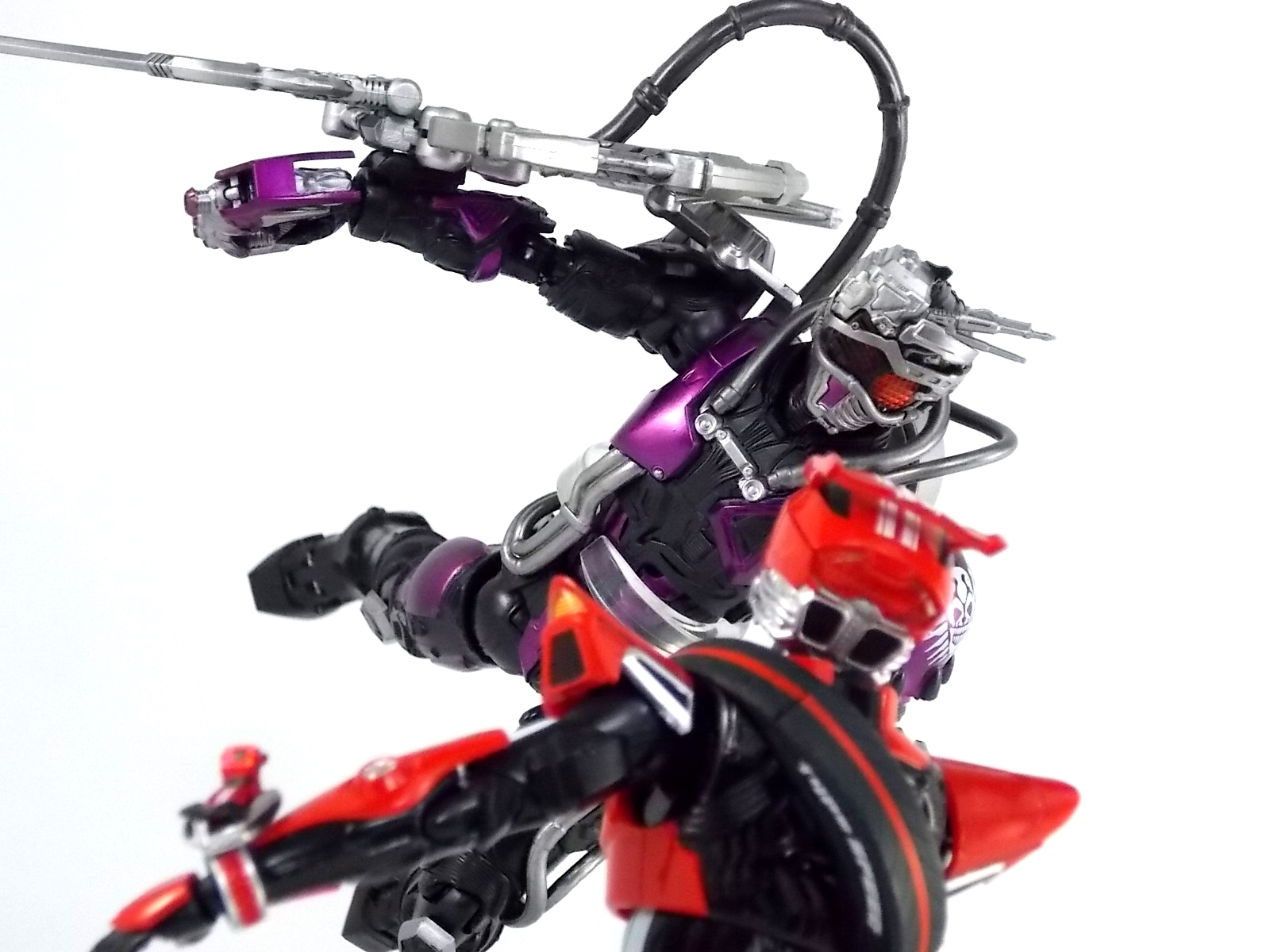Everyone recalls the awesome abilities of our favorite Rider turned Roidmude hit man turned back to Rider right? Well sadly when S.H. Figuarts Mashin Chaser was released we of course discovered that many of his trademark weapons and accessories were not included. Or rather they simply couldn't be. Frankly it would have been too much for a standard retail release. (As clearly evidenced by this sets price) Well lucky for us Bandai finally saw fit to rectify that situation so today's gallery features the amazing S.H. Figuarts Busou Chaser accessory set! Seeing as this is an accessory set the review will be a bit more brisk. We'll simply focus on each piece individually and how they interact together as well as with Mashin Chaser. Packaging Nothing unusual here! Just a larger wider version of the Kamen Rider Drive theme of box. This one of course is so much larger in to accomodate the rather large wings included in the set. Everything's packed in one gigantic tray so be very careful when you open this set. There are several incredibly tiny pieces that could quite easily be lost when you pry apart the plastic trays. Parts Breakdown As I said above the entire point of this set is for it to interact with your S.H. Figuarts Mashin Chaser. Everything here is designed to interchange with each other to appropriately recreate the various special techniques and weapons made available to Chase by way of his Chaser Viral Cores. So let's start there. Viral Cores: You get one each of the Spider, Cobra, & Bat Viral Cores. Incredibly tiny these are at the exact same scale as Shift Cars & Signal Bikes. Accurately they're just painted in a dull silver but each has some incredible unique sculpting for something at this scale. Each can peg onto Chaser's Break Gunner by removing the guard on top first. Each corresponds to another mode for his Circular Dynamics back mounted weapons pack. To begin building the Circular Dyamics in it's standard backpack formation remove the plug from Chaser back revealing a post which you can plug the small notched gray part included with the set on. Then as pictured take the small tube and combine it with the main body of the Circular. Plug this onto Chaser's back to form the base of the assembly. Next take the weapon portion, the actual E-Circular, and plug the small version of the Tail Whipper onto it. This piece is purely aesthetic, it fills out a kind of symmetry on the opposite side of the circular playing off the tube on the other. A more realistic Tail Whipper is also included which we'll get to below. Plug this assembly onto the backpack and fold it up against Chaser's body. This creates the standard look of the pack. From the side it looks rather odd but straight on it gives Mashin Chaser some much needed bulk. And it succeeds in making him look just a bit more intimidating Now to create the first weapon, the Fang Spidey. Remove everything except the basic back plug and disassemble it. The main Circular Dynamics has a secondary groove in it that will allow you to plug it back on and let it face outward to the right arm. Now instead of the original tube used to accent the circular a larger bendable rubber one is used. This one will attach to the E-Circular itself and give it the free range of motion it needs for posing. Now wait! In order to actually use any of of these new weapons you need to use another part included in the set, the alternate forearm! Surprisingly Mashin Chasers arm can removed very easily and replaced with this one. Which is necessary because of the flat outer surface it features with a port meant to allow the E-Circular to sit flush with the arm. The look in this mode is pretty fierce. While I can't say it's perfect, the range of motion isn't hindered nearly as badly as you might think. The entire assembly can get in it's own way from time to time but all just looks badass. And the E-Circular itself is just ridiculously detailed. Just superb. To create the full Tail Whipper you just need to remove the small plug like port (which we use below) from underneath the pincers. It slides right out and allows you to plug in the larger and more accurate Tail Whipper, NOT the piece we used used for show on the backpack. This new whip has a semi-rigid wire running through it and all the components float freely around it. Allowing you to the have a fully posable and pretty firm whip for action poses. In order to utilize the final mode for the arm you can need to unplug the Tail Whipper and put the original port back in. Now we use the included Wing Sniper Effect Part to simulate a powerful attack. It's honestly not too spectacular but it gets the point across. Last but far from least is the most impressive and ambitious accessory in the entire Busou Chaser set, the Wing Sniper Wings! This huge and beautiful set of wings is just everything you could possibly want. The wings are each split into 2 large sections that can move independently of one another while each of half of the wing set is also independent allowing you create some great flight poses. When in use the other parts of this set are almost entirely taken out of play. You just need to get back down to the original Circular Dynamics parts without the weapons attached. Now remove the small pincer from the Circular and snap it into a similar groove on the back side of the wings. This gives the impression that the wings you have now transformed from the wings on the arm weapon. It's a brilliant way to simulate something that's impossible for this toy to replicate. However here's my one gripe with this entire accessory set. These hefty wings are now plugged into the the small plug on the upper back piece of the circular. This would be fine if the entire backpack could withstand the weight. I don't know if it's just mine or what but even though Mashin Chaser himself can balance with the wings on, perfectly I might add, the entire thing likes to come unplugged from his back. And plugging the wings themselves in