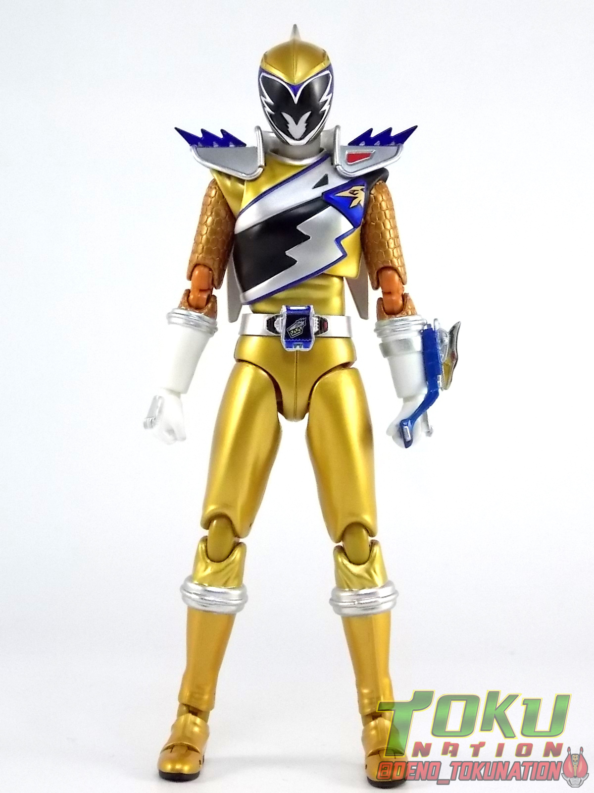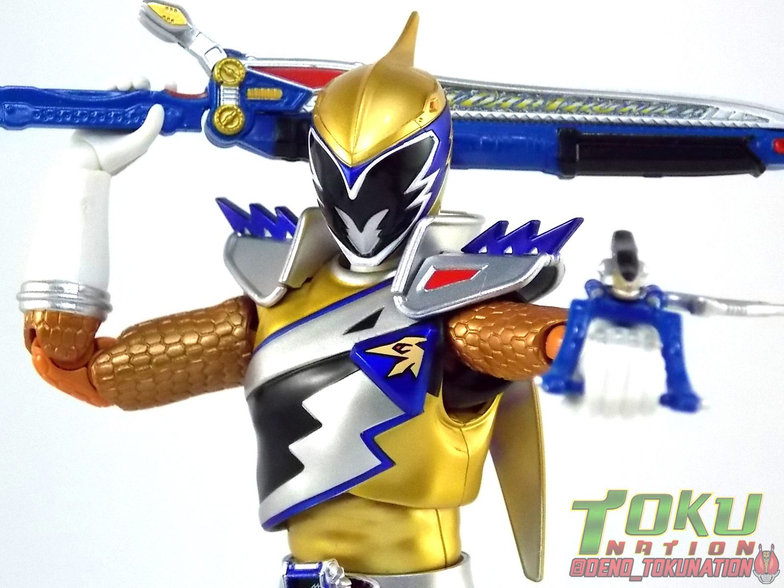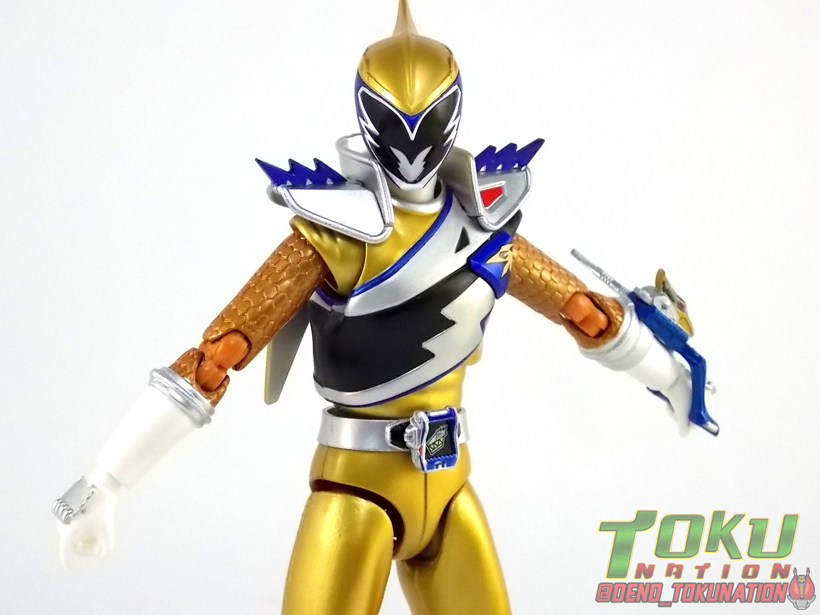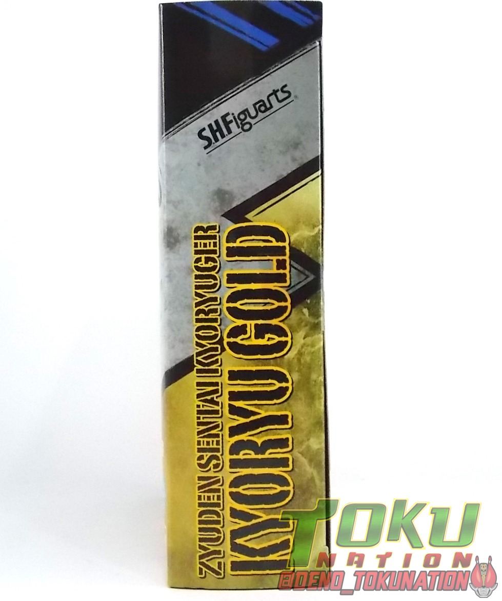Zyuden Sentai Kyoryuger is long over by now but the last figuart released from the series is still quite a good one. So we thought it was only appropriate that it deserved a 2.0 Gallery! And so S.H. Figuarts Kyoryu Gold is yet another sixth ranger to add to your collection, and luckily it appears a much more affordable one than he was upon release. Kyoryu Gold also has the odd distinction of being the actual 6th, 6th ranger, SHF to be released. There's something kind of awesome about that. But more to the point, the figure! Packaging Kyoryu Gold was released in 2014 as a Tamashii Web Exclusive. As such he came in the now more or less standard windowless box with full artwork. Just as the Kyoryu Blue/Green & Black/Pink 2-packs did. So if you've seen either of those you know what to expect. The only differences of course being the stock images etc on the packaging. On to the figure! Main Figure For starters Kyoru Gold, or Uchy as his friends loved to call him, is a gorgeous figure. Even after 5 releases the male Kyoryuger mold has never looked this good. As the 6th release from Kyoryuger, bearing more than a few reused molded parts from his predecessors, but he's a step above the rest. Perhaps it's the crisp gold paint or the gorgeous blue trim. Something about this figure really makes it shine, for lack of a better term. Of course there are some alterations to the base body to give Kyoryu Gold just a little more originality. Mostly some added bulk but it goes very far to making him look much more imposing than the other Kyoryugers. As with the others the sculpt of Kyoryu Gold is on point. The arms feature the same brilliant "scale" detailing, the Mobuckle is beautiful while only half functional, and the head is magnificent. The more extravagant helmets seem to look the best on these figures. Kyoryu Gold by far has the best. He also has the most intricate and well painted chest sash of the 6 figures. On top of this Kyoryu Gold has a fantastic range of motion as can be expected after 5 other releases in this similar body type. His shoulder armor is hinged to get out of the way for dynamic posing, and his back wings are just the right size so as not to interfere with any of his body movements. Though they do tend to be in the perfect location to make Tamashii Stages difficult to use. Though many collectors have complained the wings are a bit on the small side, they appear to be only slightly undersized. Effect parts of the wings enlarged and or flapping would have been nice but that's expecting too much from a Web Exclusive release. The only other major difference between this release and the others is the wrist mounted Gaburi Changer. It's a gorgeously detailed piece that is for some bizarre reason removable despite that having never occurred in the show. In fact there are alternate left hands as well, that serve no real purpose as I detail in the accessories section. The one gripe I have about the Gaburichanger itself is it's non-functionality. Though I suppose it is to be expected after the Gaburevolvers & Caliburs were not made to accept Zyudenchi. But a tiny hinge and a shallow port for one seems like a no-brainer to me. But again, read on in the accessories section to see how similarly his other weapon was handled. After owning this guy for over a year and a half I can report there are no real QC issues to speak of on mine. It's still a fantastic figuart, it still holds up with more contemporary releases like Akaranger or Vul Eagle quite well. Accessories As mentioned above the accessory count for S.H. Figuarts Kyoru Gold is a bit low but that's to be expected: 5 - additional hands for posing. 2 of which are for his left wrist and make no damn sense. The Gaburi Changer is a separate piece despite being packed already attached to the left arm. It can be removed, and pegs into the wrist, and it can be taken out of the hand. Though there's no real purpose to this, at all. The Changer was almost exclusively seen being grasped in his left hand in show footage. The two open left hands can't possibly be used in any realistic way with how this toy is designed. Having them open doesn't allow him any greater ability to hold something when that blue bar from the Changer is still smack in the middle of his palm. 1 -Zandar Thunder sword. The paint is exquisite on this bad boy, right down to the actual "Zandar Thunder" text which goes from the hand guard down the blade. It's a gorgeous weapon. Unfortunately though it's practically non-functional. The Zandar can be opened to reveal what would have been the 3 Zyudenchi slots on the real deal. But the SHF opts not to hollow those spots out, leaving only tiny indentations instead. Which brings us to the next included accessory, 1 - Generic Zyudenchi. By association it should be #6 Pteragordon Zyudenchi but it simply isn't painted correctly. Though to be fair none of the 6 Kyoryuger Figuarts have Zyudenchi with entirely accurate colors. That's mostly because at this scale it's nigh impossible to get it right. So some general colors are slapped on so you get a feel for it. Again this thing is infinitesimally small and I won't use it for anything again ever. As is it's kind of useless due to the nature of how the Zandar Thunder is designed here. It can barely even be held in Kyoryu Gold's hand. Unfortunately a hand specifically meant for holding Zyudenchi's is not included with Gold or any of the Kyoryugers. 1 - Fang Shot (Gabutyra Fang, Parasagun combo). This piece is meant to be used with the Shield Lan Slasher combo weapon that came in the Kyoryu Black & Pink 2-pack to form the completed Kentro Spiker! The otherwise individually released Armed On weapons do not combine, so buying Kyoryu Gold is the only way to complete a full Kentrospiker. While that may not seem very lite, Kyoryu Gold doesn't really come with a lot. The Zyudenchi is ultimately pointless, the Fang Shot is meant for other figures, and that limits what he personally uses to 5 hands (half 