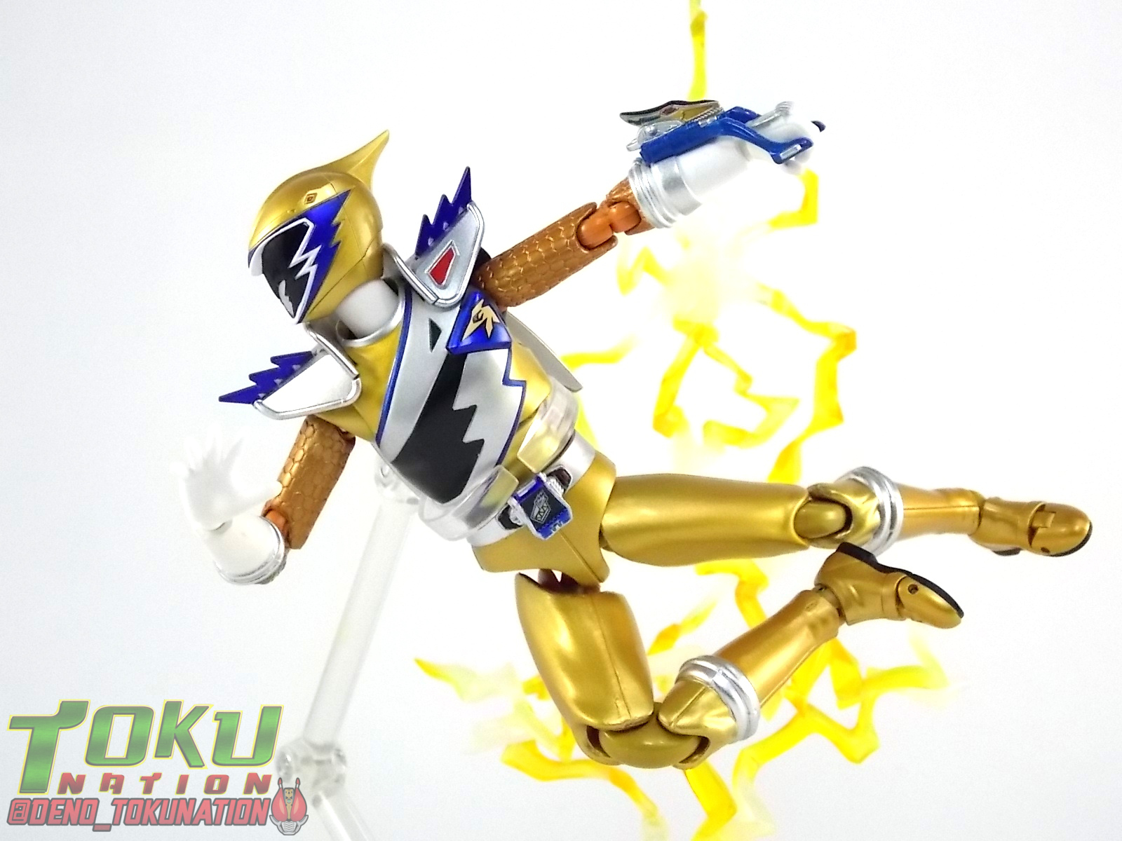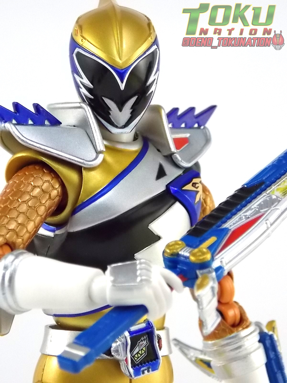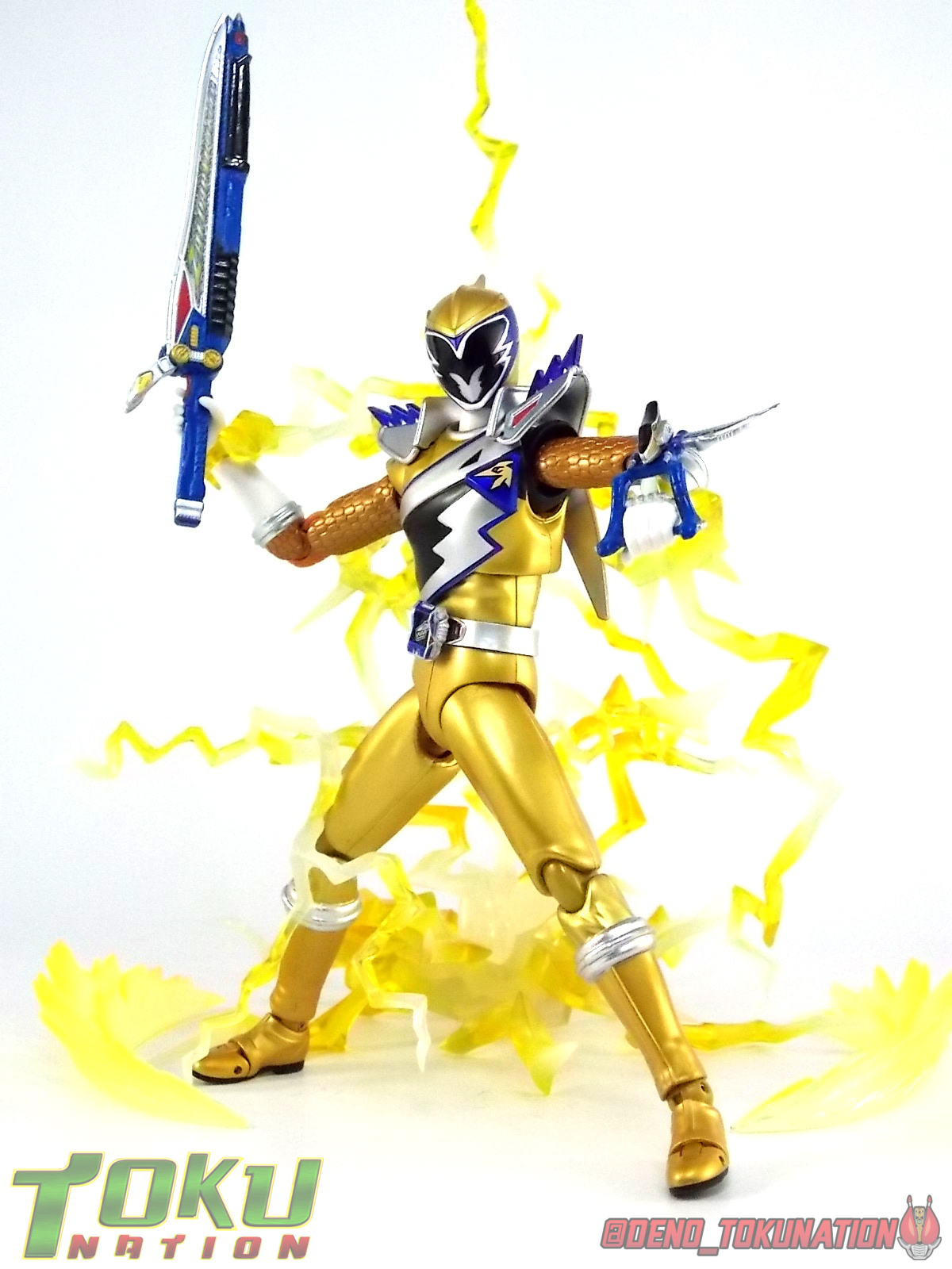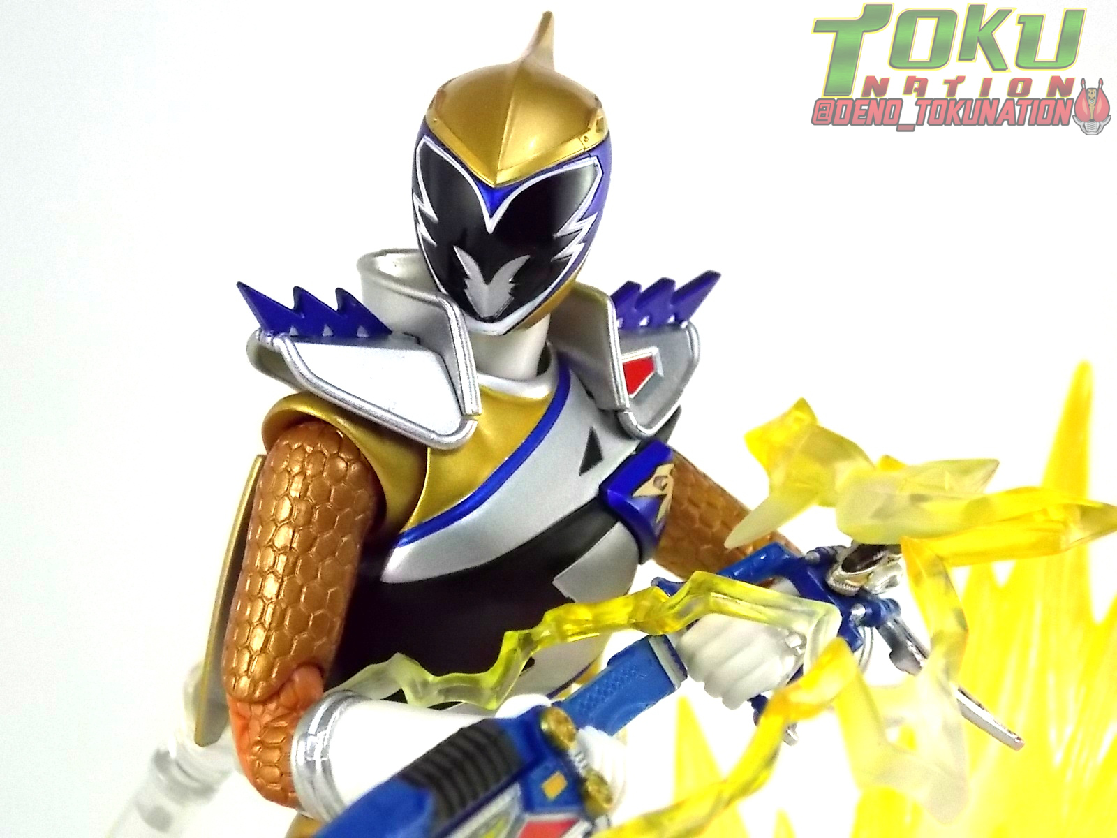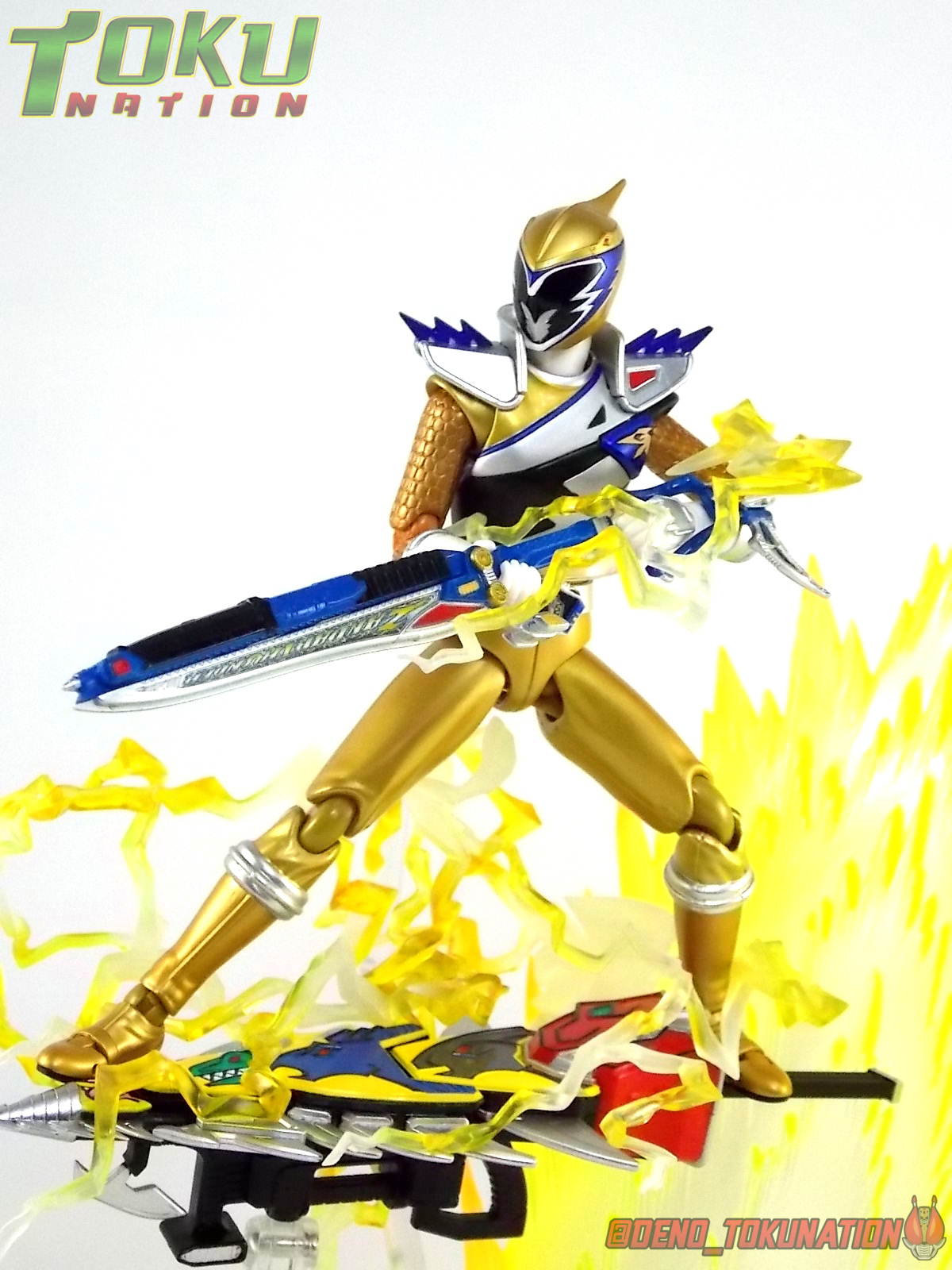Zyuden Sentai Kyoryuger is long over by now but the last figuart released from the series is still quite a good one. So we thought it was only appropriate that it deserved a 2.0 Gallery! And so S.H. Figuarts Kyoryu Gold is yet another sixth ranger to add to your collection, and luckily it appears a much more affordable one than he was upon release. Kyoryu Gold also has the odd distinction of being the actual 6th, 6th ranger, SHF to be released. There's something kind of awesome about that. But more to the point, the figure! Packaging Kyoryu Gold was released in 2014 as a Tamashii Web Exclusive. As such he came in the now more or less standard windowless box with full artwork. Just as the Kyoryu Blue/Green & Black/Pink 2-packs did. So if you've seen either of those you know what to expect. The only differences of course being the stock images etc on the packaging. On to the figure! Main Figure For starters Kyoru Gold, or Uchy as his friends loved to call him, is a gorgeous figure. Even after 5 releases the male Kyoryuger mold has never looked this good. As the 6th release from Kyoryuger, bearing more than a few reused molded parts from his predecessors, but he's a step above the rest. Perhaps it's the crisp gold paint or the gorgeous blue trim. Something about this figure really makes it shine, for lack of a better term. Of course there are some alterations to the base body to give Kyoryu Gold just a little more originality. Mostly some added bulk but it goes very far to making him look much more imposing than the other Kyoryugers. As with the others the sculpt of Kyoryu Gold is on point. The arms feature the same brilliant "scale" detailing, the Mobuckle is beautiful while only half functional, and the head is magnificent. The more extravagant helmets seem to look the best on these figures. Kyoryu Gold by far has the best. He also has the most intricate and well painted chest sash of the 6 figures. On top of this Kyoryu Gold has a fantastic range of motion as can be expected after 5 other releases in this similar body type. His shoulder armor is hinged to get out of the way for dynamic posing, and his back wings are just the right size so as not to interfere with any of his body movements. Though they do tend to be in the perfect location to make Tamashii Stages difficult to use. Though many collectors have complained the wings are a bit on the small side, they appear to be only slightly undersized. Effect parts of the wings enlarged and or flapping would have been nice but that's expecting too much from a Web Exclusive release. The only other major difference between this release and the others is the wrist mounted Gaburi Changer. It's a gorgeously detailed piece that is for some bizarre reason removable despite that having never occurred in the show. In fact there are alternate left hands as well, that serve no real purpose as I detail in the accessories section. The one gripe I have about the Gaburichanger itself is it's non-functionality. Though I suppose it is to be expected after the Gaburevolvers & Caliburs were not made to accept Zyudenchi. But a tiny hinge and a shallow port for one seems like a no-brainer to me. But again, read on in the accessories section to see how similarly his other weapon was handled. After owning this guy for over a year and a half I can report there are no real QC issues to speak of on mine. It's still a fantastic figuart, it still holds up with more contemporary releases like Akaranger or Vul Eagle quite well. Accessories As mentioned above the accessory count for S.H. Figuarts Kyoru Gold is a bit low but that's to be expected: 5 - additional hands for posing. 2 of which are for his left wrist and make no damn sense. The Gaburi Changer is a separate piece despite being packed already attached to the left arm. It can be removed, and pegs into the wrist, and it can be taken out of the hand. Though there's no real purpose to this, at all. The Changer was almost exclusively seen being grasped in his left hand in show footage. The two open left hands can't possibly be used in any realistic way with how this toy is designed. Having them open doesn't allow him any greater ability to hold something when that blue bar from the Changer is still smack in the middle of his palm. 1 -Zandar Thunder sword. The paint is exquisite on this bad boy, right down to the actual "Zandar Thunder" text which goes from the hand guard down the blade. It's a gorgeous weapon. Unfortunately though it's practically non-functional. The Zandar can be opened to reveal what would have been the 3 Zyudenchi slots on the real deal. But the SHF opts not to hollow those spots out, leaving only tiny indentations instead. Which brings us to the next included accessory, 1 - Generic Zyudenchi. By association it should be #6 Pteragordon Zyudenchi but it simply isn't painted correctly. Though to be fair none of the 6 Kyoryuger Figuarts have Zyudenchi with entirely accurate colors. That's mostly because at this scale it's nigh impossible to get it right. So some general colors are slapped on so you get a feel for it. Again this thing is infinitesimally small and I won't use it for anything again ever. As is it's kind of useless due to the nature of how the Zandar Thunder is designed here. It can barely even be held in Kyoryu Gold's hand. Unfortunately a hand specifically meant for holding Zyudenchi's is not included with Gold or any of the Kyoryugers. 1 - Fang Shot (Gabutyra Fang, Parasagun combo). This piece is meant to be used with the Shield Lan Slasher combo weapon that came in the Kyoryu Black & Pink 2-pack to form the completed Kentro Spiker! The otherwise individually released Armed On weapons do not combine, so buying Kyoryu Gold is the only way to complete a full Kentrospiker. While that may not seem very lite, Kyoryu Gold doesn't really come with a lot. The Zyudenchi is ultimately pointless, the Fang Shot is meant for other figures, and that limits what he personally uses to 5 hands (half 