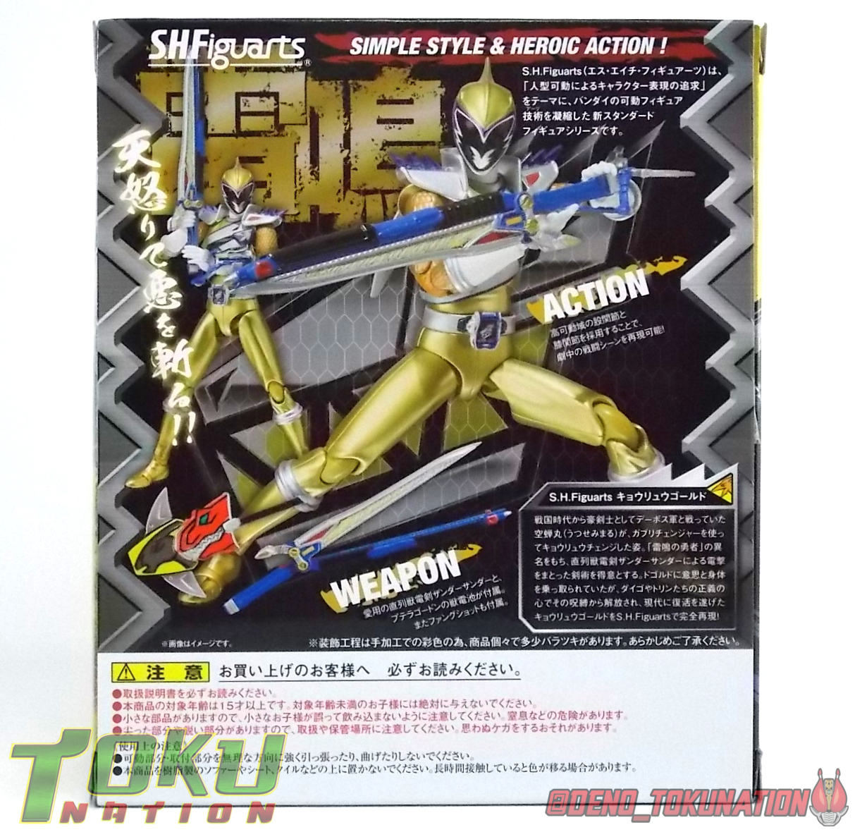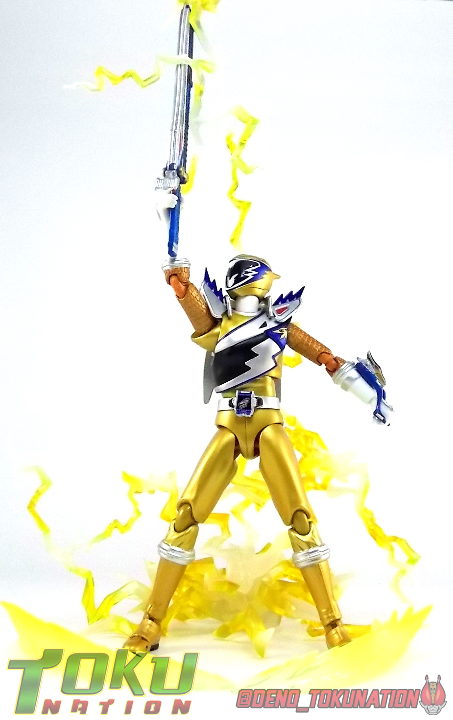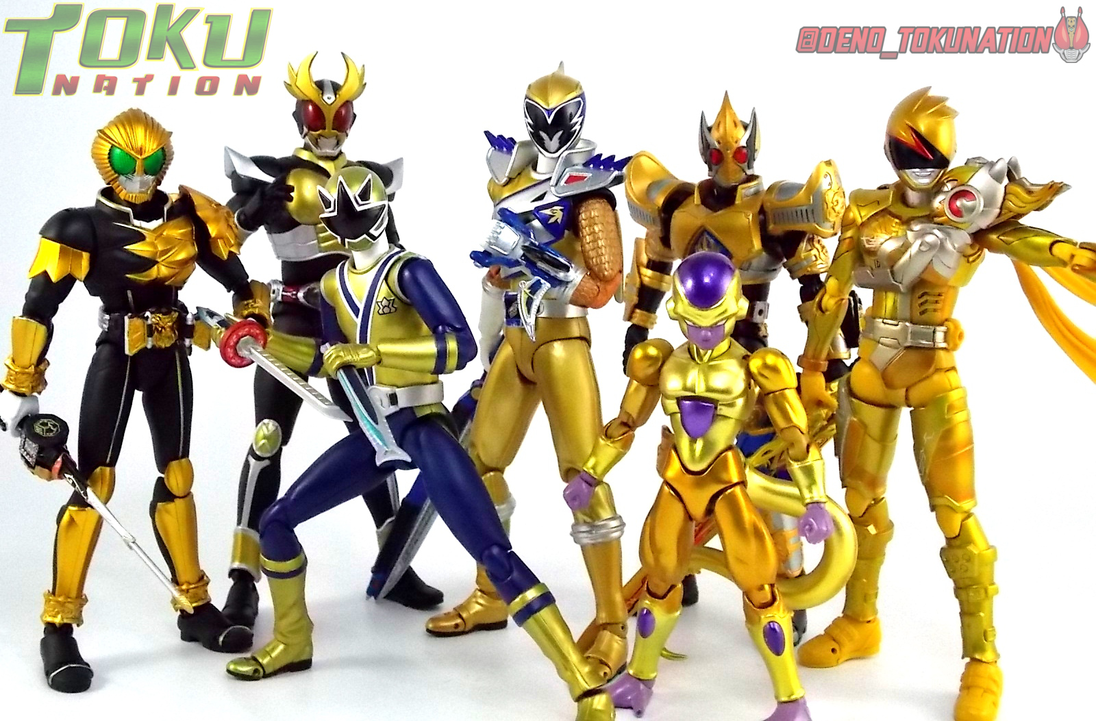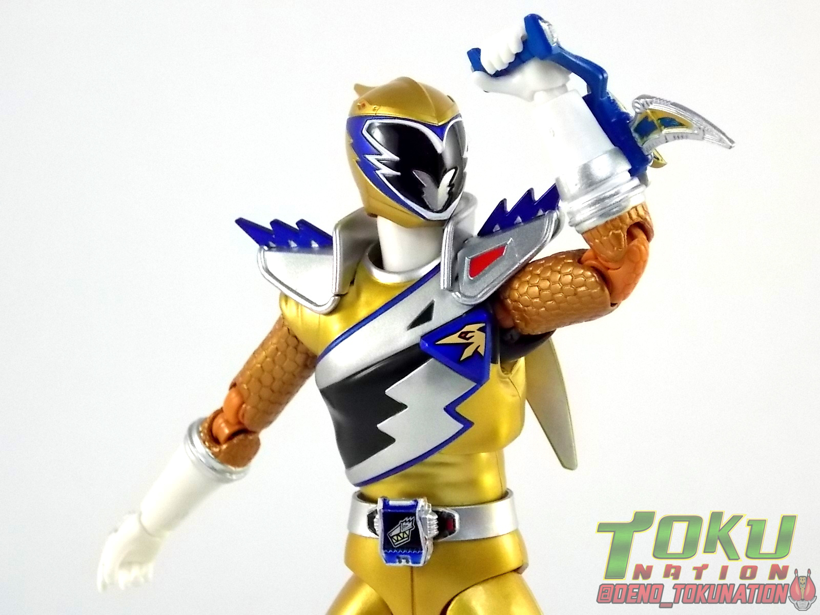 Zyuden Sentai Kyoryuger is long over by now but the last figuart released from the series is still quite a good one. So we thought it was only appropriate that it deserved a 2.0 Gallery! And so S.H. Figuarts Kyoryu Gold is yet another sixth ranger to add to your collection, and luckily it appears a much more affordable one than he was upon release. Kyoryu Gold also has the odd distinction of being the actual 6th, 6th ranger, SHF to be released. There's something kind of awesome about that. But more to the point, the figure! Packaging Kyoryu Gold was released in 2014 as a Tamashii Web Exclusive. As such he came in the now more or less standard windowless box with full artwork. Just as the Kyoryu Blue/Green & Black/Pink 2-packs did. So if you've seen either of those you know what to expect. The only differences of course being the stock images etc on the packaging. On to the figure! Main Figure For starters Kyoru Gold, or Uchy as his friends loved to call him, is a gorgeous figure. Even after 5 releases the male Kyoryuger mold has never looked this good. As the 6th release from Kyoryuger, bearing more than a few reused molded parts from his predecessors, but he's a step above the rest. Perhaps it's the crisp gold paint or the gorgeous blue trim. Something about this figure really makes it shine, for lack of a better term. Of course there are some alterations to the base body to give Kyoryu Gold just a little more originality. Mostly some added bulk but it goes very far to making him look much more imposing than the other Kyoryugers. As with the others the sculpt of Kyoryu Gold is on point. The arms feature the same brilliant "scale" detailing, the Mobuckle is beautiful while only half functional, and the head is magnificent. The more extravagant helmets seem to look the best on these figures. Kyoryu Gold by far has the best. He also has the most intricate and well painted chest sash of the 6 figures. On top of this Kyoryu Gold has a fantastic range of motion as can be expected after 5 other releases in this similar body type. His shoulder armor is hinged to get out of the way for dynamic posing, and his back wings are just the right size so as not to interfere with any of his body movements. Though they do tend to be in the perfect location to make Tamashii Stages difficult to use. Though many collectors have complained the wings are a bit on the small side, they appear to be only slightly undersized. Effect parts of the wings enlarged and or flapping would have been nice but that's expecting too much from a Web Exclusive release. The only other major difference between this release and the others is the wrist mounted Gaburi Changer. It's a gorgeously detailed piece that is for some bizarre reason removable despite that having never occurred in the show. In fact there are alternate left hands as well, that serve no real purpose as I detail in the accessories section. The one gripe I have about the Gaburichanger itself is it's non-functionality. Though I suppose it is to be expected after the Gaburevolvers & Caliburs were not made to accept Zyudenchi. But a tiny hinge and a shallow port for one seems like a no-brainer to me. But again, read on in the accessories section to see how similarly his other weapon was handled. After owning this guy for over a year and a half I can report there are no real QC issues to speak of on mine. It's still a fantastic figuart, it still holds up with more contemporary releases like Akaranger or Vul Eagle quite well. Accessories As mentioned above the accessory count for S.H. Figuarts Kyoru Gold is a bit low but that's to be expected: 5 - additional hands for posing. 2 of which are for his left wrist and make no damn sense. The Gaburi Changer is a separate piece despite being packed already attached to the left arm. It can be removed, and pegs into the wrist, and it can be taken out of the hand. Though there's no real purpose to this, at all. The Changer was almost exclusively seen being grasped in his left hand in show footage. The two open left hands can't possibly be used in any realistic way with how this toy is designed. Having them open doesn't allow him any greater ability to hold something when that blue bar from the Changer is still smack in the middle of his palm. 1 -Zandar Thunder sword. The paint is exquisite on this bad boy, right down to the actual "Zandar Thunder" text which goes from the hand guard down the blade. It's a gorgeous weapon. Unfortunately though it's practically non-functional. The Zandar can be opened to reveal what would have been the 3 Zyudenchi slots on the real deal. But the SHF opts not to hollow those spots out, leaving only tiny indentations instead. Which brings us to the next included accessory, 1 - Generic Zyudenchi. By association it should be #6 Pteragordon Zyudenchi but it simply isn't painted correctly. Though to be fair none of the 6 Kyoryuger Figuarts have Zyudenchi with entirely accurate colors. That's mostly because at this scale it's nigh impossible to get it right. So some general colors are slapped on so you get a feel for it. Again this thing is infinitesimally small and I won't use it for anything again ever. As is it's kind of useless due to the nature of how the Zandar Thunder is designed here. It can barely even be held in Kyoryu Gold's hand. Unfortunately a hand specifically meant for holding Zyudenchi's is not included with Gold or any of the Kyoryugers. 1 - Fang Shot (Gabutyra Fang, Parasagun combo). This piece is meant to be used with the Shield Lan Slasher combo weapon that came in the Kyoryu Black & Pink 2-pack to form the completed Kentro Spiker! The otherwise individually released Armed On weapons do not combine, so buying Kyoryu Gold is the only way to complete a full Kentrospiker. While that may not seem very lite, Kyoryu Gold doesn't really come with a lot. The Zyudenchi is ultimately pointless, the Fang Shot is meant for other figures, and that limits what he personally uses to 5 hands (half 