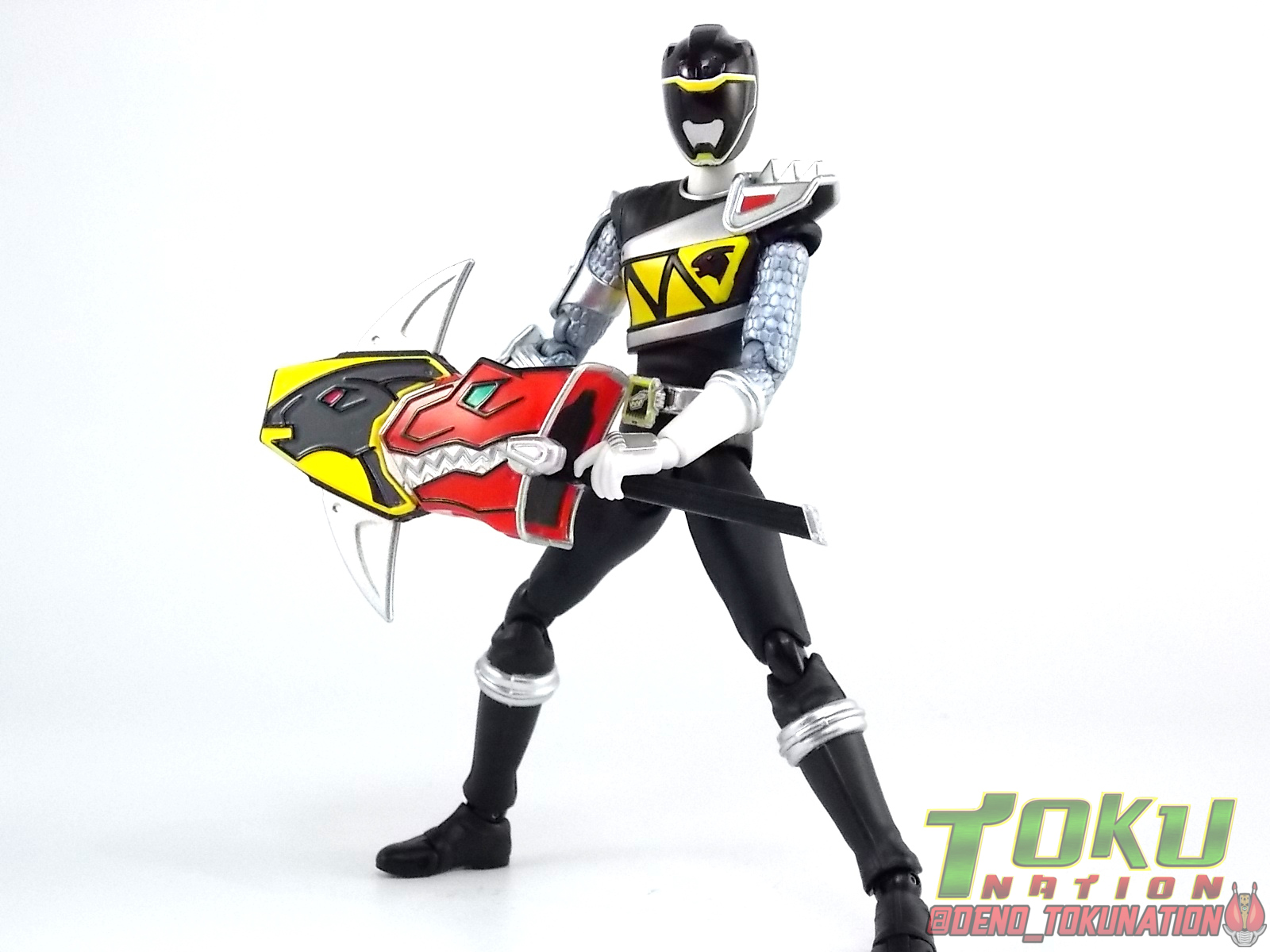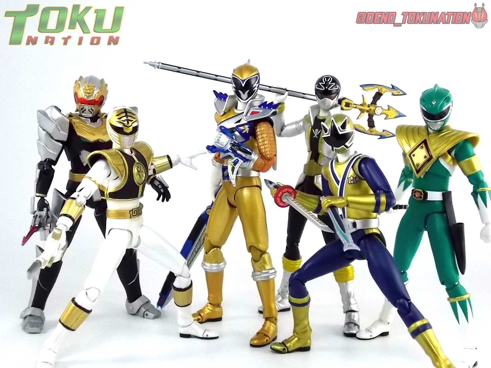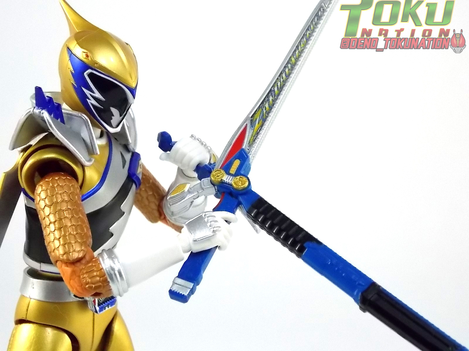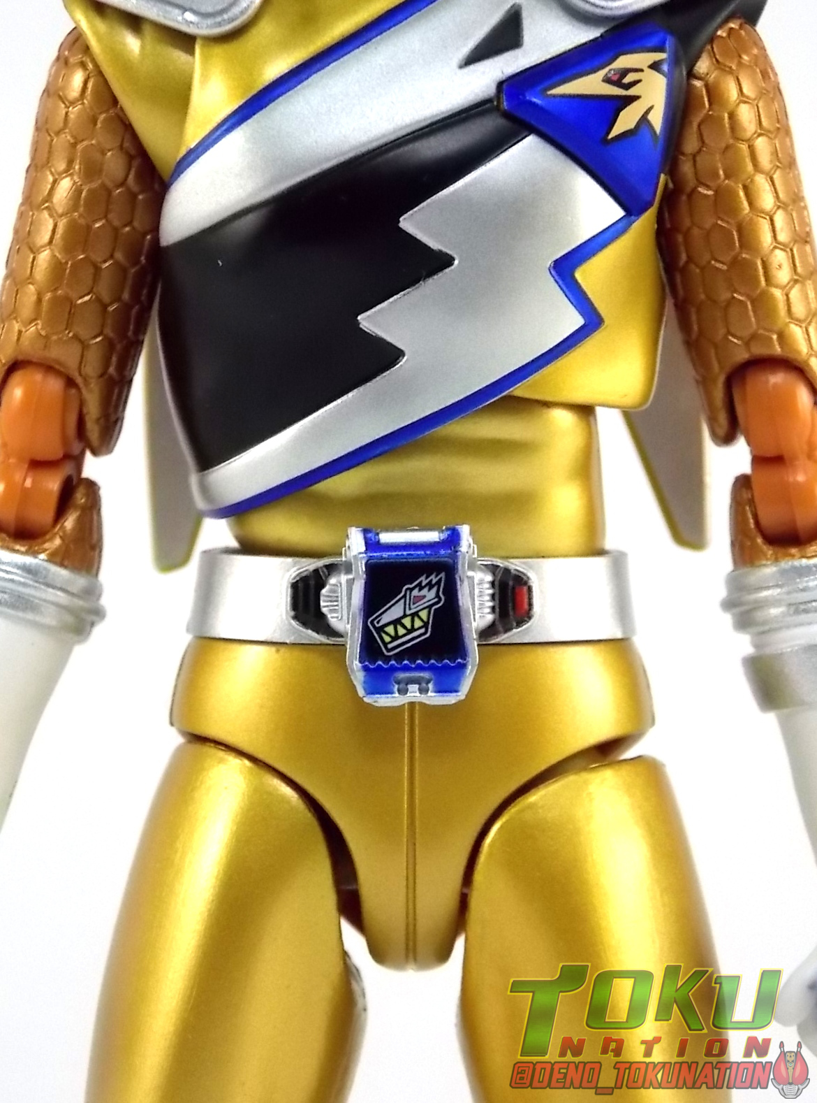Zyuden Sentai Kyoryuger is long over by now but the last figuart released from the series is still quite a good one. So we thought it was only appropriate that it deserved a 2.0 Gallery! And so S.H. Figuarts Kyoryu Gold is yet another sixth ranger to add to your collection, and luckily it appears a much more affordable one than he was upon release. Kyoryu Gold also has the odd distinction of being the actual 6th, 6th ranger, SHF to be released. There's something kind of awesome about that. But more to the point, the figure! Packaging Kyoryu Gold was released in 2014 as a Tamashii Web Exclusive. As such he came in the now more or less standard windowless box with full artwork. Just as the Kyoryu Blue/Green & Black/Pink 2-packs did. So if you've seen either of those you know what to expect. The only differences of course being the stock images etc on the packaging. On to the figure! Main Figure For starters Kyoru Gold, or Uchy as his friends loved to call him, is a gorgeous figure. Even after 5 releases the male Kyoryuger mold has never looked this good. As the 6th release from Kyoryuger, bearing more than a few reused molded parts from his predecessors, but he's a step above the rest. Perhaps it's the crisp gold paint or the gorgeous blue trim. Something about this figure really makes it shine, for lack of a better term. Of course there are some alterations to the base body to give Kyoryu Gold just a little more originality. Mostly some added bulk but it goes very far to making him look much more imposing than the other Kyoryugers. As with the others the sculpt of Kyoryu Gold is on point. The arms feature the same brilliant "scale" detailing, the Mobuckle is beautiful while only half functional, and the head is magnificent. The more extravagant helmets seem to look the best on these figures. Kyoryu Gold by far has the best. He also has the most intricate and well painted chest sash of the 6 figures. On top of this Kyoryu Gold has a fantastic range of motion as can be expected after 5 other releases in this similar body type. His shoulder armor is hinged to get out of the way for dynamic posing, and his back wings are just the right size so as not to interfere with any of his body movements. Though they do tend to be in the perfect location to make Tamashii Stages difficult to use. Though many collectors have complained the wings are a bit on the small side, they appear to be only slightly undersized. Effect parts of the wings enlarged and or flapping would have been nice but that's expecting too much from a Web Exclusive release. The only other major difference between this release and the others is the wrist mounted Gaburi Changer. It's a gorgeously detailed piece that is for some bizarre reason removable despite that having never occurred in the show. In fact there are alternate left hands as well, that serve no real purpose as I detail in the accessories section. The one gripe I have about the Gaburichanger itself is it's non-functionality. Though I suppose it is to be expected after the Gaburevolvers & Caliburs were not made to accept Zyudenchi. But a tiny hinge and a shallow port for one seems like a no-brainer to me. But again, read on in the accessories section to see how similarly his other weapon was handled. After owning this guy for over a year and a half I can report there are no real QC issues to speak of on mine. It's still a fantastic figuart, it still holds up with more contemporary releases like Akaranger or Vul Eagle quite well. Accessories As mentioned above the accessory count for S.H. Figuarts Kyoru Gold is a bit low but that's to be expected: 5 - additional hands for posing. 2 of which are for his left wrist and make no damn sense. The Gaburi Changer is a separate piece despite being packed already attached to the left arm. It can be removed, and pegs into the wrist, and it can be taken out of the hand. Though there's no real purpose to this, at all. The Changer was almost exclusively seen being grasped in his left hand in show footage. The two open left hands can't possibly be used in any realistic way with how this toy is designed. Having them open doesn't allow him any greater ability to hold something when that blue bar from the Changer is still smack in the middle of his palm. 1 -Zandar Thunder sword. The paint is exquisite on this bad boy, right down to the actual "Zandar Thunder" text which goes from the hand guard down the blade. It's a gorgeous weapon. Unfortunately though it's practically non-functional. The Zandar can be opened to reveal what would have been the 3 Zyudenchi slots on the real deal. But the SHF opts not to hollow those spots out, leaving only tiny indentations instead. Which brings us to the next included accessory, 1 - Generic Zyudenchi. By association it should be #6 Pteragordon Zyudenchi but it simply isn't painted correctly. Though to be fair none of the 6 Kyoryuger Figuarts have Zyudenchi with entirely accurate colors. That's mostly because at this scale it's nigh impossible to get it right. So some general colors are slapped on so you get a feel for it. Again this thing is infinitesimally small and I won't use it for anything again ever. As is it's kind of useless due to the nature of how the Zandar Thunder is designed here. It can barely even be held in Kyoryu Gold's hand. Unfortunately a hand specifically meant for holding Zyudenchi's is not included with Gold or any of the Kyoryugers. 1 - Fang Shot (Gabutyra Fang, Parasagun combo). This piece is meant to be used with the Shield Lan Slasher combo weapon that came in the Kyoryu Black & Pink 2-pack to form the completed Kentro Spiker! The otherwise individually released Armed On weapons do not combine, so buying Kyoryu Gold is the only way to complete a full Kentrospiker. While that may not seem very lite, Kyoryu Gold doesn't really come with a lot. The Zyudenchi is ultimately pointless, the Fang Shot is meant for other figures, and that limits what he personally uses to 5 hands (half 