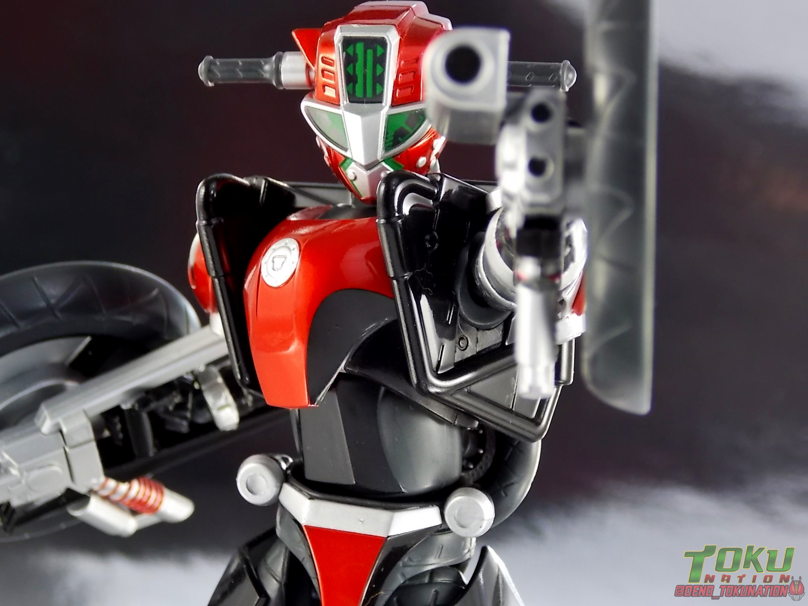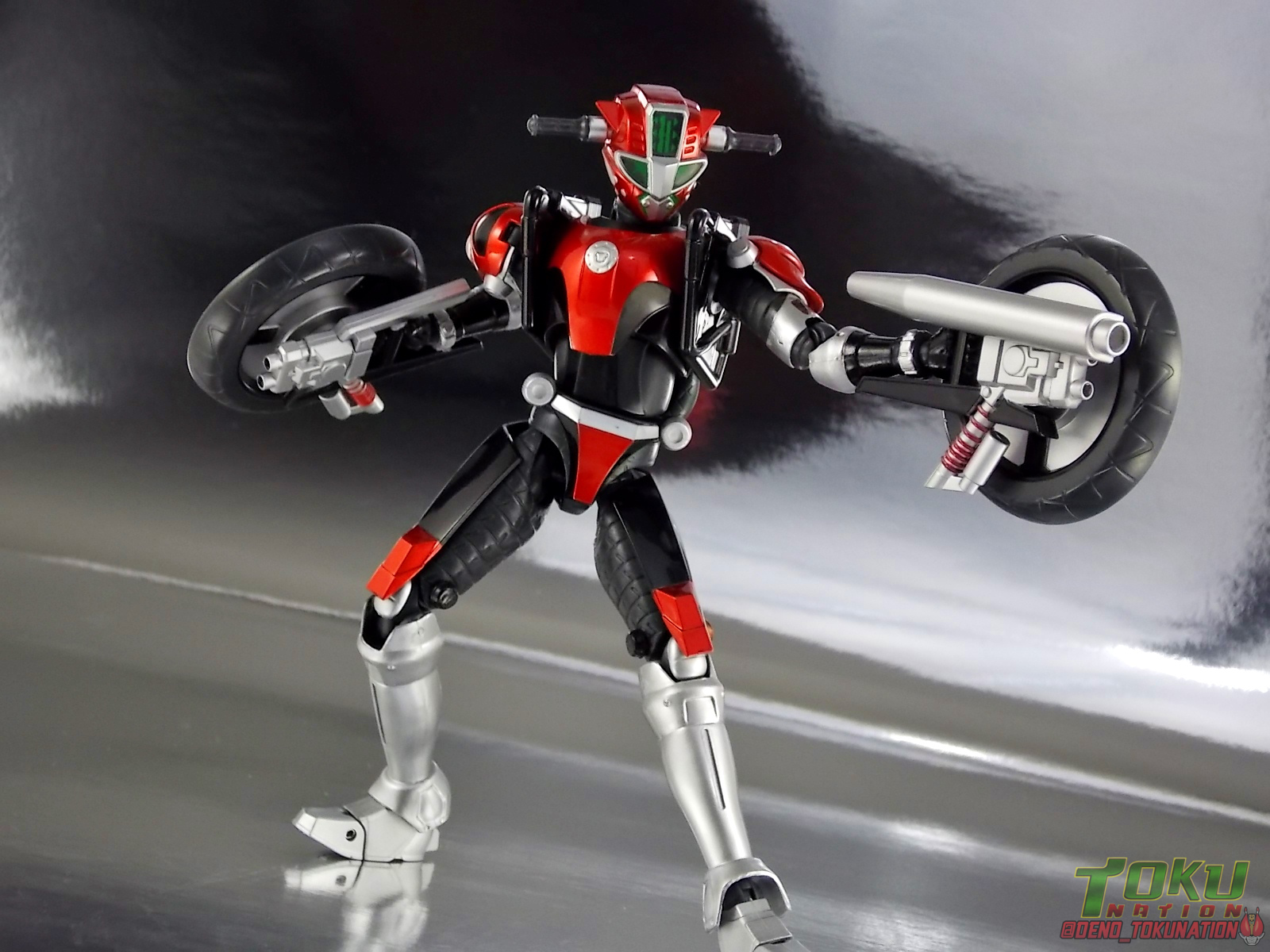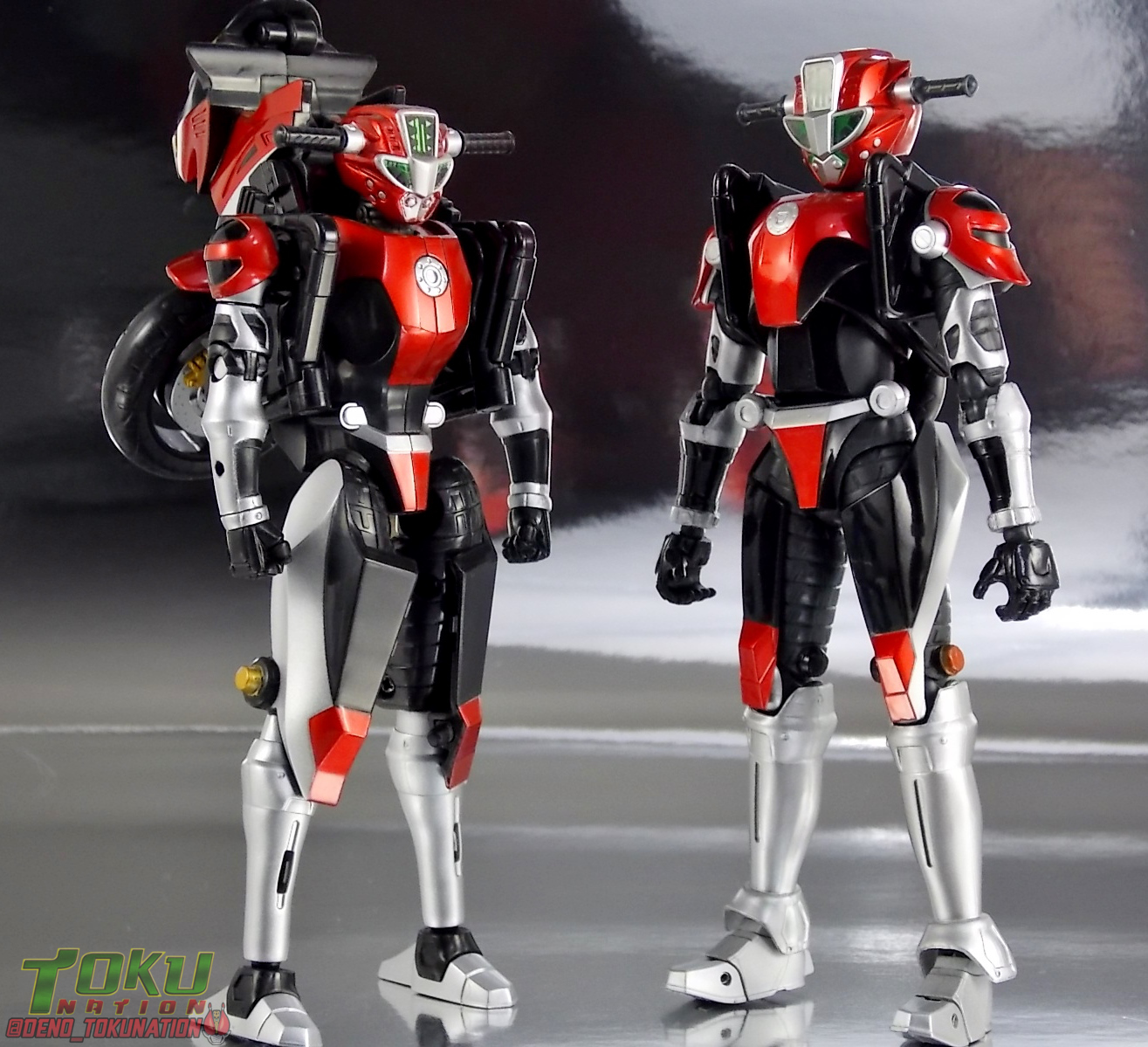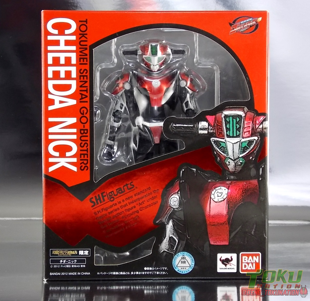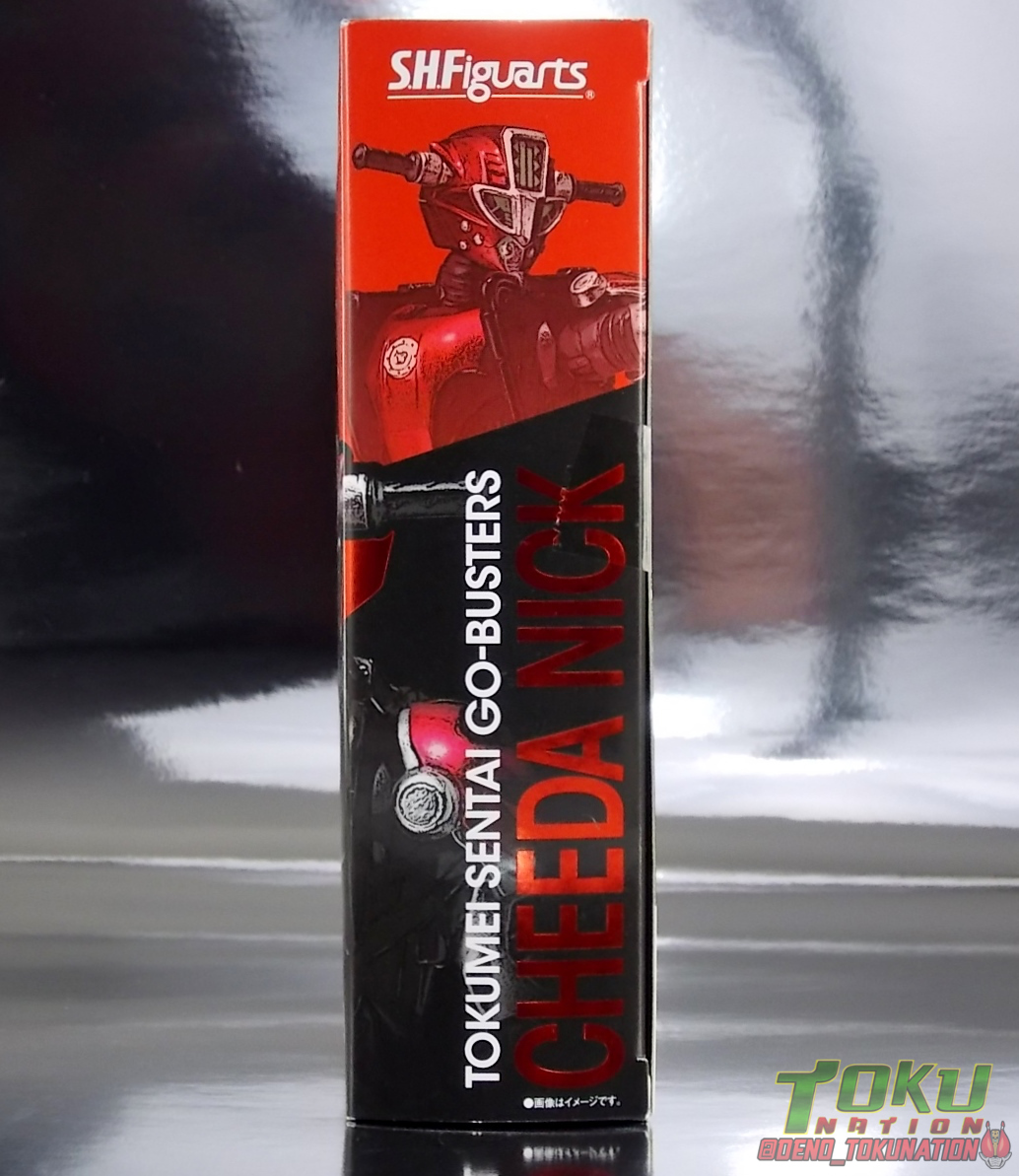 Continuing my retrospective look back at the figures released for Tokumei Sentai Go-Busters we've got another gallery 2.0 for you. Last time we caught up with a look back at S.H. Figuarts Red Buster. Today we're taking a look at his robotic partner, his buddy, S.H. Figuarts Nick Cheeda! Nick is of course the first of the 3 companion Buddyroids for the team. Uniquely of the 3 Buddyroids Nick is the only with the ability to transform, and also the only one to go out into the field regularly and face combat. While this figure can't transform into his bike mode it gets the point of Nick's fun loving directionless personality across perfectly. Read on below! Packaging As I mentioned last time, Go-Busters figuarts featured some really creative packaging. And I still think that's true. Nicks' box features all the same series hallmarks and logos as part of it's design that Red Buster did. Even that wonderful "shades" logo. The metallic reflective cardboard makes it feel premium, which in this case is beneficial as Nick was released as a Tamashii Web Exclusive. Stock photos don't offer much but frankly the figure demonstrates why, more on that below. Obviously when it comes to Japanese names the family name is spoken first followed by the first name. So Nick's name is spoken as "Cheeda Nick" and is written that way on the box. However for the sake of ease when referring to the figure, and framing it in English, I'm just gonna stick to saying Nick Cheeda. Main Figure S.H. Figuarts Nick Cheeda is a brand new mold when compared to Red Buster. They share no similar parts at all. Most of the time when a figuarts subline begins you get several figures with similar design and new tooling. But because of how radically different each of the Buddyroids are, their molding is totally unique to them. This probably explains why all 3 became Web Exclusives, but then again so were Blue & Yellow Busters. In any case Nick is a refresher after Red Buster. However in much the same Red Buster suffered from design deficiencies so too does Nick. For starters Nick has very odd legs. While the design of this figure is truly faithful, it doen't attempt to fix the design to work in toy form. The figure doesn't take into account how everything functions on a human wearing a suit as opposed to a toy with limited mobility. Nick has toes that curve upwards in their resting position. Meaning with the added weight on his back this makes for precarious posing, even for basic generic stances. The hips likewise have large silver/black protrusions that impact the waist and keep the legs from reaching a full range of motion. You can either get some pretty boring poses out of them or you have to work the protrusions past the waist for crazy leg splits. There's not much of an in-between. Add on top of this that the hips themselves are rather loose and you see the main problem with the figure. Making up for this the torso components are actually really great. Again this is a faithful sculpt. Nick has a nice floating upper torso that can angle out pretty well, the black struts/shoulders don't really impact that. Surprisingly he has much better arm movement than Red Buster himself thanks to higned shoulder pads and improved elbow joints. The plastic tolerances seem to be greatly improved as well. The headsculpt is totally on point too. Nick's head & face is of course what becomes his motorcycle modes' handlebars & gauges. Now this figure can't transform into that mode but the detailing is present that would make you believe it could. Nick's eyes and forehead are actually painted then overlayed with translucent plastic to give the gauges an authentic look. And yes of course, as you can see below, Nick can reach up and 'rev' his own handlebars. On his back you'll also see sculpted in details that mimic the front wheel and nose of his motorcycle mode. Albeit in a mass shifted and slimmed down form. Though this is accurate to the show suit as well. While Nick Cheeda is far from perfect, this figure winds up having a pretty deep personality. You can jut hear Nick shouting "Hiromu!" when posed running. A Tamashii Stage & some effect parts go a long way to complementing this figure. A quick comparison VS the old retail toy transforming MBAF Nick Cheeda, shows that S.H. Figuarts Nick Cheeda is indeed the winner. And Nick can ride himself (sort of). Accessories Nick includes just a few essential accessories: 2 - open "holding things" hands. Included to use the following weapons. 2 - Rear Wheel Guns. These weapons are rarely used by Nick in show but necessary for inclusion with this figure. They make up the missing mass lost in the transition from his bike to Buddyroid mode. When transforming in show Nick usually just uses some CGI magic to go from bike to complete robot without these guns showing up much. Technically they should always be present but oh well. The only difference between the two is that the left hand gun has a removable exhaust pipe that you'll need to pop off to get it in his hand. It plugs back on securely. They can be a little difficult to get into his fists but once there they're nice and secure. They're a little large and clunky but you can get some decent poses out of them. The only limitation is the design of Nick himself. Honestly the Buddyroids didn't use many items or accessories in show. So I was never surprised by how little Nick came with. This figure predates the now semi-typical trend of transforming characters getting figuarts that actually can transform. Nick came out long before the like of Auto Vaijin or the soon to be release Dragranzer. So it's understandable he can't transform, but I would have gladly paid more for a figure that could. Final Thoughts As with Red Buster, even after all these years flaws & all, I'm still more than happy to own S.H. Figuarts Nick Cheeda. Tokumei Sentai Go-Busters is still one of my favorite shows ever so I'm happy to have these figures. Even knowing the team will never be complet