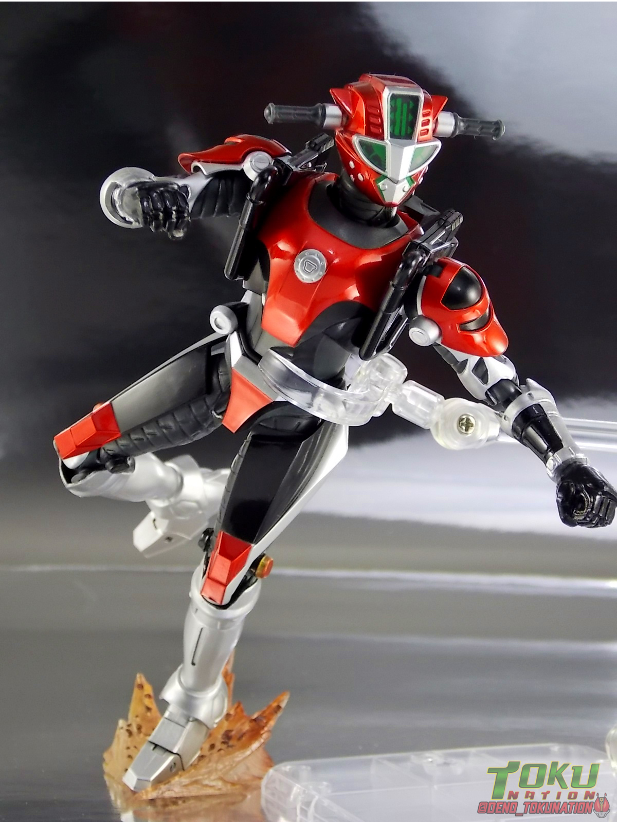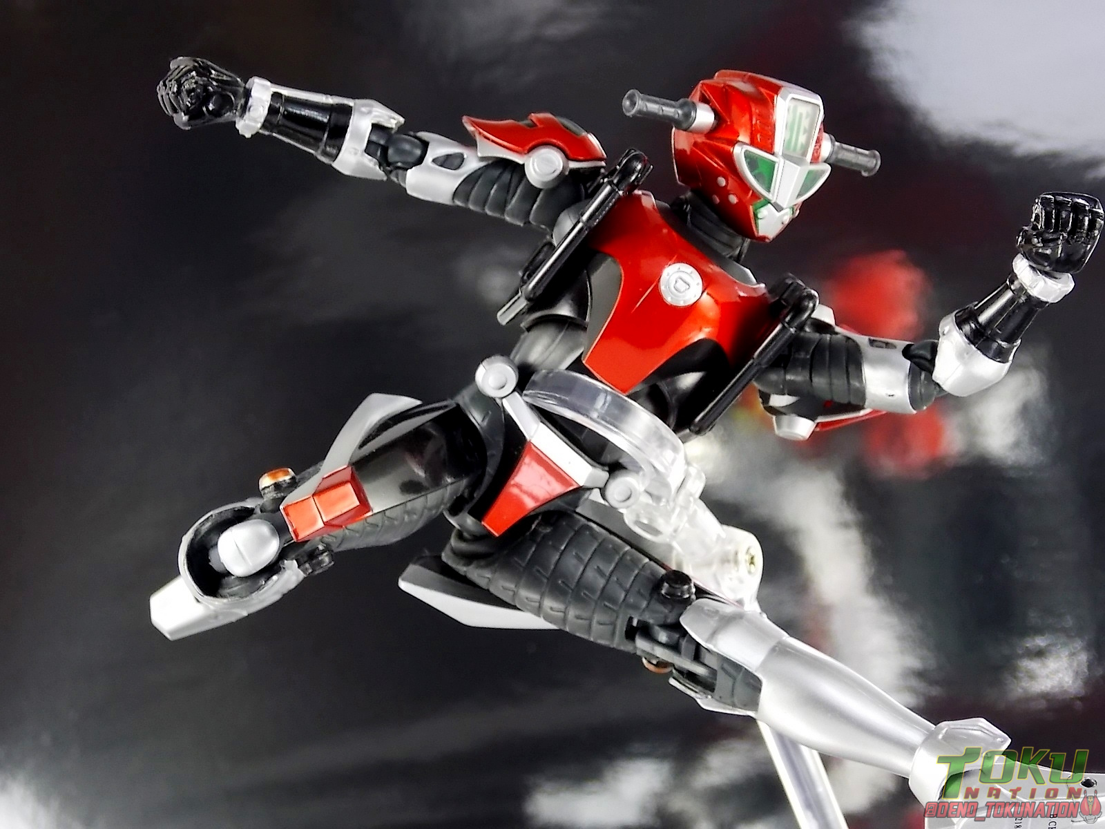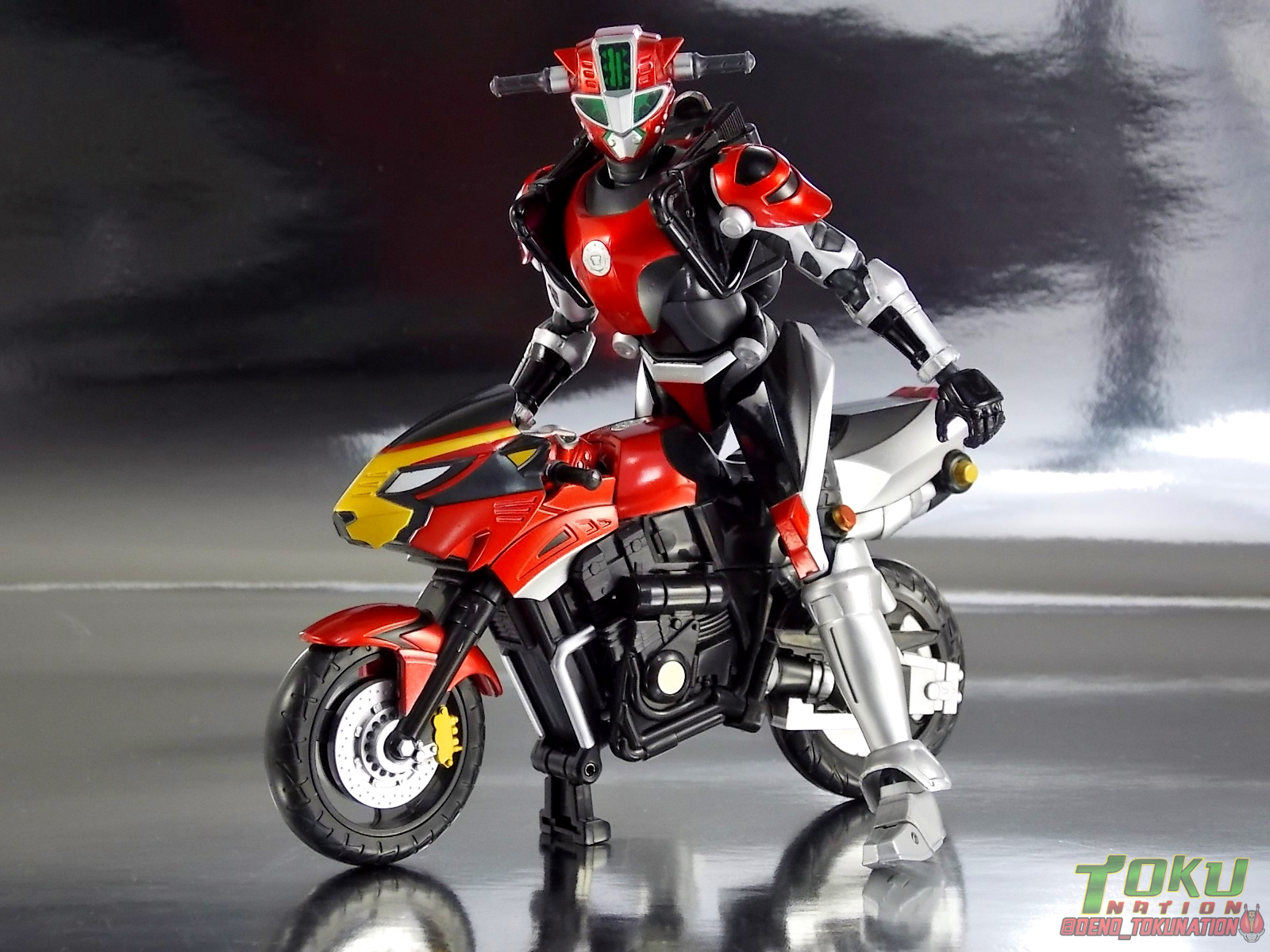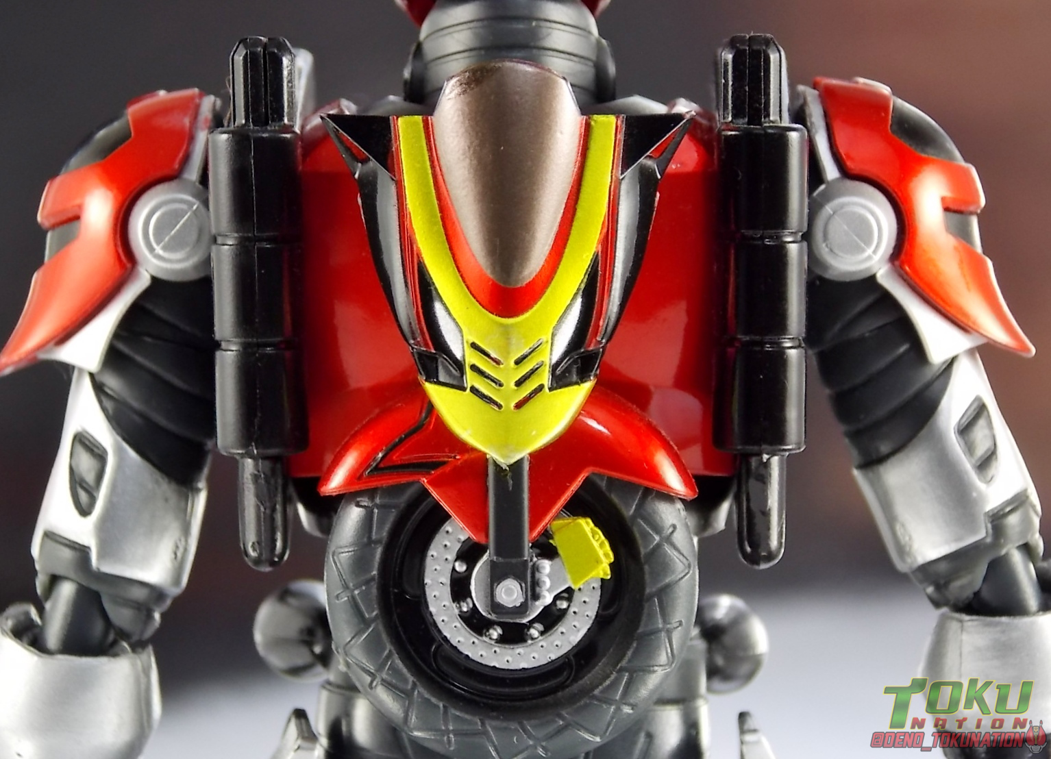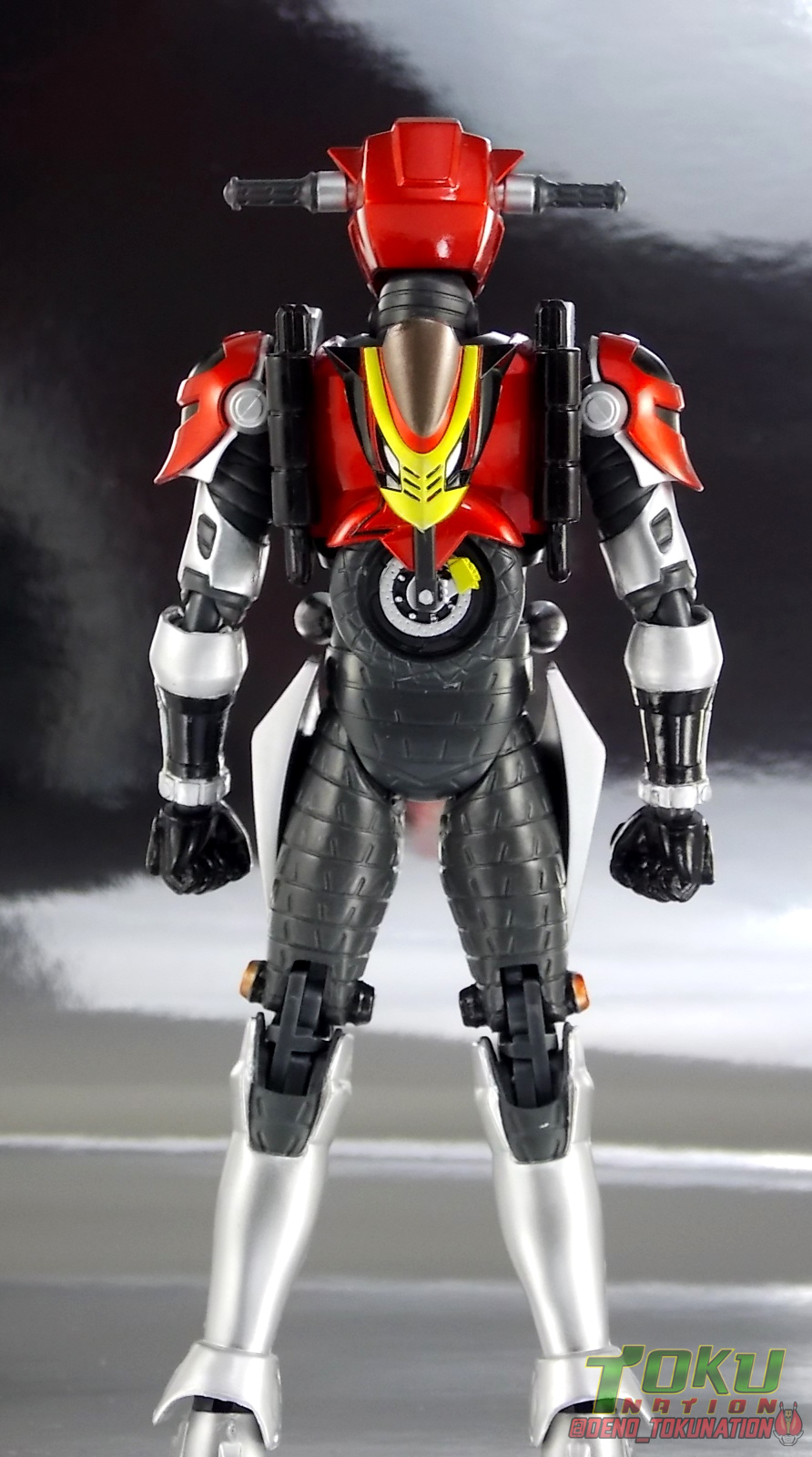 Continuing my retrospective look back at the figures released for Tokumei Sentai Go-Busters we've got another gallery 2.0 for you. Last time we caught up with a look back at S.H. Figuarts Red Buster. Today we're taking a look at his robotic partner, his buddy, S.H. Figuarts Nick Cheeda! Nick is of course the first of the 3 companion Buddyroids for the team. Uniquely of the 3 Buddyroids Nick is the only with the ability to transform, and also the only one to go out into the field regularly and face combat. While this figure can't transform into his bike mode it gets the point of Nick's fun loving directionless personality across perfectly. Read on below! Packaging As I mentioned last time, Go-Busters figuarts featured some really creative packaging. And I still think that's true. Nicks' box features all the same series hallmarks and logos as part of it's design that Red Buster did. Even that wonderful "shades" logo. The metallic reflective cardboard makes it feel premium, which in this case is beneficial as Nick was released as a Tamashii Web Exclusive. Stock photos don't offer much but frankly the figure demonstrates why, more on that below. Obviously when it comes to Japanese names the family name is spoken first followed by the first name. So Nick's name is spoken as "Cheeda Nick" and is written that way on the box. However for the sake of ease when referring to the figure, and framing it in English, I'm just gonna stick to saying Nick Cheeda. Main Figure S.H. Figuarts Nick Cheeda is a brand new mold when compared to Red Buster. They share no similar parts at all. Most of the time when a figuarts subline begins you get several figures with similar design and new tooling. But because of how radically different each of the Buddyroids are, their molding is totally unique to them. This probably explains why all 3 became Web Exclusives, but then again so were Blue & Yellow Busters. In any case Nick is a refresher after Red Buster. However in much the same Red Buster suffered from design deficiencies so too does Nick. For starters Nick has very odd legs. While the design of this figure is truly faithful, it doen't attempt to fix the design to work in toy form. The figure doesn't take into account how everything functions on a human wearing a suit as opposed to a toy with limited mobility. Nick has toes that curve upwards in their resting position. Meaning with the added weight on his back this makes for precarious posing, even for basic generic stances. The hips likewise have large silver/black protrusions that impact the waist and keep the legs from reaching a full range of motion. You can either get some pretty boring poses out of them or you have to work the protrusions past the waist for crazy leg splits. There's not much of an in-between. Add on top of this that the hips themselves are rather loose and you see the main problem with the figure. Making up for this the torso components are actually really great. Again this is a faithful sculpt. Nick has a nice floating upper torso that can angle out pretty well, the black struts/shoulders don't really impact that. Surprisingly he has much better arm movement than Red Buster himself thanks to higned shoulder pads and improved elbow joints. The plastic tolerances seem to be greatly improved as well. The headsculpt is totally on point too. Nick's head & face is of course what becomes his motorcycle modes' handlebars & gauges. Now this figure can't transform into that mode but the detailing is present that would make you believe it could. Nick's eyes and forehead are actually painted then overlayed with translucent plastic to give the gauges an authentic look. And yes of course, as you can see below, Nick can reach up and 'rev' his own handlebars. On his back you'll also see sculpted in details that mimic the front wheel and nose of his motorcycle mode. Albeit in a mass shifted and slimmed down form. Though this is accurate to the show suit as well. While Nick Cheeda is far from perfect, this figure winds up having a pretty deep personality. You can jut hear Nick shouting "Hiromu!" when posed running. A Tamashii Stage & some effect parts go a long way to complementing this figure. A quick comparison VS the old retail toy transforming MBAF Nick Cheeda, shows that S.H. Figuarts Nick Cheeda is indeed the winner. And Nick can ride himself (sort of). Accessories Nick includes just a few essential accessories: 2 - open "holding things" hands. Included to use the following weapons. 2 - Rear Wheel Guns. These weapons are rarely used by Nick in show but necessary for inclusion with this figure. They make up the missing mass lost in the transition from his bike to Buddyroid mode. When transforming in show Nick usually just uses some CGI magic to go from bike to complete robot without these guns showing up much. Technically they should always be present but oh well. The only difference between the two is that the left hand gun has a removable exhaust pipe that you'll need to pop off to get it in his hand. It plugs back on securely. They can be a little difficult to get into his fists but once there they're nice and secure. They're a little large and clunky but you can get some decent poses out of them. The only limitation is the design of Nick himself. Honestly the Buddyroids didn't use many items or accessories in show. So I was never surprised by how little Nick came with. This figure predates the now semi-typical trend of transforming characters getting figuarts that actually can transform. Nick came out long before the like of Auto Vaijin or the soon to be release Dragranzer. So it's understandable he can't transform, but I would have gladly paid more for a figure that could. Final Thoughts As with Red Buster, even after all these years flaws & all, I'm still more than happy to own S.H. Figuarts Nick Cheeda. Tokumei Sentai Go-Busters is still one of my favorite shows ever so I'm happy to have these figures. Even knowing the team will never be complet