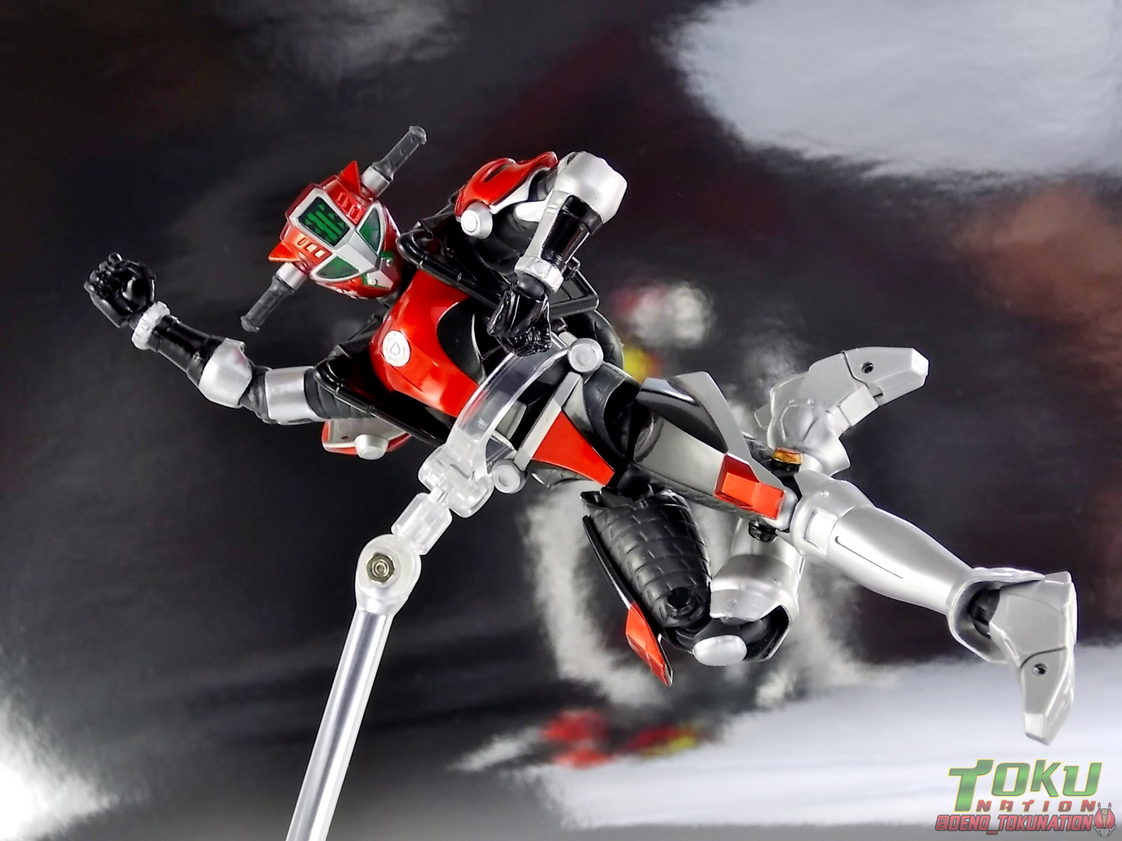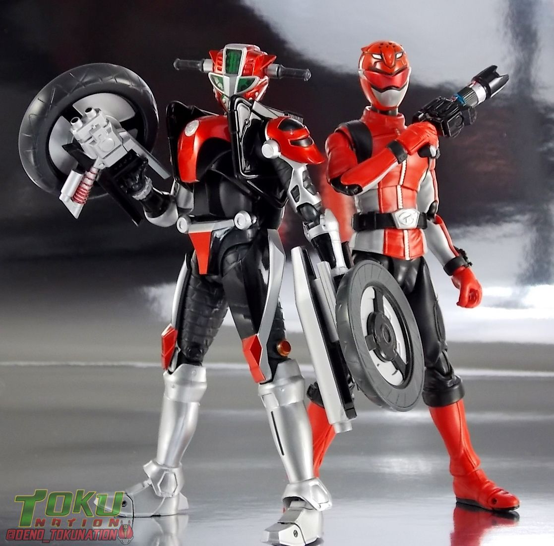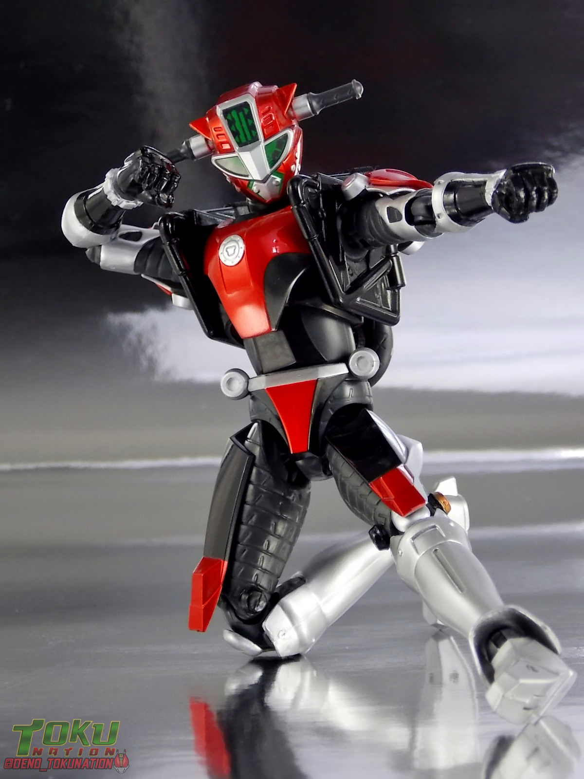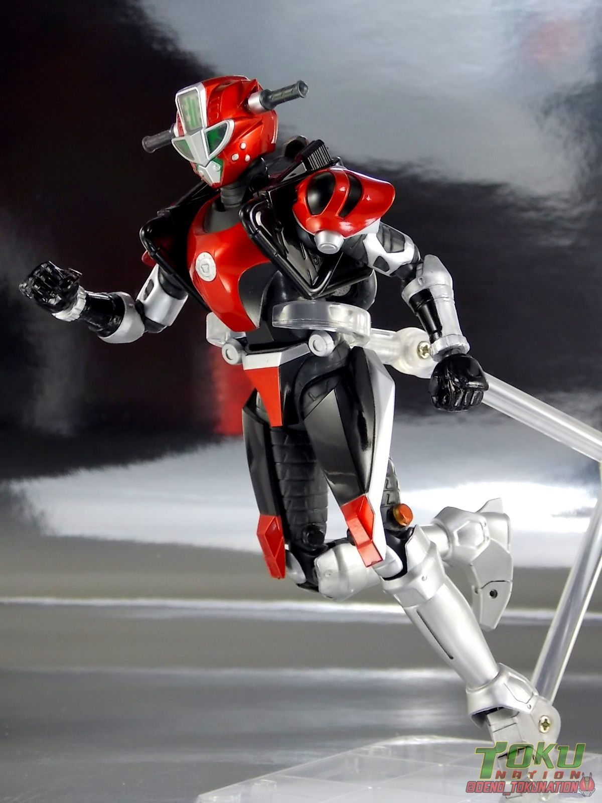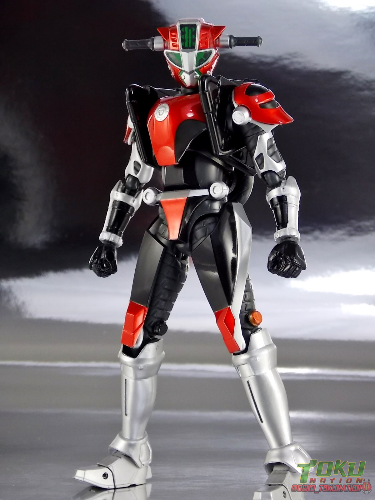 Continuing my retrospective look back at the figures released for Tokumei Sentai Go-Busters we've got another gallery 2.0 for you. Last time we caught up with a look back at S.H. Figuarts Red Buster. Today we're taking a look at his robotic partner, his buddy, S.H. Figuarts Nick Cheeda! Nick is of course the first of the 3 companion Buddyroids for the team. Uniquely of the 3 Buddyroids Nick is the only with the ability to transform, and also the only one to go out into the field regularly and face combat. While this figure can't transform into his bike mode it gets the point of Nick's fun loving directionless personality across perfectly. Read on below! Packaging As I mentioned last time, Go-Busters figuarts featured some really creative packaging. And I still think that's true. Nicks' box features all the same series hallmarks and logos as part of it's design that Red Buster did. Even that wonderful "shades" logo. The metallic reflective cardboard makes it feel premium, which in this case is beneficial as Nick was released as a Tamashii Web Exclusive. Stock photos don't offer much but frankly the figure demonstrates why, more on that below. Obviously when it comes to Japanese names the family name is spoken first followed by the first name. So Nick's name is spoken as "Cheeda Nick" and is written that way on the box. However for the sake of ease when referring to the figure, and framing it in English, I'm just gonna stick to saying Nick Cheeda. Main Figure S.H. Figuarts Nick Cheeda is a brand new mold when compared to Red Buster. They share no similar parts at all. Most of the time when a figuarts subline begins you get several figures with similar design and new tooling. But because of how radically different each of the Buddyroids are, their molding is totally unique to them. This probably explains why all 3 became Web Exclusives, but then again so were Blue & Yellow Busters. In any case Nick is a refresher after Red Buster. However in much the same Red Buster suffered from design deficiencies so too does Nick. For starters Nick has very odd legs. While the design of this figure is truly faithful, it doen't attempt to fix the design to work in toy form. The figure doesn't take into account how everything functions on a human wearing a suit as opposed to a toy with limited mobility. Nick has toes that curve upwards in their resting position. Meaning with the added weight on his back this makes for precarious posing, even for basic generic stances. The hips likewise have large silver/black protrusions that impact the waist and keep the legs from reaching a full range of motion. You can either get some pretty boring poses out of them or you have to work the protrusions past the waist for crazy leg splits. There's not much of an in-between. Add on top of this that the hips themselves are rather loose and you see the main problem with the figure. Making up for this the torso components are actually really great. Again this is a faithful sculpt. Nick has a nice floating upper torso that can angle out pretty well, the black struts/shoulders don't really impact that. Surprisingly he has much better arm movement than Red Buster himself thanks to higned shoulder pads and improved elbow joints. The plastic tolerances seem to be greatly improved as well. The headsculpt is totally on point too. Nick's head & face is of course what becomes his motorcycle modes' handlebars & gauges. Now this figure can't transform into that mode but the detailing is present that would make you believe it could. Nick's eyes and forehead are actually painted then overlayed with translucent plastic to give the gauges an authentic look. And yes of course, as you can see below, Nick can reach up and 'rev' his own handlebars. On his back you'll also see sculpted in details that mimic the front wheel and nose of his motorcycle mode. Albeit in a mass shifted and slimmed down form. Though this is accurate to the show suit as well. While Nick Cheeda is far from perfect, this figure winds up having a pretty deep personality. You can jut hear Nick shouting "Hiromu!" when posed running. A Tamashii Stage & some effect parts go a long way to complementing this figure. A quick comparison VS the old retail toy transforming MBAF Nick Cheeda, shows that S.H. Figuarts Nick Cheeda is indeed the winner. And Nick can ride himself (sort of). Accessories Nick includes just a few essential accessories: 2 - open "holding things" hands. Included to use the following weapons. 2 - Rear Wheel Guns. These weapons are rarely used by Nick in show but necessary for inclusion with this figure. They make up the missing mass lost in the transition from his bike to Buddyroid mode. When transforming in show Nick usually just uses some CGI magic to go from bike to complete robot without these guns showing up much. Technically they should always be present but oh well. The only difference between the two is that the left hand gun has a removable exhaust pipe that you'll need to pop off to get it in his hand. It plugs back on securely. They can be a little difficult to get into his fists but once there they're nice and secure. They're a little large and clunky but you can get some decent poses out of them. The only limitation is the design of Nick himself. Honestly the Buddyroids didn't use many items or accessories in show. So I was never surprised by how little Nick came with. This figure predates the now semi-typical trend of transforming characters getting figuarts that actually can transform. Nick came out long before the like of Auto Vaijin or the soon to be release Dragranzer. So it's understandable he can't transform, but I would have gladly paid more for a figure that could. Final Thoughts As with Red Buster, even after all these years flaws & all, I'm still more than happy to own S.H. Figuarts Nick Cheeda. Tokumei Sentai Go-Busters is still one of my favorite shows ever so I'm happy to have these figures. Even knowing the team will never be complet