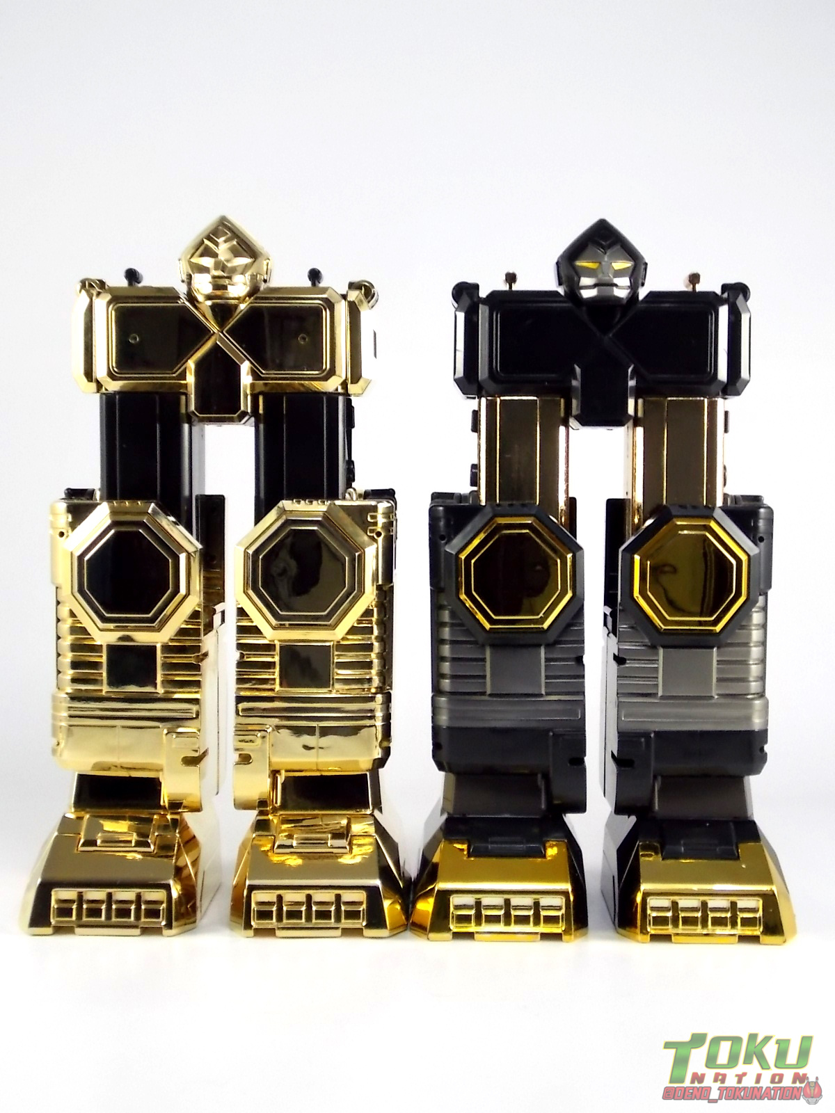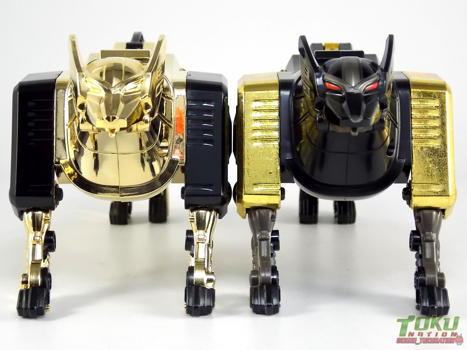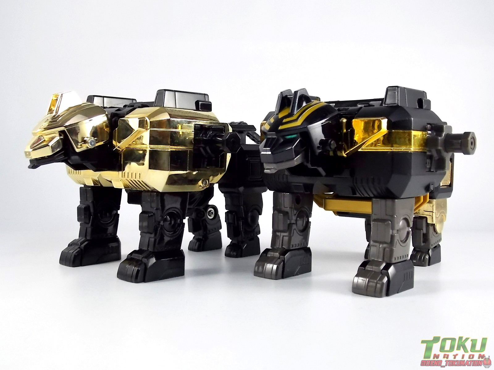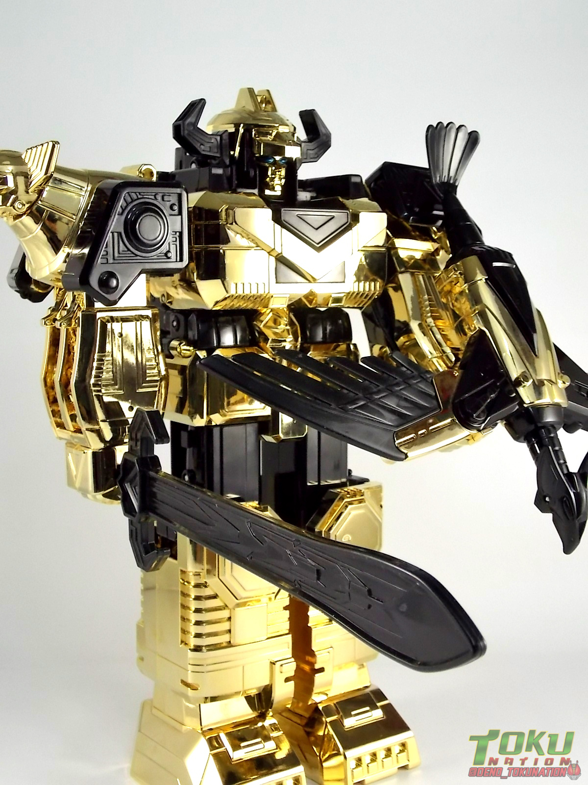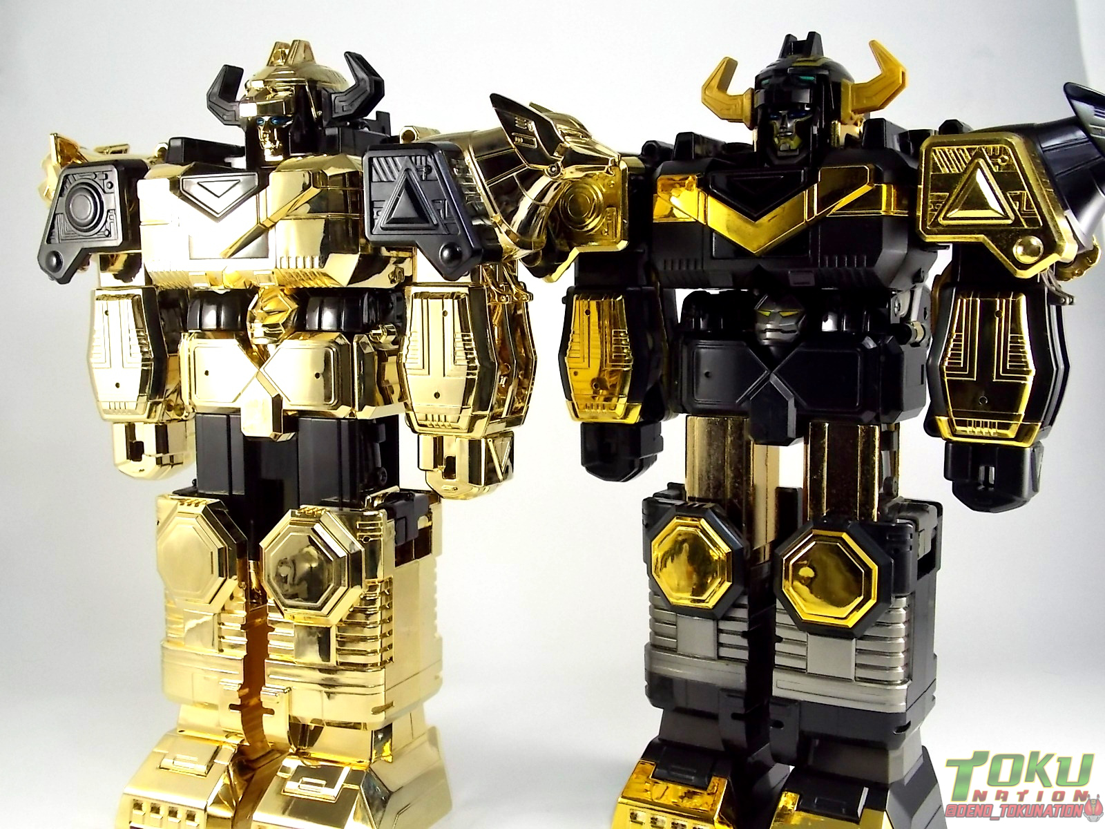 So what do we know about it? As far as anyone knows an extremely limited number of Gold Galaxy Megazords were produced. In similar fashion to Lucky Draw releases from Bandai Japan, this set exists only in double digit numbers. Originally thought to have only been manufactured in a run of less than 10, in recent years it's come to light that as many as 15+ of these gorgeous sets were produced. Originally sold as FAO Schwartz exclusives each Gold Galaxy Megazord included a Certificate for the buyer as "proof" of their ownership of the set. The one included with my Megazord is luckily still blank. After the initial FAO Schwartz run a handful of these Megazords were given away some years later as prizes. These sets rarely turn up for sale and often for staggering prices. Though there aren't many of them left in circulation, prices can range anywhere from about the $500 mark to upwards of $1500 and beyond in some earlier documented sales. I simply lucked into finding this set for an absurdly good deal. And I could not pass up the opportunity to share an incredible piece of Power Rangers & toy collecting history with the community. So here we are! Below you'll find a quick overview of each component and the combined form with photo comparisons to Black GingaiOh for reference. I hope you enjoy it! Packaging As with most special color releases in toy lines, the Gold Galaxy Megazord comes packaged in the same box as the original release, though with significantly altered colors. The entire packaging is done up in black & gray with gold accents. The stock images of the toys show them in their true black & gold colors but everything else is muted. Including the cross-sells for the Stratoforce & Centaurus Megazords on the side. The inner packaging is the exact same styrofoam tray as the normal Galaxy Megazord. The packaging as a whole is of course totally different from either of the original Japanese GingaiOh releases. The box and styrofoam were re-designed to be a few inches shorter and more compact for US store shelves. I have to mention that it's a little difficult to determine exactly which surfaces are true 14K Gold or vacuum metalized gold chrome. While undoubtedly the actual diecast components that are gold have the 14K plating, that my not necessarily be true for the rest of everything. Regardless the gold looks identical on nearly every surface where it's present. Components Gorilla We'll kick the review proper off with the Gorilla Galactabeast. In this rendition of the figure, nearly every visible surface is golden. The only portions of this figure not covered in gold in one form or another are the forearm and the top of the shoulder area. Even the underside of the feet where the Megazord fists are stored is golden. Now of course this presents a fairly wide spread fingerprint issue. LOL. Once transformed for its part of the Megazord combination you can see the exposed thighs are actually black as well as the small hinges the Gorilla arms rotate on. As you can see the Black Starbeast Gingarilla has a radically different color scheme with a much more vibrant gold, though much less of it. As with all the figures in these 2 sets, this pair couldn't be more different. Down to an including the shade of gold used. Condor Perhaps the most bland member of this team is the Condor Galactabeast. With no paint applications whatsoever this figure can look rather boring. The Gold applications are limited to the wing hinges, as well as the back plate and the underside of the bird beneath the black diecast chest plate. This gold is only visible when the Condor is used for it's crossbow mode. Between these two figures, the Black Starbeast Gingalcon is the clear winner with the additional paint apps, though it lacks somewhat in gold. At least on these two the gold chrome appears to be nearly the same color. Lion The Lion Galactabeast has a nice liberal gold chrome application applied to the section that becomes the Galaxy Megazord head as well as it's chest/shoulders. Because of the where the gold is located it can be difficult to transform the lion without getting a number of finger prints on it. Interestingly when transforming it to the chest component the chunk that slides forward to fill out the gap left by the head is mostly black with gold trim. More interesting is that the head features the only paint app in the entire set, the Galaxy Megazords' eyes are painted blue! Likely to make them distinguishable in the sea of gold chrome. The Lion itself could have benefited from some eye paint apps. Again the contrast between this piece and its' Black Starbeast Gingaleon counterpart is striking. Wildcat With the Wildat Galactabeast we come to the figure that relates most to it's Black GingaiOh counterpart, Black Starbeast Gingat. These two are practically inverses of one another. Where a part is golden on Wildcat, it's black or grey on Gingat. Tail, front hips, legs, head. It's just a really poignant comparison between these two. Wildcat indeed looks great with all that gold, it just needs a few paint apps to break things up. As is the only non-gold components at all are the toes, tail, and front hips. Even when you use the Gorilla's fist on it for combined mode those too are solid gold. Wolf The Wolf Galactabeast is basically identical to the Wildcat in design. And shares a similar type of inversion with it's Black Starbeast Gingaverick counterpart. This piece features gold and black applied in all the same places, has an identical transformation and fist as well as the aforementioned lack of paint apps. Galaxy Megazord When fully combined into the Gold Galaxy Megazord this set really shines. Literally. The black accents that do exist serve to break up the monotony of the color scheme decently enough and help unify the design more. Disappointingly the Galaxy Megazord Saber included with this set is only cast in an incredibly dull black plastic with no gold plating or paint at all. However this doesn't detra