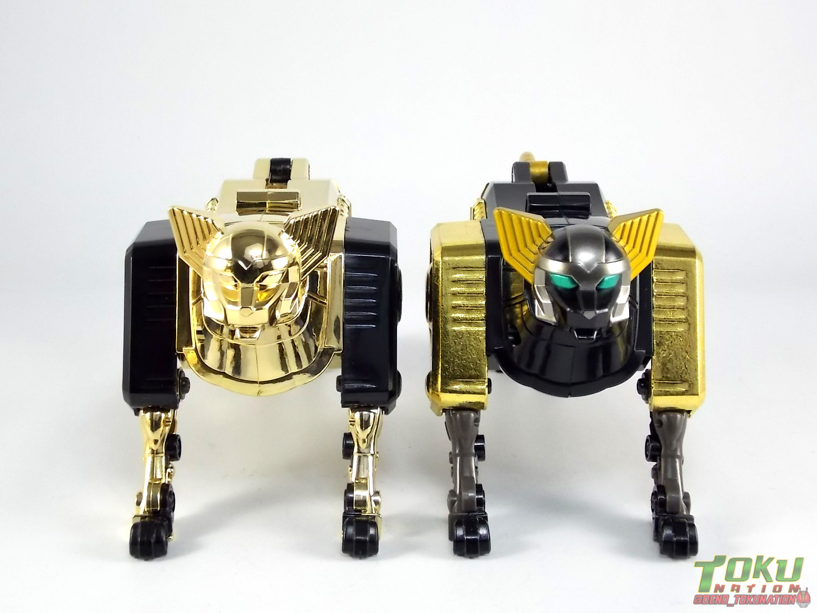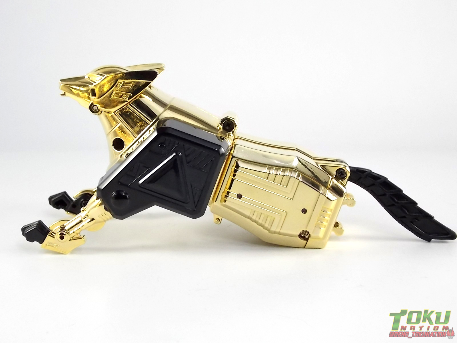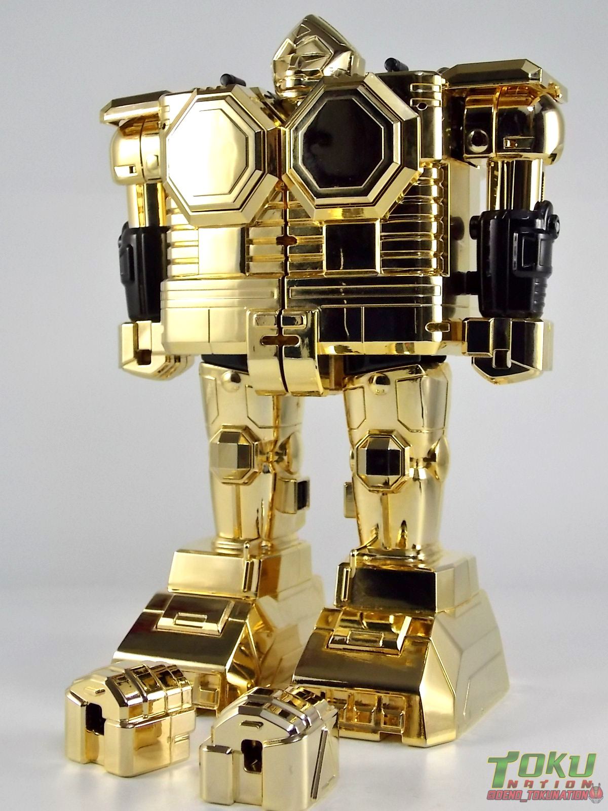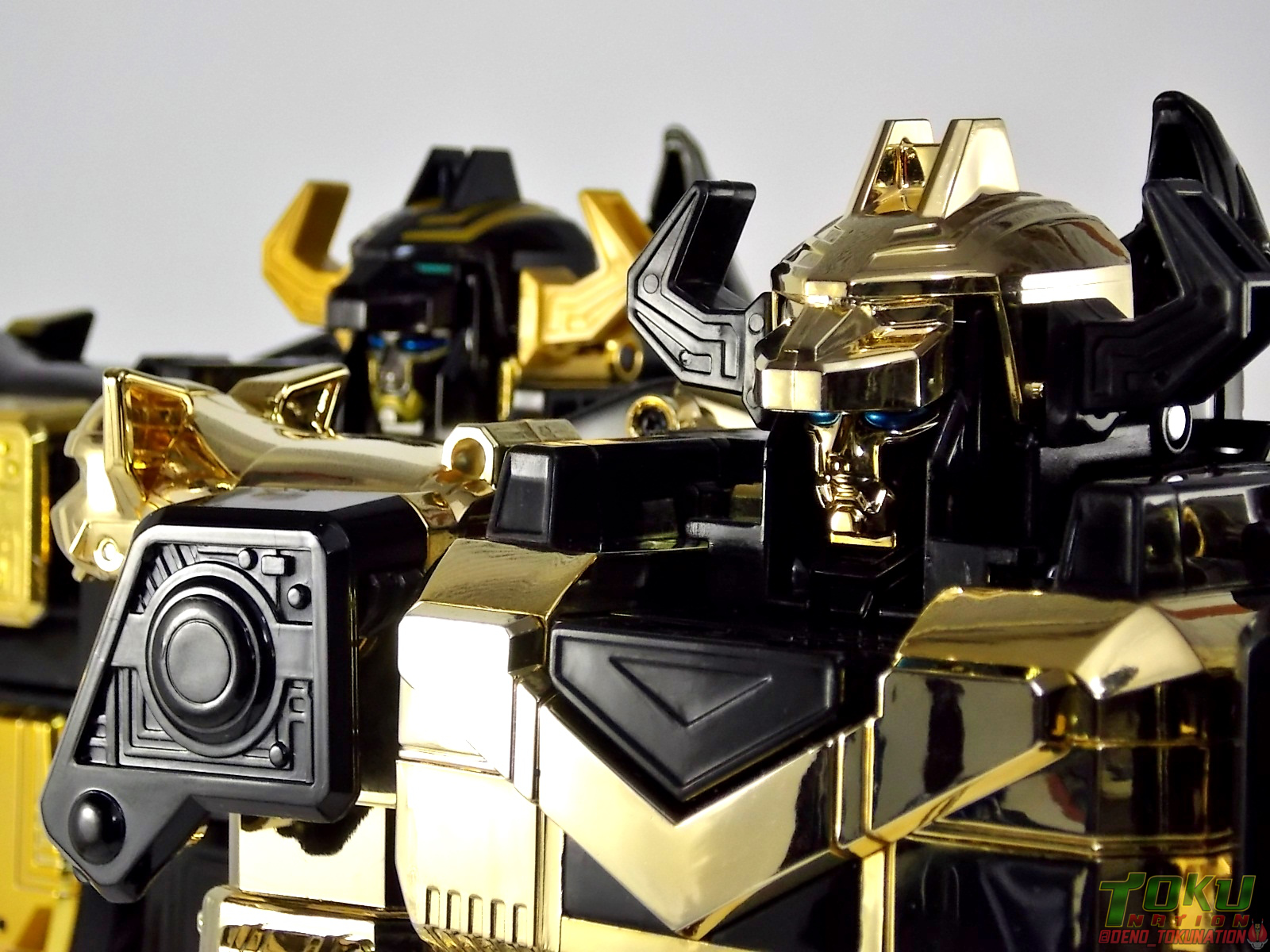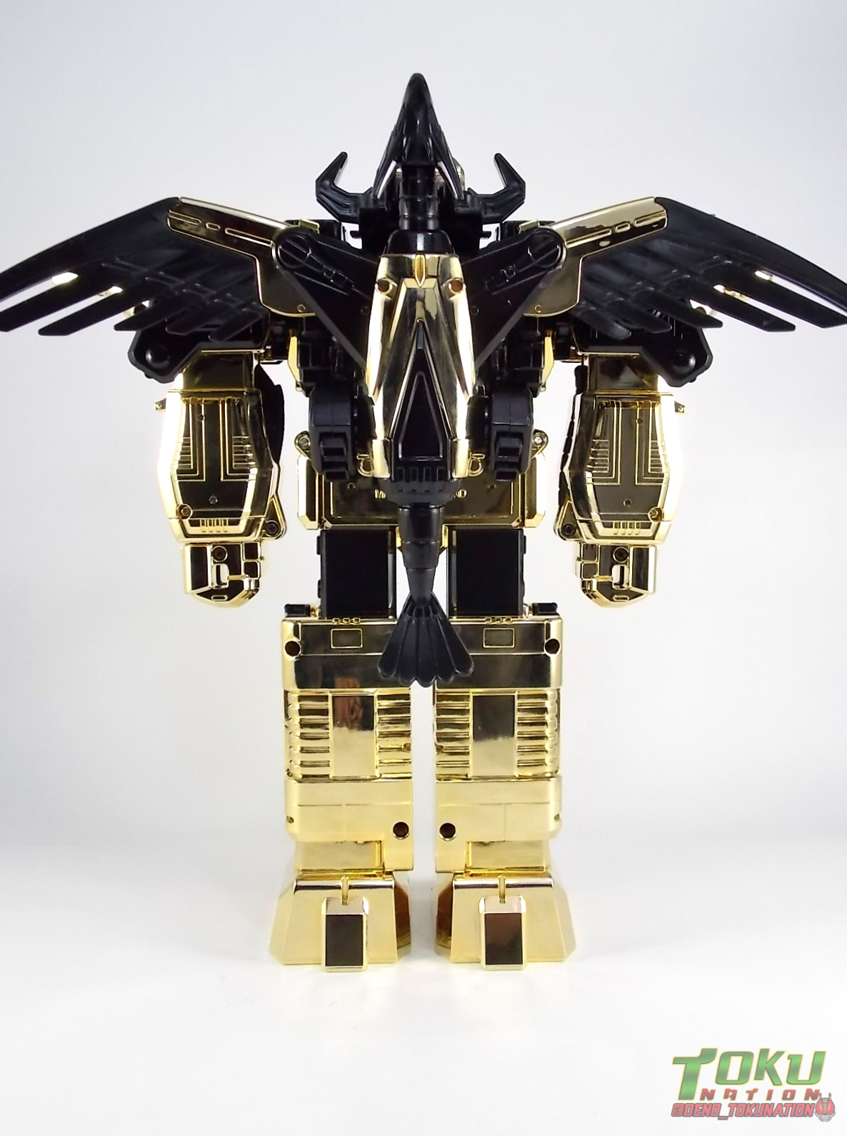 So what do we know about it? As far as anyone knows an extremely limited number of Gold Galaxy Megazords were produced. In similar fashion to Lucky Draw releases from Bandai Japan, this set exists only in double digit numbers. Originally thought to have only been manufactured in a run of less than 10, in recent years it's come to light that as many as 15+ of these gorgeous sets were produced. Originally sold as FAO Schwartz exclusives each Gold Galaxy Megazord included a Certificate for the buyer as "proof" of their ownership of the set. The one included with my Megazord is luckily still blank. After the initial FAO Schwartz run a handful of these Megazords were given away some years later as prizes. These sets rarely turn up for sale and often for staggering prices. Though there aren't many of them left in circulation, prices can range anywhere from about the $500 mark to upwards of $1500 and beyond in some earlier documented sales. I simply lucked into finding this set for an absurdly good deal. And I could not pass up the opportunity to share an incredible piece of Power Rangers & toy collecting history with the community. So here we are! Below you'll find a quick overview of each component and the combined form with photo comparisons to Black GingaiOh for reference. I hope you enjoy it! Packaging As with most special color releases in toy lines, the Gold Galaxy Megazord comes packaged in the same box as the original release, though with significantly altered colors. The entire packaging is done up in black & gray with gold accents. The stock images of the toys show them in their true black & gold colors but everything else is muted. Including the cross-sells for the Stratoforce & Centaurus Megazords on the side. The inner packaging is the exact same styrofoam tray as the normal Galaxy Megazord. The packaging as a whole is of course totally different from either of the original Japanese GingaiOh releases. The box and styrofoam were re-designed to be a few inches shorter and more compact for US store shelves. I have to mention that it's a little difficult to determine exactly which surfaces are true 14K Gold or vacuum metalized gold chrome. While undoubtedly the actual diecast components that are gold have the 14K plating, that my not necessarily be true for the rest of everything. Regardless the gold looks identical on nearly every surface where it's present. Components Gorilla We'll kick the review proper off with the Gorilla Galactabeast. In this rendition of the figure, nearly every visible surface is golden. The only portions of this figure not covered in gold in one form or another are the forearm and the top of the shoulder area. Even the underside of the feet where the Megazord fists are stored is golden. Now of course this presents a fairly wide spread fingerprint issue. LOL. Once transformed for its part of the Megazord combination you can see the exposed thighs are actually black as well as the small hinges the Gorilla arms rotate on. As you can see the Black Starbeast Gingarilla has a radically different color scheme with a much more vibrant gold, though much less of it. As with all the figures in these 2 sets, this pair couldn't be more different. Down to an including the shade of gold used. Condor Perhaps the most bland member of this team is the Condor Galactabeast. With no paint applications whatsoever this figure can look rather boring. The Gold applications are limited to the wing hinges, as well as the back plate and the underside of the bird beneath the black diecast chest plate. This gold is only visible when the Condor is used for it's crossbow mode. Between these two figures, the Black Starbeast Gingalcon is the clear winner with the additional paint apps, though it lacks somewhat in gold. At least on these two the gold chrome appears to be nearly the same color. Lion The Lion Galactabeast has a nice liberal gold chrome application applied to the section that becomes the Galaxy Megazord head as well as it's chest/shoulders. Because of the where the gold is located it can be difficult to transform the lion without getting a number of finger prints on it. Interestingly when transforming it to the chest component the chunk that slides forward to fill out the gap left by the head is mostly black with gold trim. More interesting is that the head features the only paint app in the entire set, the Galaxy Megazords' eyes are painted blue! Likely to make them distinguishable in the sea of gold chrome. The Lion itself could have benefited from some eye paint apps. Again the contrast between this piece and its' Black Starbeast Gingaleon counterpart is striking. Wildcat With the Wildat Galactabeast we come to the figure that relates most to it's Black GingaiOh counterpart, Black Starbeast Gingat. These two are practically inverses of one another. Where a part is golden on Wildcat, it's black or grey on Gingat. Tail, front hips, legs, head. It's just a really poignant comparison between these two. Wildcat indeed looks great with all that gold, it just needs a few paint apps to break things up. As is the only non-gold components at all are the toes, tail, and front hips. Even when you use the Gorilla's fist on it for combined mode those too are solid gold. Wolf The Wolf Galactabeast is basically identical to the Wildcat in design. And shares a similar type of inversion with it's Black Starbeast Gingaverick counterpart. This piece features gold and black applied in all the same places, has an identical transformation and fist as well as the aforementioned lack of paint apps. Galaxy Megazord When fully combined into the Gold Galaxy Megazord this set really shines. Literally. The black accents that do exist serve to break up the monotony of the color scheme decently enough and help unify the design more. Disappointingly the Galaxy Megazord Saber included with this set is only cast in an incredibly dull black plastic with no gold plating or paint at all. However this doesn't detra