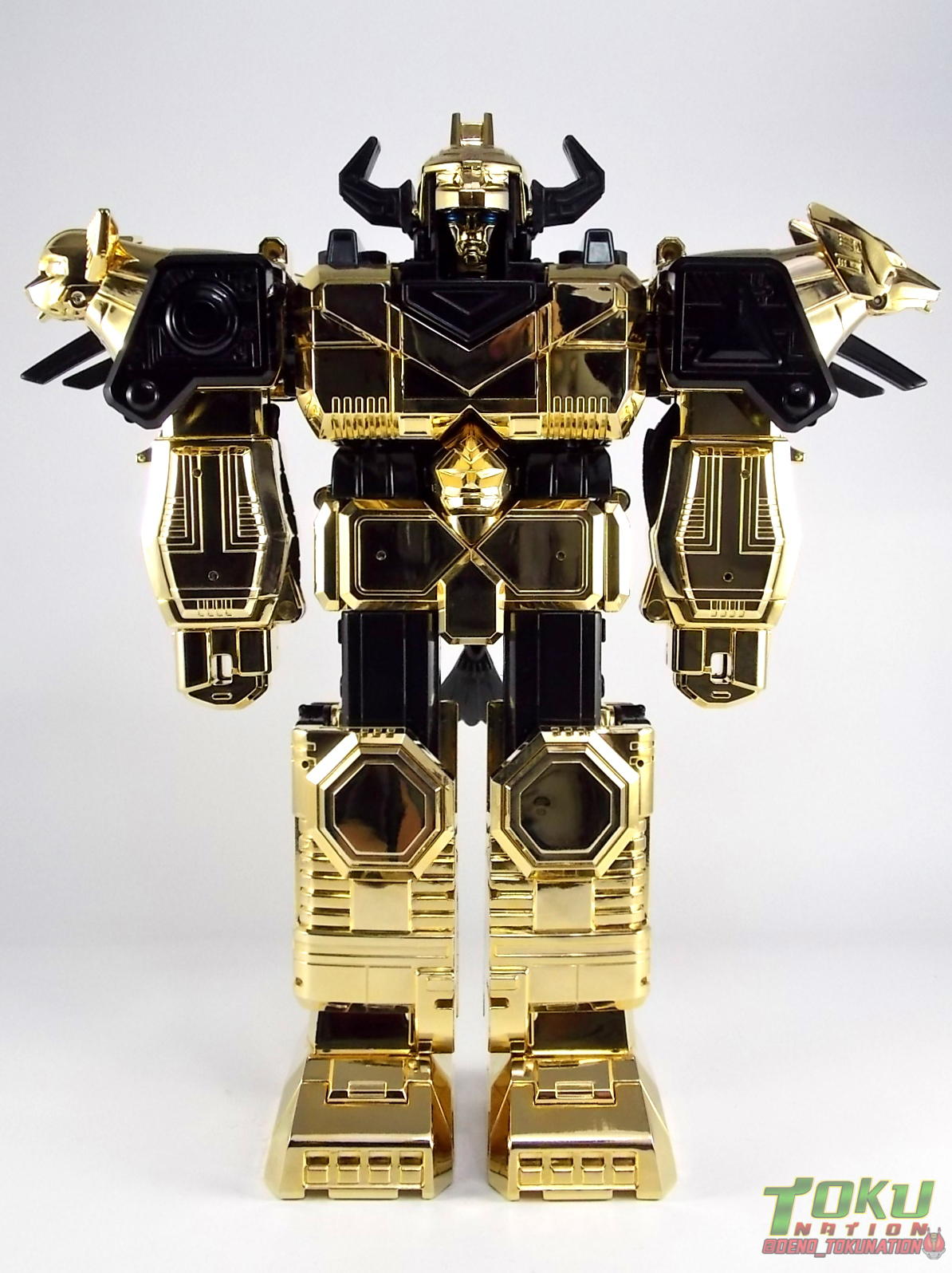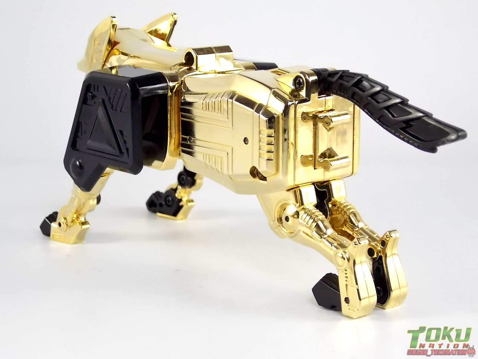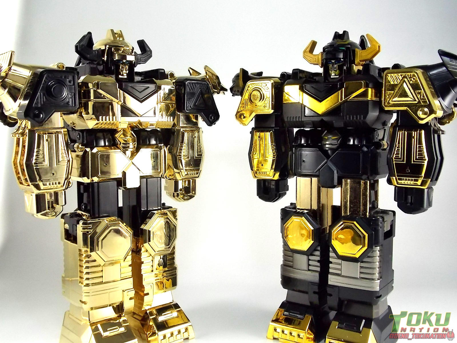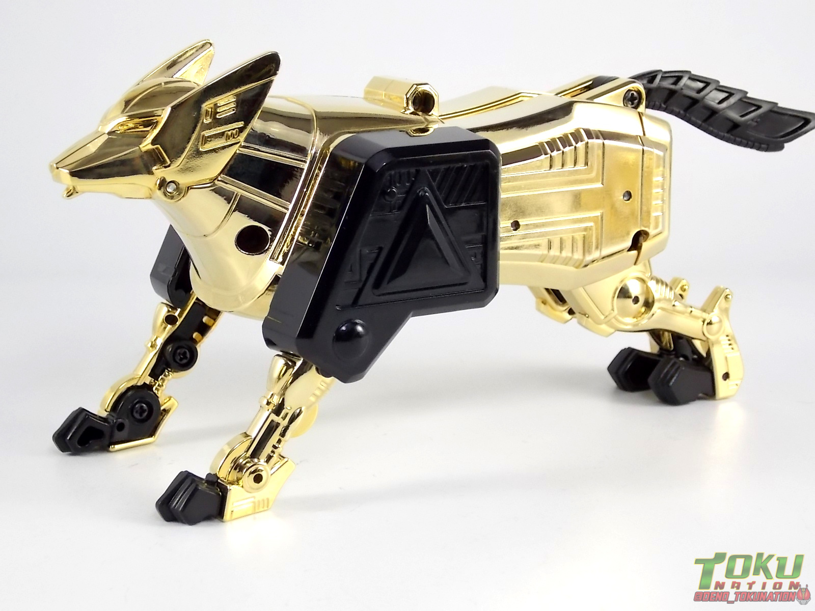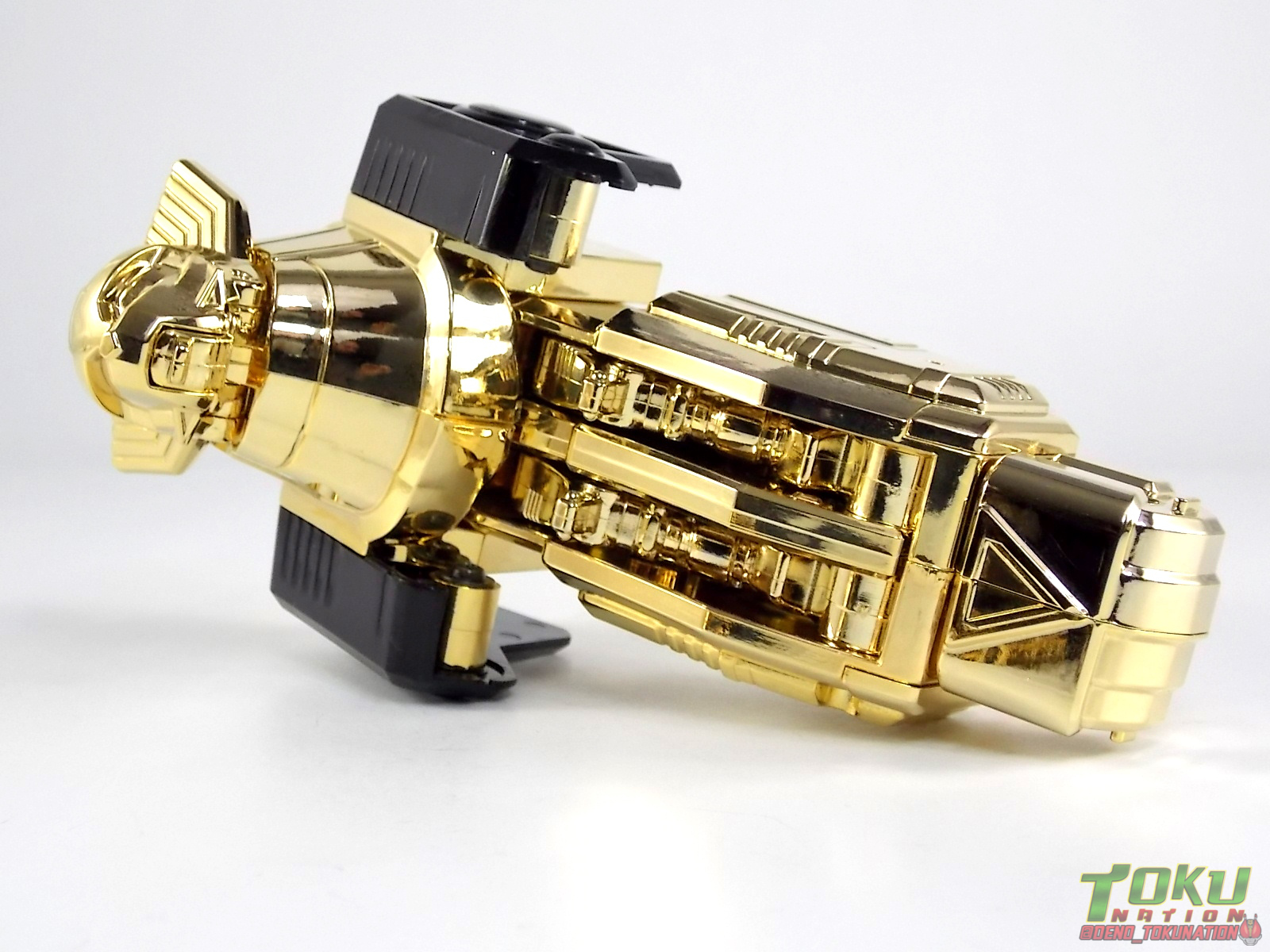 So what do we know about it? As far as anyone knows an extremely limited number of Gold Galaxy Megazords were produced. In similar fashion to Lucky Draw releases from Bandai Japan, this set exists only in double digit numbers. Originally thought to have only been manufactured in a run of less than 10, in recent years it's come to light that as many as 15+ of these gorgeous sets were produced. Originally sold as FAO Schwartz exclusives each Gold Galaxy Megazord included a Certificate for the buyer as "proof" of their ownership of the set. The one included with my Megazord is luckily still blank. After the initial FAO Schwartz run a handful of these Megazords were given away some years later as prizes. These sets rarely turn up for sale and often for staggering prices. Though there aren't many of them left in circulation, prices can range anywhere from about the $500 mark to upwards of $1500 and beyond in some earlier documented sales. I simply lucked into finding this set for an absurdly good deal. And I could not pass up the opportunity to share an incredible piece of Power Rangers & toy collecting history with the community. So here we are! Below you'll find a quick overview of each component and the combined form with photo comparisons to Black GingaiOh for reference. I hope you enjoy it! Packaging As with most special color releases in toy lines, the Gold Galaxy Megazord comes packaged in the same box as the original release, though with significantly altered colors. The entire packaging is done up in black & gray with gold accents. The stock images of the toys show them in their true black & gold colors but everything else is muted. Including the cross-sells for the Stratoforce & Centaurus Megazords on the side. The inner packaging is the exact same styrofoam tray as the normal Galaxy Megazord. The packaging as a whole is of course totally different from either of the original Japanese GingaiOh releases. The box and styrofoam were re-designed to be a few inches shorter and more compact for US store shelves. I have to mention that it's a little difficult to determine exactly which surfaces are true 14K Gold or vacuum metalized gold chrome. While undoubtedly the actual diecast components that are gold have the 14K plating, that my not necessarily be true for the rest of everything. Regardless the gold looks identical on nearly every surface where it's present. Components Gorilla We'll kick the review proper off with the Gorilla Galactabeast. In this rendition of the figure, nearly every visible surface is golden. The only portions of this figure not covered in gold in one form or another are the forearm and the top of the shoulder area. Even the underside of the feet where the Megazord fists are stored is golden. Now of course this presents a fairly wide spread fingerprint issue. LOL. Once transformed for its part of the Megazord combination you can see the exposed thighs are actually black as well as the small hinges the Gorilla arms rotate on. As you can see the Black Starbeast Gingarilla has a radically different color scheme with a much more vibrant gold, though much less of it. As with all the figures in these 2 sets, this pair couldn't be more different. Down to an including the shade of gold used. Condor Perhaps the most bland member of this team is the Condor Galactabeast. With no paint applications whatsoever this figure can look rather boring. The Gold applications are limited to the wing hinges, as well as the back plate and the underside of the bird beneath the black diecast chest plate. This gold is only visible when the Condor is used for it's crossbow mode. Between these two figures, the Black Starbeast Gingalcon is the clear winner with the additional paint apps, though it lacks somewhat in gold. At least on these two the gold chrome appears to be nearly the same color. Lion The Lion Galactabeast has a nice liberal gold chrome application applied to the section that becomes the Galaxy Megazord head as well as it's chest/shoulders. Because of the where the gold is located it can be difficult to transform the lion without getting a number of finger prints on it. Interestingly when transforming it to the chest component the chunk that slides forward to fill out the gap left by the head is mostly black with gold trim. More interesting is that the head features the only paint app in the entire set, the Galaxy Megazords' eyes are painted blue! Likely to make them distinguishable in the sea of gold chrome. The Lion itself could have benefited from some eye paint apps. Again the contrast between this piece and its' Black Starbeast Gingaleon counterpart is striking. Wildcat With the Wildat Galactabeast we come to the figure that relates most to it's Black GingaiOh counterpart, Black Starbeast Gingat. These two are practically inverses of one another. Where a part is golden on Wildcat, it's black or grey on Gingat. Tail, front hips, legs, head. It's just a really poignant comparison between these two. Wildcat indeed looks great with all that gold, it just needs a few paint apps to break things up. As is the only non-gold components at all are the toes, tail, and front hips. Even when you use the Gorilla's fist on it for combined mode those too are solid gold. Wolf The Wolf Galactabeast is basically identical to the Wildcat in design. And shares a similar type of inversion with it's Black Starbeast Gingaverick counterpart. This piece features gold and black applied in all the same places, has an identical transformation and fist as well as the aforementioned lack of paint apps. Galaxy Megazord When fully combined into the Gold Galaxy Megazord this set really shines. Literally. The black accents that do exist serve to break up the monotony of the color scheme decently enough and help unify the design more. Disappointingly the Galaxy Megazord Saber included with this set is only cast in an incredibly dull black plastic with no gold plating or paint at all. However this doesn't detra