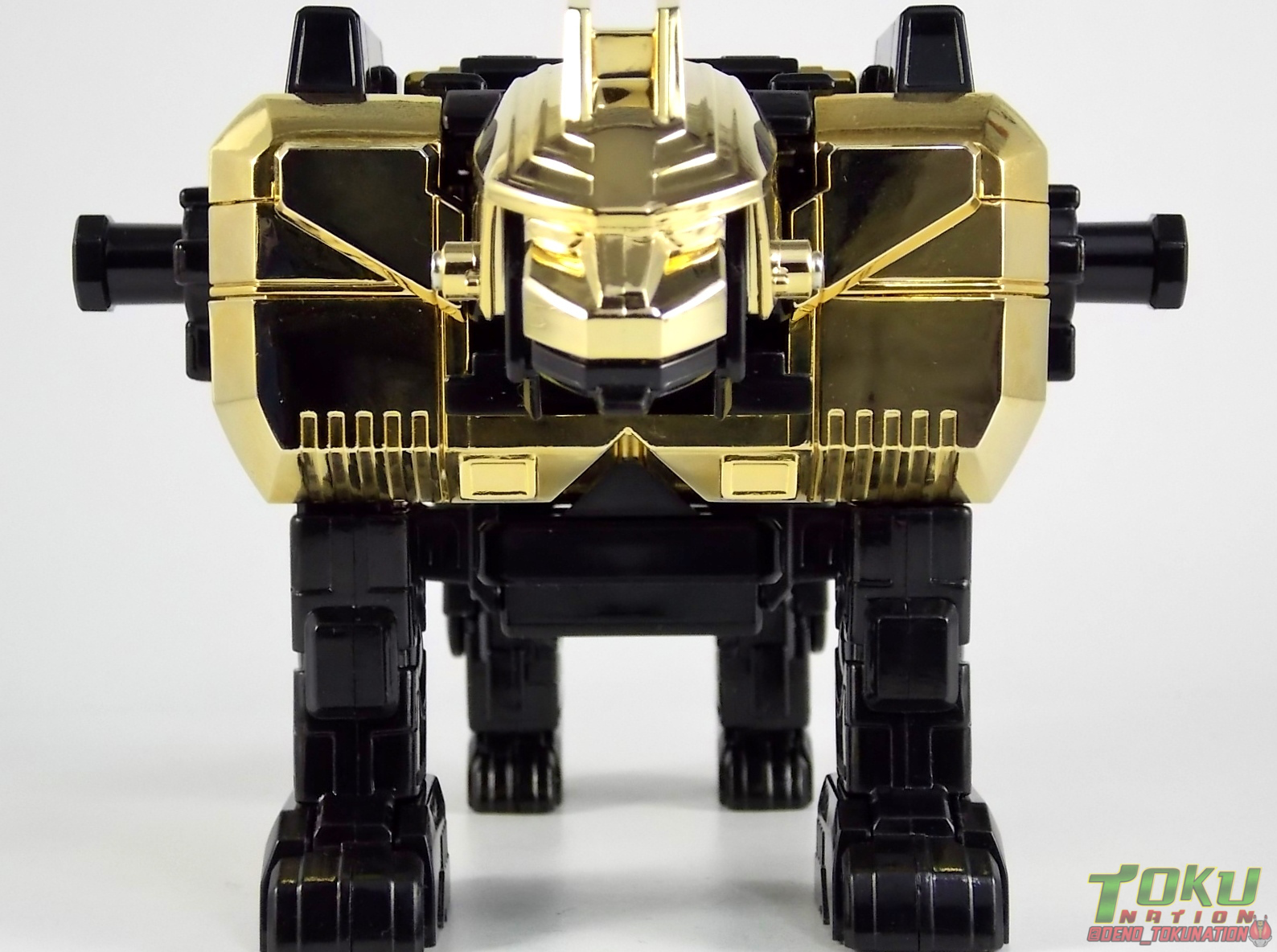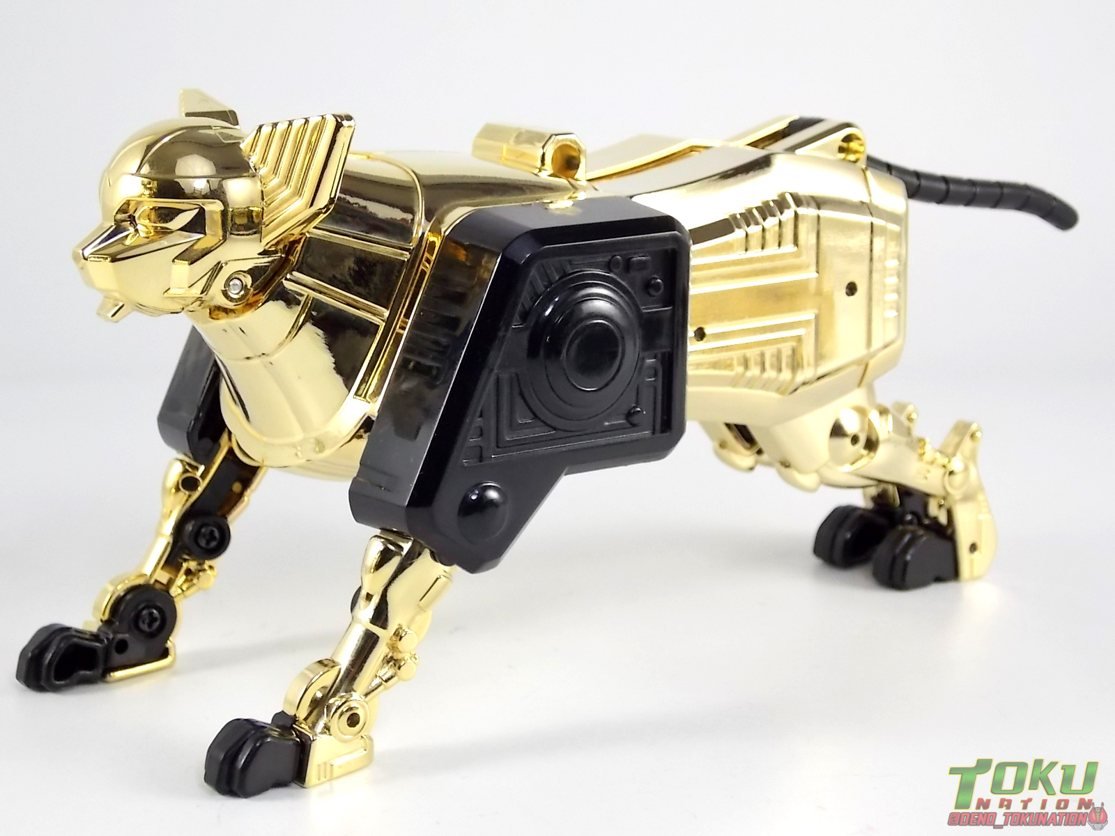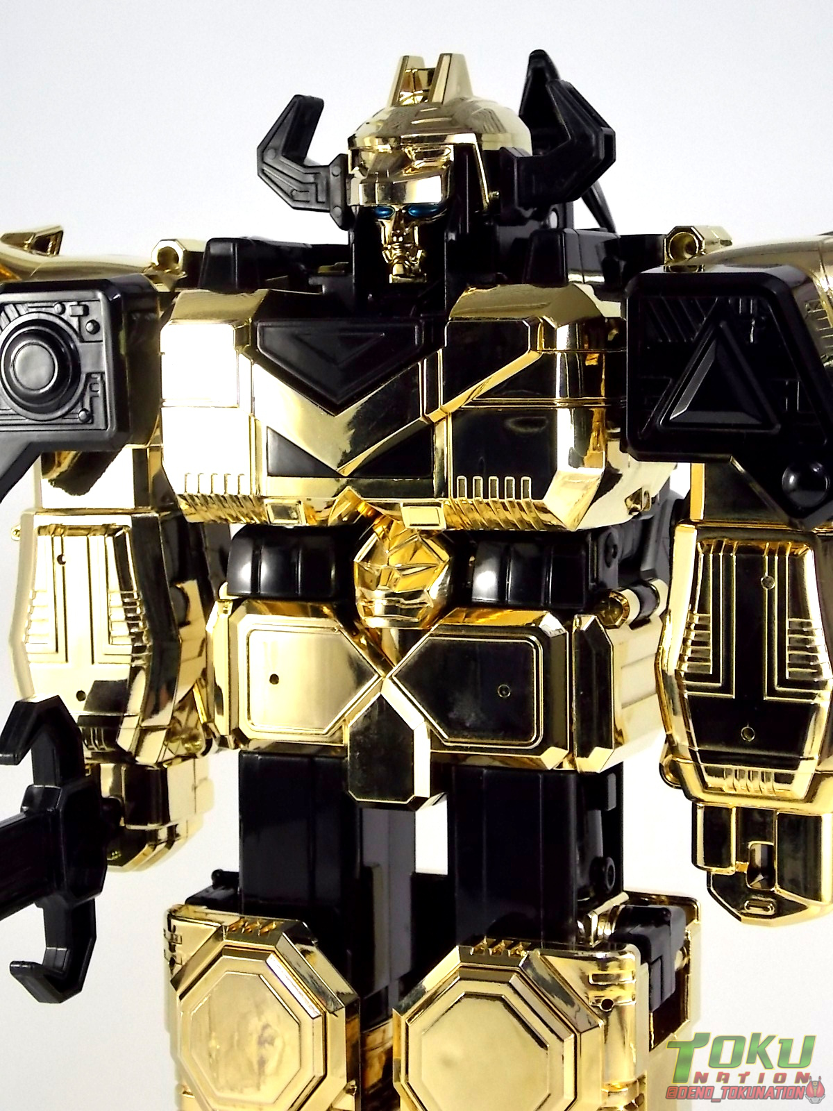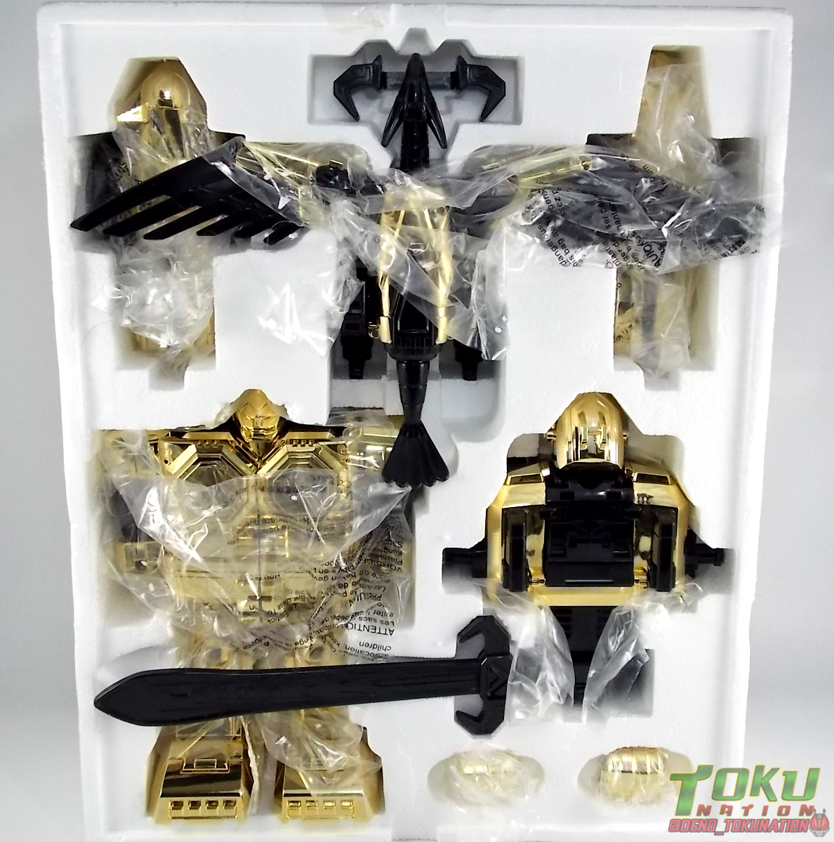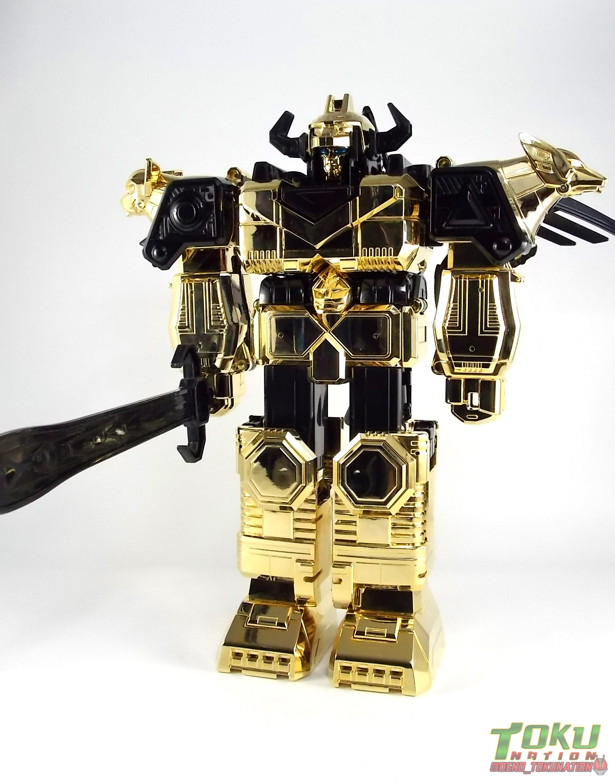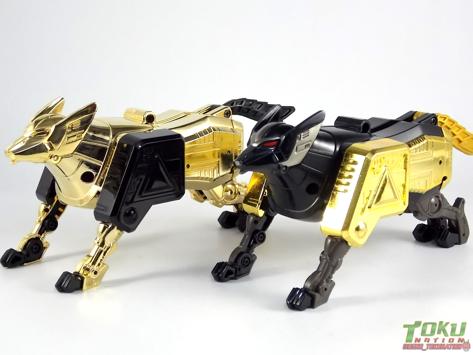 So what do we know about it? As far as anyone knows an extremely limited number of Gold Galaxy Megazords were produced. In similar fashion to Lucky Draw releases from Bandai Japan, this set exists only in double digit numbers. Originally thought to have only been manufactured in a run of less than 10, in recent years it's come to light that as many as 15+ of these gorgeous sets were produced. Originally sold as FAO Schwartz exclusives each Gold Galaxy Megazord included a Certificate for the buyer as "proof" of their ownership of the set. The one included with my Megazord is luckily still blank. After the initial FAO Schwartz run a handful of these Megazords were given away some years later as prizes. These sets rarely turn up for sale and often for staggering prices. Though there aren't many of them left in circulation, prices can range anywhere from about the $500 mark to upwards of $1500 and beyond in some earlier documented sales. I simply lucked into finding this set for an absurdly good deal. And I could not pass up the opportunity to share an incredible piece of Power Rangers & toy collecting history with the community. So here we are! Below you'll find a quick overview of each component and the combined form with photo comparisons to Black GingaiOh for reference. I hope you enjoy it! Packaging As with most special color releases in toy lines, the Gold Galaxy Megazord comes packaged in the same box as the original release, though with significantly altered colors. The entire packaging is done up in black & gray with gold accents. The stock images of the toys show them in their true black & gold colors but everything else is muted. Including the cross-sells for the Stratoforce & Centaurus Megazords on the side. The inner packaging is the exact same styrofoam tray as the normal Galaxy Megazord. The packaging as a whole is of course totally different from either of the original Japanese GingaiOh releases. The box and styrofoam were re-designed to be a few inches shorter and more compact for US store shelves. I have to mention that it's a little difficult to determine exactly which surfaces are true 14K Gold or vacuum metalized gold chrome. While undoubtedly the actual diecast components that are gold have the 14K plating, that my not necessarily be true for the rest of everything. Regardless the gold looks identical on nearly every surface where it's present. Components Gorilla We'll kick the review proper off with the Gorilla Galactabeast. In this rendition of the figure, nearly every visible surface is golden. The only portions of this figure not covered in gold in one form or another are the forearm and the top of the shoulder area. Even the underside of the feet where the Megazord fists are stored is golden. Now of course this presents a fairly wide spread fingerprint issue. LOL. Once transformed for its part of the Megazord combination you can see the exposed thighs are actually black as well as the small hinges the Gorilla arms rotate on. As you can see the Black Starbeast Gingarilla has a radically different color scheme with a much more vibrant gold, though much less of it. As with all the figures in these 2 sets, this pair couldn't be more different. Down to an including the shade of gold used. Condor Perhaps the most bland member of this team is the Condor Galactabeast. With no paint applications whatsoever this figure can look rather boring. The Gold applications are limited to the wing hinges, as well as the back plate and the underside of the bird beneath the black diecast chest plate. This gold is only visible when the Condor is used for it's crossbow mode. Between these two figures, the Black Starbeast Gingalcon is the clear winner with the additional paint apps, though it lacks somewhat in gold. At least on these two the gold chrome appears to be nearly the same color. Lion The Lion Galactabeast has a nice liberal gold chrome application applied to the section that becomes the Galaxy Megazord head as well as it's chest/shoulders. Because of the where the gold is located it can be difficult to transform the lion without getting a number of finger prints on it. Interestingly when transforming it to the chest component the chunk that slides forward to fill out the gap left by the head is mostly black with gold trim. More interesting is that the head features the only paint app in the entire set, the Galaxy Megazords' eyes are painted blue! Likely to make them distinguishable in the sea of gold chrome. The Lion itself could have benefited from some eye paint apps. Again the contrast between this piece and its' Black Starbeast Gingaleon counterpart is striking. Wildcat With the Wildat Galactabeast we come to the figure that relates most to it's Black GingaiOh counterpart, Black Starbeast Gingat. These two are practically inverses of one another. Where a part is golden on Wildcat, it's black or grey on Gingat. Tail, front hips, legs, head. It's just a really poignant comparison between these two. Wildcat indeed looks great with all that gold, it just needs a few paint apps to break things up. As is the only non-gold components at all are the toes, tail, and front hips. Even when you use the Gorilla's fist on it for combined mode those too are solid gold. Wolf The Wolf Galactabeast is basically identical to the Wildcat in design. And shares a similar type of inversion with it's Black Starbeast Gingaverick counterpart. This piece features gold and black applied in all the same places, has an identical transformation and fist as well as the aforementioned lack of paint apps. Galaxy Megazord When fully combined into the Gold Galaxy Megazord this set really shines. Literally. The black accents that do exist serve to break up the monotony of the color scheme decently enough and help unify the design more. Disappointingly the Galaxy Megazord Saber included with this set is only cast in an incredibly dull black plastic with no gold plating or paint at all. However this doesn't detra