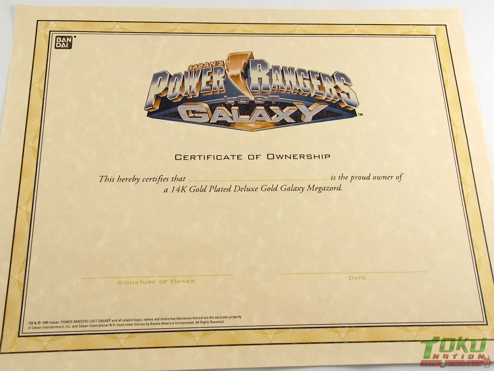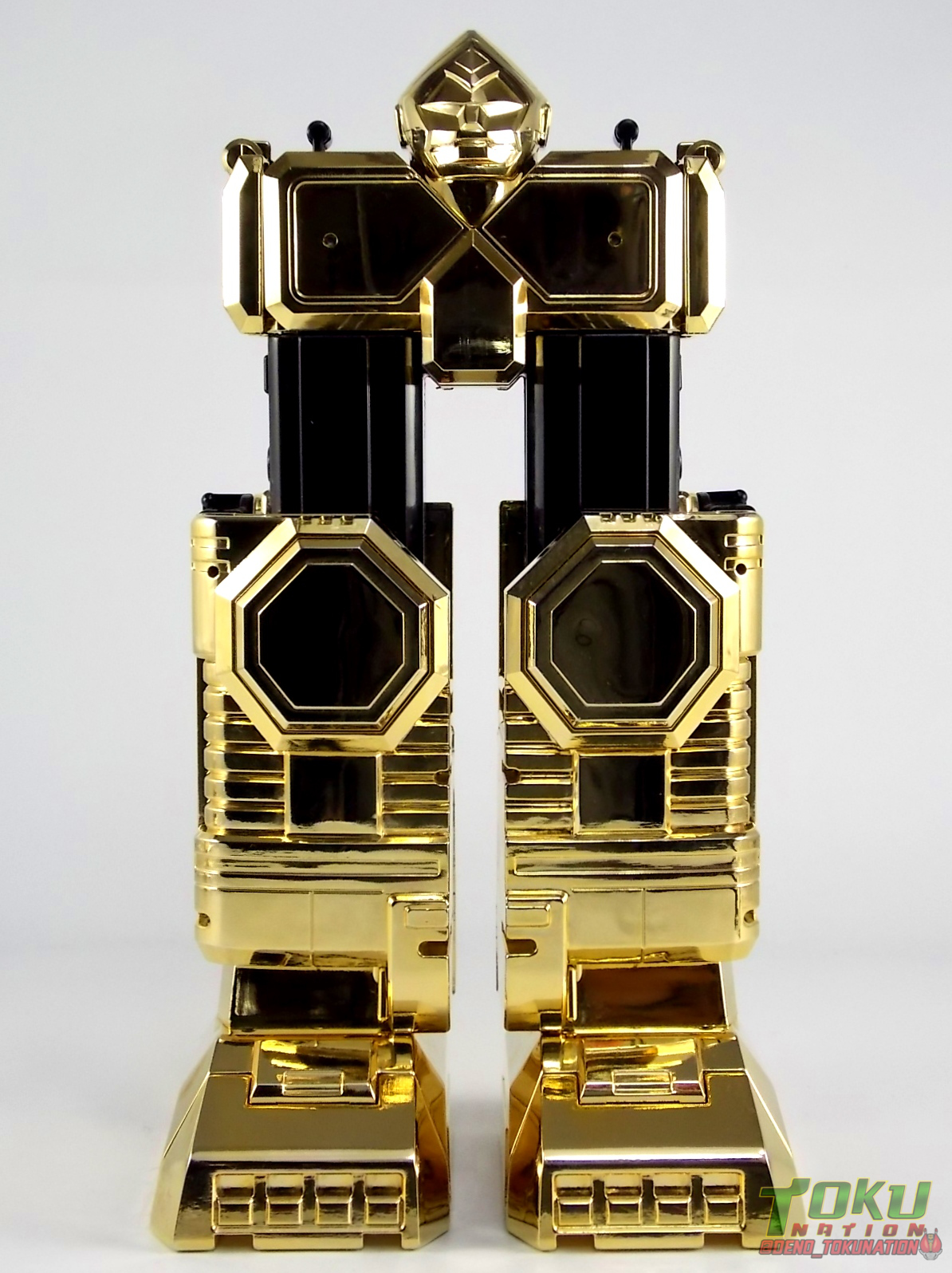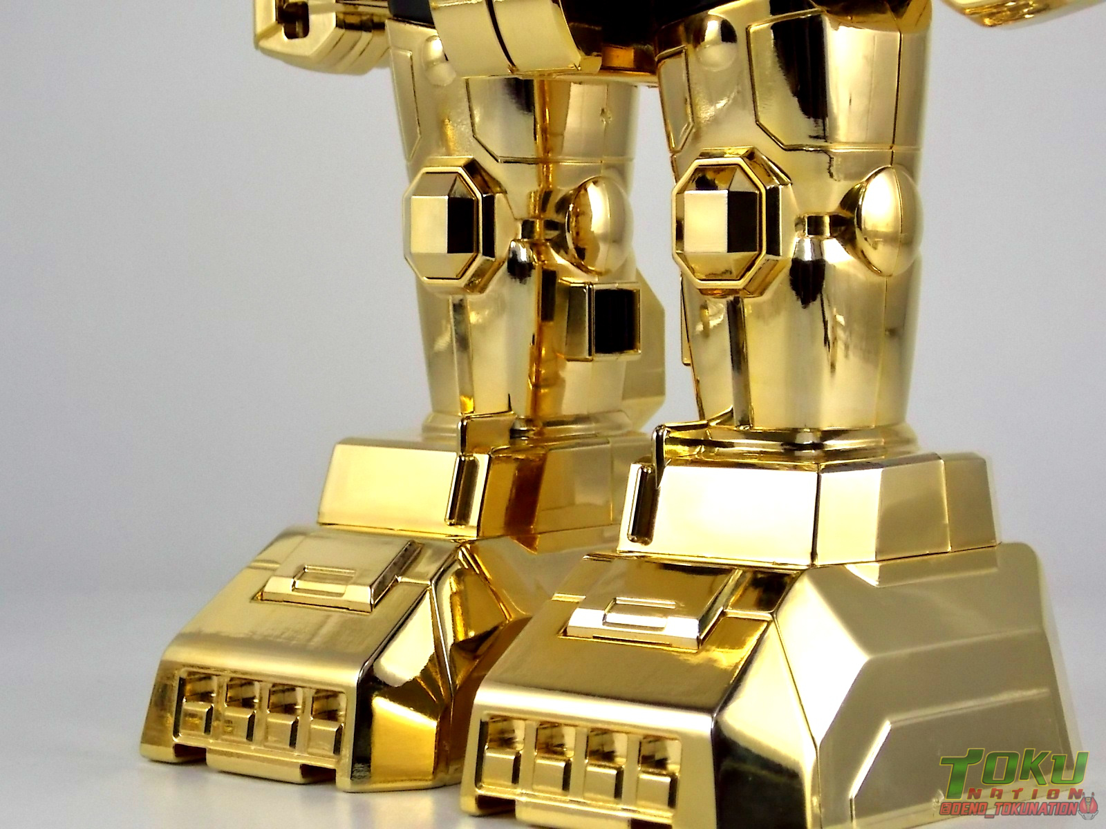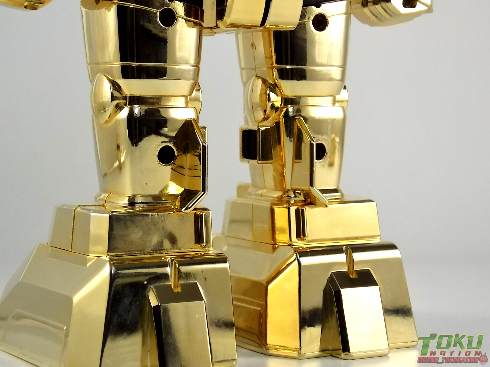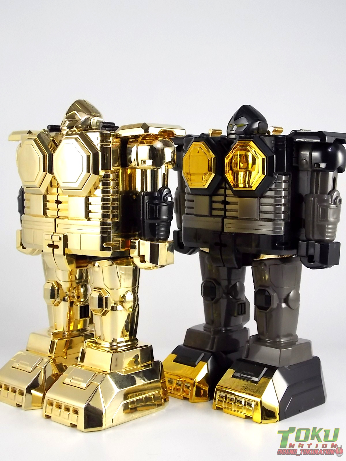 So what do we know about it? As far as anyone knows an extremely limited number of Gold Galaxy Megazords were produced. In similar fashion to Lucky Draw releases from Bandai Japan, this set exists only in double digit numbers. Originally thought to have only been manufactured in a run of less than 10, in recent years it's come to light that as many as 15+ of these gorgeous sets were produced. Originally sold as FAO Schwartz exclusives each Gold Galaxy Megazord included a Certificate for the buyer as "proof" of their ownership of the set. The one included with my Megazord is luckily still blank. After the initial FAO Schwartz run a handful of these Megazords were given away some years later as prizes. These sets rarely turn up for sale and often for staggering prices. Though there aren't many of them left in circulation, prices can range anywhere from about the $500 mark to upwards of $1500 and beyond in some earlier documented sales. I simply lucked into finding this set for an absurdly good deal. And I could not pass up the opportunity to share an incredible piece of Power Rangers & toy collecting history with the community. So here we are! Below you'll find a quick overview of each component and the combined form with photo comparisons to Black GingaiOh for reference. I hope you enjoy it! Packaging As with most special color releases in toy lines, the Gold Galaxy Megazord comes packaged in the same box as the original release, though with significantly altered colors. The entire packaging is done up in black & gray with gold accents. The stock images of the toys show them in their true black & gold colors but everything else is muted. Including the cross-sells for the Stratoforce & Centaurus Megazords on the side. The inner packaging is the exact same styrofoam tray as the normal Galaxy Megazord. The packaging as a whole is of course totally different from either of the original Japanese GingaiOh releases. The box and styrofoam were re-designed to be a few inches shorter and more compact for US store shelves. I have to mention that it's a little difficult to determine exactly which surfaces are true 14K Gold or vacuum metalized gold chrome. While undoubtedly the actual diecast components that are gold have the 14K plating, that my not necessarily be true for the rest of everything. Regardless the gold looks identical on nearly every surface where it's present. Components Gorilla We'll kick the review proper off with the Gorilla Galactabeast. In this rendition of the figure, nearly every visible surface is golden. The only portions of this figure not covered in gold in one form or another are the forearm and the top of the shoulder area. Even the underside of the feet where the Megazord fists are stored is golden. Now of course this presents a fairly wide spread fingerprint issue. LOL. Once transformed for its part of the Megazord combination you can see the exposed thighs are actually black as well as the small hinges the Gorilla arms rotate on. As you can see the Black Starbeast Gingarilla has a radically different color scheme with a much more vibrant gold, though much less of it. As with all the figures in these 2 sets, this pair couldn't be more different. Down to an including the shade of gold used. Condor Perhaps the most bland member of this team is the Condor Galactabeast. With no paint applications whatsoever this figure can look rather boring. The Gold applications are limited to the wing hinges, as well as the back plate and the underside of the bird beneath the black diecast chest plate. This gold is only visible when the Condor is used for it's crossbow mode. Between these two figures, the Black Starbeast Gingalcon is the clear winner with the additional paint apps, though it lacks somewhat in gold. At least on these two the gold chrome appears to be nearly the same color. Lion The Lion Galactabeast has a nice liberal gold chrome application applied to the section that becomes the Galaxy Megazord head as well as it's chest/shoulders. Because of the where the gold is located it can be difficult to transform the lion without getting a number of finger prints on it. Interestingly when transforming it to the chest component the chunk that slides forward to fill out the gap left by the head is mostly black with gold trim. More interesting is that the head features the only paint app in the entire set, the Galaxy Megazords' eyes are painted blue! Likely to make them distinguishable in the sea of gold chrome. The Lion itself could have benefited from some eye paint apps. Again the contrast between this piece and its' Black Starbeast Gingaleon counterpart is striking. Wildcat With the Wildat Galactabeast we come to the figure that relates most to it's Black GingaiOh counterpart, Black Starbeast Gingat. These two are practically inverses of one another. Where a part is golden on Wildcat, it's black or grey on Gingat. Tail, front hips, legs, head. It's just a really poignant comparison between these two. Wildcat indeed looks great with all that gold, it just needs a few paint apps to break things up. As is the only non-gold components at all are the toes, tail, and front hips. Even when you use the Gorilla's fist on it for combined mode those too are solid gold. Wolf The Wolf Galactabeast is basically identical to the Wildcat in design. And shares a similar type of inversion with it's Black Starbeast Gingaverick counterpart. This piece features gold and black applied in all the same places, has an identical transformation and fist as well as the aforementioned lack of paint apps. Galaxy Megazord When fully combined into the Gold Galaxy Megazord this set really shines. Literally. The black accents that do exist serve to break up the monotony of the color scheme decently enough and help unify the design more. Disappointingly the Galaxy Megazord Saber included with this set is only cast in an incredibly dull black plastic with no gold plating or paint at all. However this doesn't detra