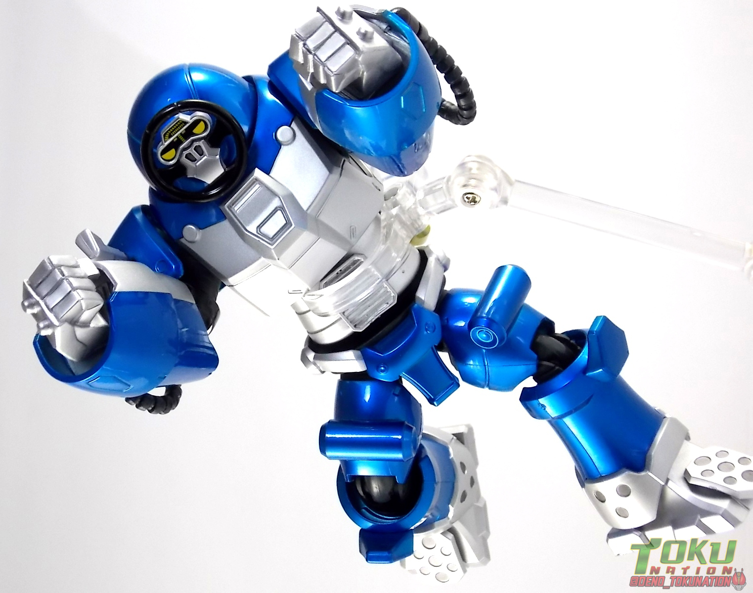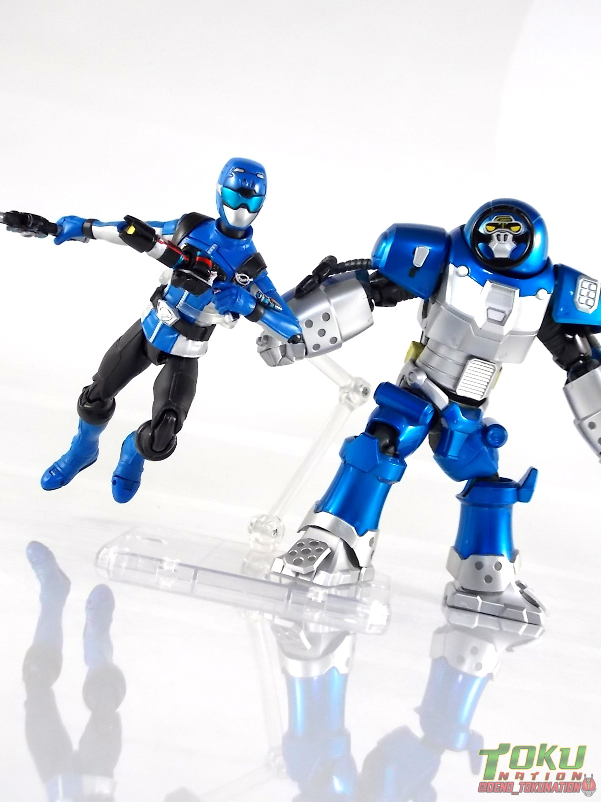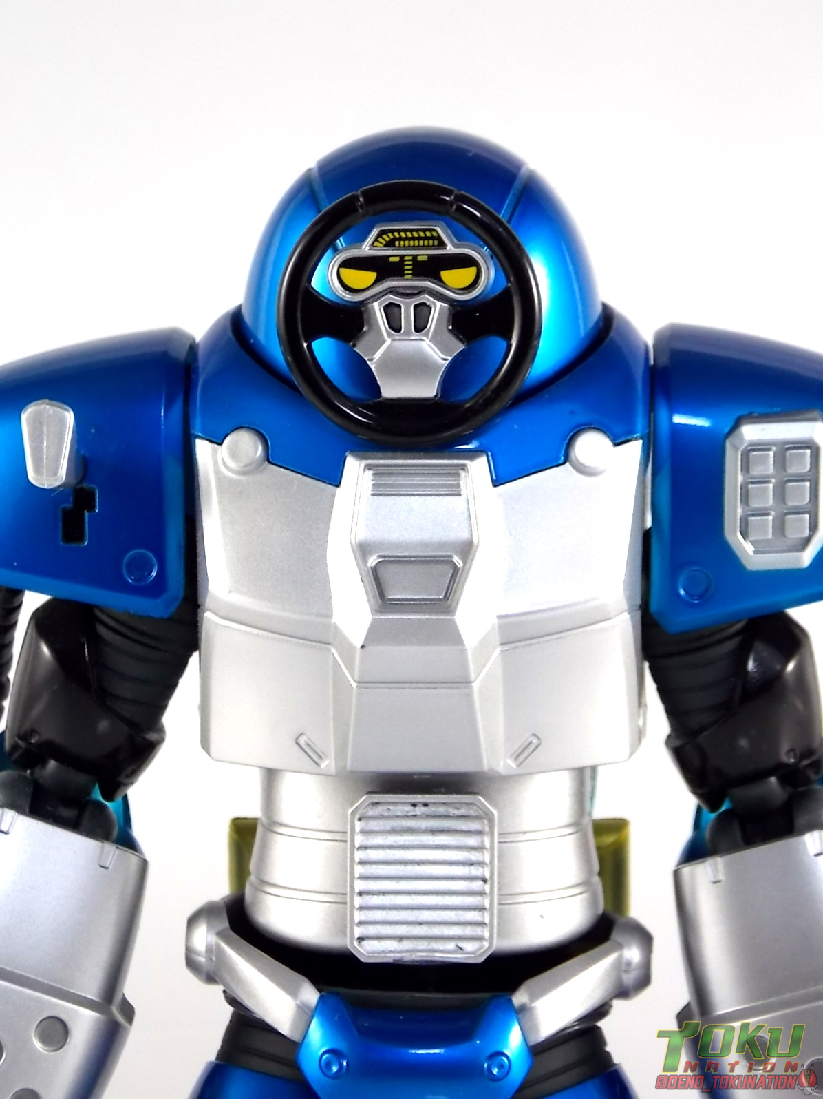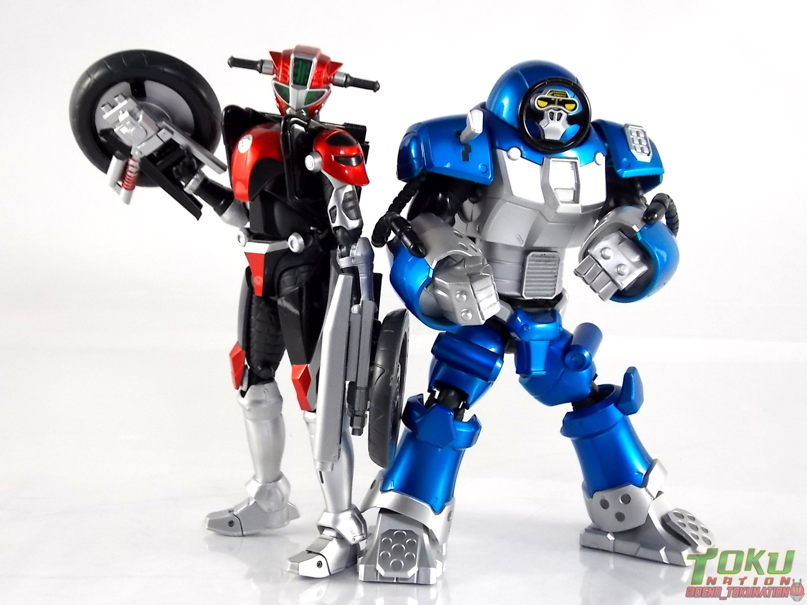 Packaging As I mentioned the last few times, Go-Busters figuarts featured some really creative packaging. And I still think that's true. Gorisaki's box is basically a copy & paste of Blue Busters' box. Same trademark logos and coloring, same awesome "shades", it's all there. Both of these figures were Tamashii Web Exclusives as well. A trend you'll notice affects 4 out of 5 Go-Busters figuarts. Main Figure Gorisaki is the 2nd of the 3 companion Buddyroids released for the team. Each of them are quite different from one another and Gorisaki is by far the most substantial size-wise of the trio. Much like Nick Cheeda, Gorisaki shares no similar parts with the 3 Go-Busters figuarts which predate him. Most of the time when a figuarts subline begins you get several figures with similar design and new tooling. But because of how radically different each of the Buddyroids are, their molding is totally unique to them. This probably explains why all 3 became Web Exclusives, but then again so were Blue & Yellow Busters. In any case Gorisaki is another refresher after handling the tried & true Buster mold with Blue Buster. That's not to say that Gorisaki is without fault though. This figures' design is pretty faithful, though the proportions do feel a little more streamlined than they should. Unlike Nick though I do feel like Gorisaki has articulation that emulates what a person wearing a suit would really experience. The arms in particular speak to this point, even if the figure suffers for it. But for starters Gorisaki has a pretty good range of movement in his legs all things considered. Despite bulky ankles, knees, and thighs he really can move. One of the limitations however of the bulk on the legs is that Gorisaki can't quite get down on his knees, or even one knee, though he never did much of that in the show. Perhaps because of the bulk on them or in spite of it, Gorisaki can balance like a master. Seriously he can even pull off a one legged pose with his arms splayed out. He's a downright gorilla ballerina! It really helps that Gorisaki also has an amazing floating ab and torso joint. There's a lot of play in that area that's useful. Now sadly Gorisakis' arms leave MUCH to be desired. Despite their size his hands can rotate inside those giant arm cuffs. Which helps him be a bit more expressive. The elbows could be better but you can get plenty of movement out of them, around 45 degrees. Now sadly the shoulders are kind of a mess. To maintain the look of them and keep them in place the shoulder pads are attached on a rotational joint just above the shoulder itself. However they can only rotate about 30 degrees forward. The arms themselves have so much potential in them. But because of how restrictive the pad is, Gorisaki just looks like he's desperately trying to gesture sometimes rather than doing an actual lifelike pose. You'd think the rubber hosing on the elbows would be a problem, but honestly they don't cause any real issues that I can tell. The best part of this figure by far though is his head. The sphere the face is on actually can hinge up slightly for Gorisaki to "look up". the Steering Wheel face portion however can spin 360 degrees to replicate all of those "Ryuji!!!!!" moments we love the big ape for. And of course I have to mention the excellent detailing on the back of this figuart. Much like Nick, Gorisaki features molded in detail on his back to simulate his larger Buster Vehicle counterparts' Gorilla head. I've included some comparisons with the DX Buster Vehicle Gorilla just to illustrate how awesome this is. Accessories Well? Nothing. Gorisaki came with exactly no accessories. Which was a pretty big disappointment at the time of his release. And it does still kind of burn, but with time has come understanding. Gorisaki never had open palmed hands in the show, just big monkey fists. So he wouldn't need extra hands. He also doesn't have any weapons so he wouldn't need those. And there's no real applicable effect part that I can think of for him either. About the only things I could think of that would have truly been appropriate for him were ice packs to use with Blue Buster, and maybe a damaged helmet for him as well. In retrospect Gorisaki coming with no accessories really isn't that big of a deal to me anymore, it makes sense. But I do wish he'd come with something. Final Thoughts S.H. Figuarts Gorisaki Banana, much like Nick Cheeda, is a wonderful departure from the Go-Buster mold. While it does have it's issues it's still a really fun figure, with lots of personality. Even without accessories Gorisaki is another great addition to the Tokumei Sentai Go-Busters lineup. I'll be back next month with my final gallery 2.0 from this series, the S.H. Figuarts Yellow Buster & Usada Lettuce 2-pack!