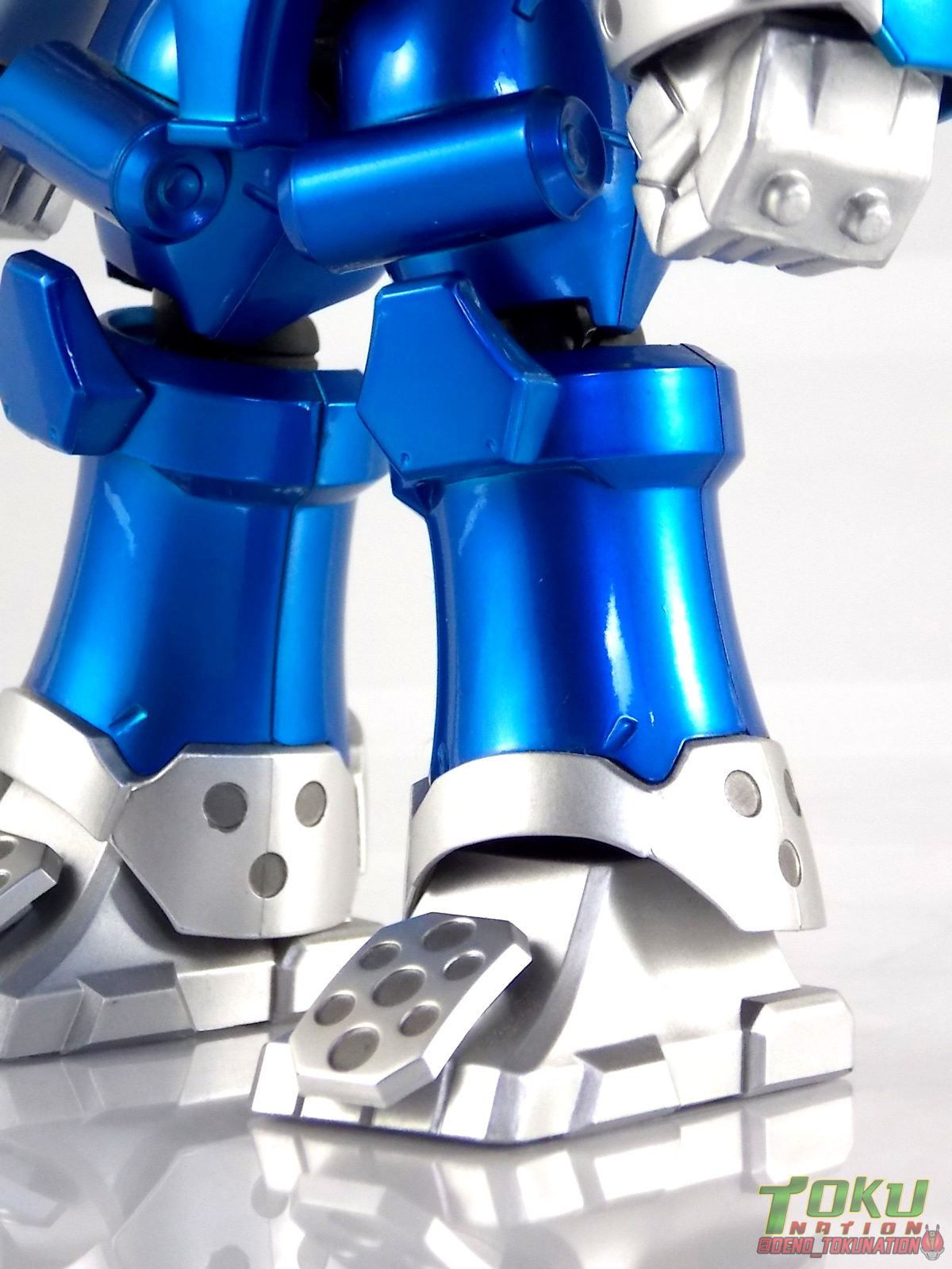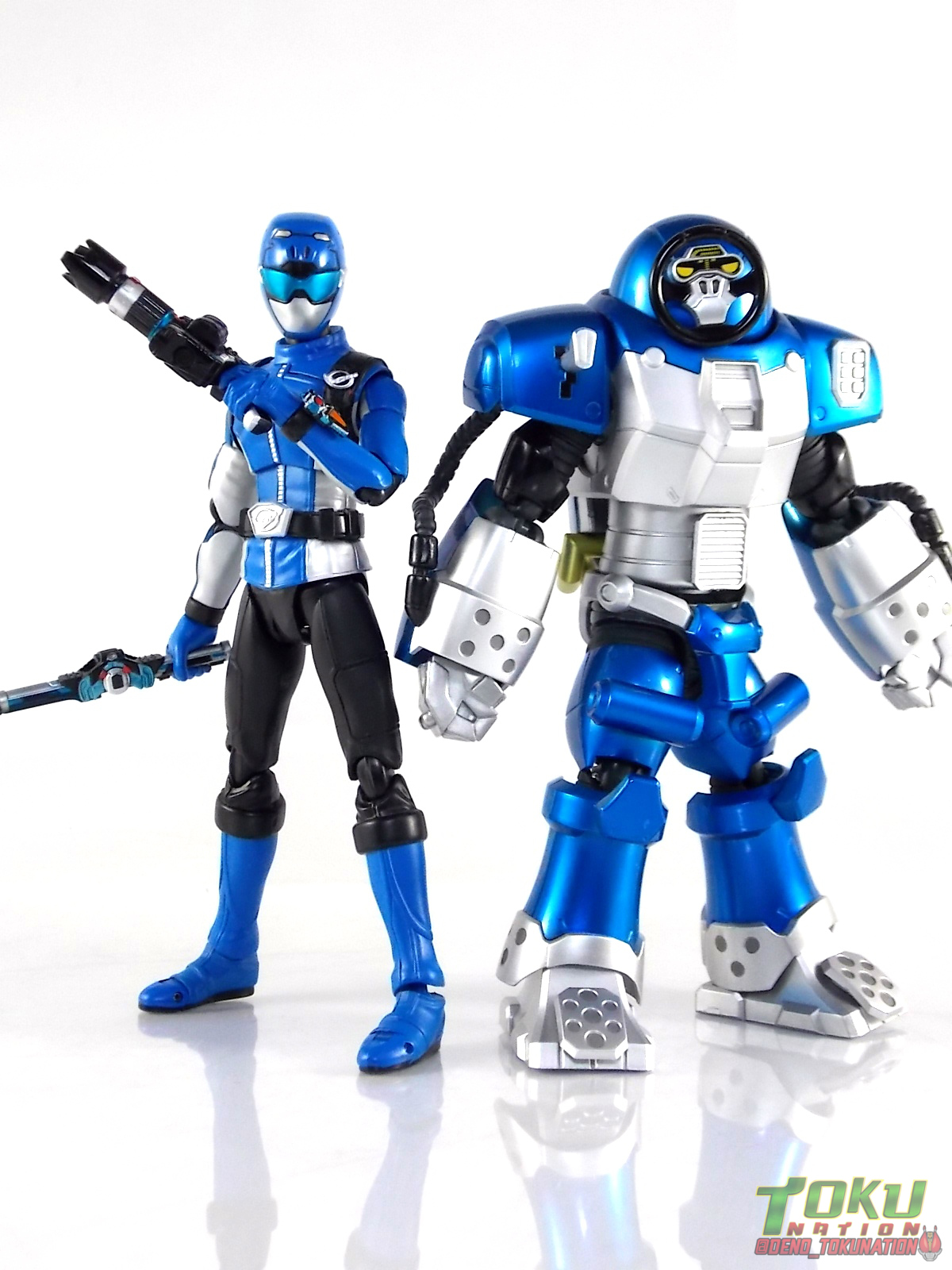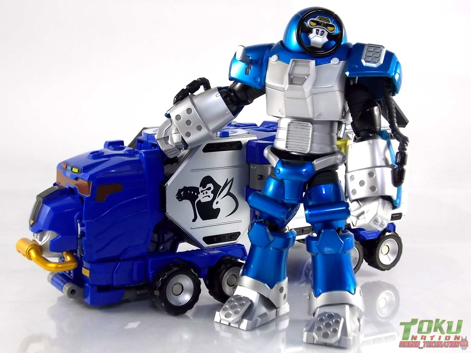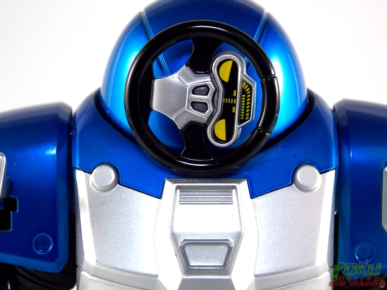 Packaging As I mentioned the last few times, Go-Busters figuarts featured some really creative packaging. And I still think that's true. Gorisaki's box is basically a copy & paste of Blue Busters' box. Same trademark logos and coloring, same awesome "shades", it's all there. Both of these figures were Tamashii Web Exclusives as well. A trend you'll notice affects 4 out of 5 Go-Busters figuarts. Main Figure Gorisaki is the 2nd of the 3 companion Buddyroids released for the team. Each of them are quite different from one another and Gorisaki is by far the most substantial size-wise of the trio. Much like Nick Cheeda, Gorisaki shares no similar parts with the 3 Go-Busters figuarts which predate him. Most of the time when a figuarts subline begins you get several figures with similar design and new tooling. But because of how radically different each of the Buddyroids are, their molding is totally unique to them. This probably explains why all 3 became Web Exclusives, but then again so were Blue & Yellow Busters. In any case Gorisaki is another refresher after handling the tried & true Buster mold with Blue Buster. That's not to say that Gorisaki is without fault though. This figures' design is pretty faithful, though the proportions do feel a little more streamlined than they should. Unlike Nick though I do feel like Gorisaki has articulation that emulates what a person wearing a suit would really experience. The arms in particular speak to this point, even if the figure suffers for it. But for starters Gorisaki has a pretty good range of movement in his legs all things considered. Despite bulky ankles, knees, and thighs he really can move. One of the limitations however of the bulk on the legs is that Gorisaki can't quite get down on his knees, or even one knee, though he never did much of that in the show. Perhaps because of the bulk on them or in spite of it, Gorisaki can balance like a master. Seriously he can even pull off a one legged pose with his arms splayed out. He's a downright gorilla ballerina! It really helps that Gorisaki also has an amazing floating ab and torso joint. There's a lot of play in that area that's useful. Now sadly Gorisakis' arms leave MUCH to be desired. Despite their size his hands can rotate inside those giant arm cuffs. Which helps him be a bit more expressive. The elbows could be better but you can get plenty of movement out of them, around 45 degrees. Now sadly the shoulders are kind of a mess. To maintain the look of them and keep them in place the shoulder pads are attached on a rotational joint just above the shoulder itself. However they can only rotate about 30 degrees forward. The arms themselves have so much potential in them. But because of how restrictive the pad is, Gorisaki just looks like he's desperately trying to gesture sometimes rather than doing an actual lifelike pose. You'd think the rubber hosing on the elbows would be a problem, but honestly they don't cause any real issues that I can tell. The best part of this figure by far though is his head. The sphere the face is on actually can hinge up slightly for Gorisaki to "look up". the Steering Wheel face portion however can spin 360 degrees to replicate all of those "Ryuji!!!!!" moments we love the big ape for. And of course I have to mention the excellent detailing on the back of this figuart. Much like Nick, Gorisaki features molded in detail on his back to simulate his larger Buster Vehicle counterparts' Gorilla head. I've included some comparisons with the DX Buster Vehicle Gorilla just to illustrate how awesome this is. Accessories Well? Nothing. Gorisaki came with exactly no accessories. Which was a pretty big disappointment at the time of his release. And it does still kind of burn, but with time has come understanding. Gorisaki never had open palmed hands in the show, just big monkey fists. So he wouldn't need extra hands. He also doesn't have any weapons so he wouldn't need those. And there's no real applicable effect part that I can think of for him either. About the only things I could think of that would have truly been appropriate for him were ice packs to use with Blue Buster, and maybe a damaged helmet for him as well. In retrospect Gorisaki coming with no accessories really isn't that big of a deal to me anymore, it makes sense. But I do wish he'd come with something. Final Thoughts S.H. Figuarts Gorisaki Banana, much like Nick Cheeda, is a wonderful departure from the Go-Buster mold. While it does have it's issues it's still a really fun figure, with lots of personality. Even without accessories Gorisaki is another great addition to the Tokumei Sentai Go-Busters lineup. I'll be back next month with my final gallery 2.0 from this series, the S.H. Figuarts Yellow Buster & Usada Lettuce 2-pack!