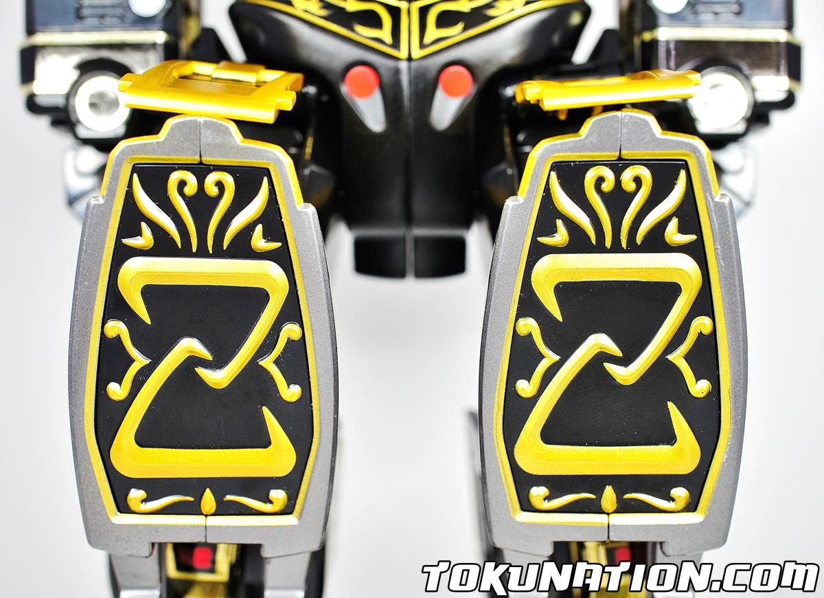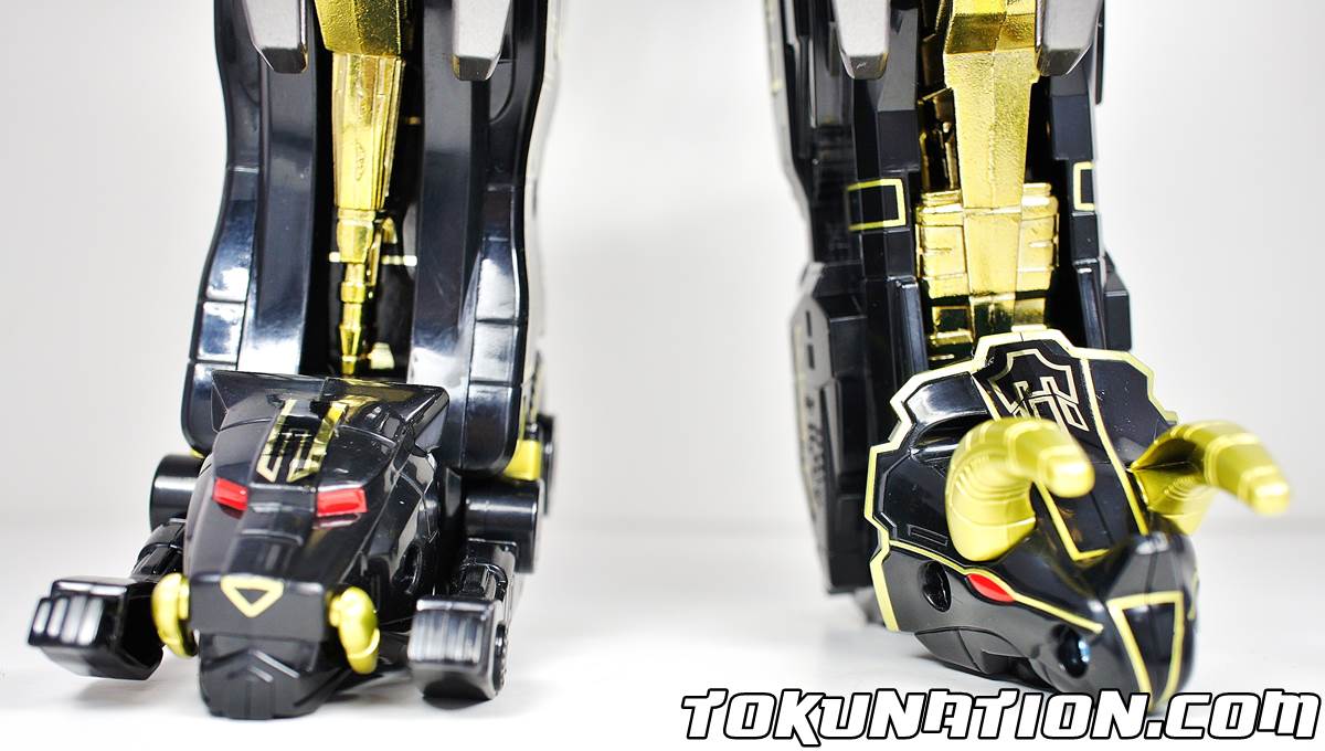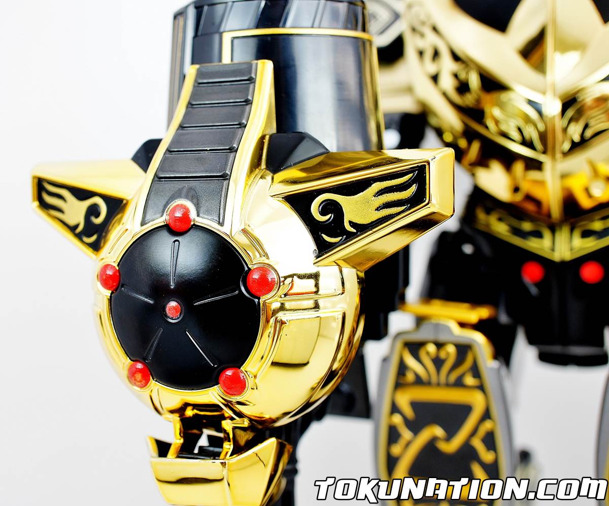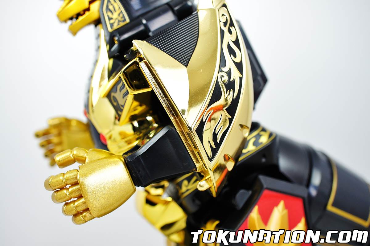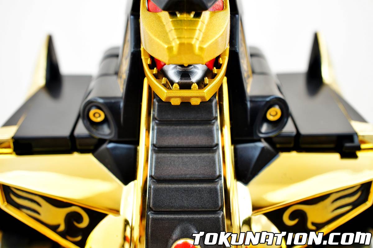 So - aside from being oh so pretty, how does this thing stack up? Check out our review along with 40+ images! The Dragonzord - Figure Can you call it a figure? Anyhow, the Limited Edition Dragonzord is identical to the Legacy Dragonzord release with two main exceptions - the color (duh), and at least in my release, better support for those heavy, heavy "Z" knees (especially in the armor mode). For whatever reason, this release also feels a bit more top heavy - my Dragonzord struggled to stand in certain poses and continued to want to fall one notch forward - which became quite annoying when trying to pose it for the perfect picture. Overall, the Legacy Dragonzord is just as good as the original in terms of being a figure, and it has a (in my opinion) much more pleasing paint job. The Gold Chrome Right off the bat you'll notice the gold chrome is a much darker shade than that on the Limited Edition Megazord figure. I don't know if that was done intentionally or if it was a mix-up when coming up with the colors. The change in colors does cause it to clash somewhat when combined with, or standing next to, the Limited Edition Megazord. The Megazord has almost a muted gold color chrome while the Dragonzord has a vibrant in your face colored chrome. It works for the Dragonzord - especially in Battle Mode (wow!), which does help make the crest stand out even more compared to the shoulders/arms which are the lighter color gold. Battle Mode Simply gorgeous. I'm biased but I cannot find anything wrong with this mode. The gold chrome stands out something fierce and makes for a very nice display piece. The off-color gold chrome of the Limited Edition Megazord doesn't hinder the Limited Edition Dragonzord at all - in fact it makes your eyes go straight to that giant beautiful crest. In "Armor" Mode on Megazord The "Z" doesn't seem quite as heavy - mine stood in place and has stayed in place since the gallery. In the original release, it was too heavy and would often "flop" forward. It was pretty painful to get the pieces to connect between the Megazord and Dragonzord, and even then I had to rig it a bit to make it work. I got scared of possibly scratching the chrome or black paint but I walked away unscathed. Overall If you're a fan of gold chrome, or you bought the Limited Edition Megazord, you need to buy the Limited Edition Dragonzord. The thing is just a piece of beauty and really stands out. The price tag may be off-putting to some ($79), but again - I stand by my stance when I say it's worth it. WARNING - some people have had bad luck and picked up LE Dragonzords that have major chrome chipping/flaking/scratching. Far as I know, there is no way to tell what you have until you open it. I suggest popping open the package in the car to determine if yours is a lemon or a diamond. Hope you enjoy! Thanks for reading!
