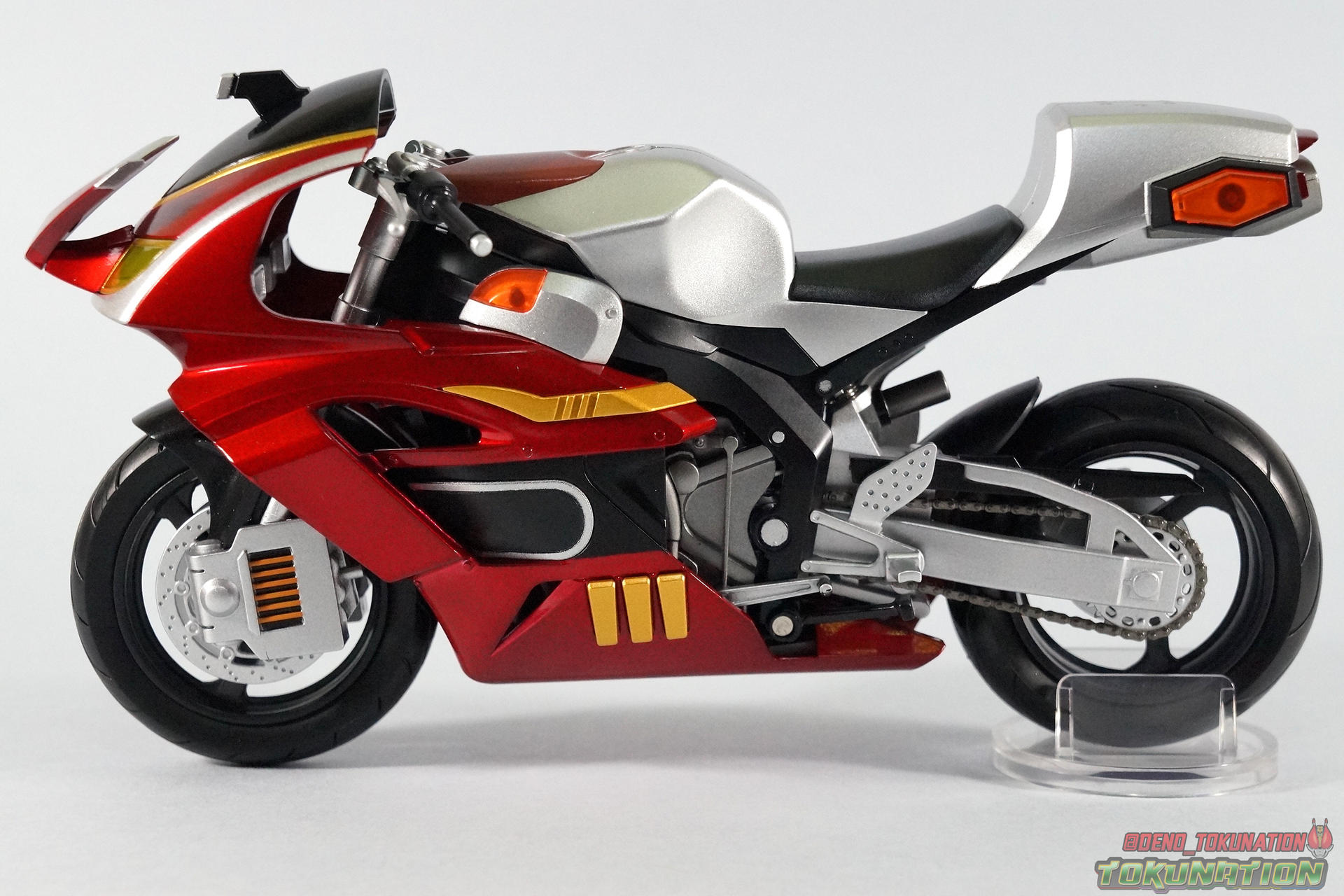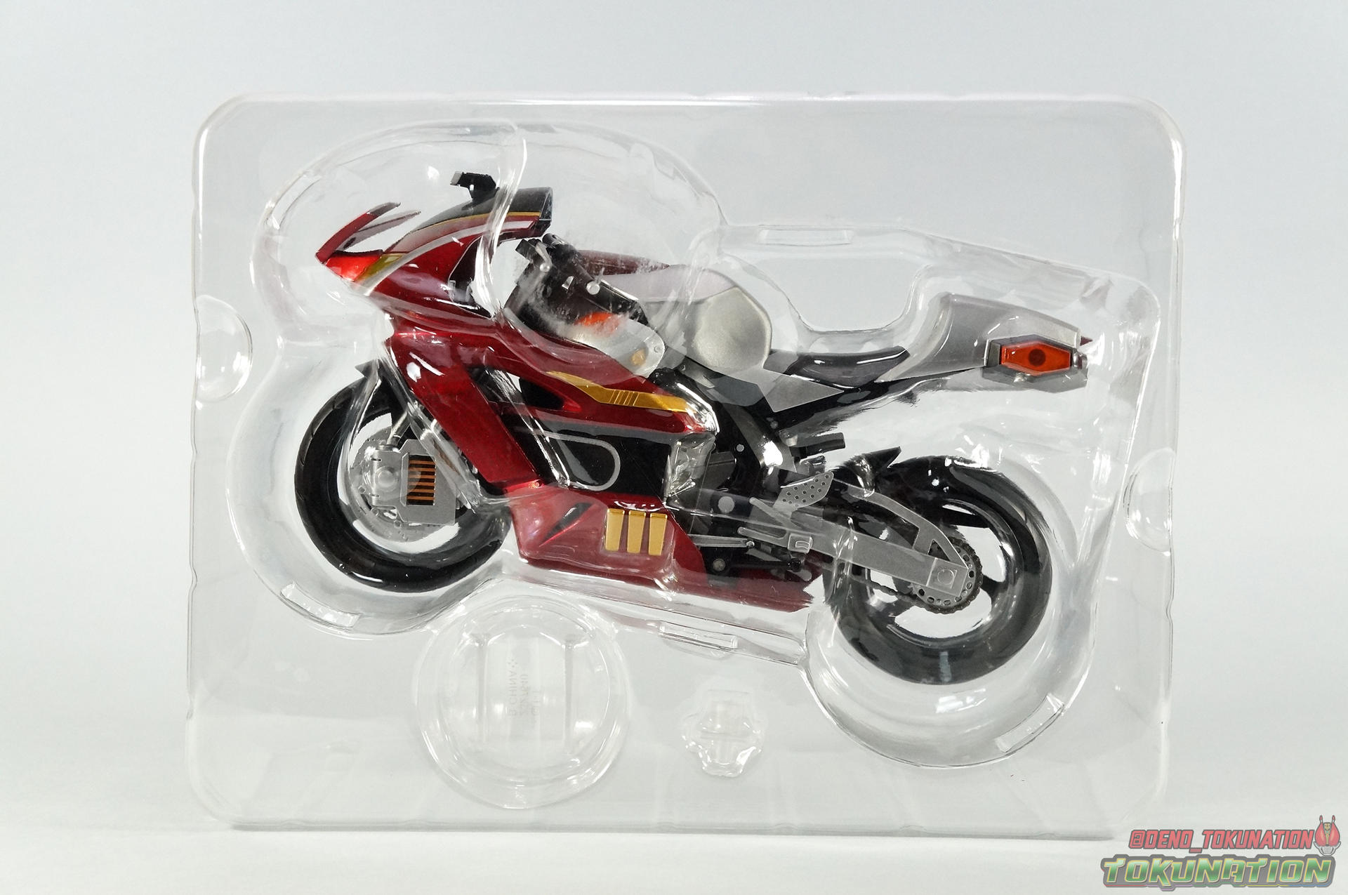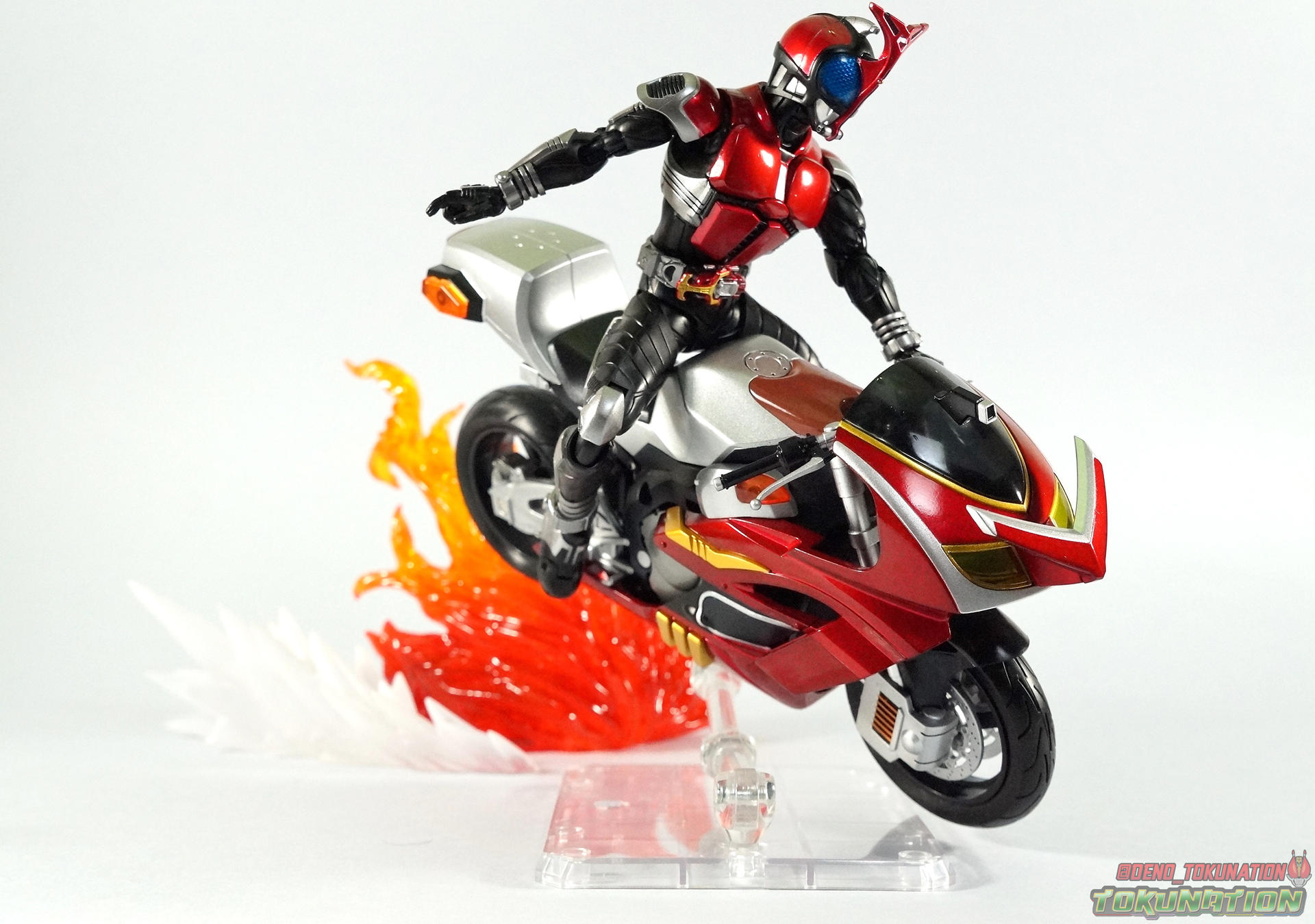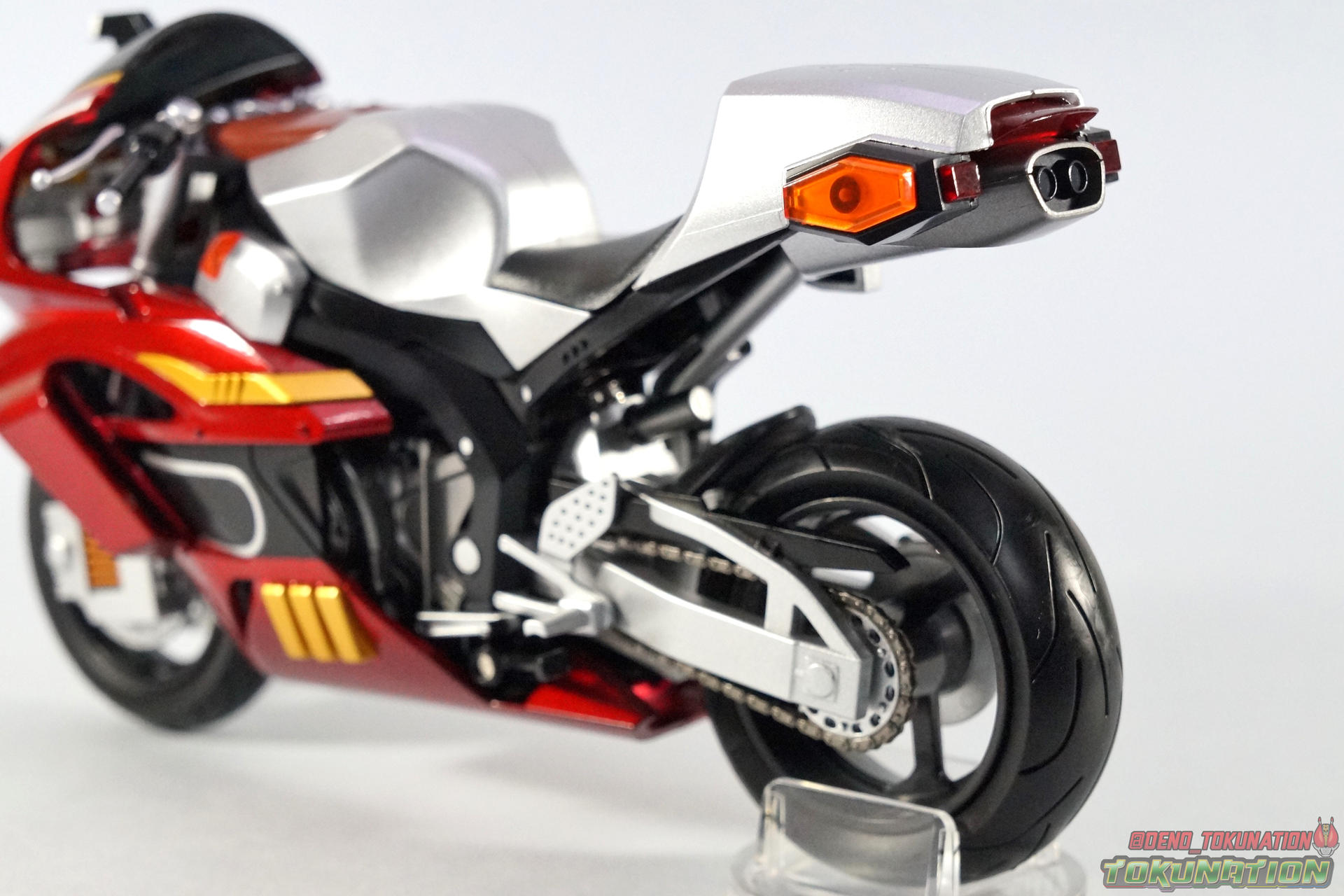 Packaging Pretty standard stuff here. Most Rider Machines come in pretty plain boxes. This one is no different thanks to the drab black & gray color scheme of it. Nothing else of interest to note with this one. Main Figure It's a bike. Review done. Oh, you expected more? I suppose.... In truth there isn't much you can say about a vehicle of this nature. The Kabuto Extender is a really gorgeous bike. And one that's well past due. Considering all of the Kabuto Riders themselves (minus the Brightrooper variant) were released as S.H. Figuarts years ago, it's still surprising that none of the bikes were ever produced before now. Luckily the Gattack Extender is being teased currently too, and with SS Gattack on the way it's just a matter of time. But I'd still like to see the Machine Zectron, in both TheBee & Drake flavors some day. But as Rider Machines go, Kabuto Extender is pretty basic. It doesn't have any action features to speak of unlike it's vintage DX counterpart, which I've included comparison shots of. In show the Extender could also "cast off" it's outer armor like the series' riders, to reveal a faster more powerful form beneath. While it's probably not fair to expect the figuart to be capable of this, we live in a time where a fully transformable Survive Contract Monster Dragranzer exists. So you know, wishful thinking. But it's still a goo looking bike and Kabuto looks perfectly natural sitting on it. Tendou has never looked better than he does with this modern day pairing. Accessories 1 - wheel base like most Figuarts bikes. Nothing special here. 1- Tamashii Stage Adapter. To be used on the underside of the bike the recreate action shots or chase scenes. I had some fun with it and explosions as you can see below. Also it seem additional handlebars are a thing of the past, as this release doesn;'t have the standard extra pair. But honestly who ever used them anyway? Can't think of much else that could have been done with this one. For what we got I'm relatively pleased though. Final Thoughts Basically S.H. Figuarts Kabuto Extender is a really nicely painted and sculpted vehicle that will be a great accessory for your Shinkochu Seihou Kabuto. Many collectors don't particularly feel the necessity to own every bike for every rider. And with releases like this, I can totally get that. I loved Kabuto, the series and the rider, so it's a must have personally. But even I can admit you don't get much bang for your buck with this one. S.H. Figuarts Kabuto Extender could have been much more, but like many Rider Machines it just becomes background display material.