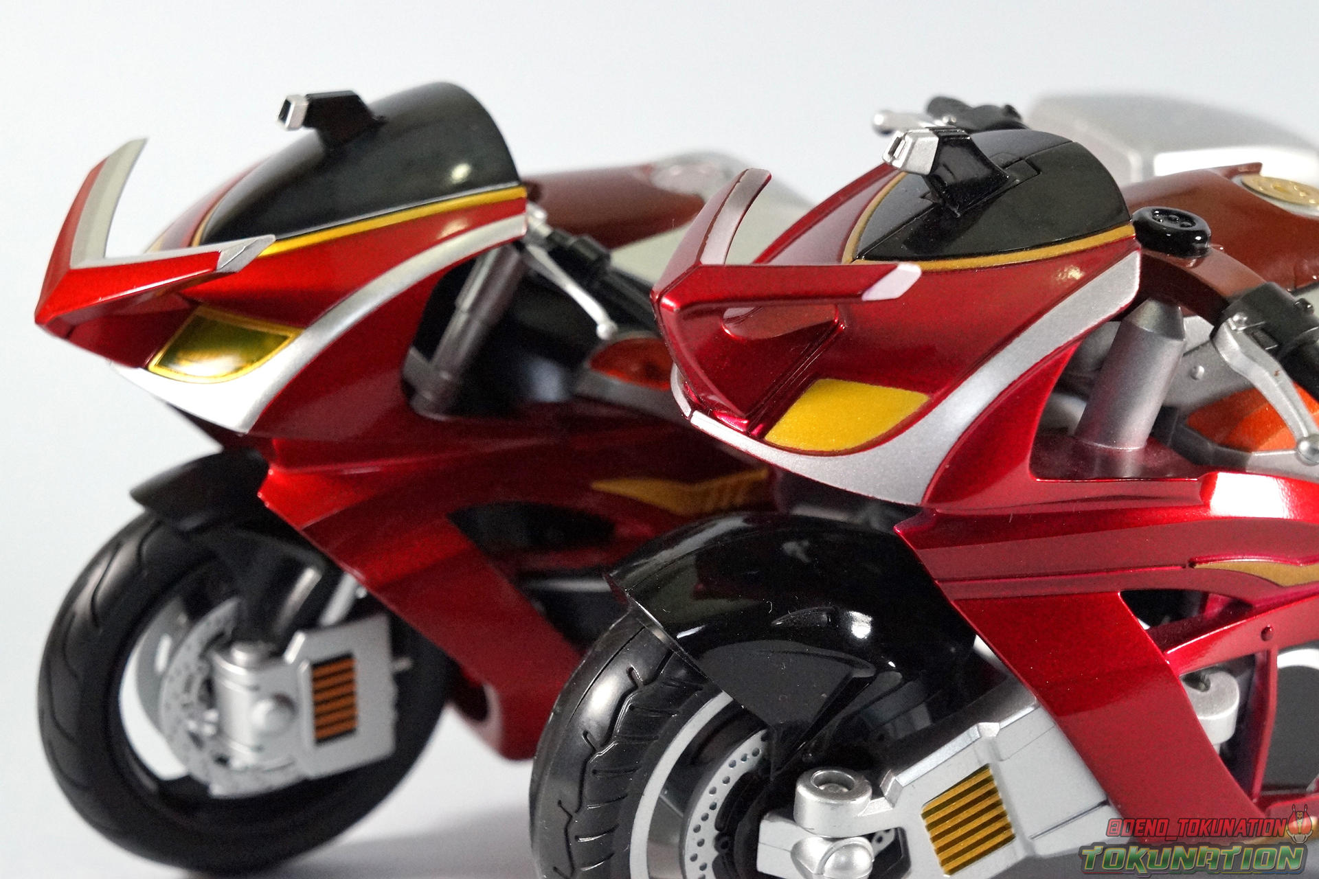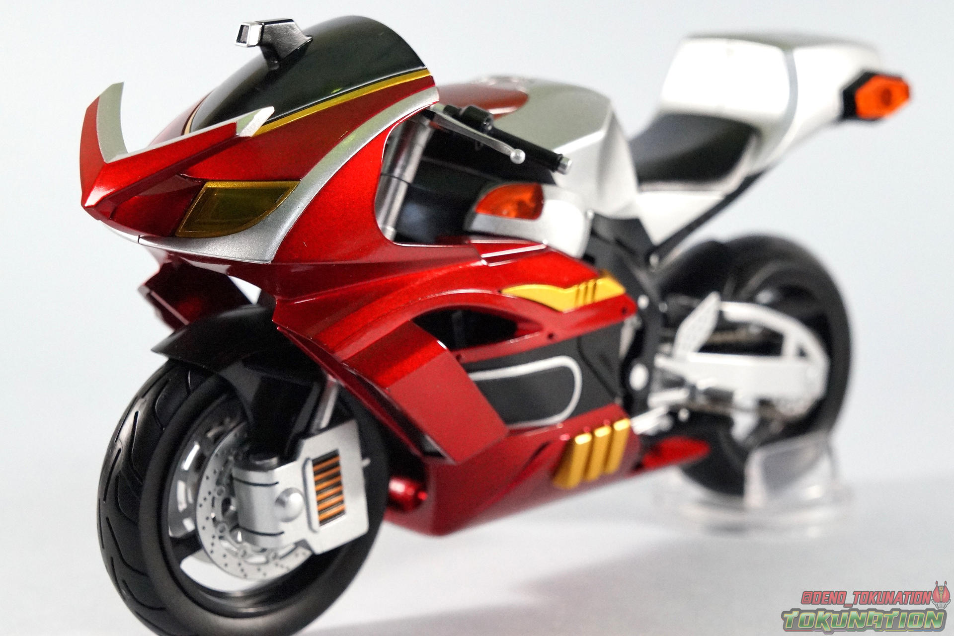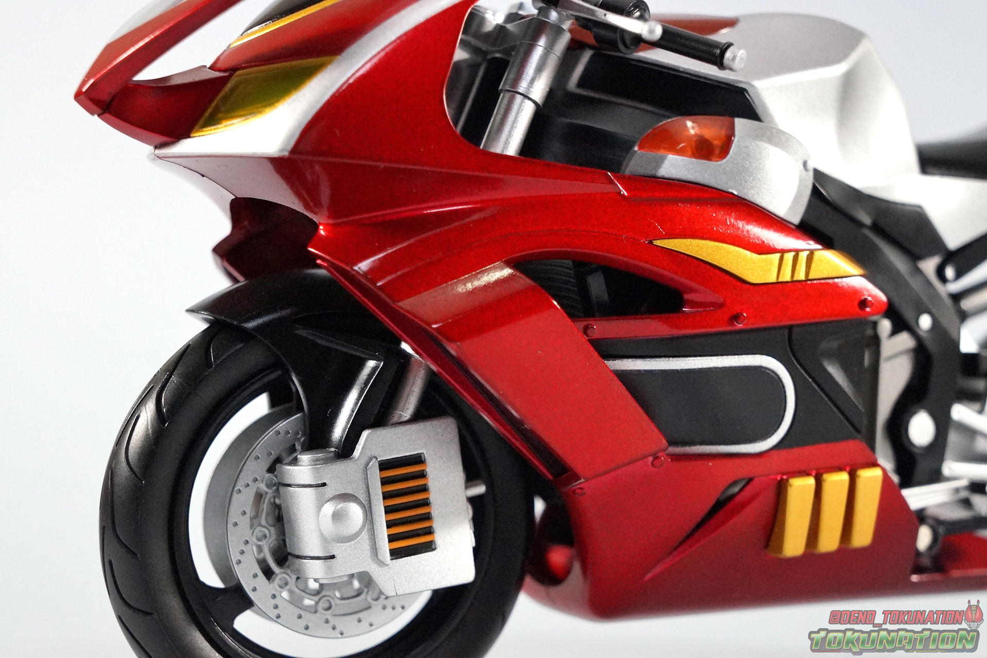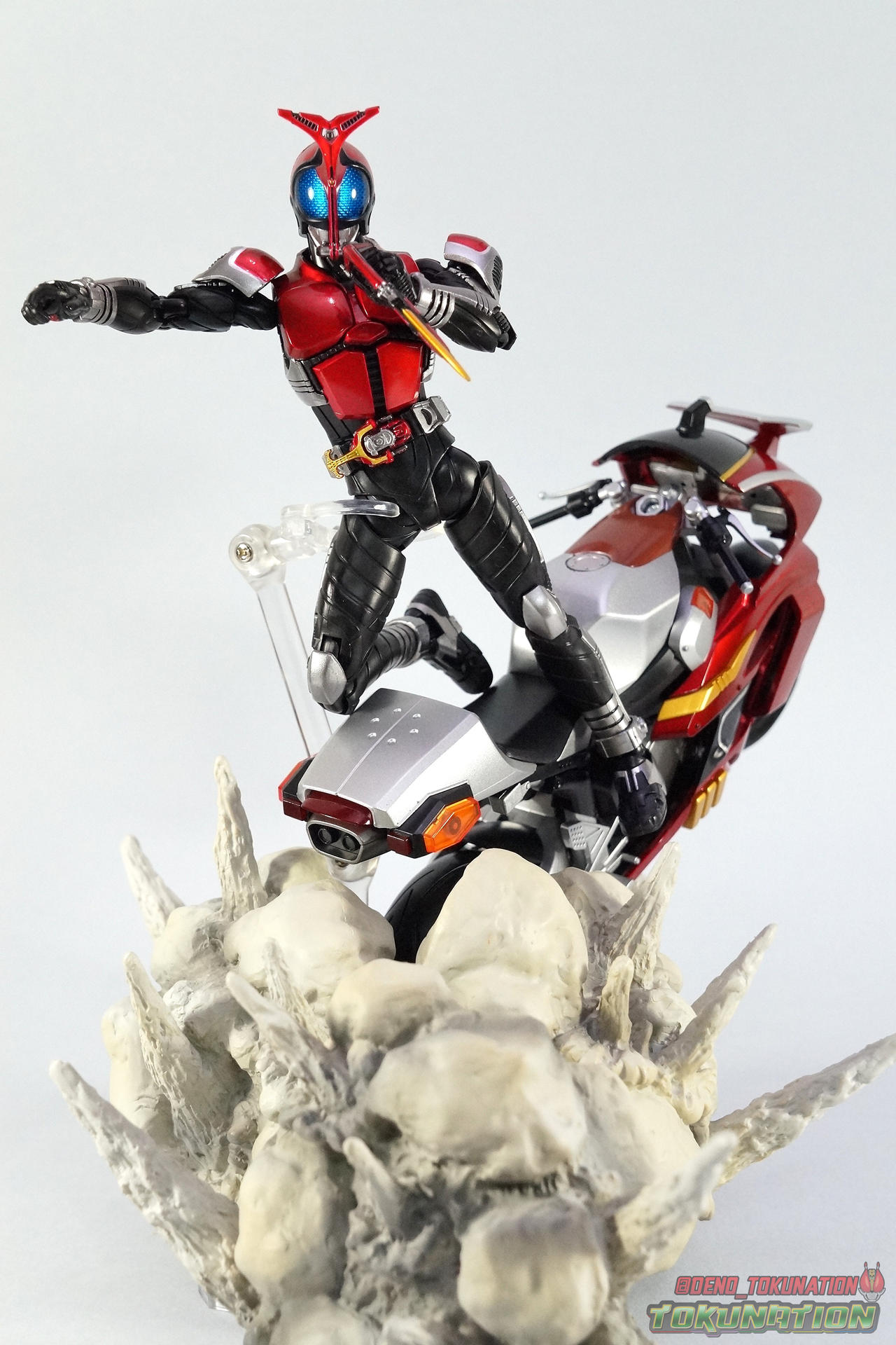 Packaging Pretty standard stuff here. Most Rider Machines come in pretty plain boxes. This one is no different thanks to the drab black & gray color scheme of it. Nothing else of interest to note with this one. Main Figure It's a bike. Review done. Oh, you expected more? I suppose.... In truth there isn't much you can say about a vehicle of this nature. The Kabuto Extender is a really gorgeous bike. And one that's well past due. Considering all of the Kabuto Riders themselves (minus the Brightrooper variant) were released as S.H. Figuarts years ago, it's still surprising that none of the bikes were ever produced before now. Luckily the Gattack Extender is being teased currently too, and with SS Gattack on the way it's just a matter of time. But I'd still like to see the Machine Zectron, in both TheBee & Drake flavors some day. But as Rider Machines go, Kabuto Extender is pretty basic. It doesn't have any action features to speak of unlike it's vintage DX counterpart, which I've included comparison shots of. In show the Extender could also "cast off" it's outer armor like the series' riders, to reveal a faster more powerful form beneath. While it's probably not fair to expect the figuart to be capable of this, we live in a time where a fully transformable Survive Contract Monster Dragranzer exists. So you know, wishful thinking. But it's still a goo looking bike and Kabuto looks perfectly natural sitting on it. Tendou has never looked better than he does with this modern day pairing. Accessories 1 - wheel base like most Figuarts bikes. Nothing special here. 1- Tamashii Stage Adapter. To be used on the underside of the bike the recreate action shots or chase scenes. I had some fun with it and explosions as you can see below. Also it seem additional handlebars are a thing of the past, as this release doesn;'t have the standard extra pair. But honestly who ever used them anyway? Can't think of much else that could have been done with this one. For what we got I'm relatively pleased though. Final Thoughts Basically S.H. Figuarts Kabuto Extender is a really nicely painted and sculpted vehicle that will be a great accessory for your Shinkochu Seihou Kabuto. Many collectors don't particularly feel the necessity to own every bike for every rider. And with releases like this, I can totally get that. I loved Kabuto, the series and the rider, so it's a must have personally. But even I can admit you don't get much bang for your buck with this one. S.H. Figuarts Kabuto Extender could have been much more, but like many Rider Machines it just becomes background display material.
