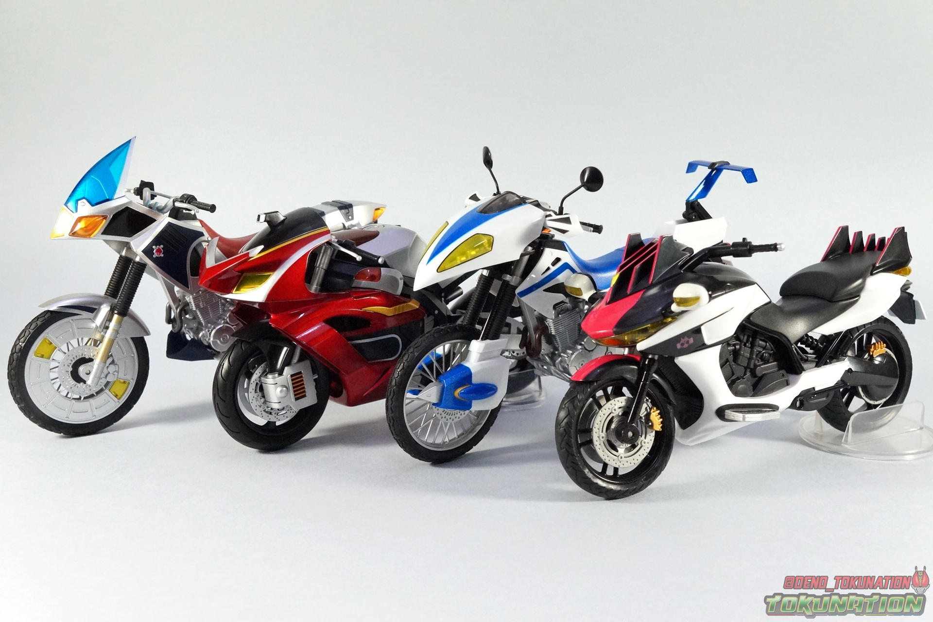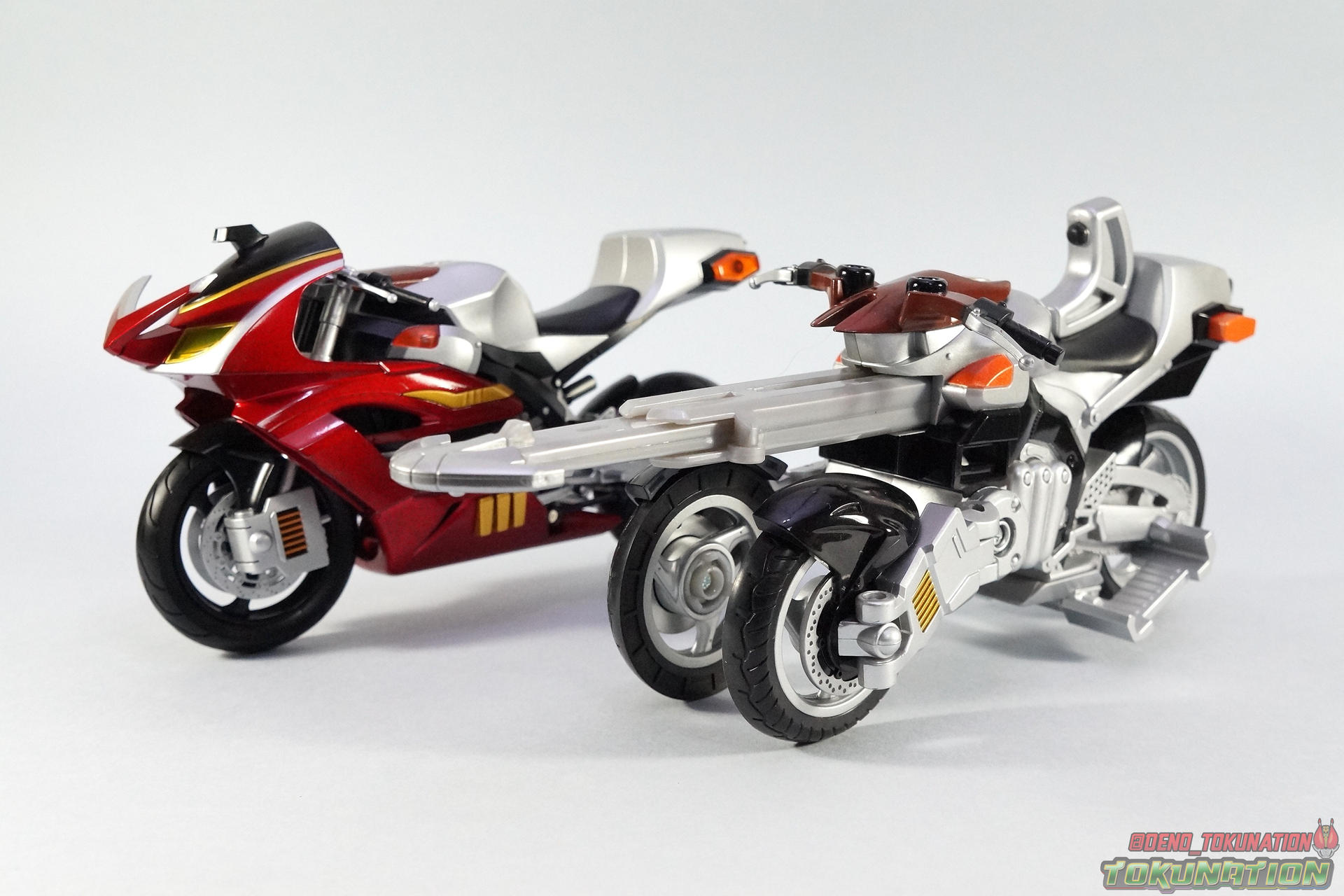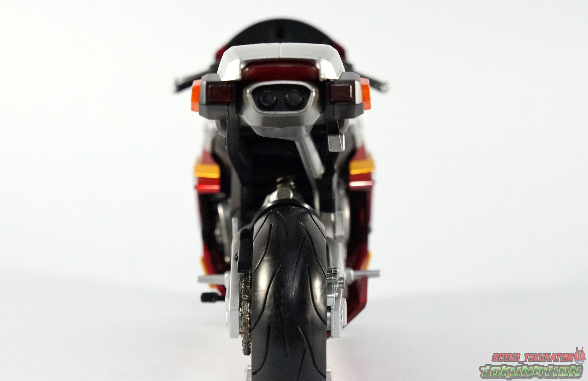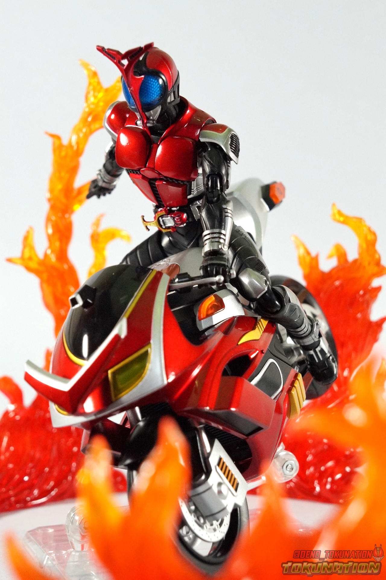 Packaging Pretty standard stuff here. Most Rider Machines come in pretty plain boxes. This one is no different thanks to the drab black & gray color scheme of it. Nothing else of interest to note with this one. Main Figure It's a bike. Review done. Oh, you expected more? I suppose.... In truth there isn't much you can say about a vehicle of this nature. The Kabuto Extender is a really gorgeous bike. And one that's well past due. Considering all of the Kabuto Riders themselves (minus the Brightrooper variant) were released as S.H. Figuarts years ago, it's still surprising that none of the bikes were ever produced before now. Luckily the Gattack Extender is being teased currently too, and with SS Gattack on the way it's just a matter of time. But I'd still like to see the Machine Zectron, in both TheBee & Drake flavors some day. But as Rider Machines go, Kabuto Extender is pretty basic. It doesn't have any action features to speak of unlike it's vintage DX counterpart, which I've included comparison shots of. In show the Extender could also "cast off" it's outer armor like the series' riders, to reveal a faster more powerful form beneath. While it's probably not fair to expect the figuart to be capable of this, we live in a time where a fully transformable Survive Contract Monster Dragranzer exists. So you know, wishful thinking. But it's still a goo looking bike and Kabuto looks perfectly natural sitting on it. Tendou has never looked better than he does with this modern day pairing. Accessories 1 - wheel base like most Figuarts bikes. Nothing special here. 1- Tamashii Stage Adapter. To be used on the underside of the bike the recreate action shots or chase scenes. I had some fun with it and explosions as you can see below. Also it seem additional handlebars are a thing of the past, as this release doesn;'t have the standard extra pair. But honestly who ever used them anyway? Can't think of much else that could have been done with this one. For what we got I'm relatively pleased though. Final Thoughts Basically S.H. Figuarts Kabuto Extender is a really nicely painted and sculpted vehicle that will be a great accessory for your Shinkochu Seihou Kabuto. Many collectors don't particularly feel the necessity to own every bike for every rider. And with releases like this, I can totally get that. I loved Kabuto, the series and the rider, so it's a must have personally. But even I can admit you don't get much bang for your buck with this one. S.H. Figuarts Kabuto Extender could have been much more, but like many Rider Machines it just becomes background display material.